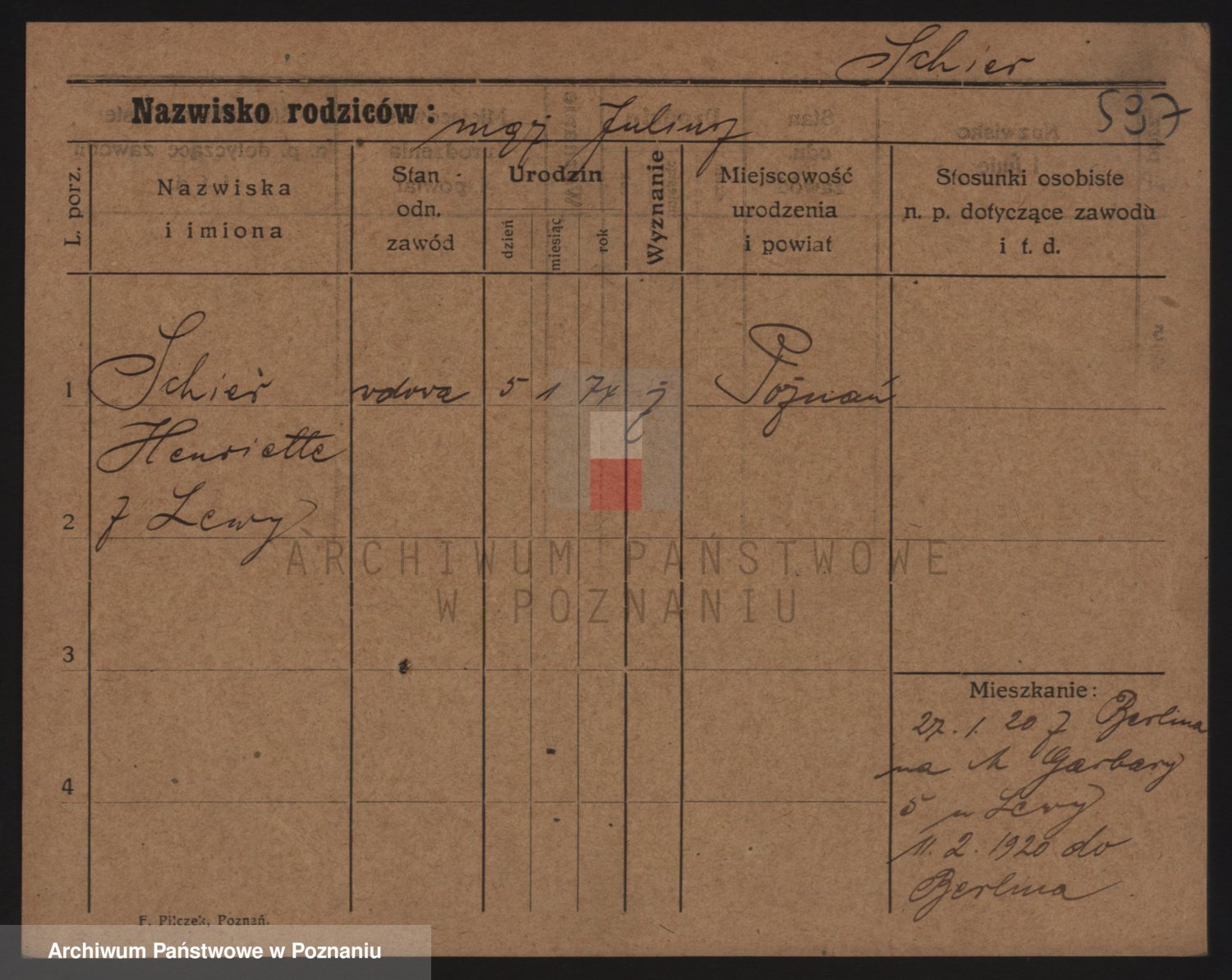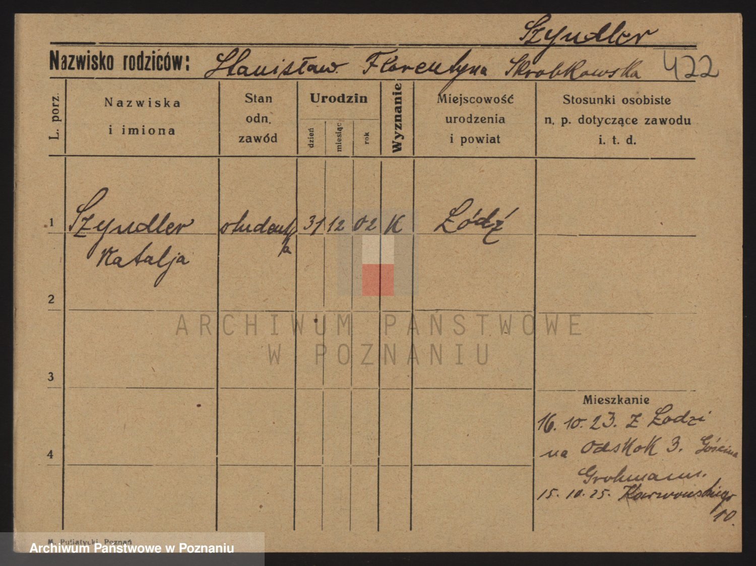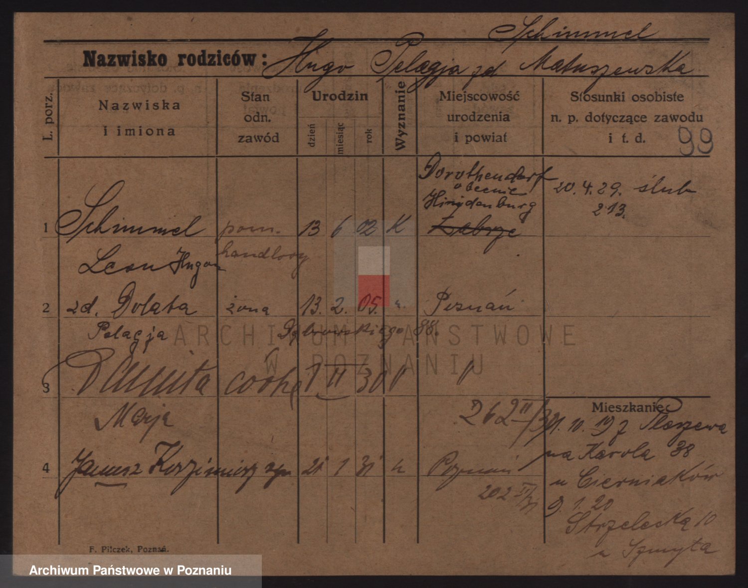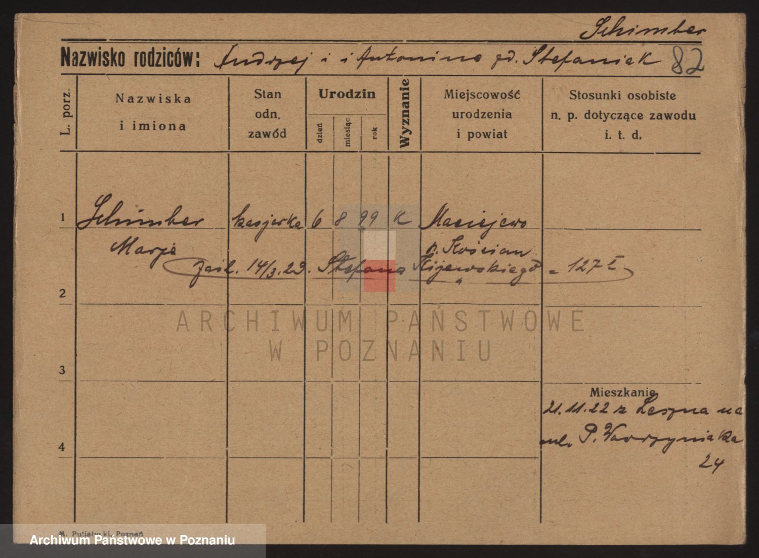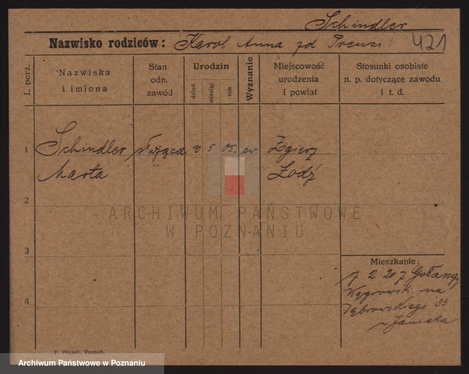 Podgląd karty osobowej dostępny jest po kliknięciu na nazwisko lub ikonkę karty. Można dokonywać powiększenia (ikony na górze) lub przechodzić między kolejnymi skanami (strzałki po bokach).