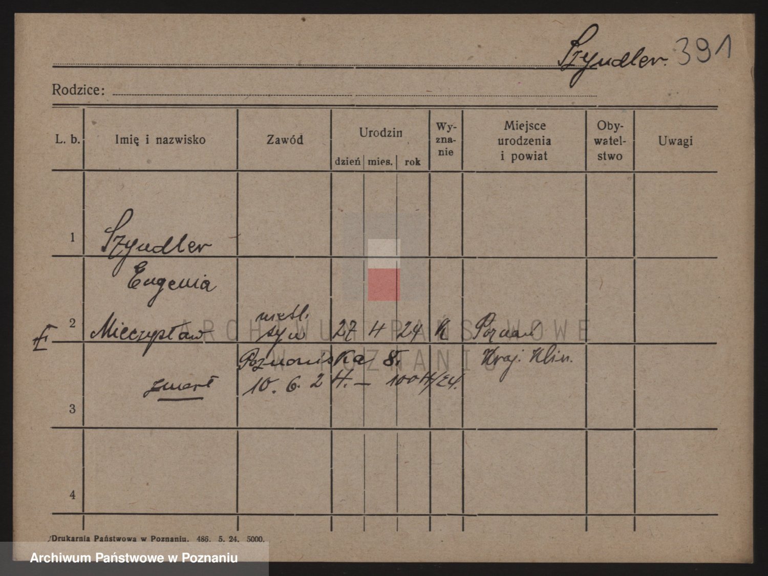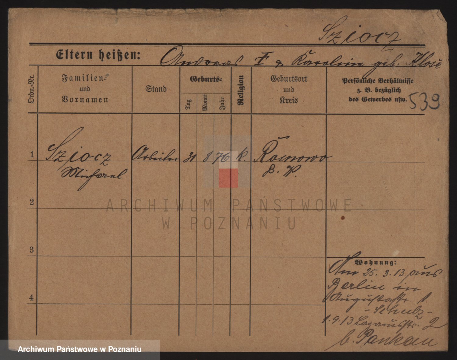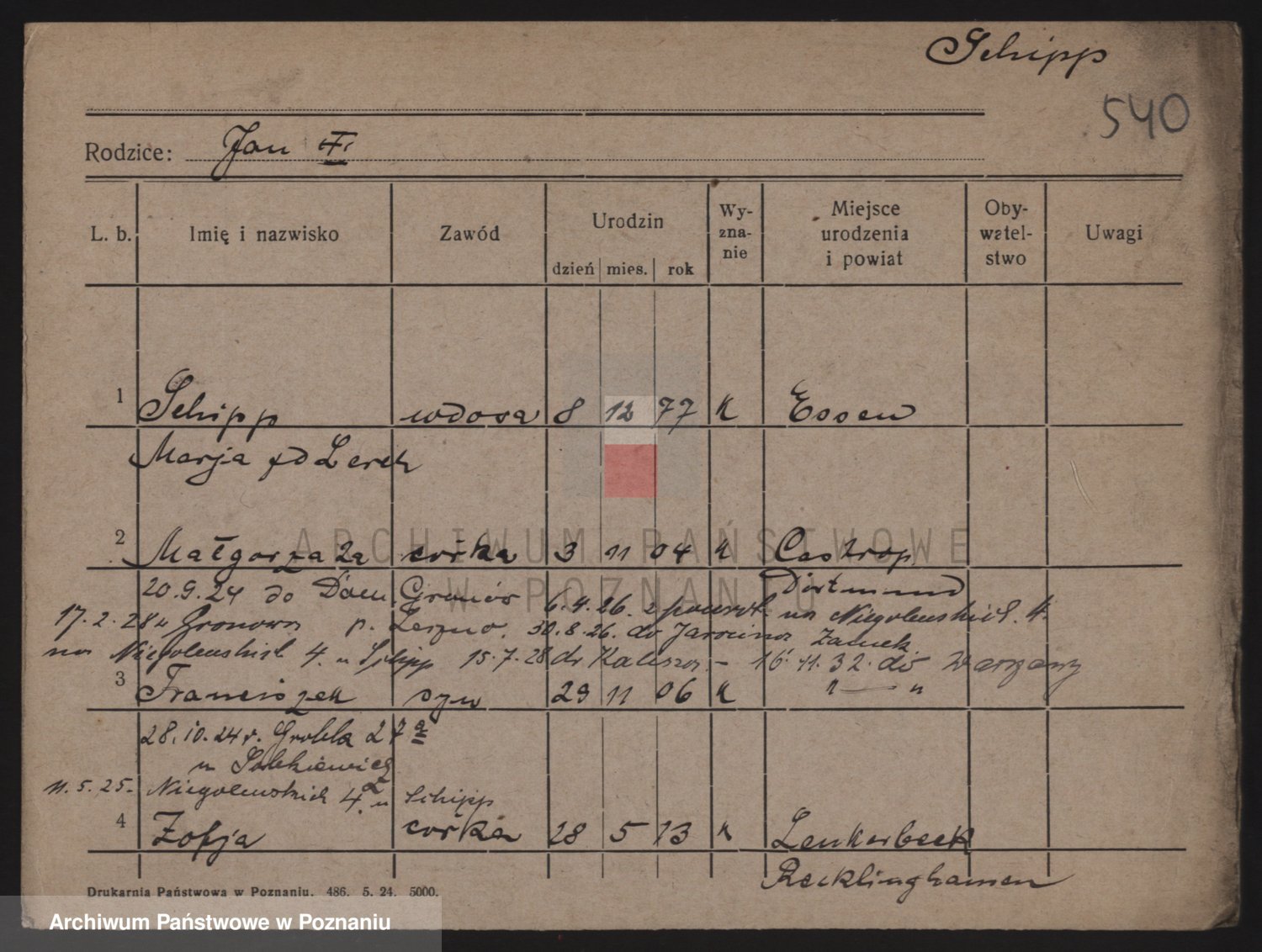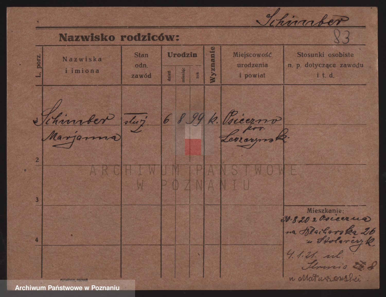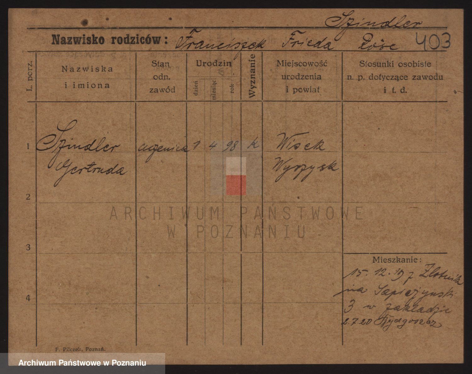 Podgląd karty osobowej dostępny jest po kliknięciu na nazwisko lub ikonkę karty. Można dokonywać powiększenia (ikony na górze) lub przechodzić między kolejnymi skanami (strzałki po bokach).
