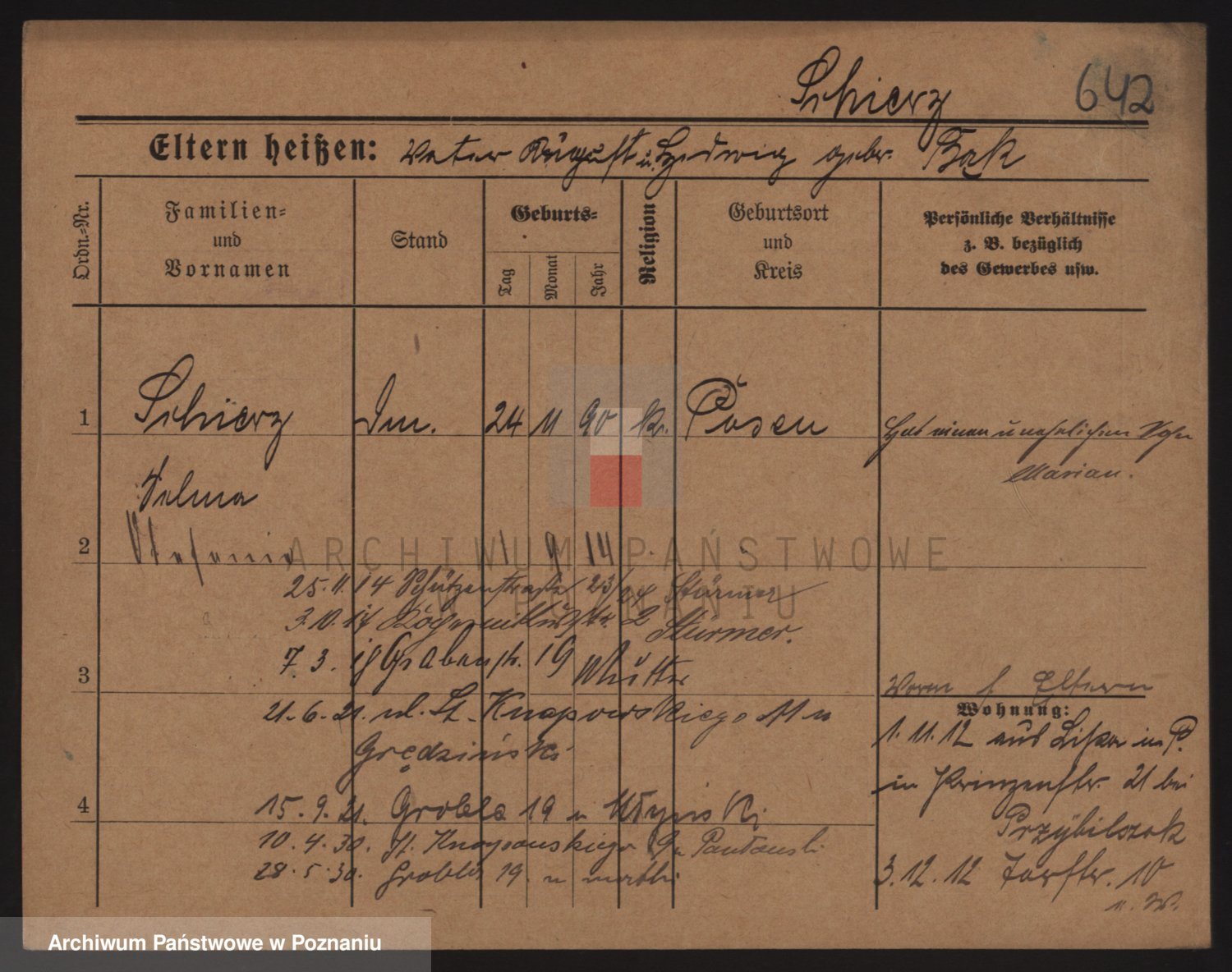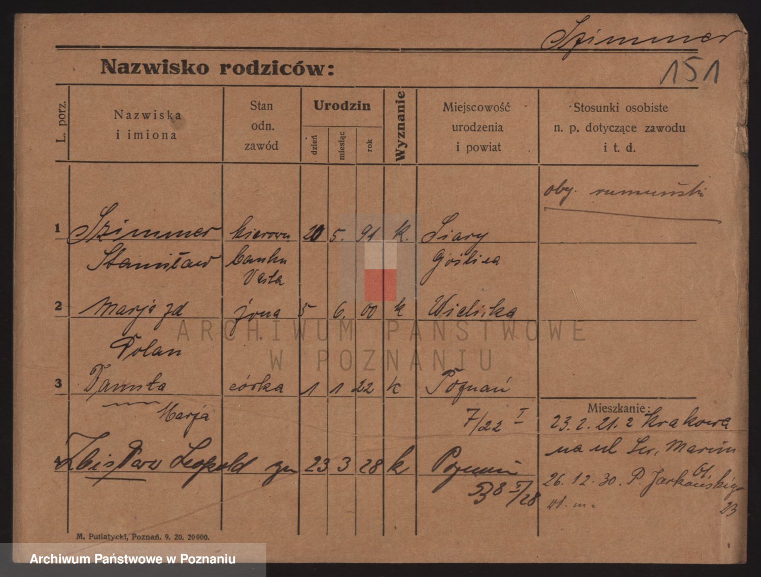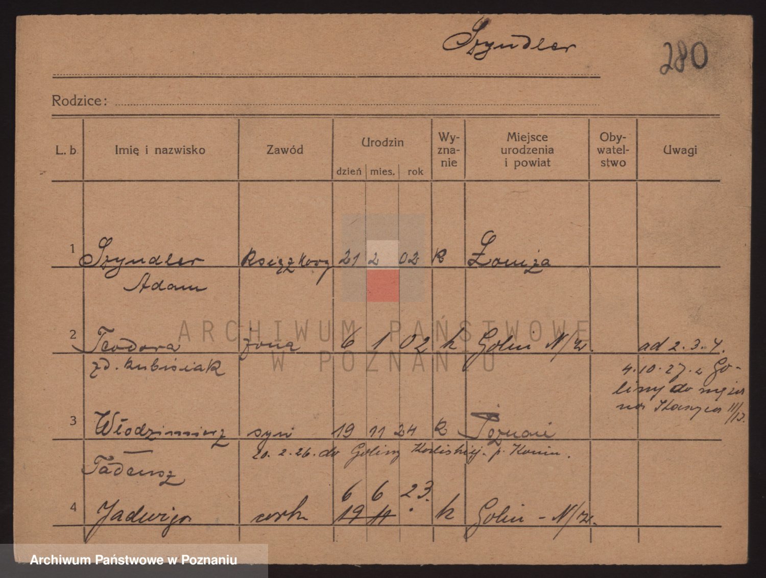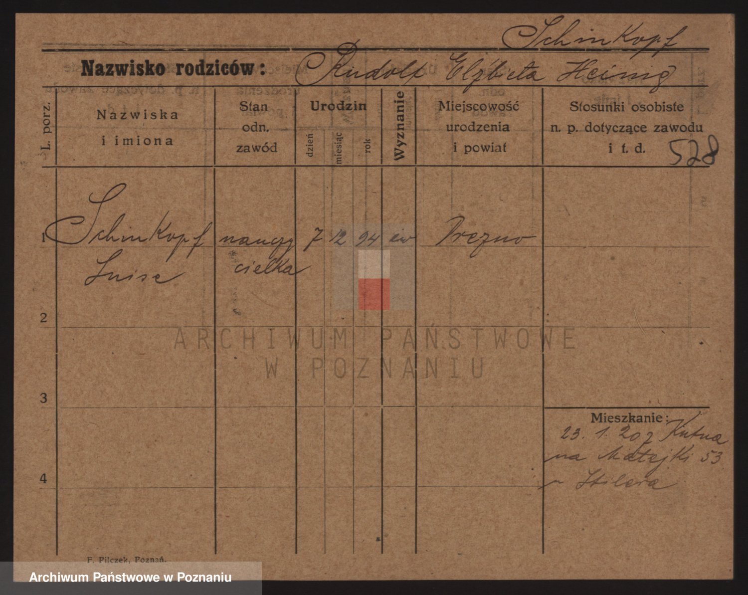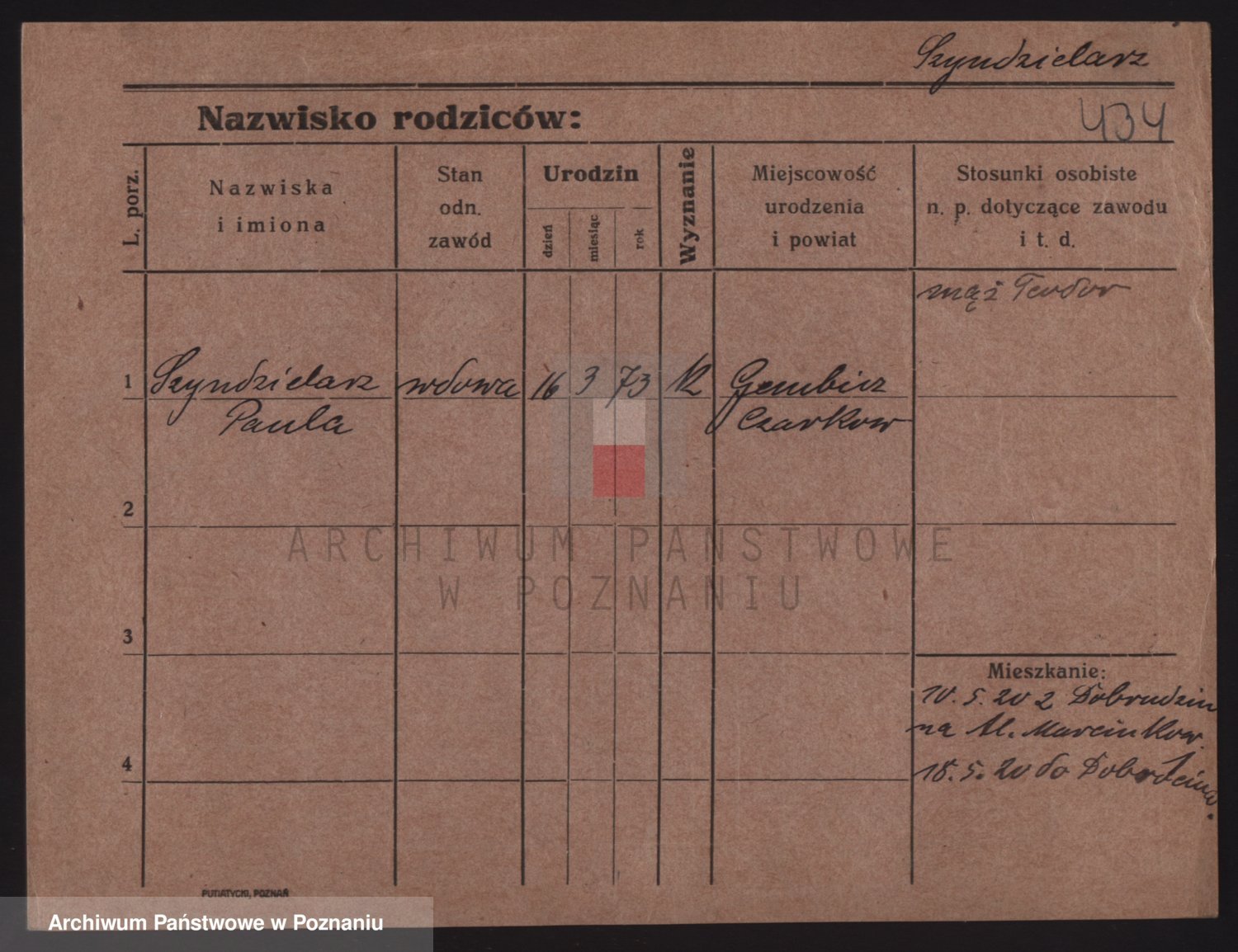 Podgląd karty osobowej dostępny jest po kliknięciu na nazwisko lub ikonkę karty. Można dokonywać powiększenia (ikony na górze) lub przechodzić między kolejnymi skanami (strzałki po bokach).