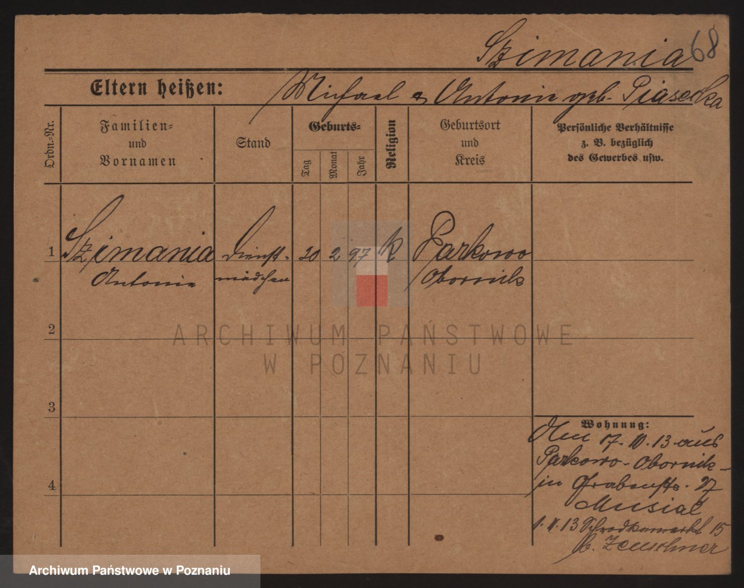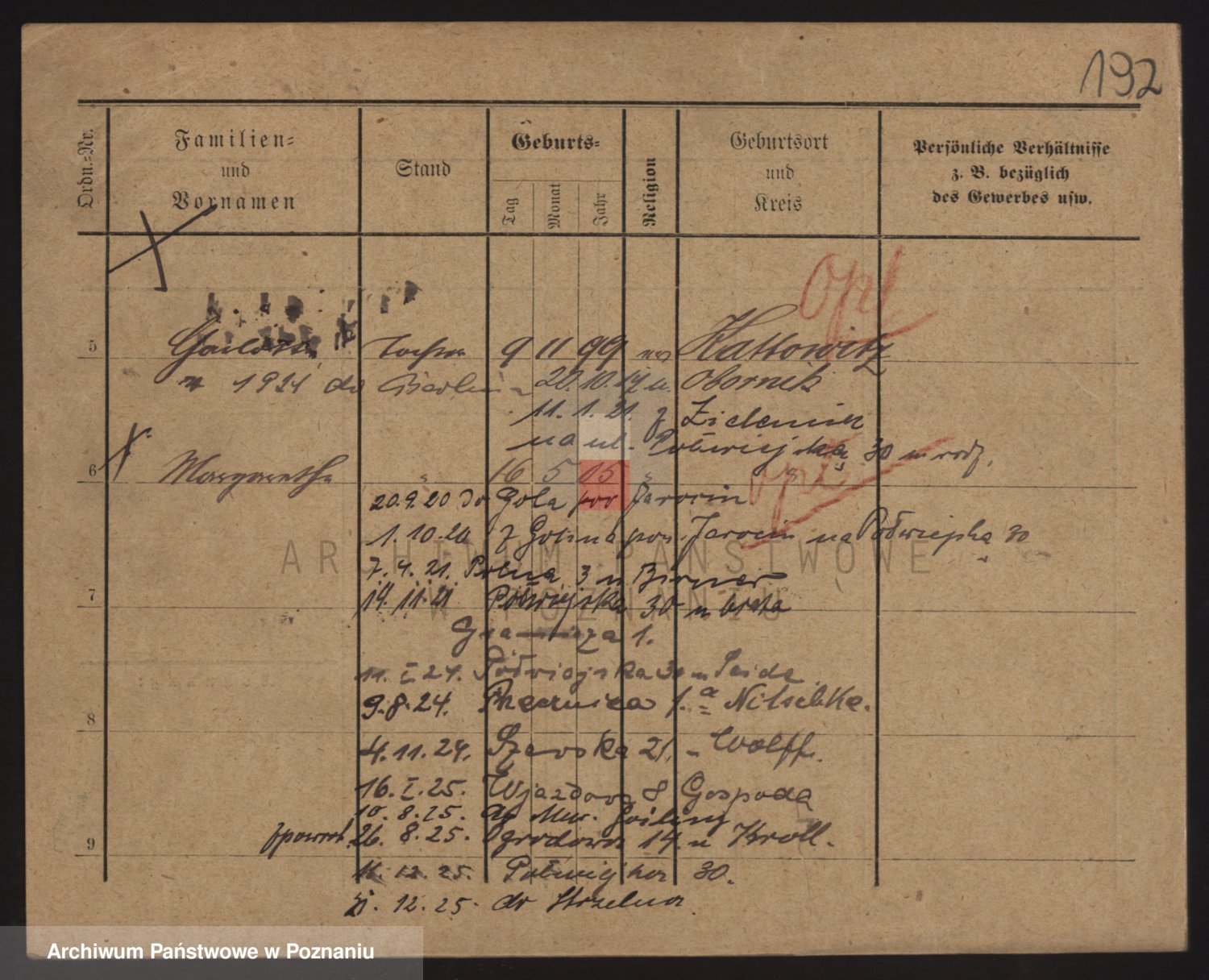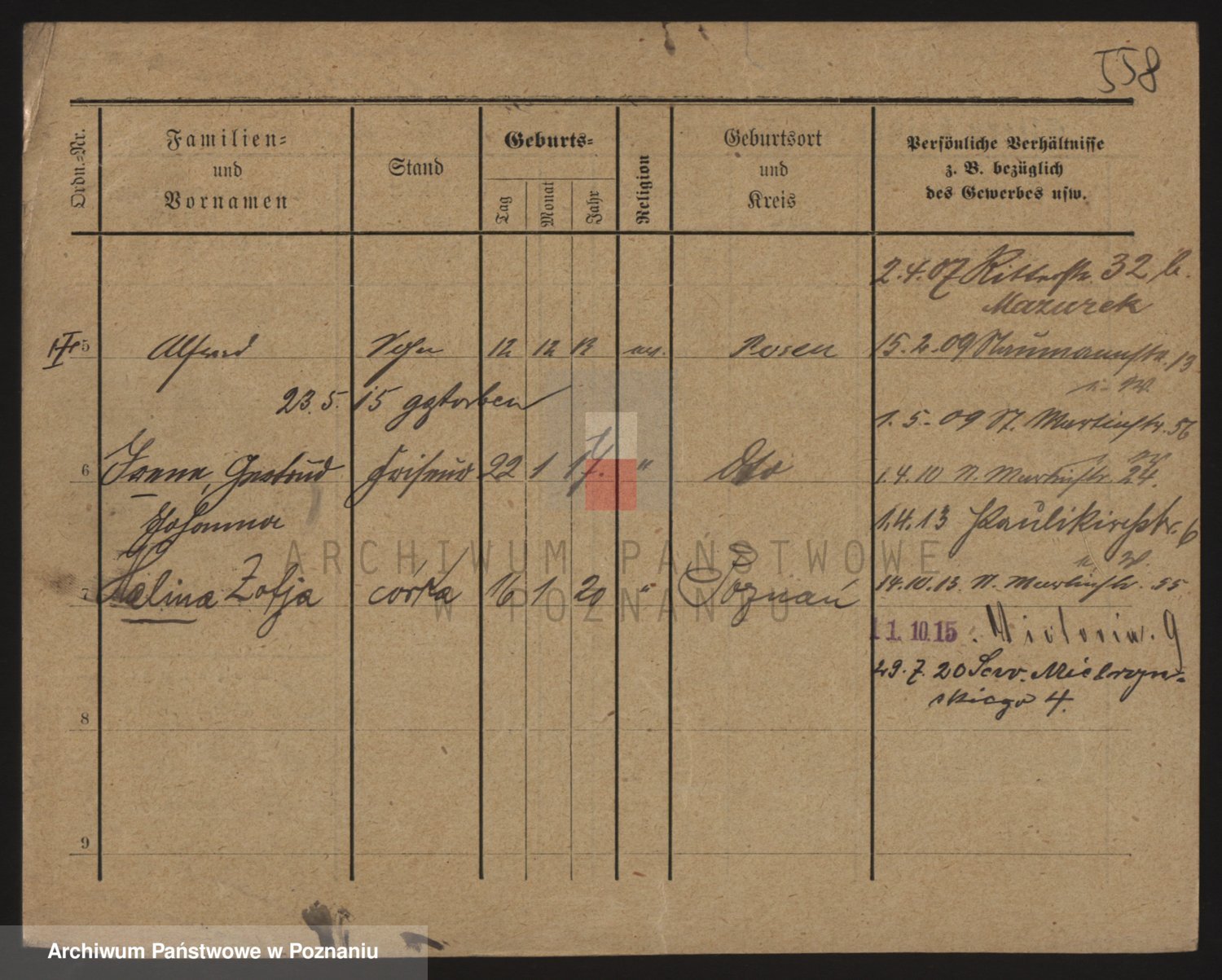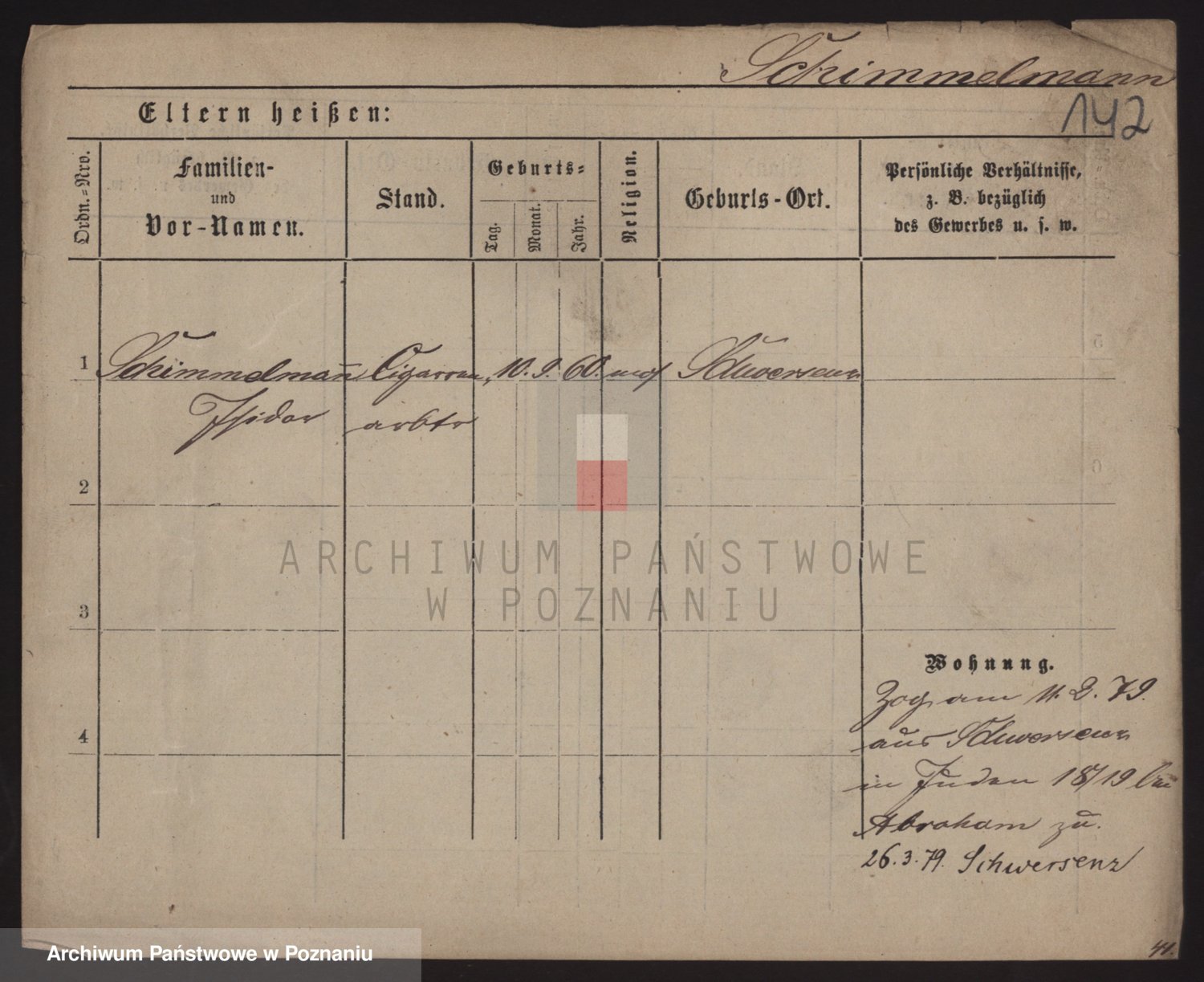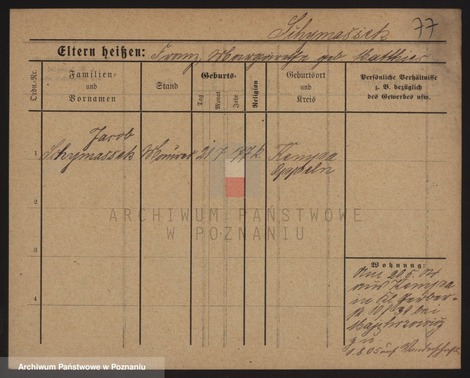 Podgląd karty osobowej dostępny jest po kliknięciu na nazwisko lub ikonkę karty. Można dokonywać powiększenia (ikony na górze) lub przechodzić między kolejnymi skanami (strzałki po bokach).