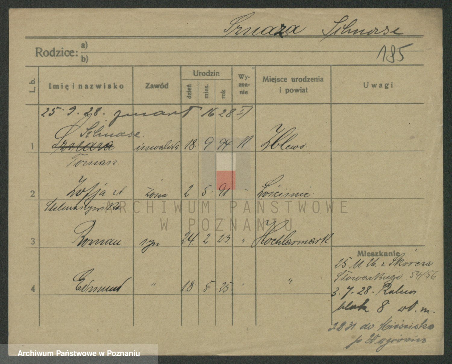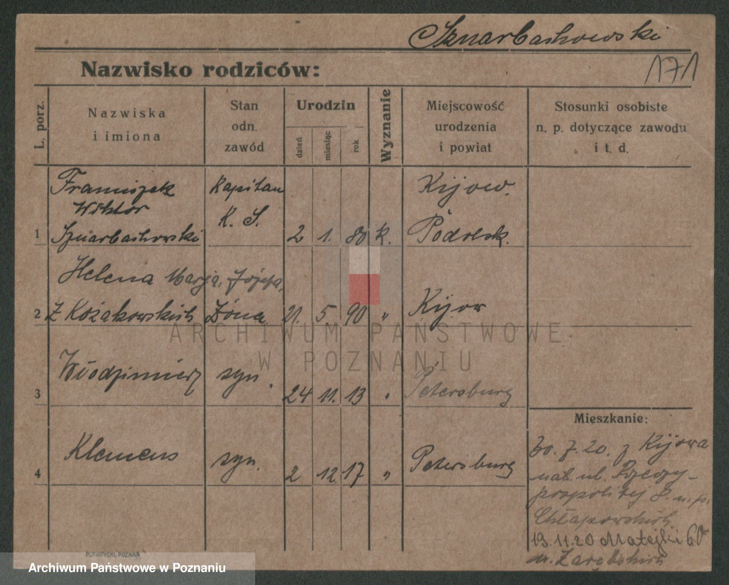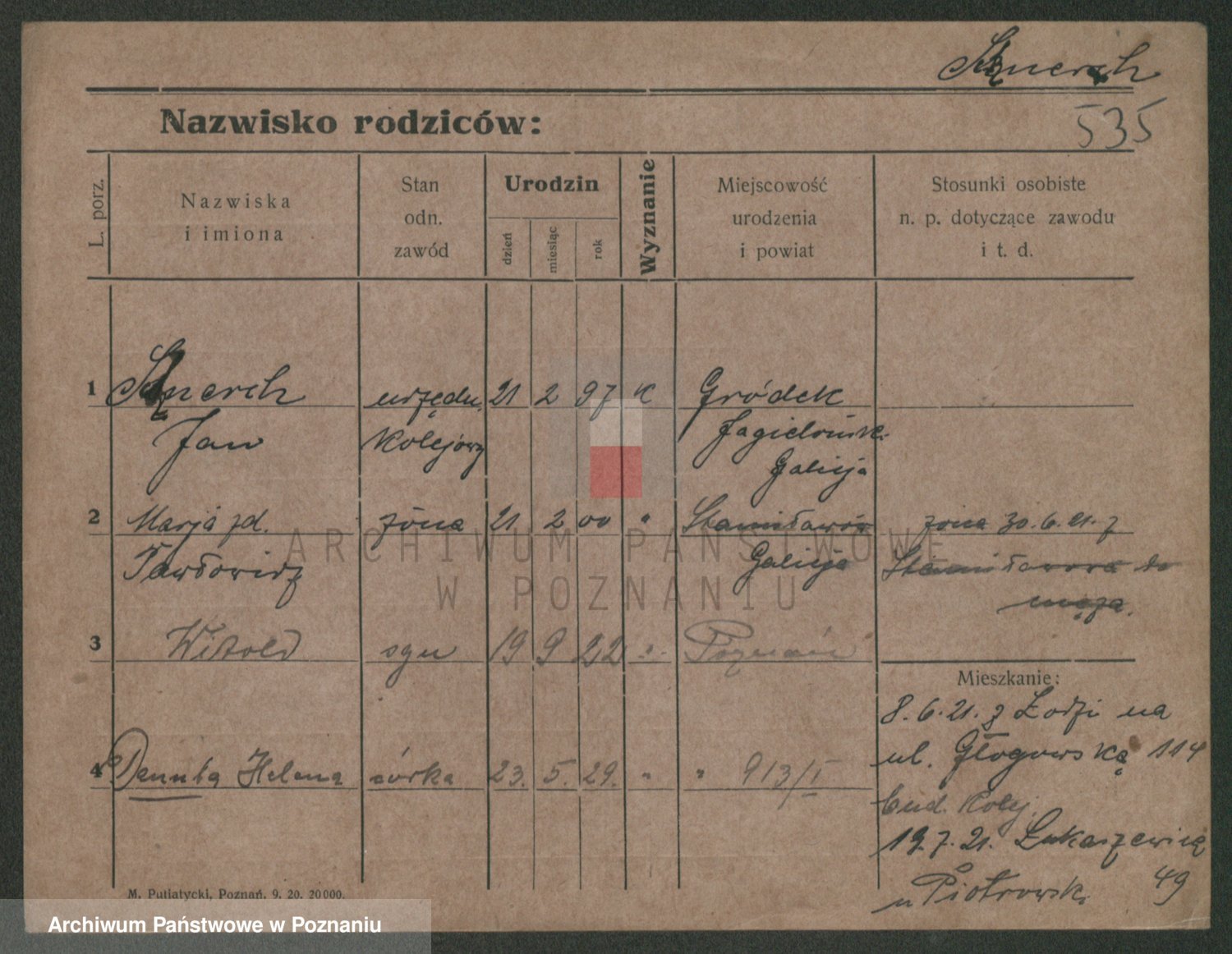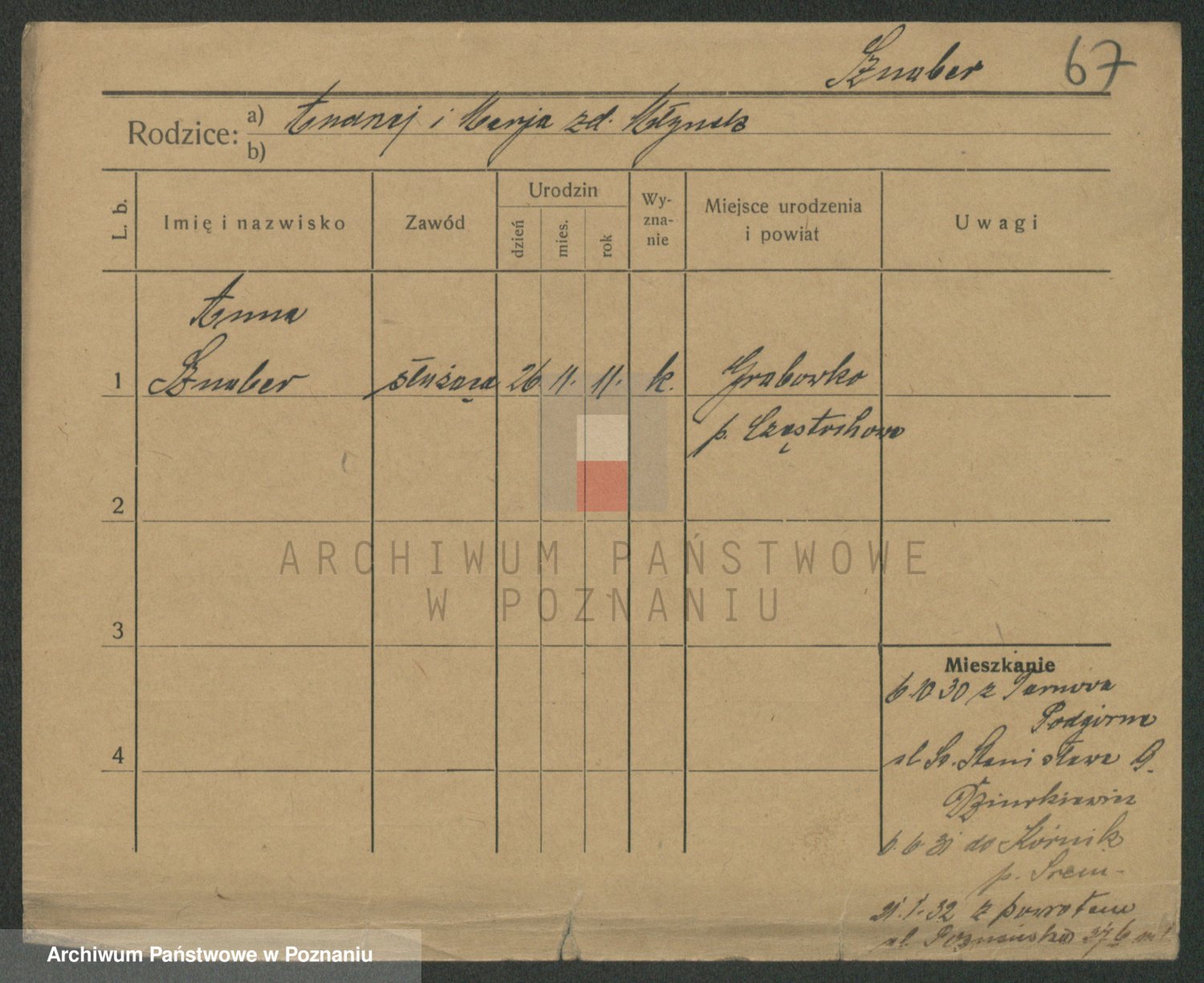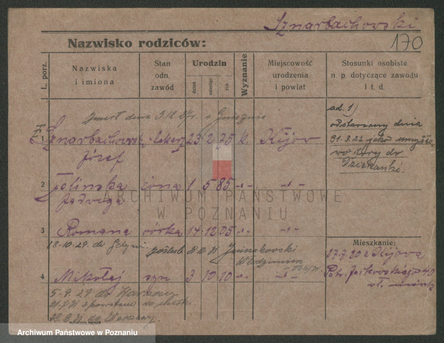 Podgląd karty osobowej dostępny jest po kliknięciu na nazwisko lub ikonkę karty. Można dokonywać powiększenia (ikony na górze) lub przechodzić między kolejnymi skanami (strzałki po bokach).