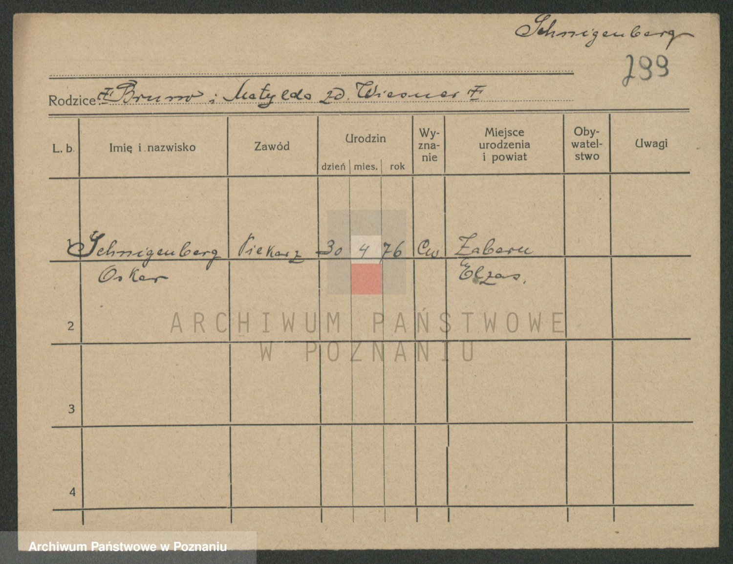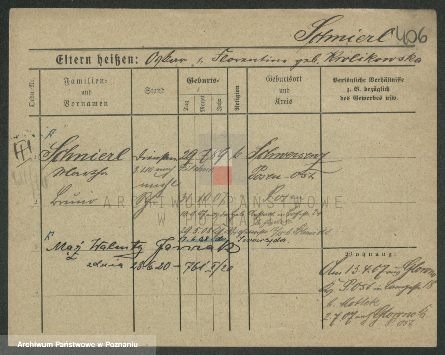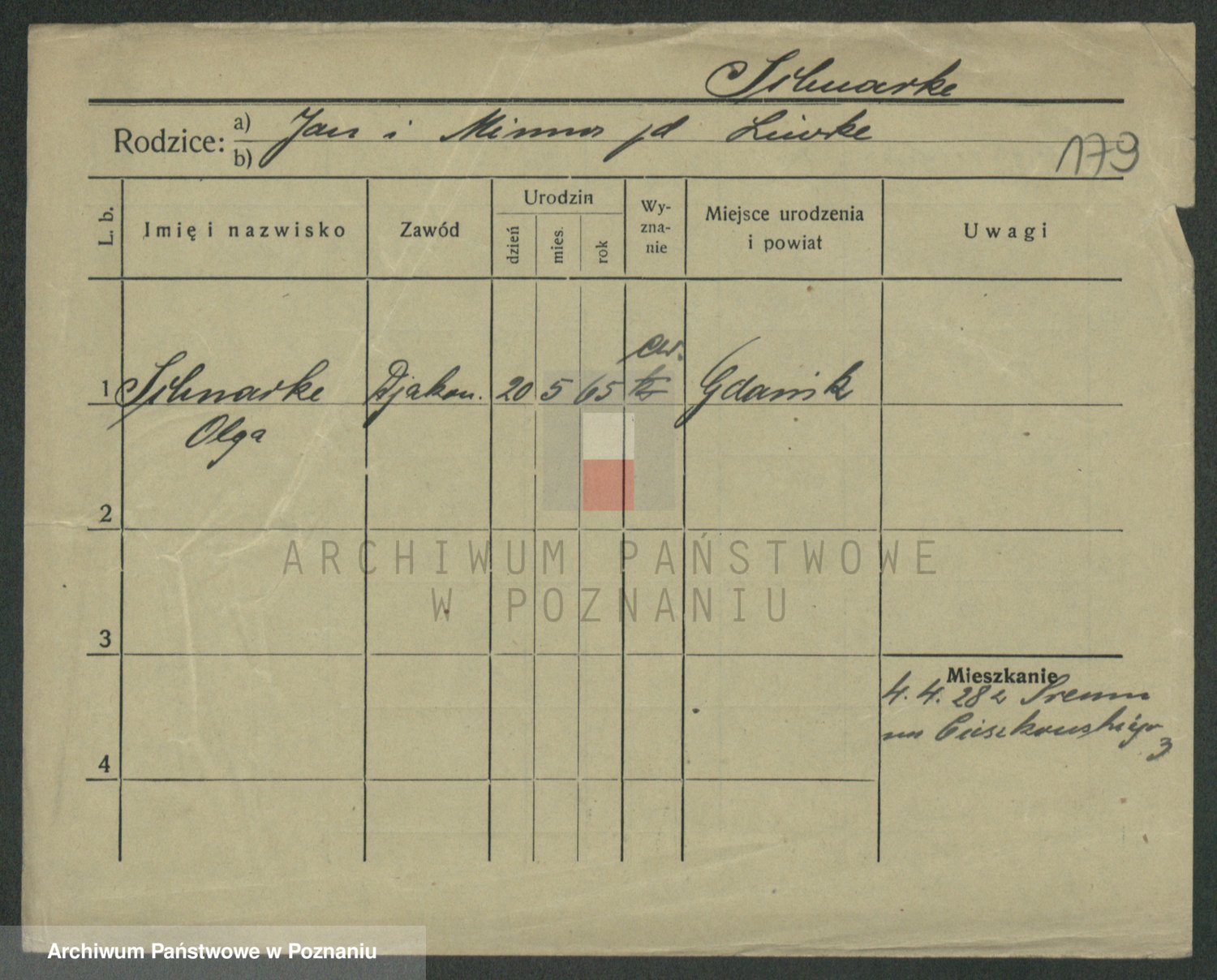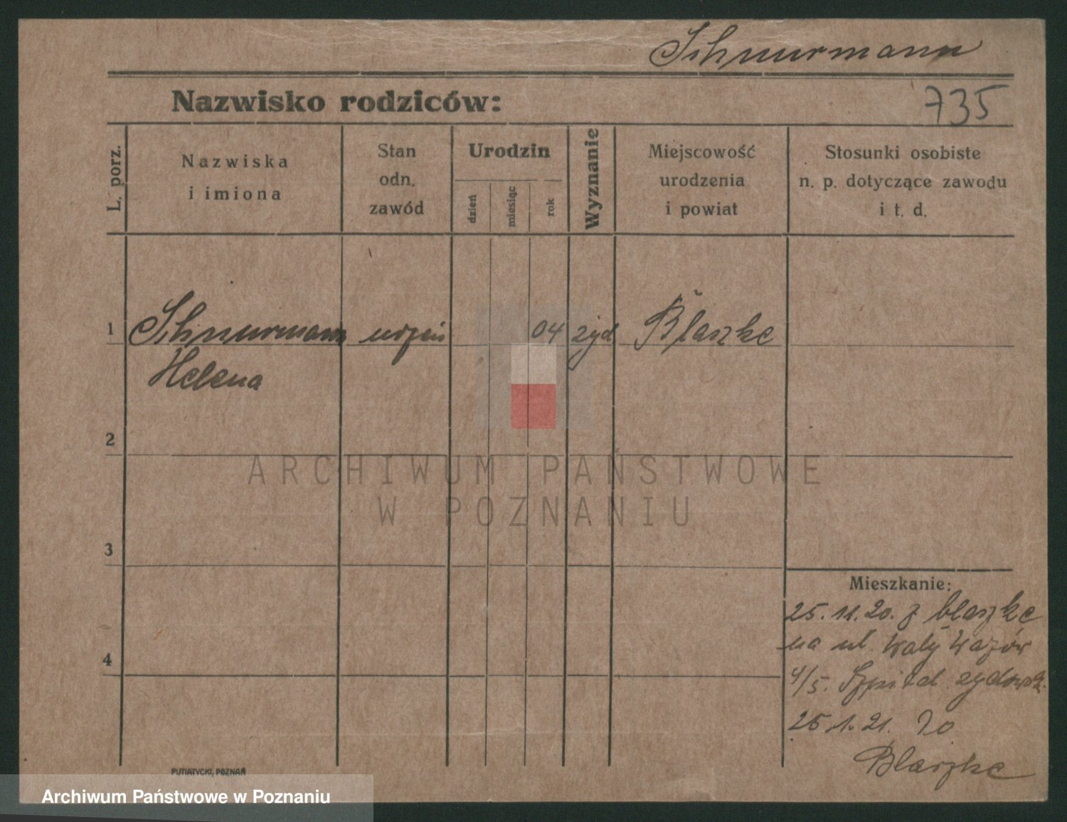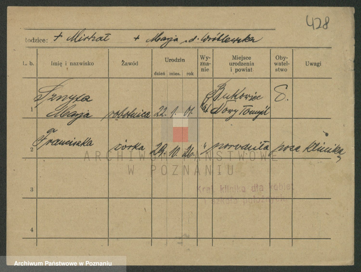 Podgląd karty osobowej dostępny jest po kliknięciu na nazwisko lub ikonkę karty. Można dokonywać powiększenia (ikony na górze) lub przechodzić między kolejnymi skanami (strzałki po bokach).