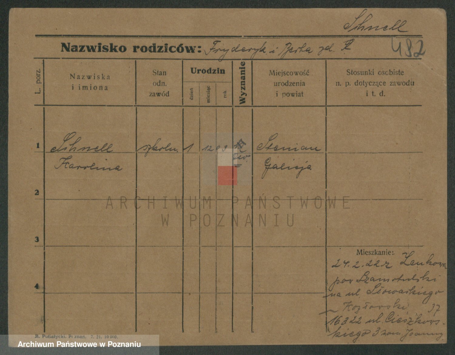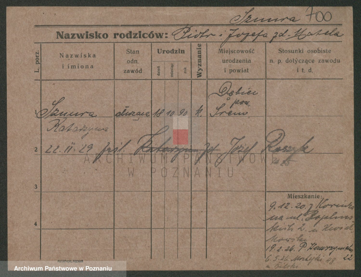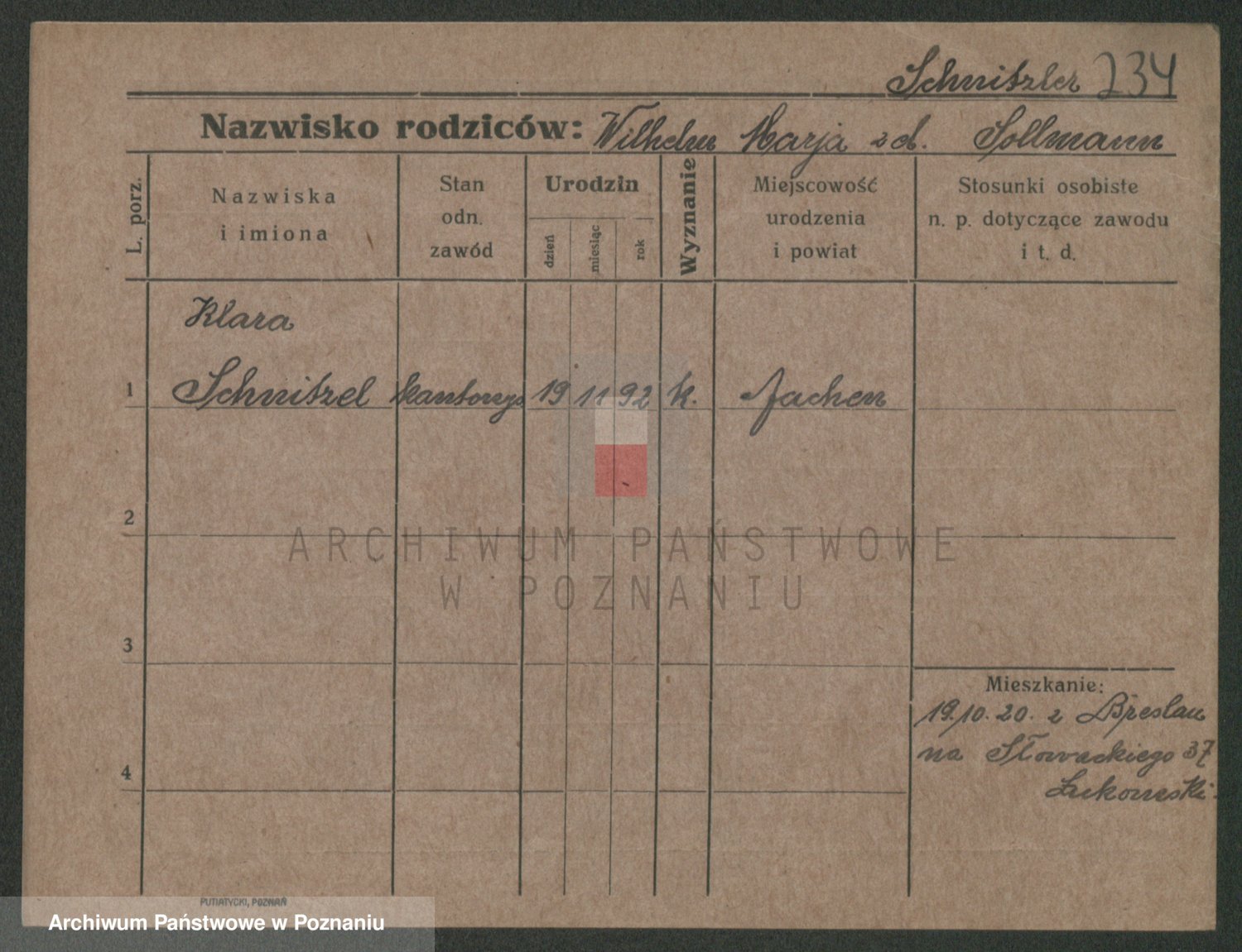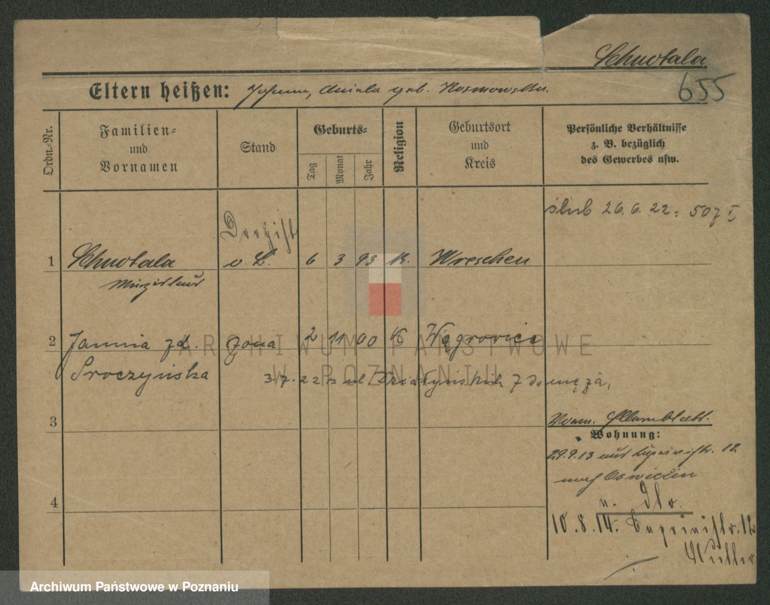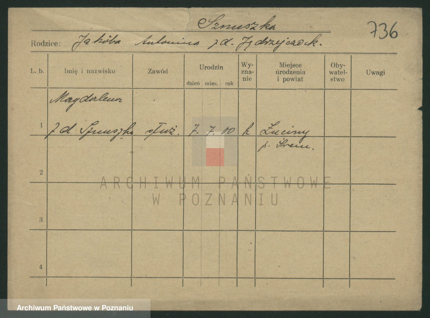 Podgląd karty osobowej dostępny jest po kliknięciu na nazwisko lub ikonkę karty. Można dokonywać powiększenia (ikony na górze) lub przechodzić między kolejnymi skanami (strzałki po bokach).