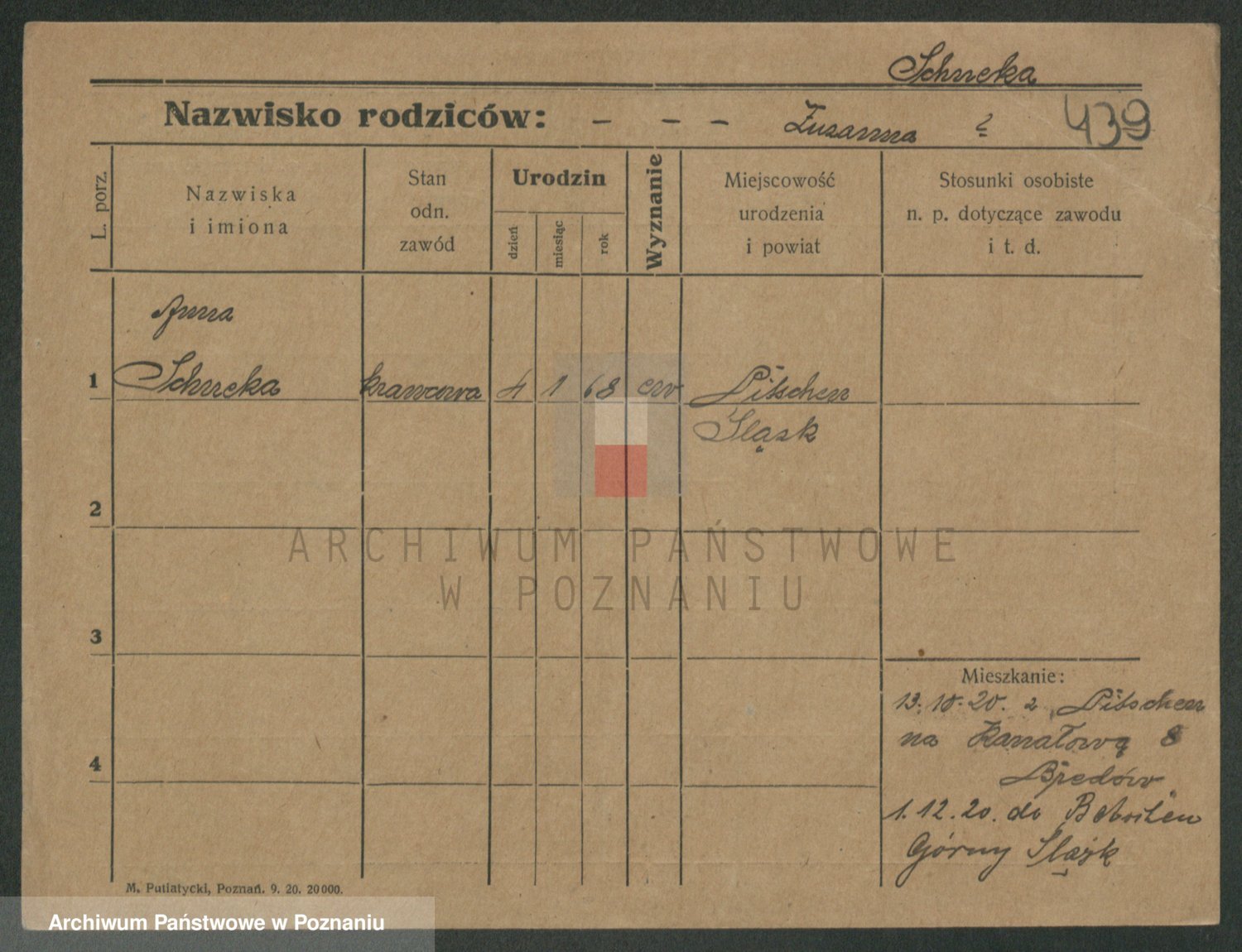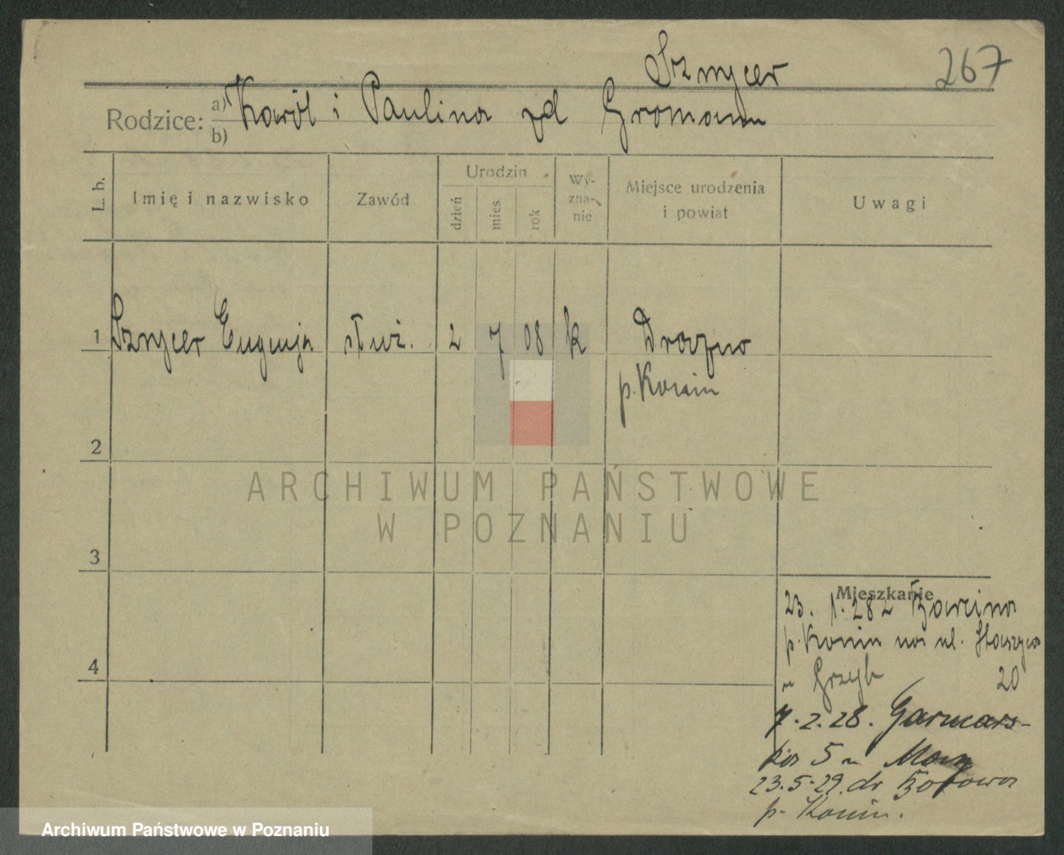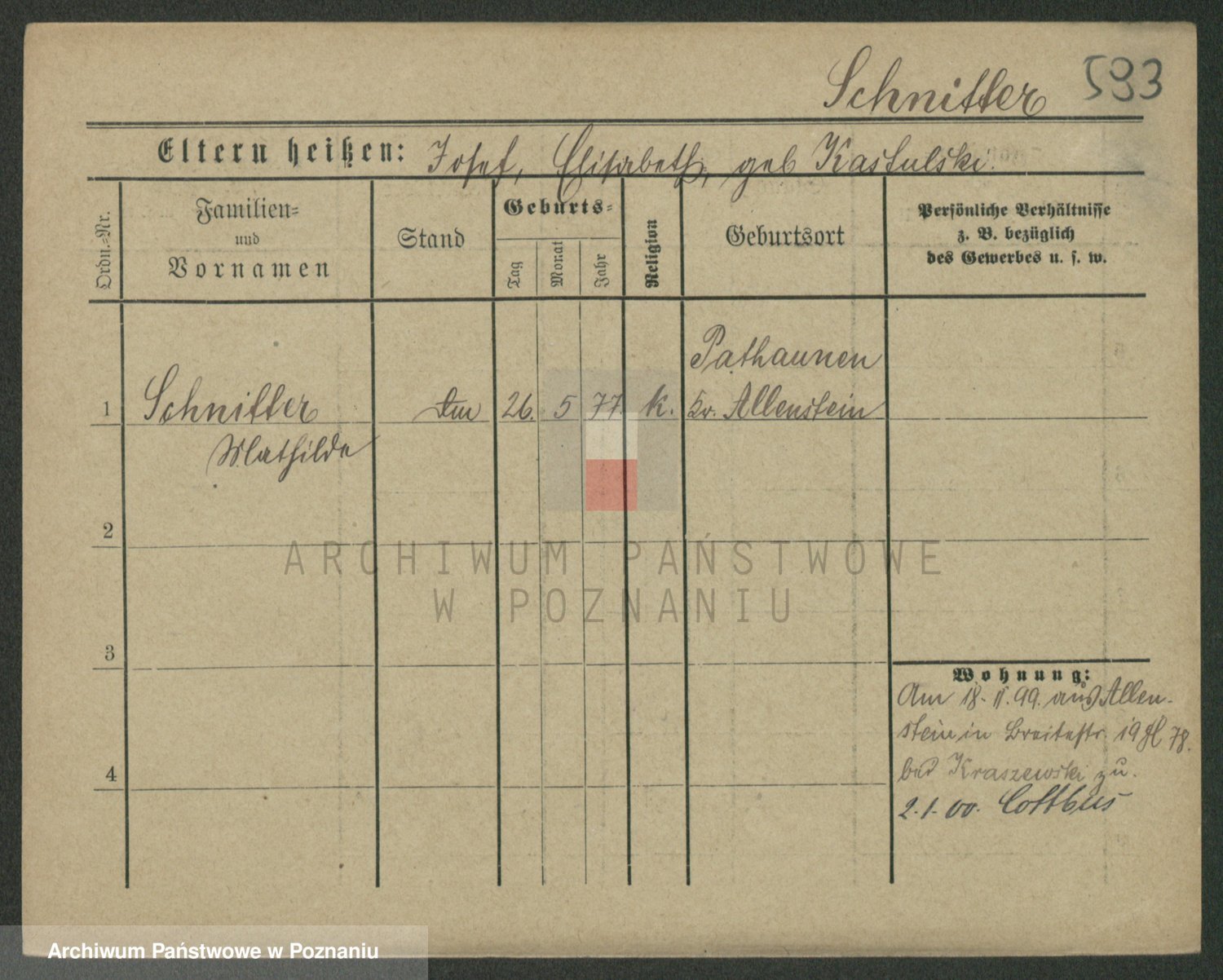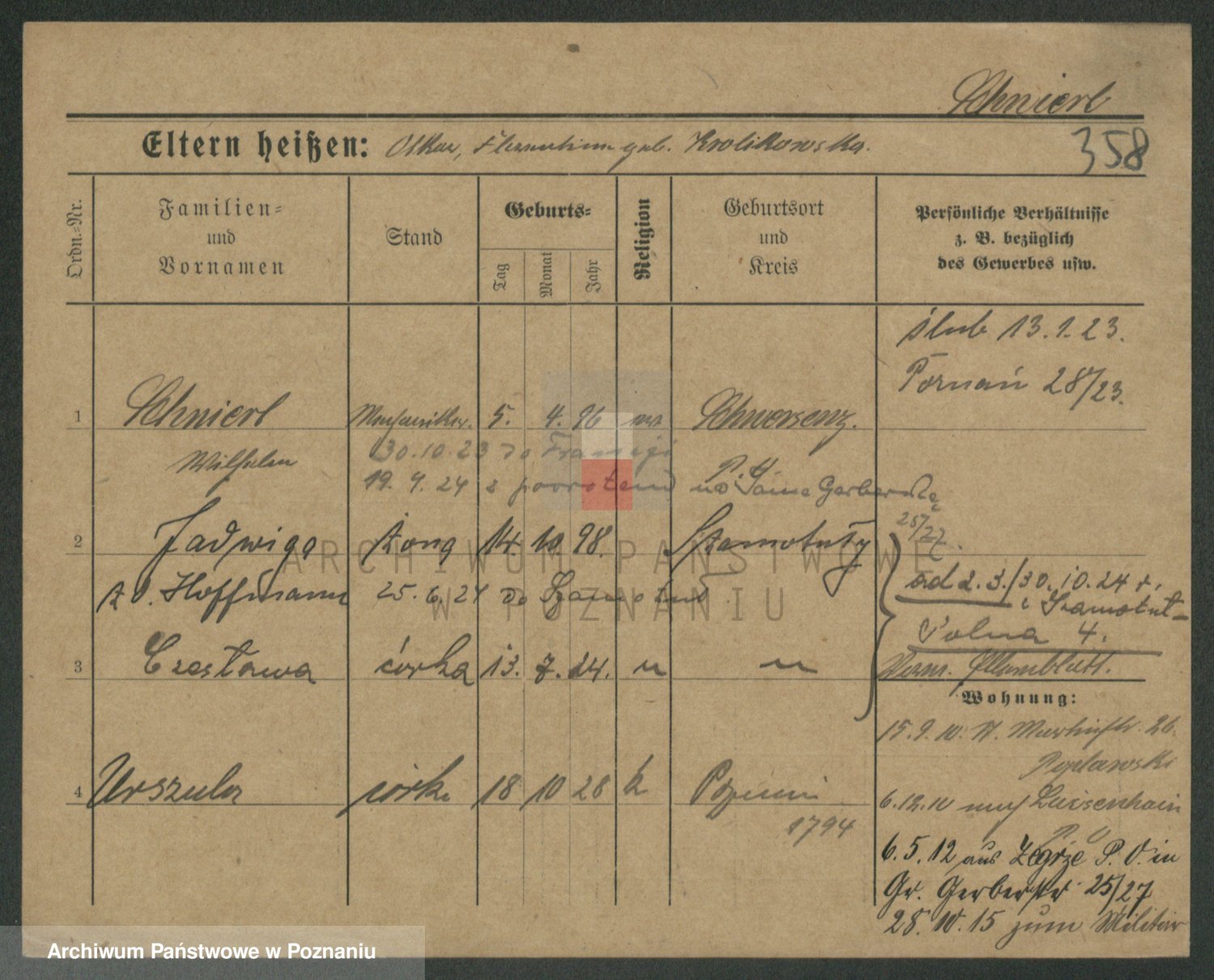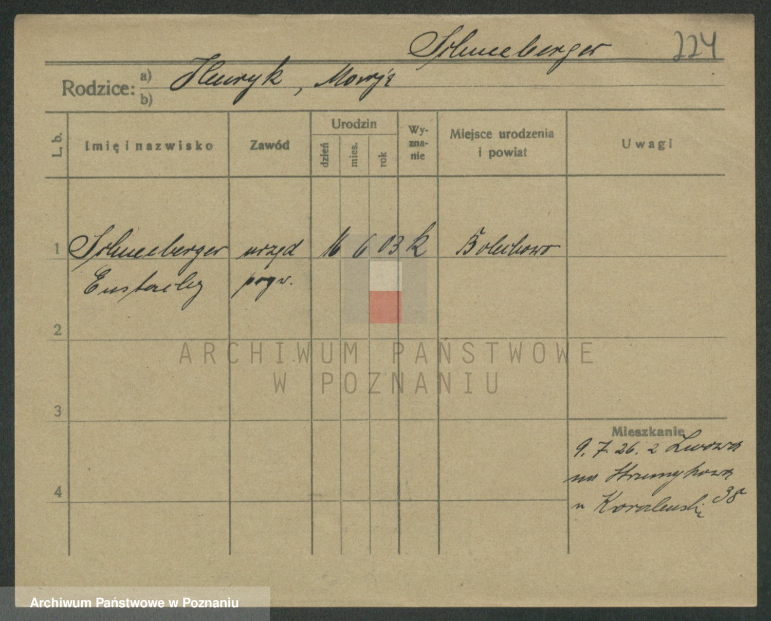 Podgląd karty osobowej dostępny jest po kliknięciu na nazwisko lub ikonkę karty. Można dokonywać powiększenia (ikony na górze) lub przechodzić między kolejnymi skanami (strzałki po bokach).