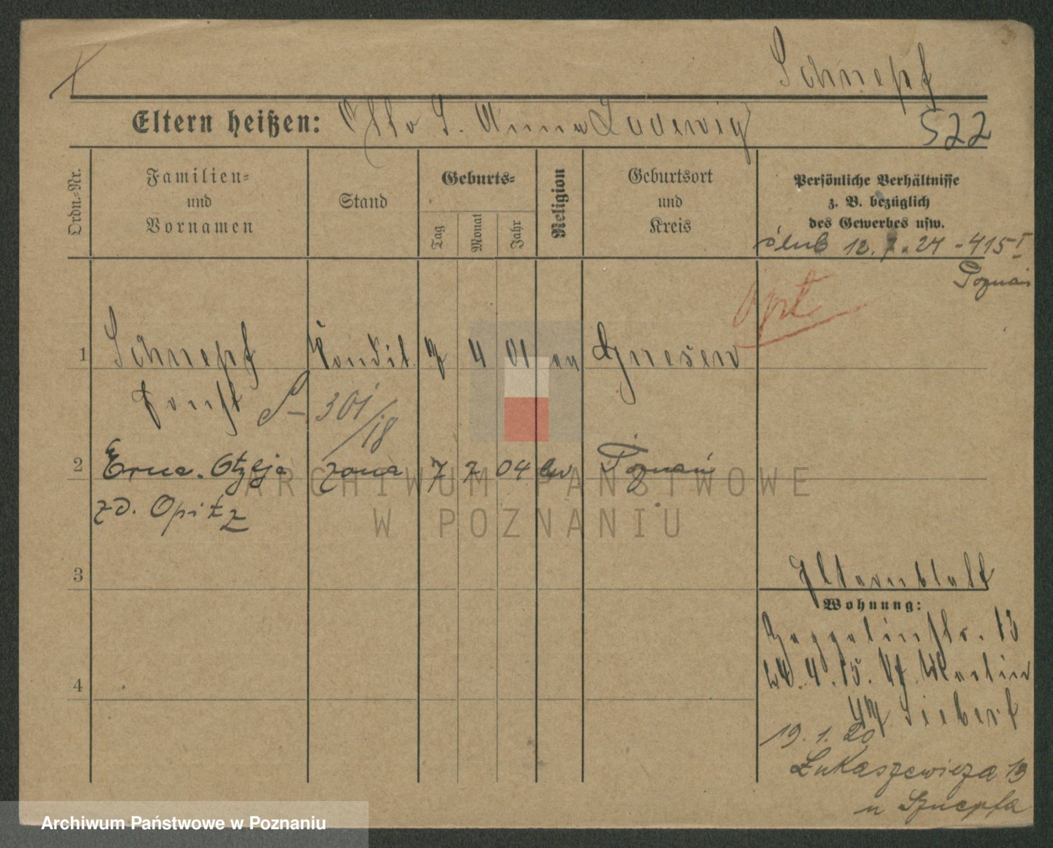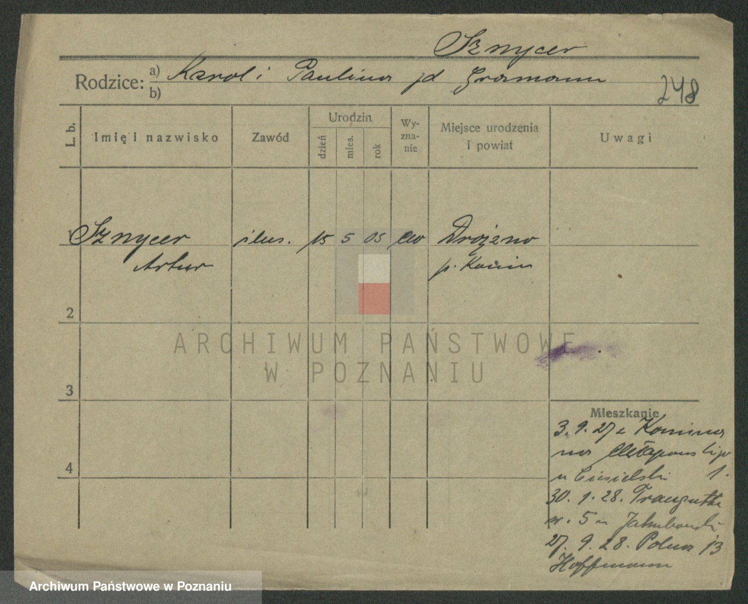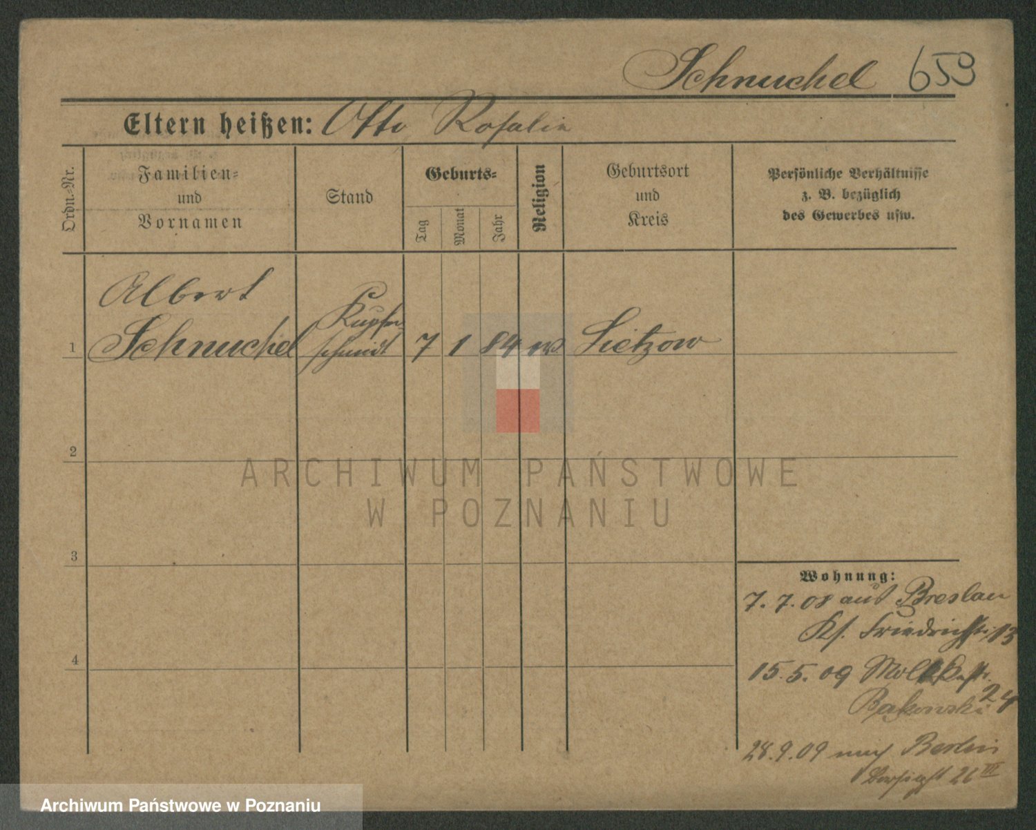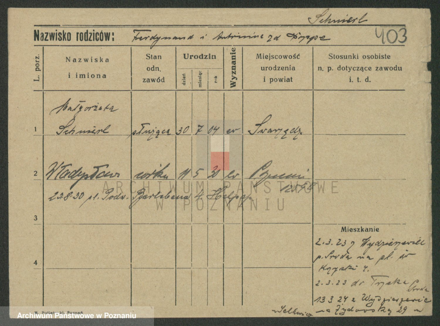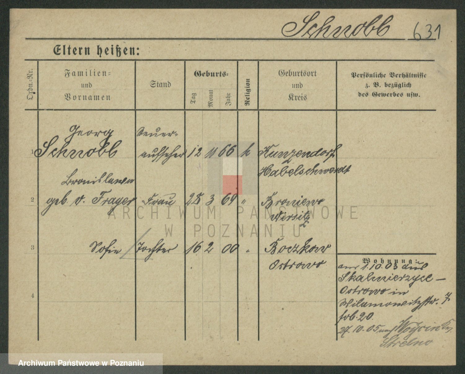 Podgląd karty osobowej dostępny jest po kliknięciu na nazwisko lub ikonkę karty. Można dokonywać powiększenia (ikony na górze) lub przechodzić między kolejnymi skanami (strzałki po bokach).