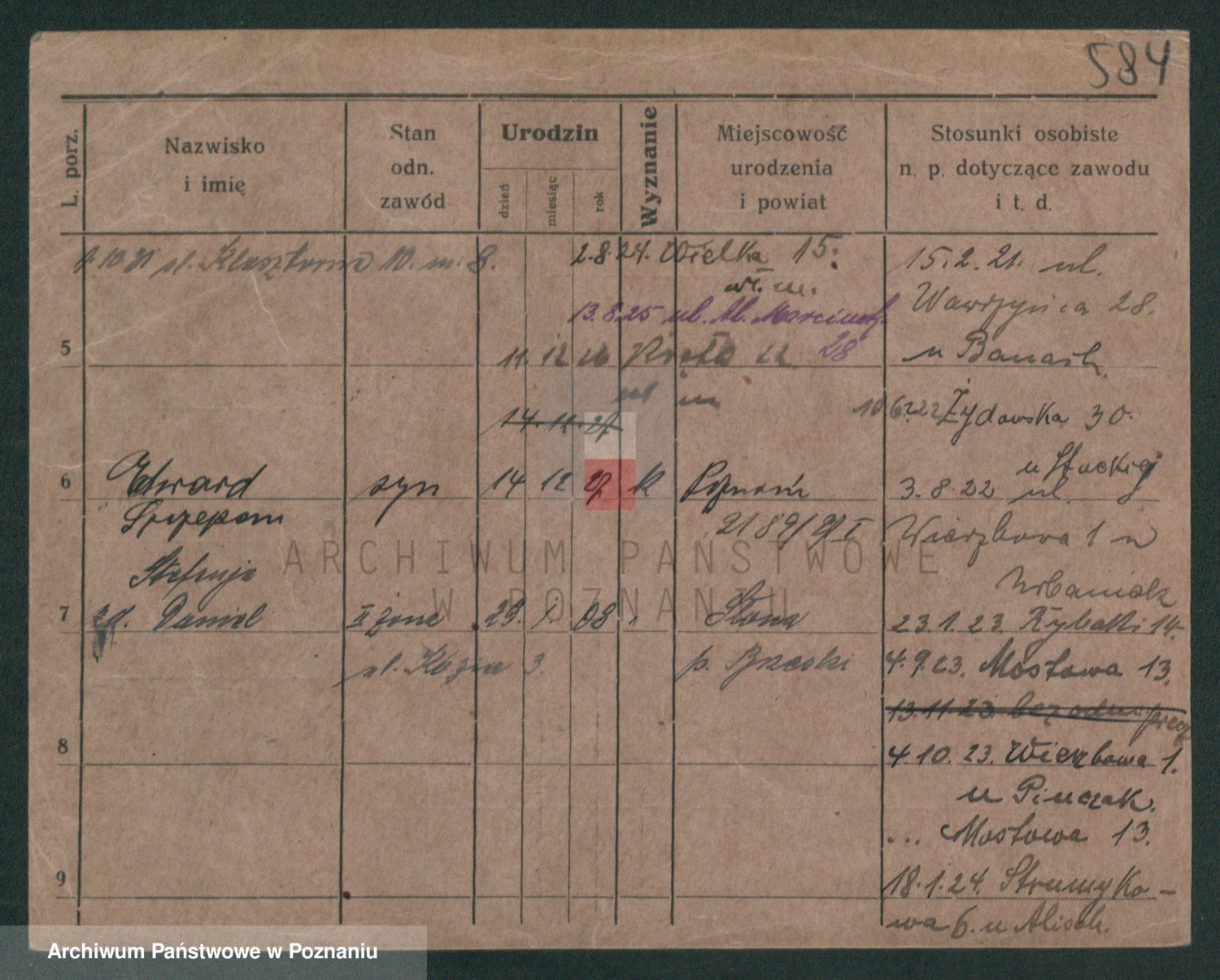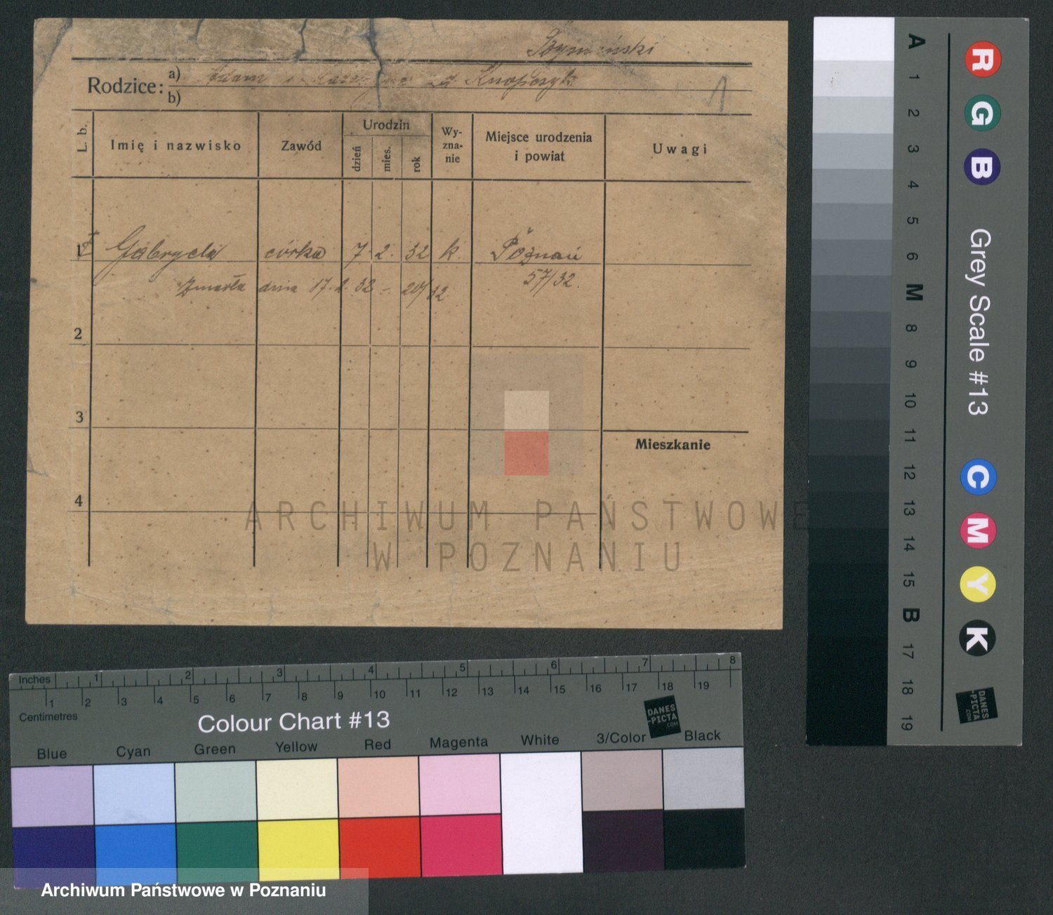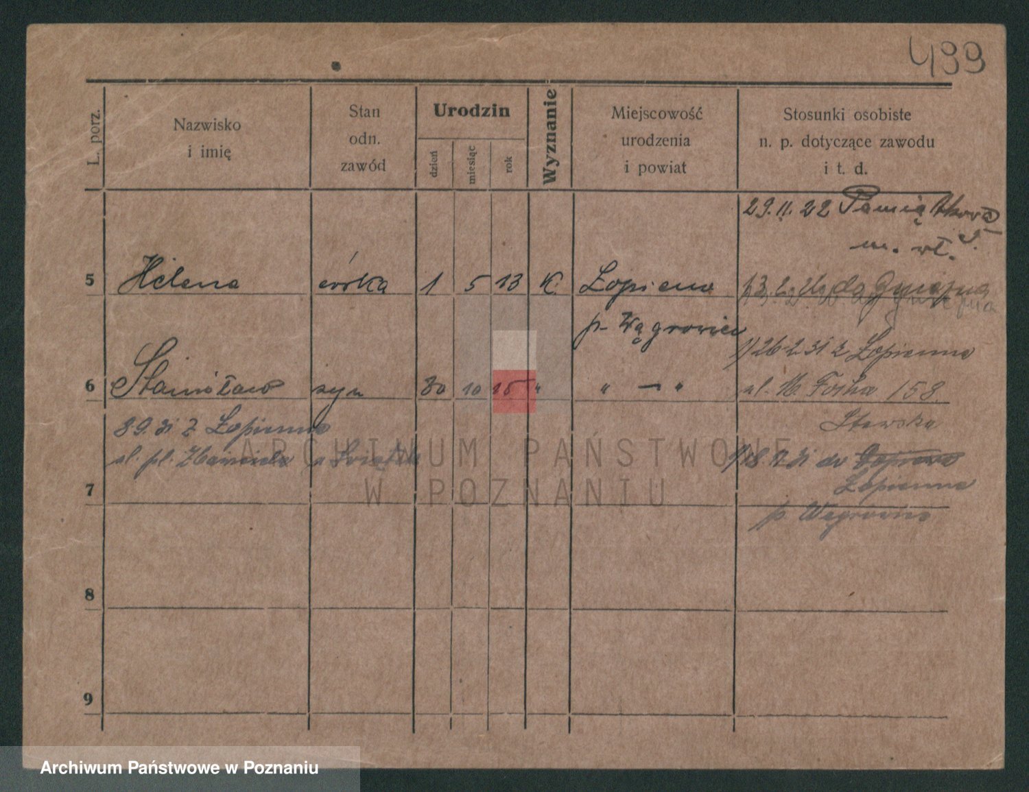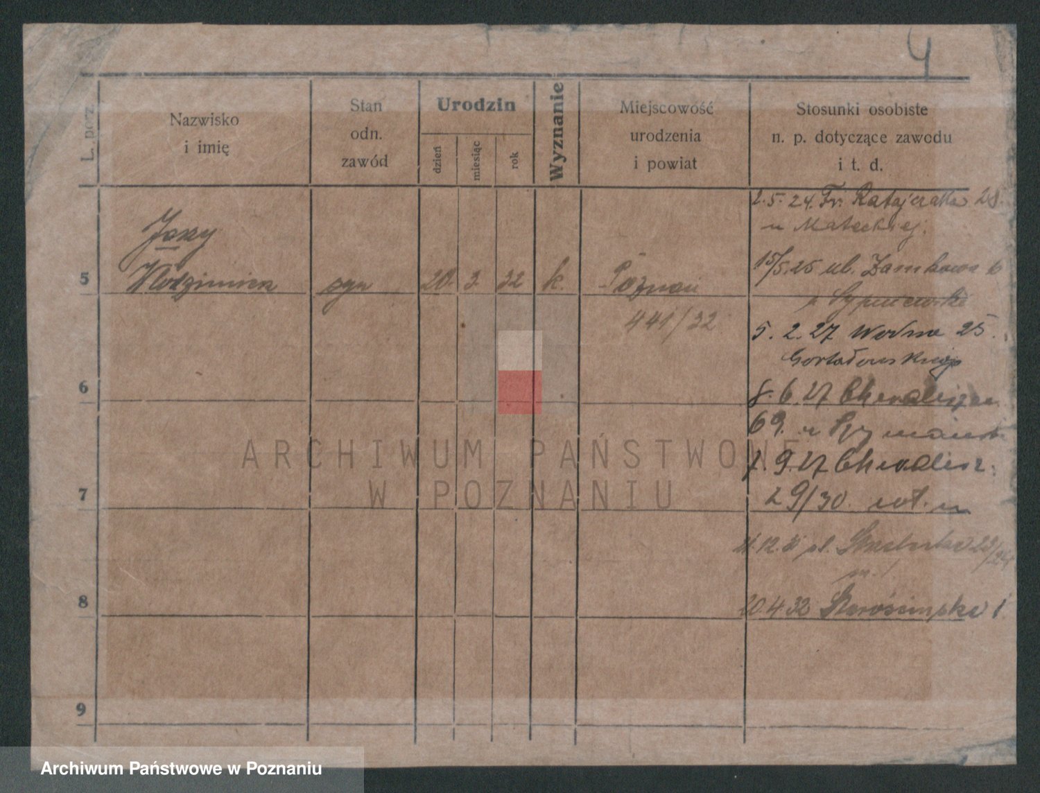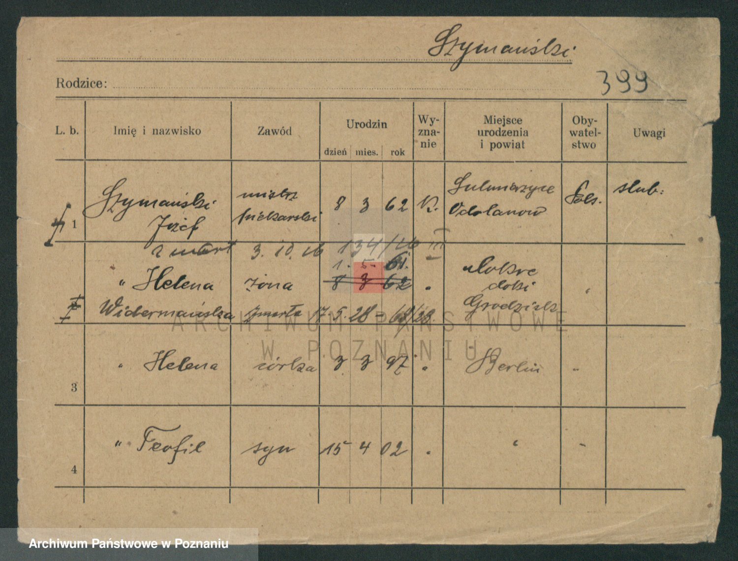 Podgląd karty osobowej dostępny jest po kliknięciu na nazwisko lub ikonkę karty. Można dokonywać powiększenia (ikony na górze) lub przechodzić między kolejnymi skanami (strzałki po bokach).