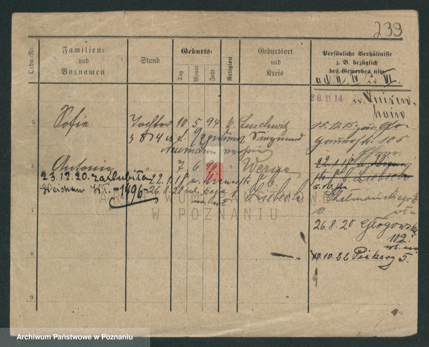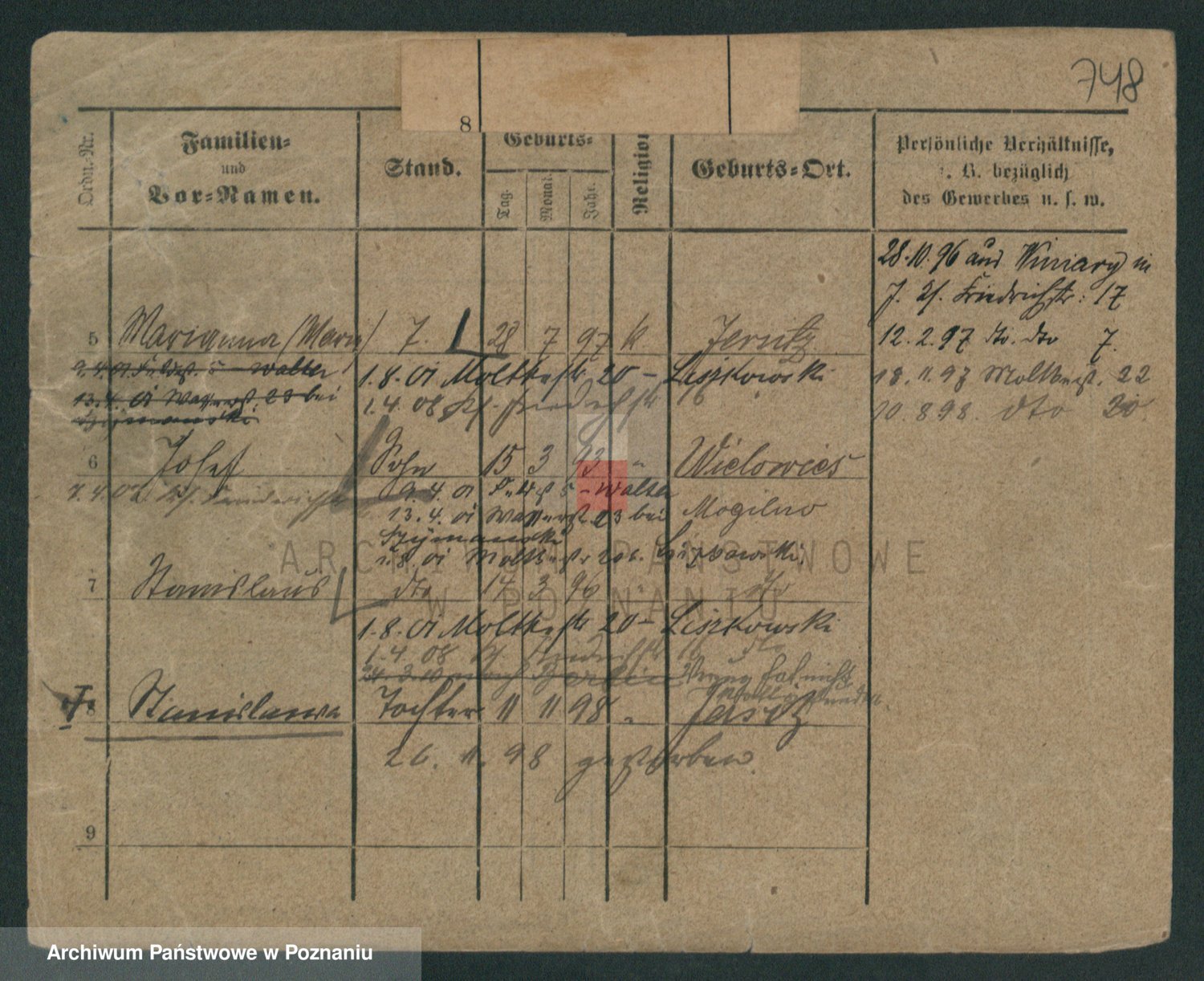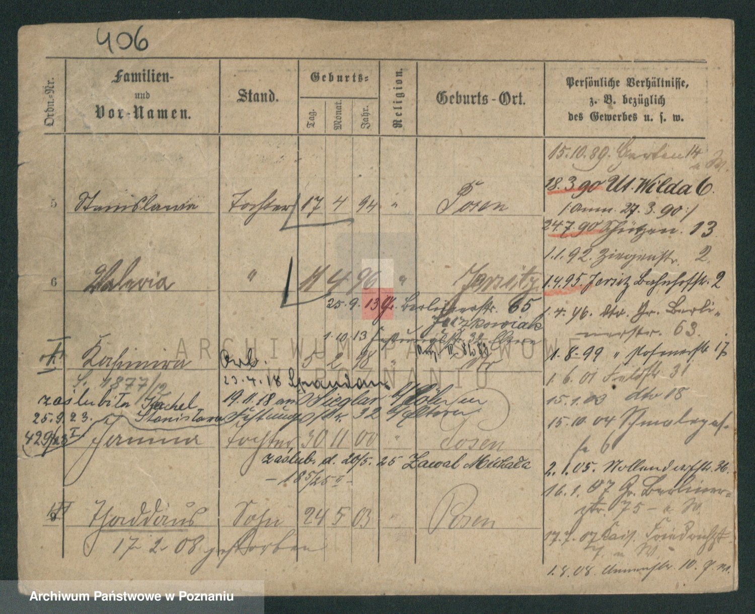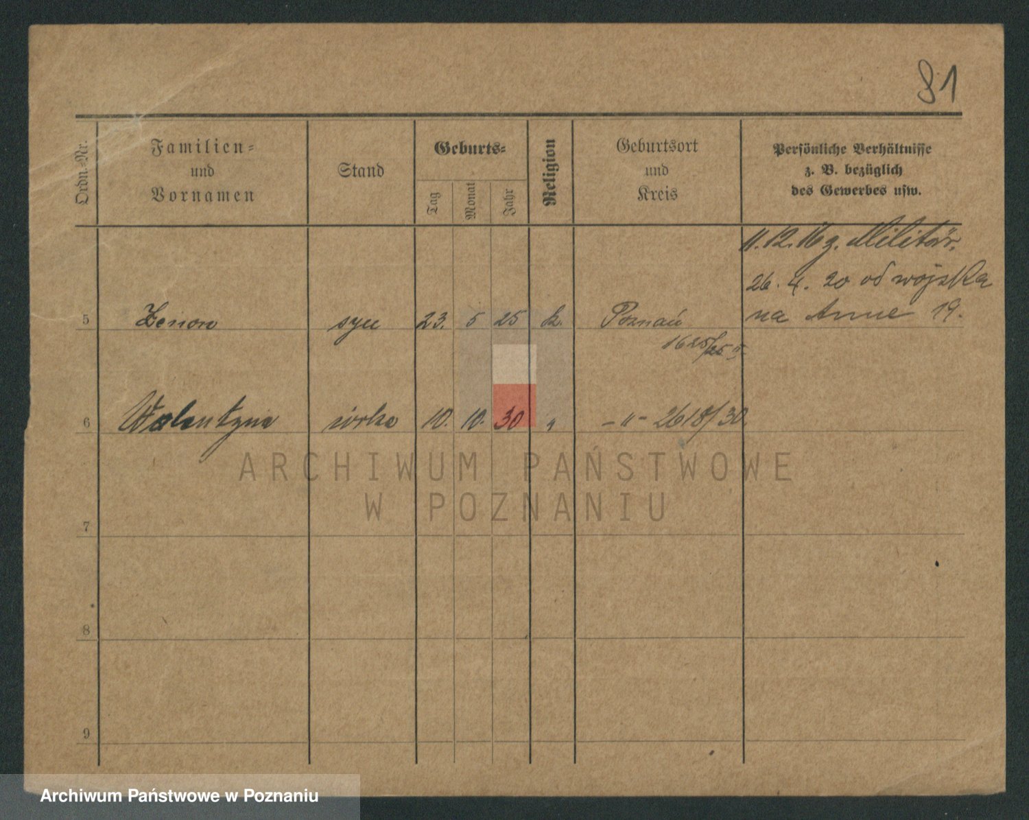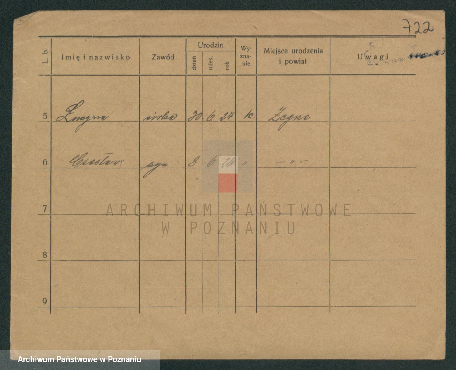 Podgląd karty osobowej dostępny jest po kliknięciu na nazwisko lub ikonkę karty. Można dokonywać powiększenia (ikony na górze) lub przechodzić między kolejnymi skanami (strzałki po bokach).