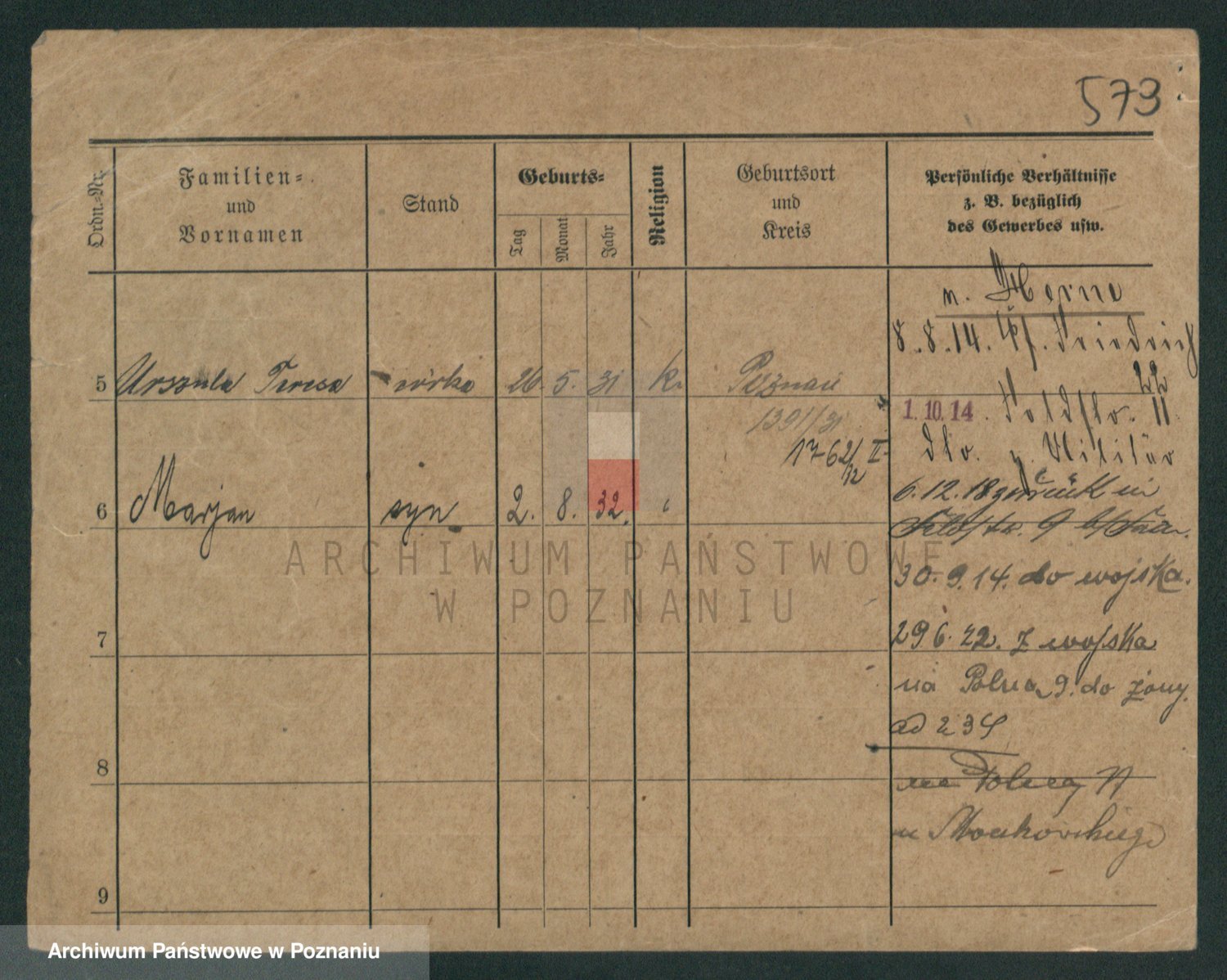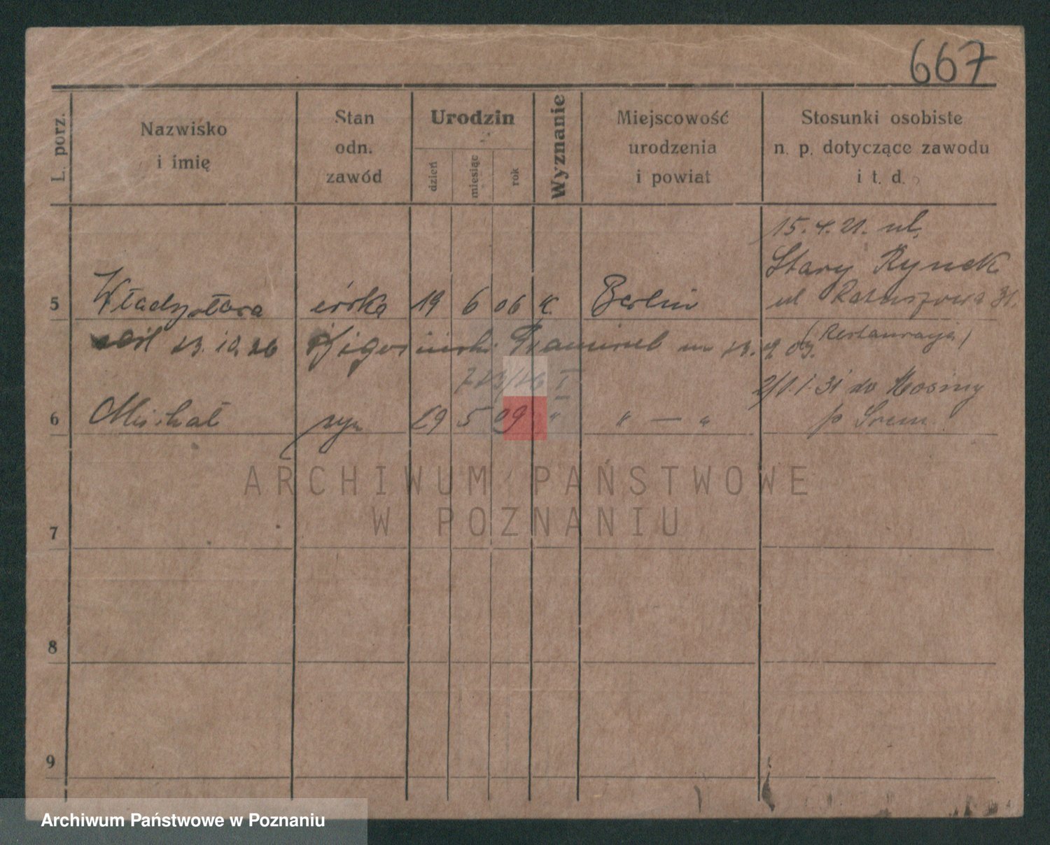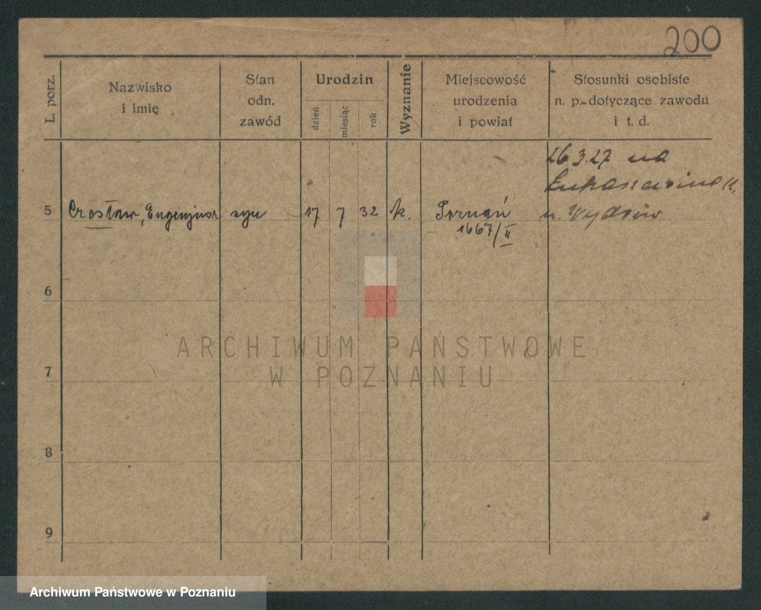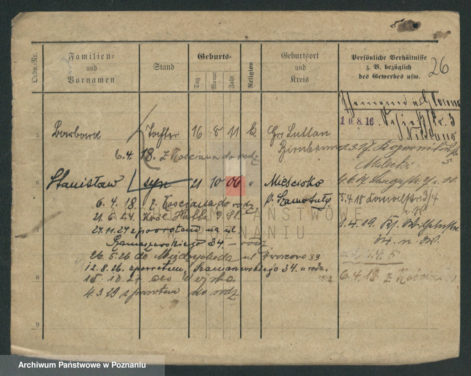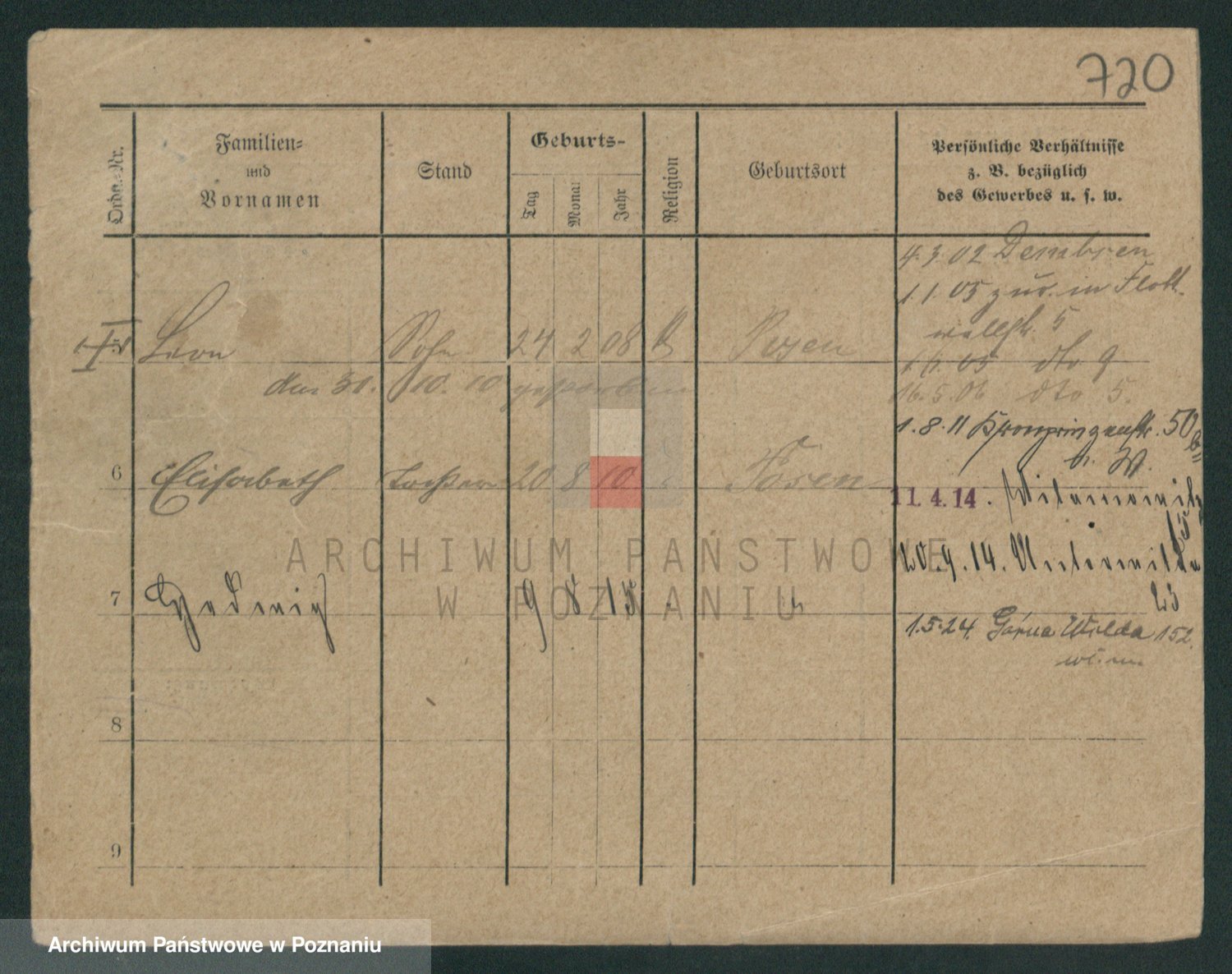 Podgląd karty osobowej dostępny jest po kliknięciu na nazwisko lub ikonkę karty. Można dokonywać powiększenia (ikony na górze) lub przechodzić między kolejnymi skanami (strzałki po bokach).