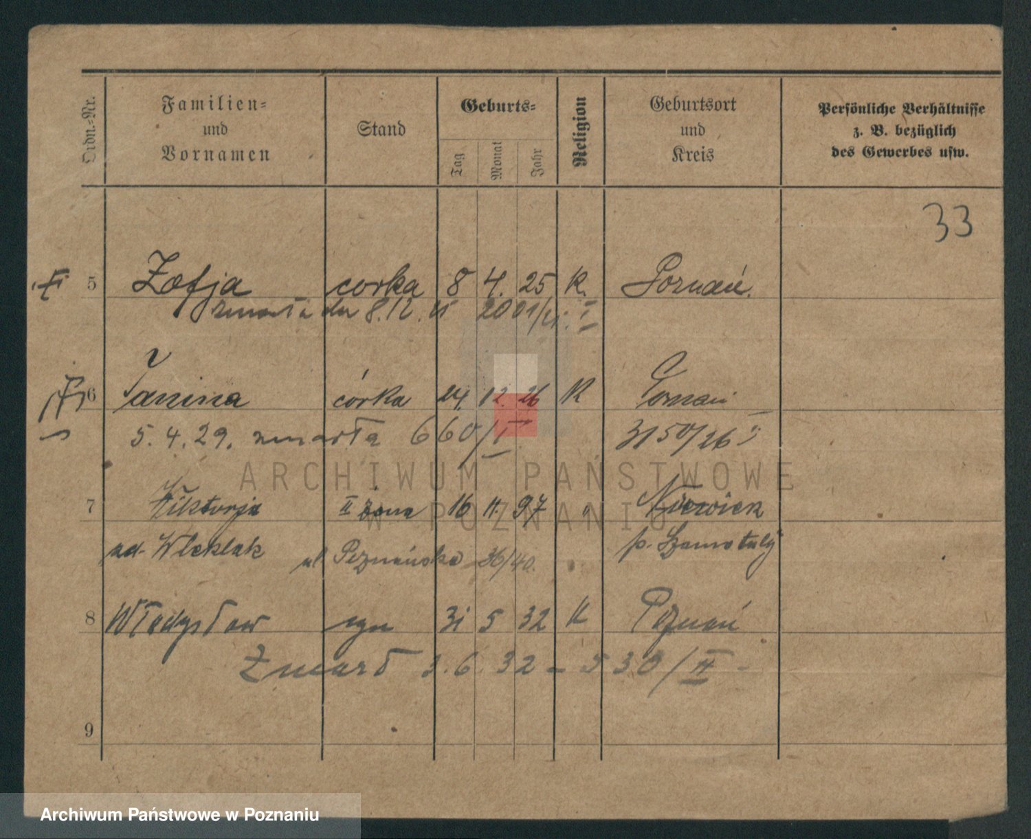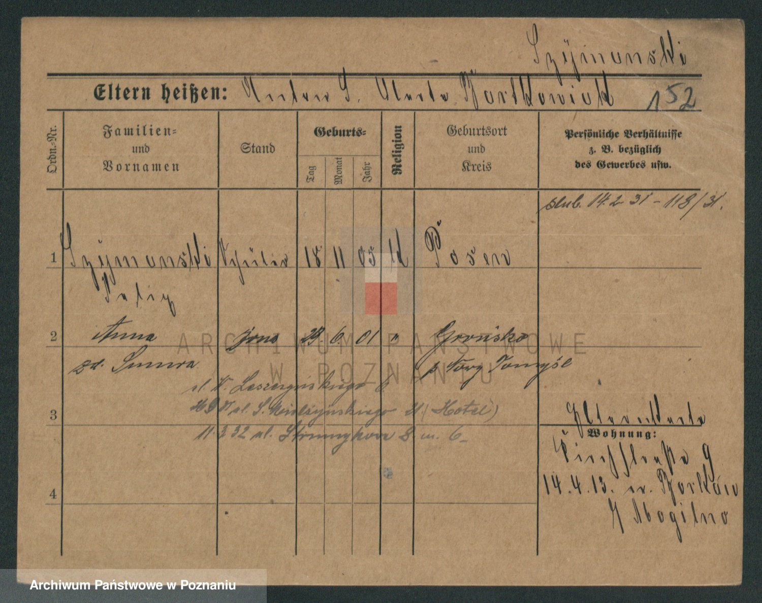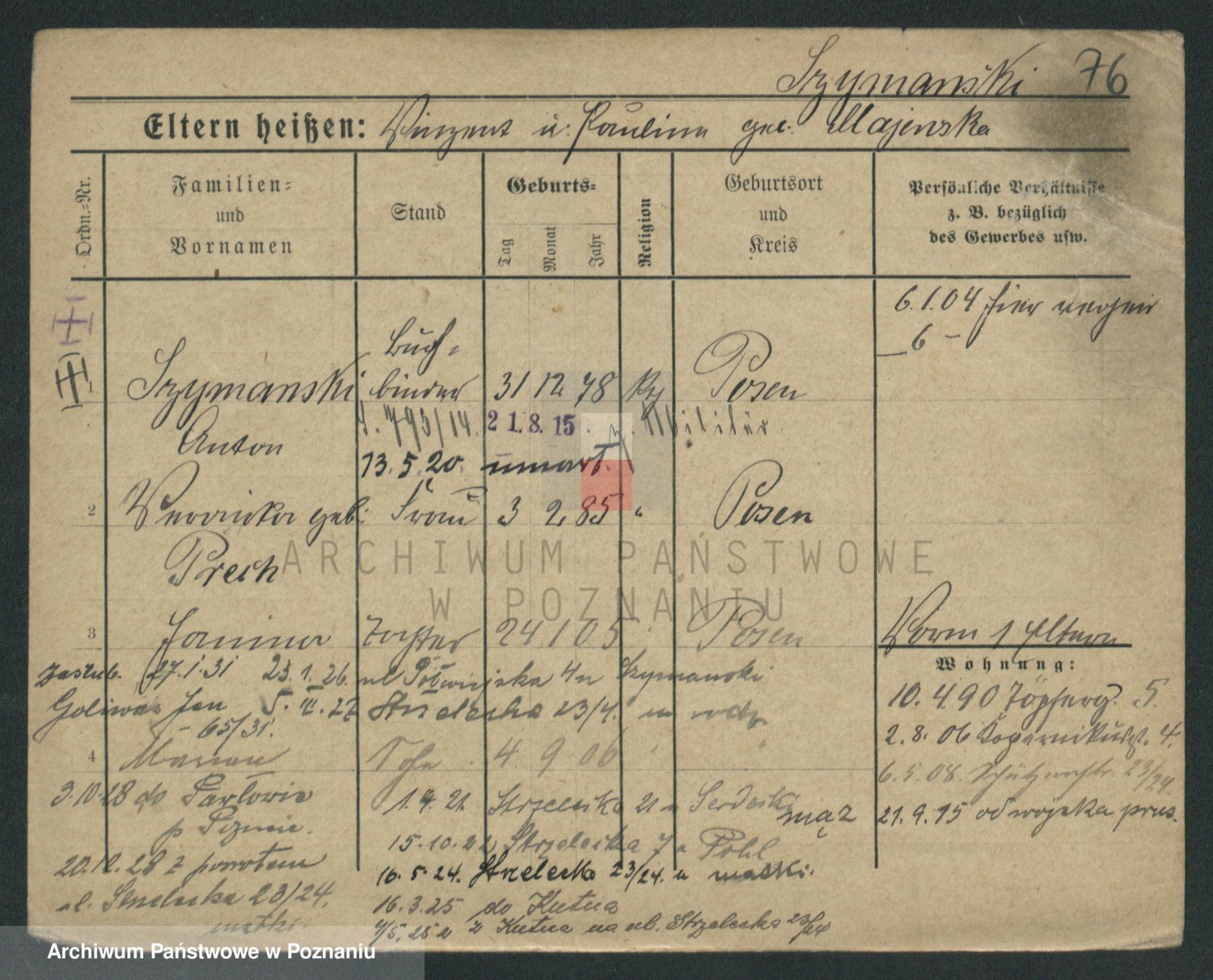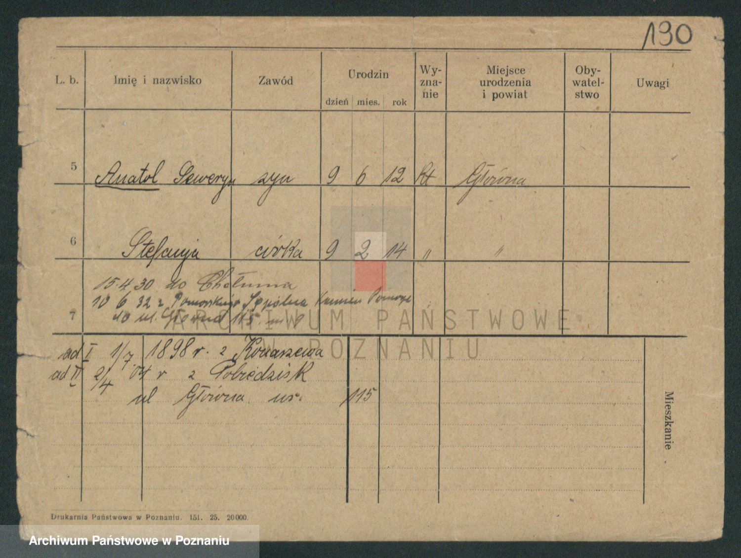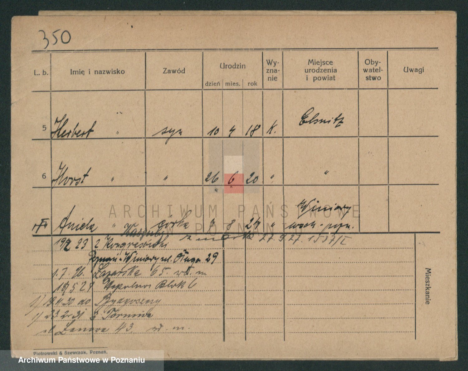Podgląd karty osobowej dostępny jest po kliknięciu na nazwisko lub ikonkę karty. Można dokonywać powiększenia (ikony na górze) lub przechodzić między kolejnymi skanami (strzałki po bokach).