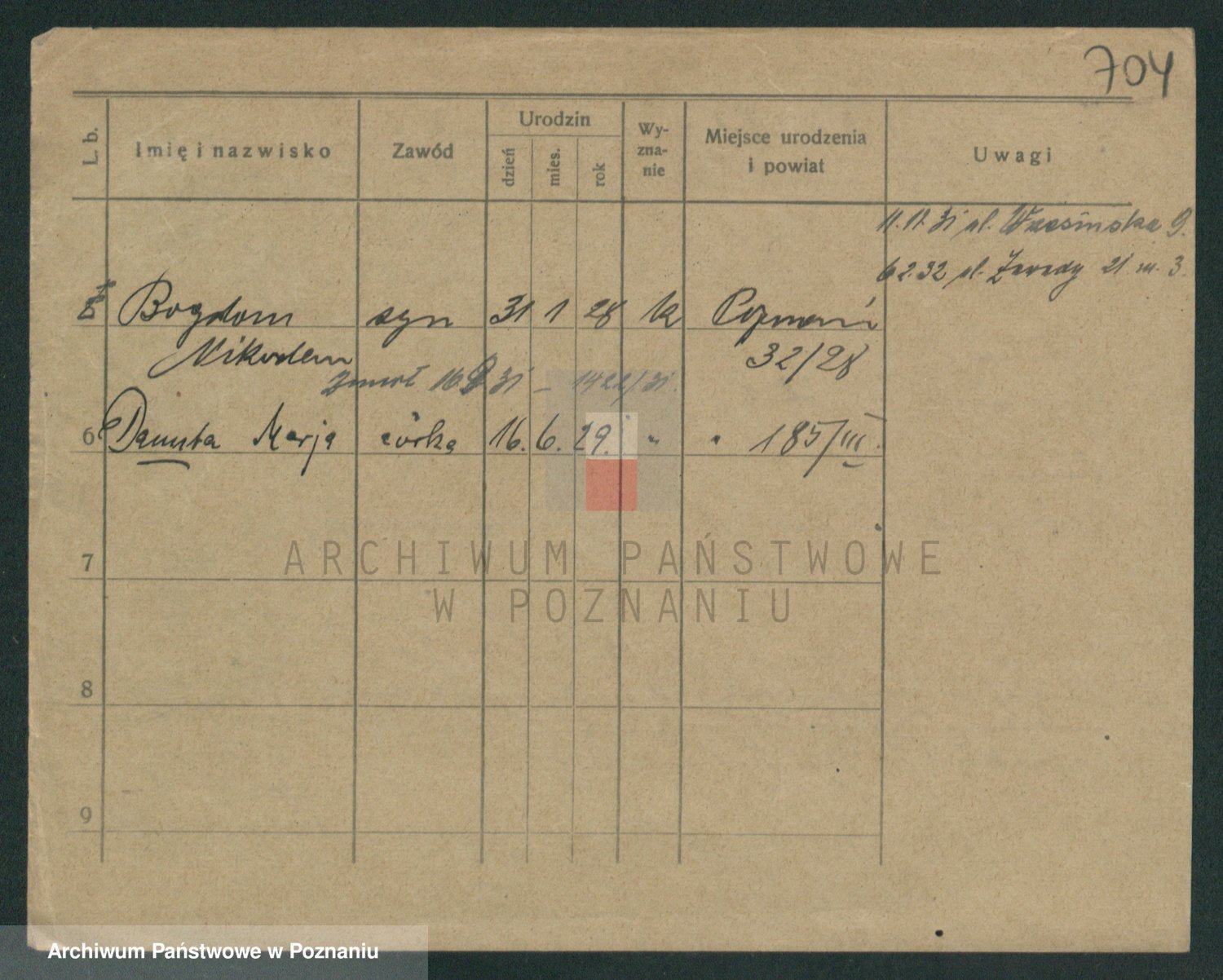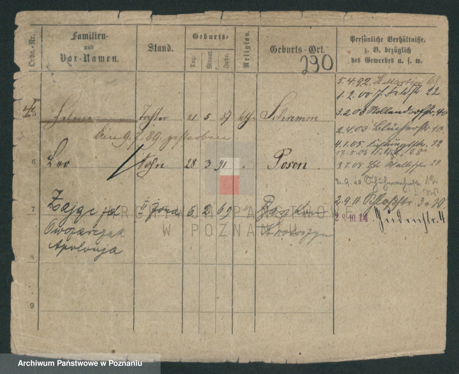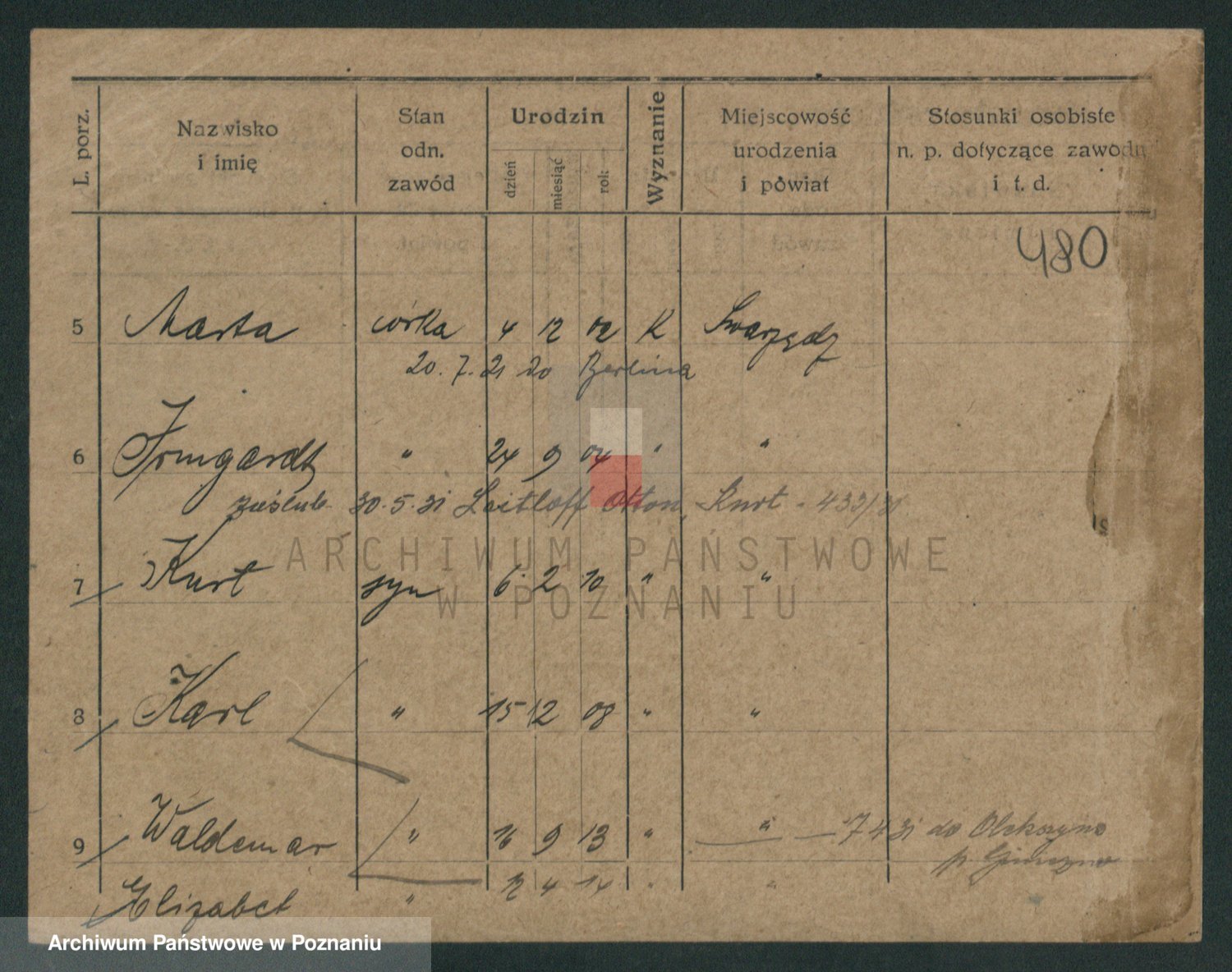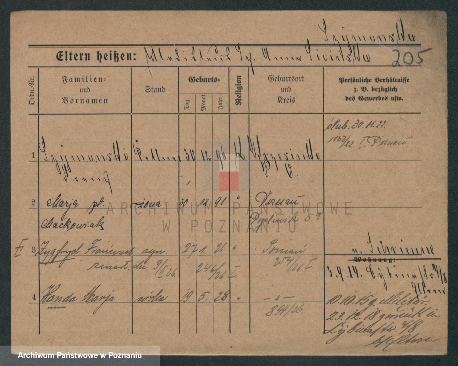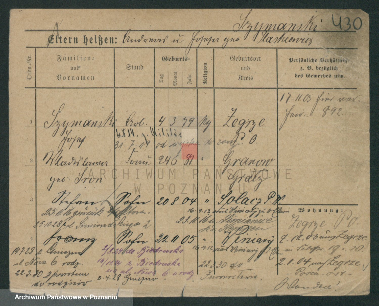 Podgląd karty osobowej dostępny jest po kliknięciu na nazwisko lub ikonkę karty. Można dokonywać powiększenia (ikony na górze) lub przechodzić między kolejnymi skanami (strzałki po bokach).