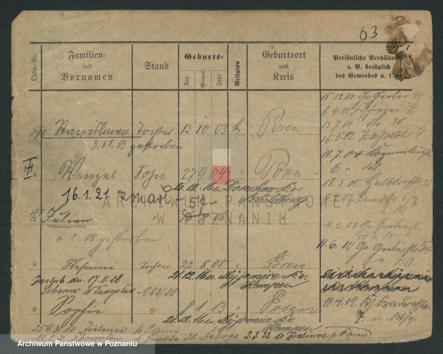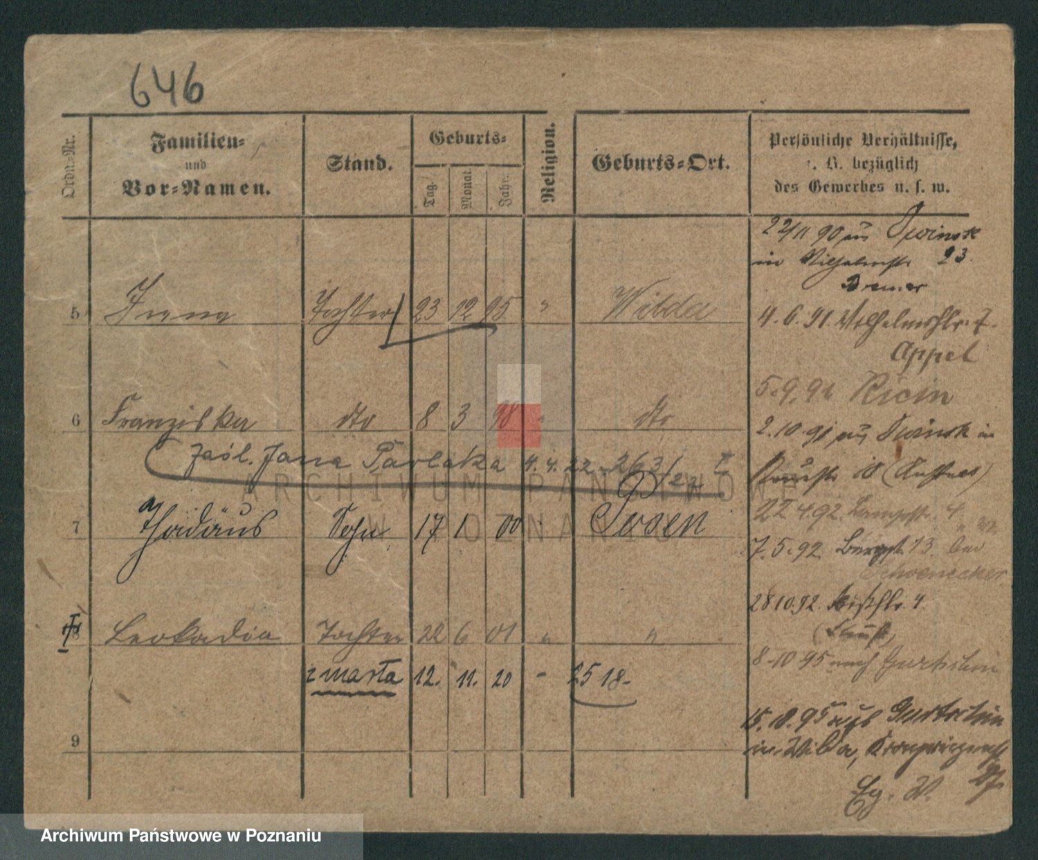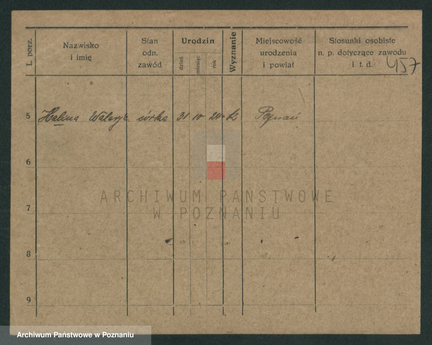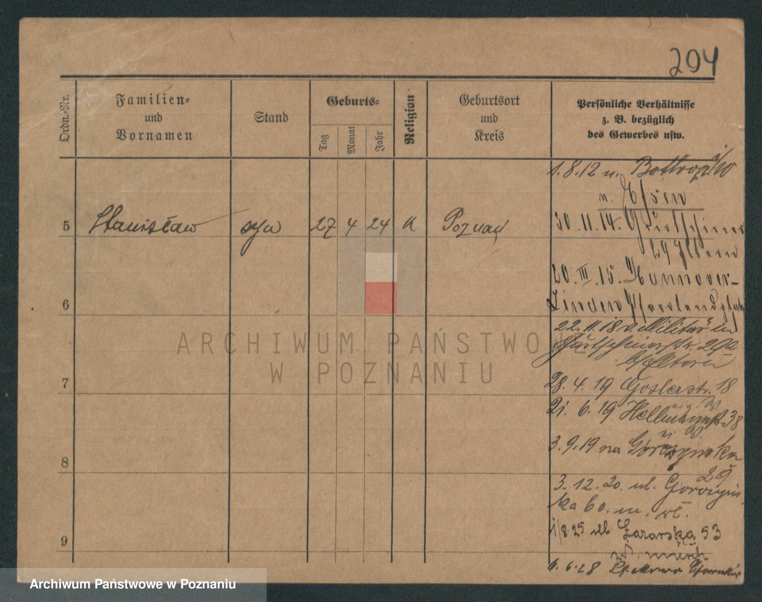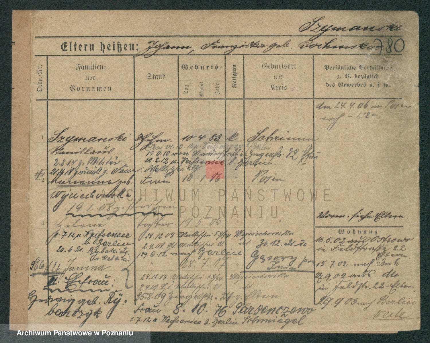 Podgląd karty osobowej dostępny jest po kliknięciu na nazwisko lub ikonkę karty. Można dokonywać powiększenia (ikony na górze) lub przechodzić między kolejnymi skanami (strzałki po bokach).