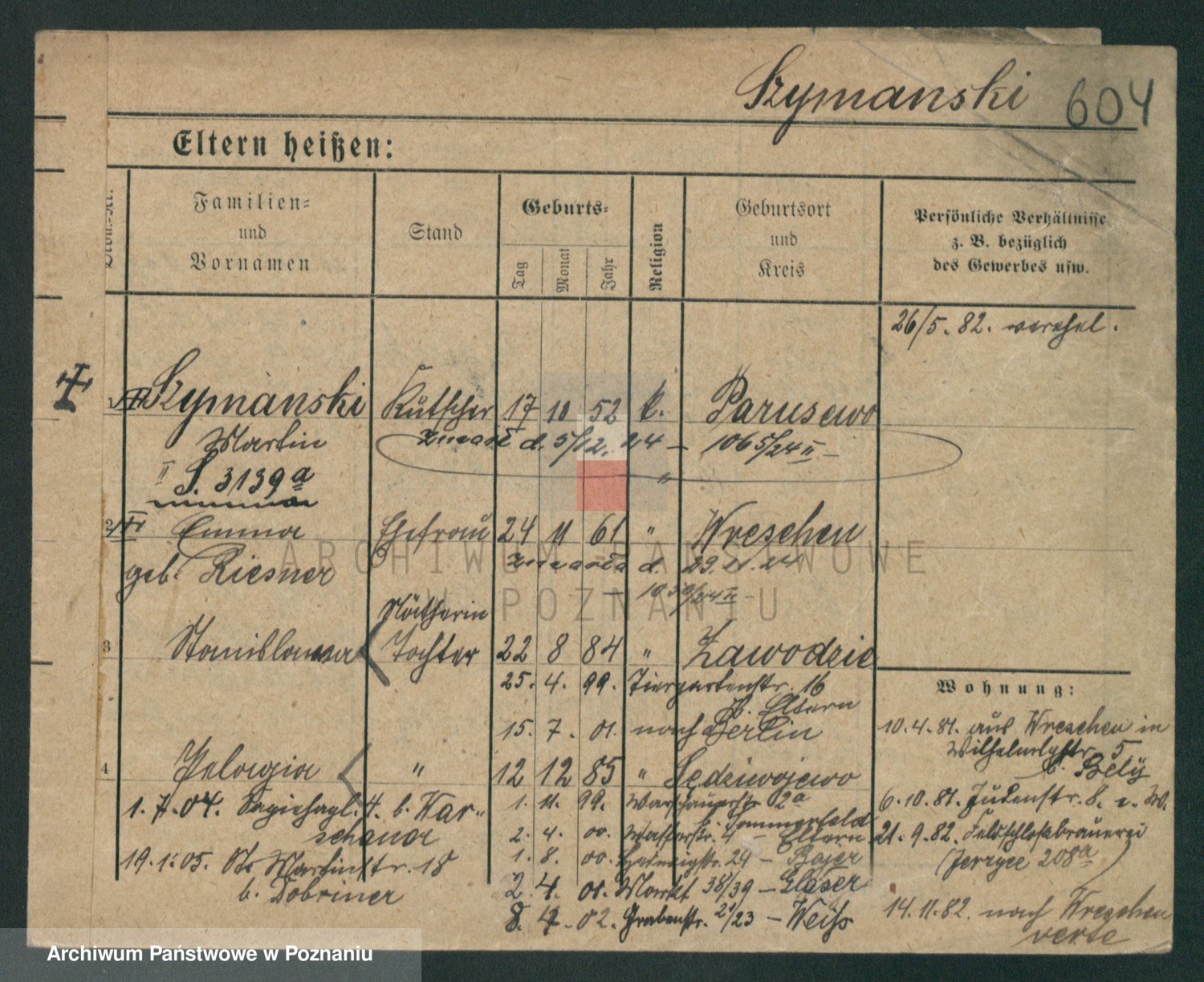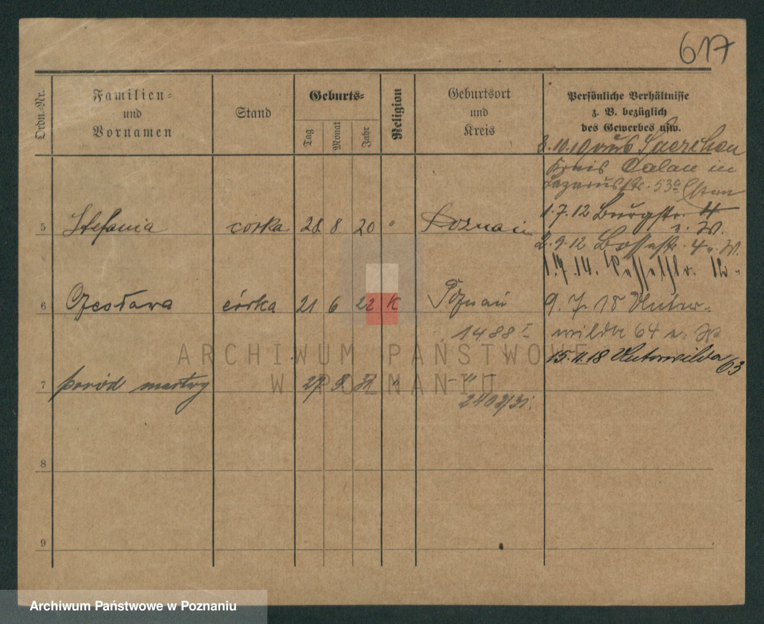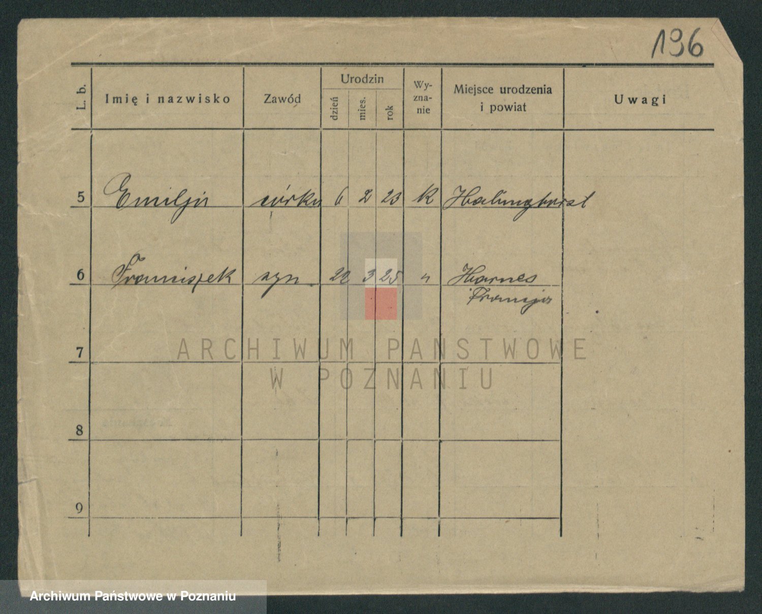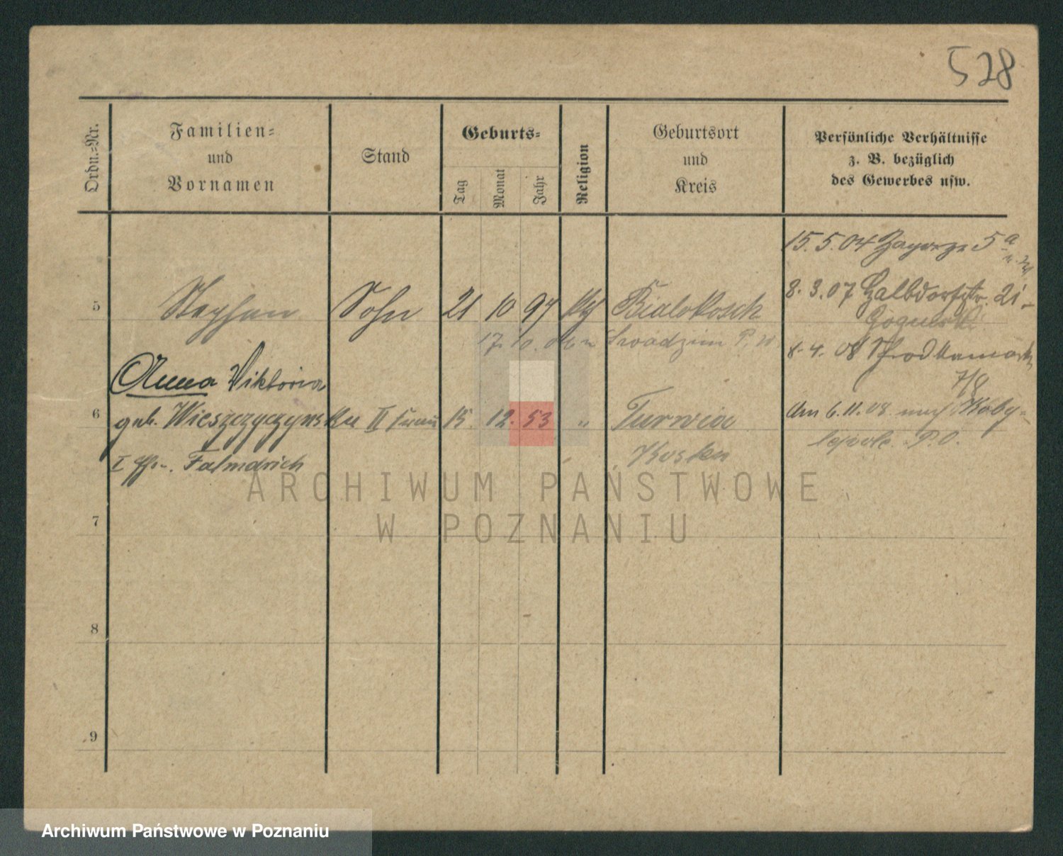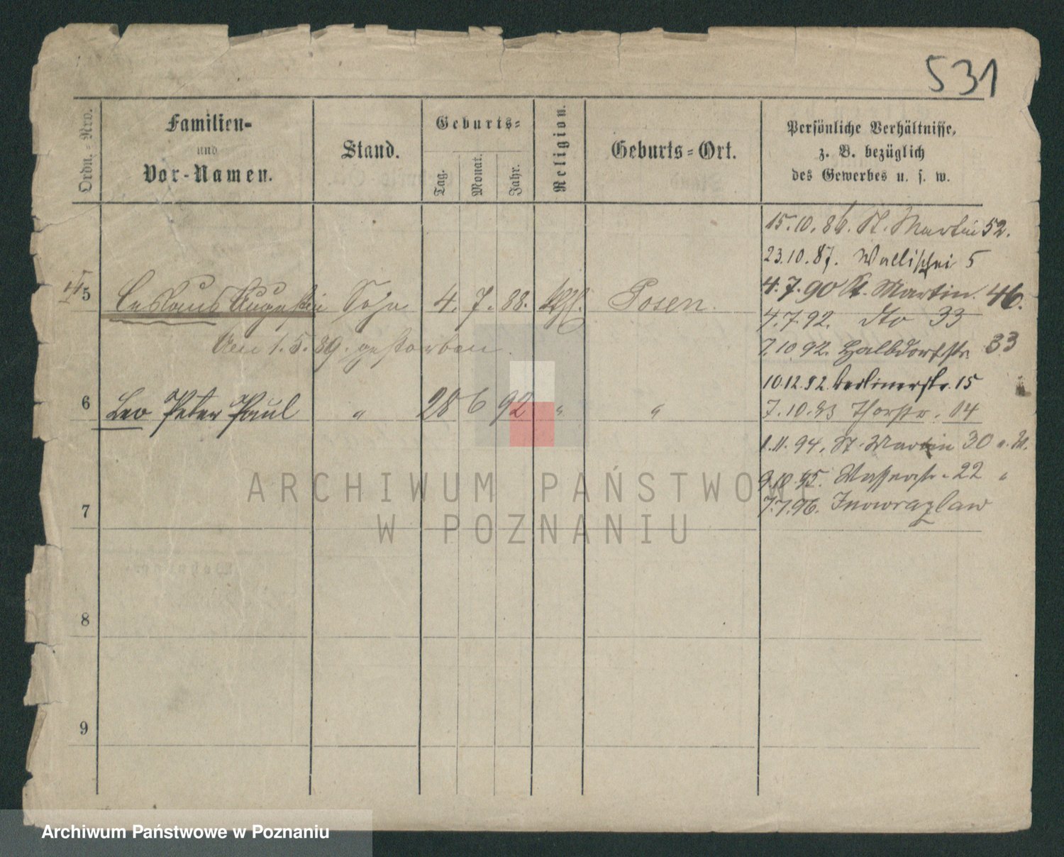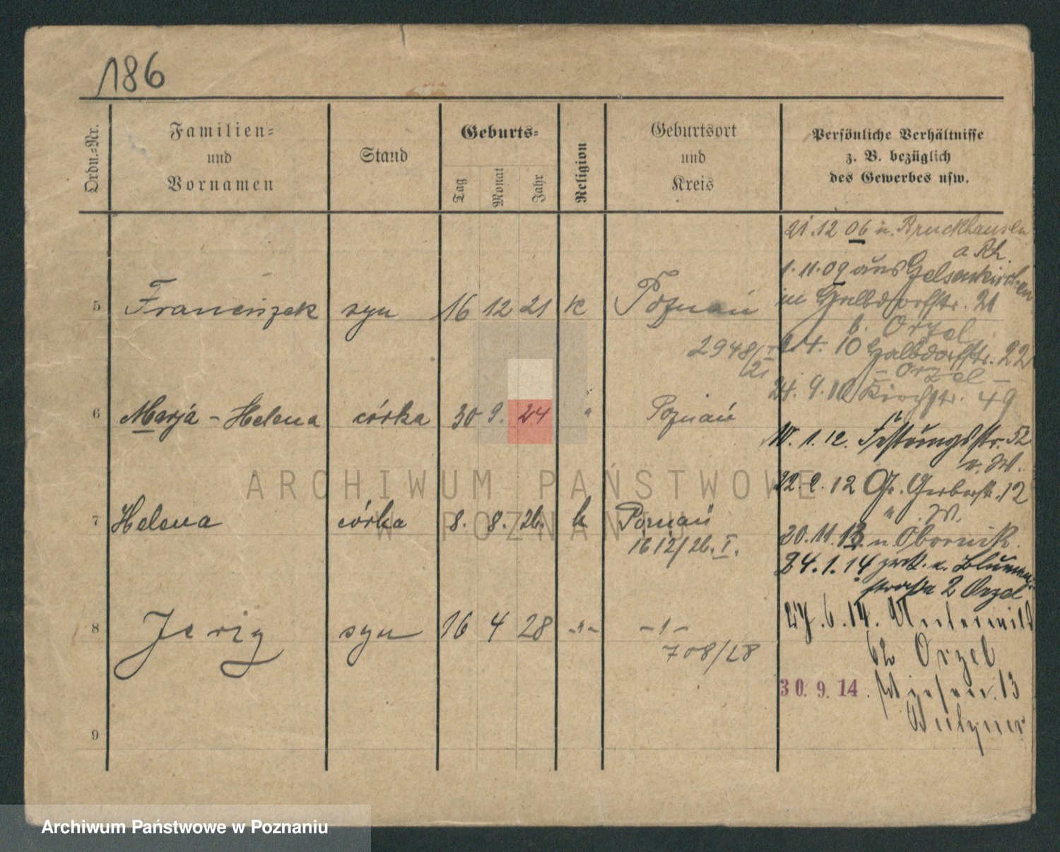 Podgląd karty osobowej dostępny jest po kliknięciu na nazwisko lub ikonkę karty. Można dokonywać powiększenia (ikony na górze) lub przechodzić między kolejnymi skanami (strzałki po bokach).