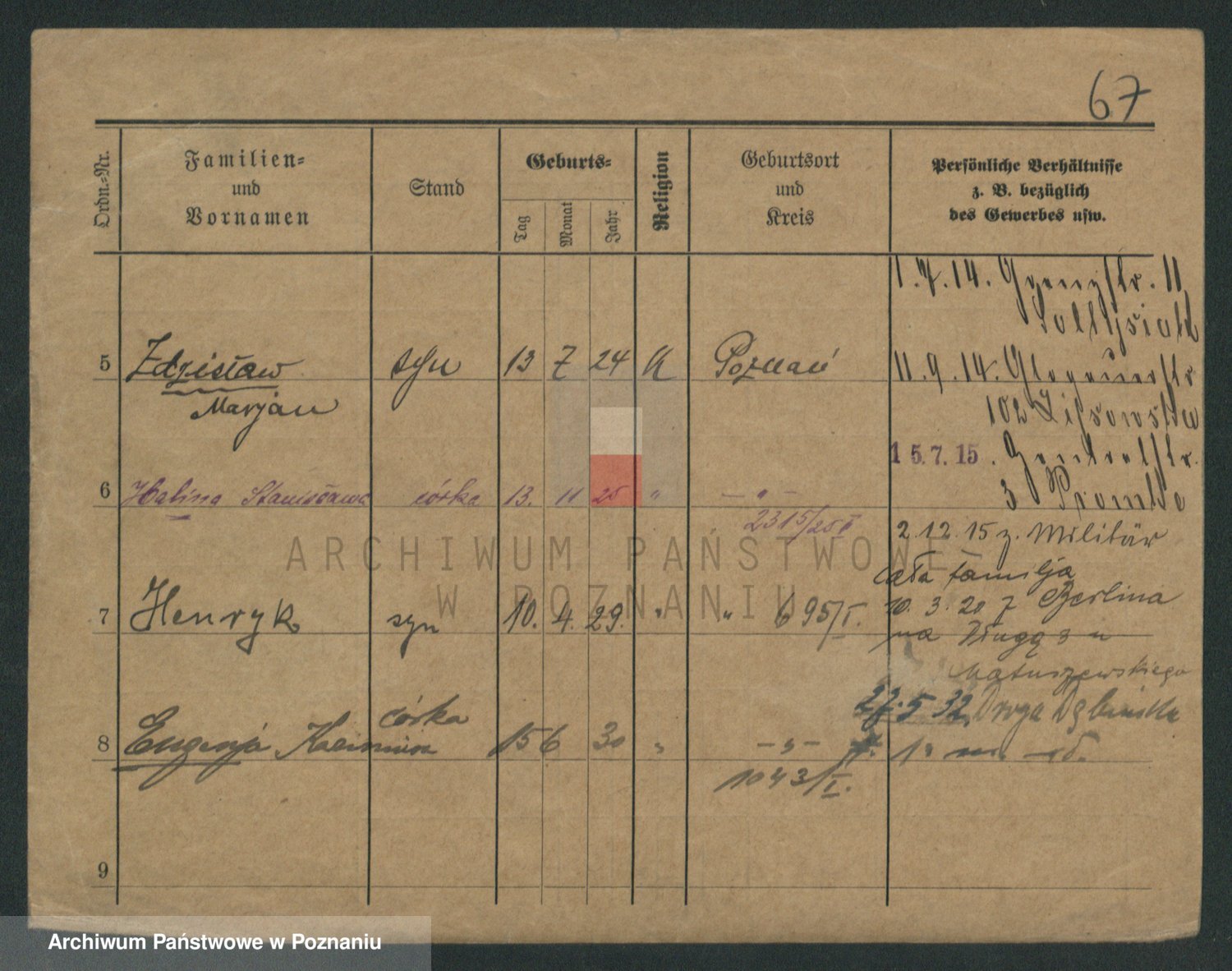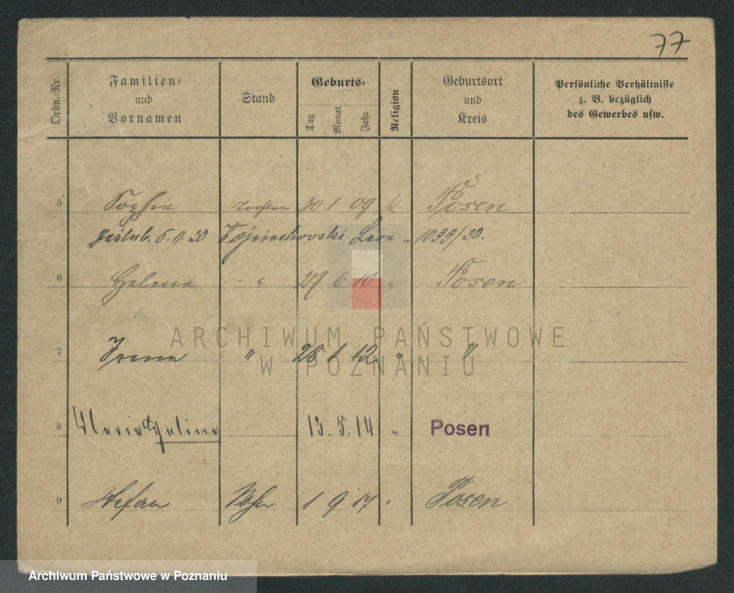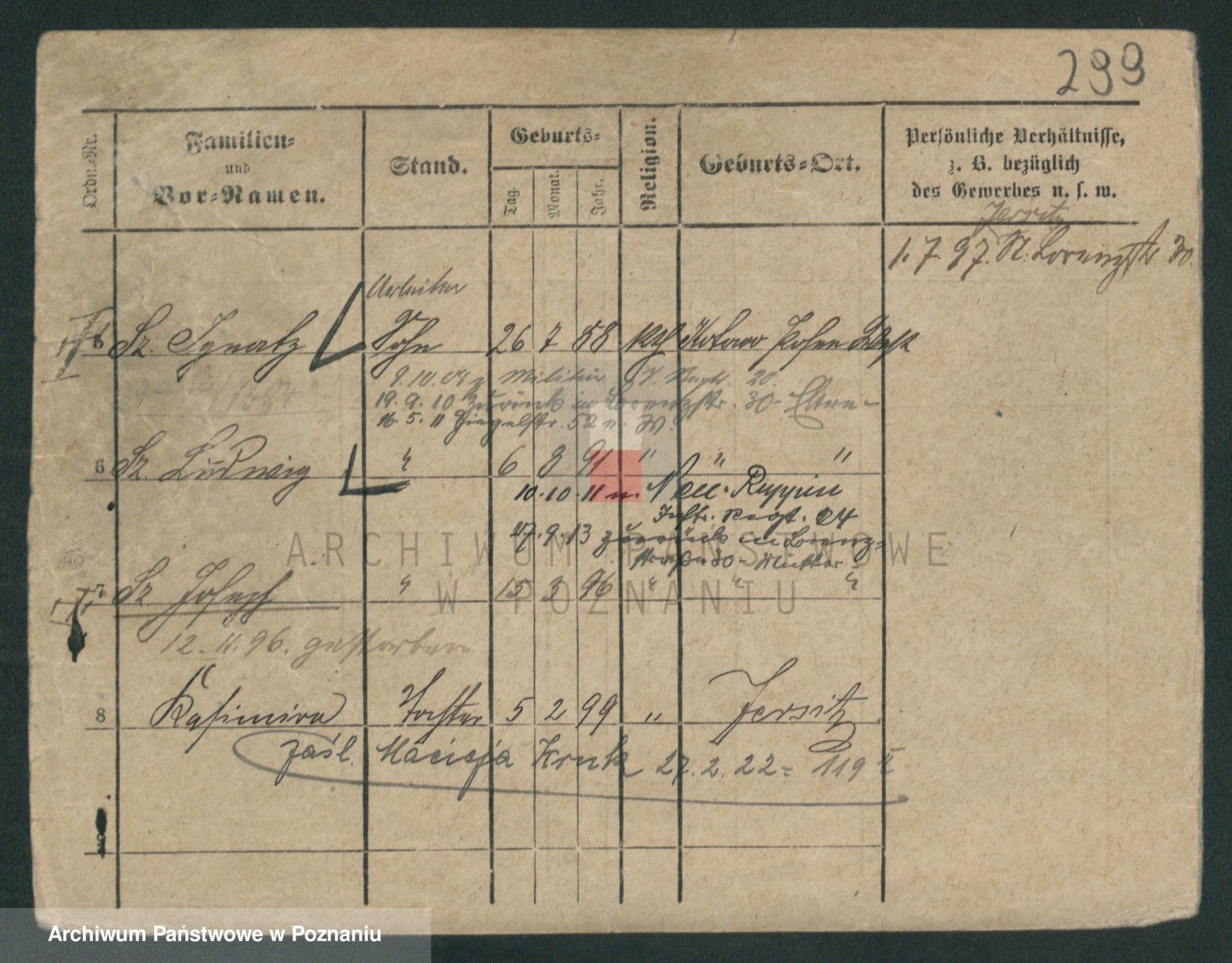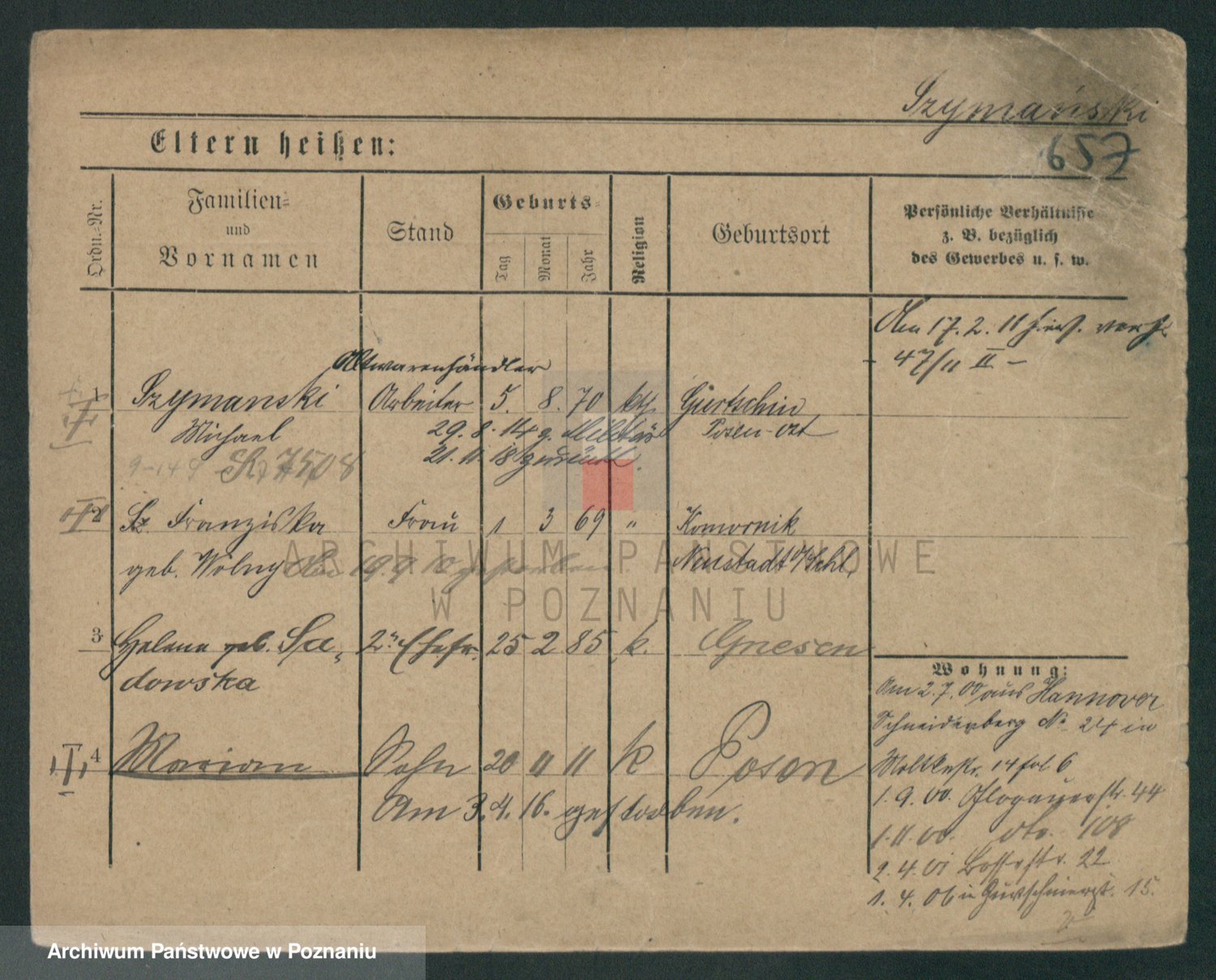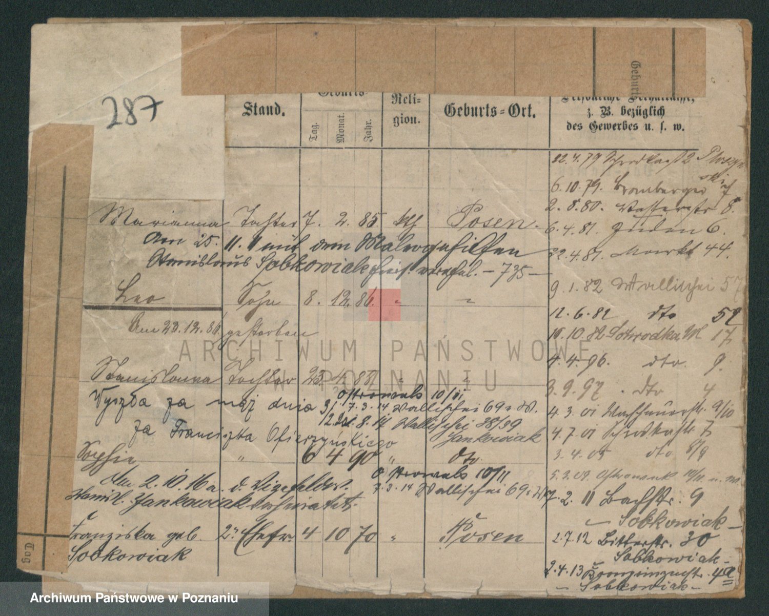 Podgląd karty osobowej dostępny jest po kliknięciu na nazwisko lub ikonkę karty. Można dokonywać powiększenia (ikony na górze) lub przechodzić między kolejnymi skanami (strzałki po bokach).
