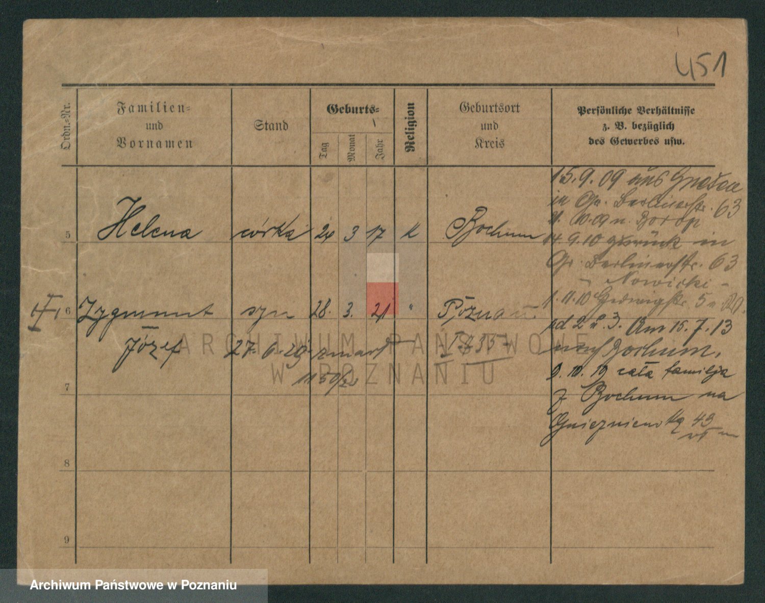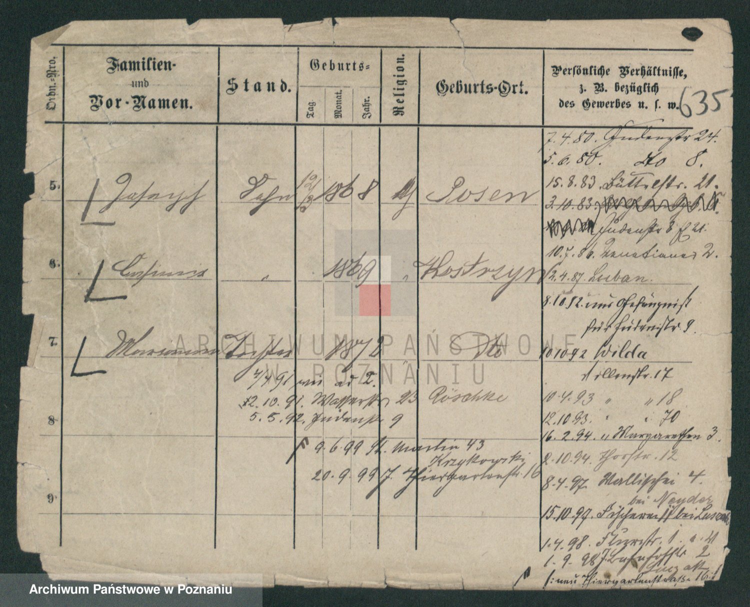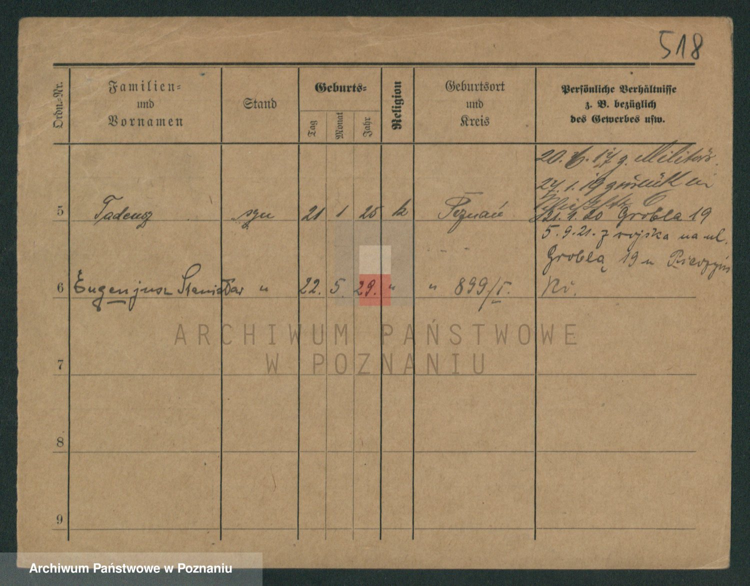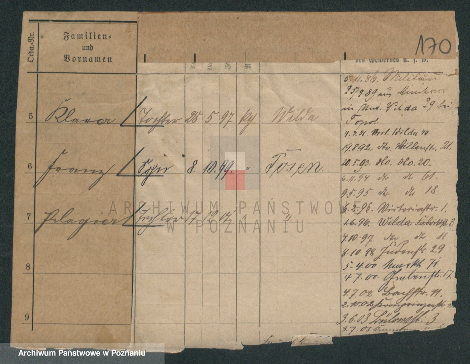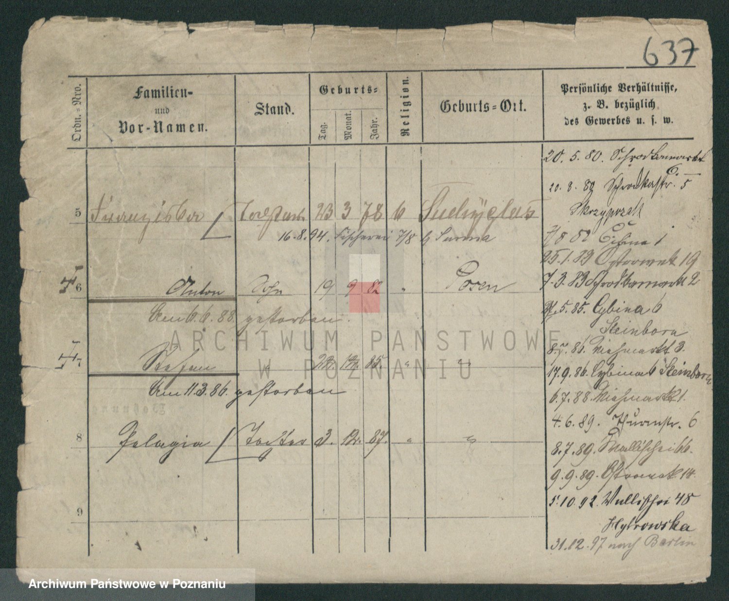 Podgląd karty osobowej dostępny jest po kliknięciu na nazwisko lub ikonkę karty. Można dokonywać powiększenia (ikony na górze) lub przechodzić między kolejnymi skanami (strzałki po bokach).