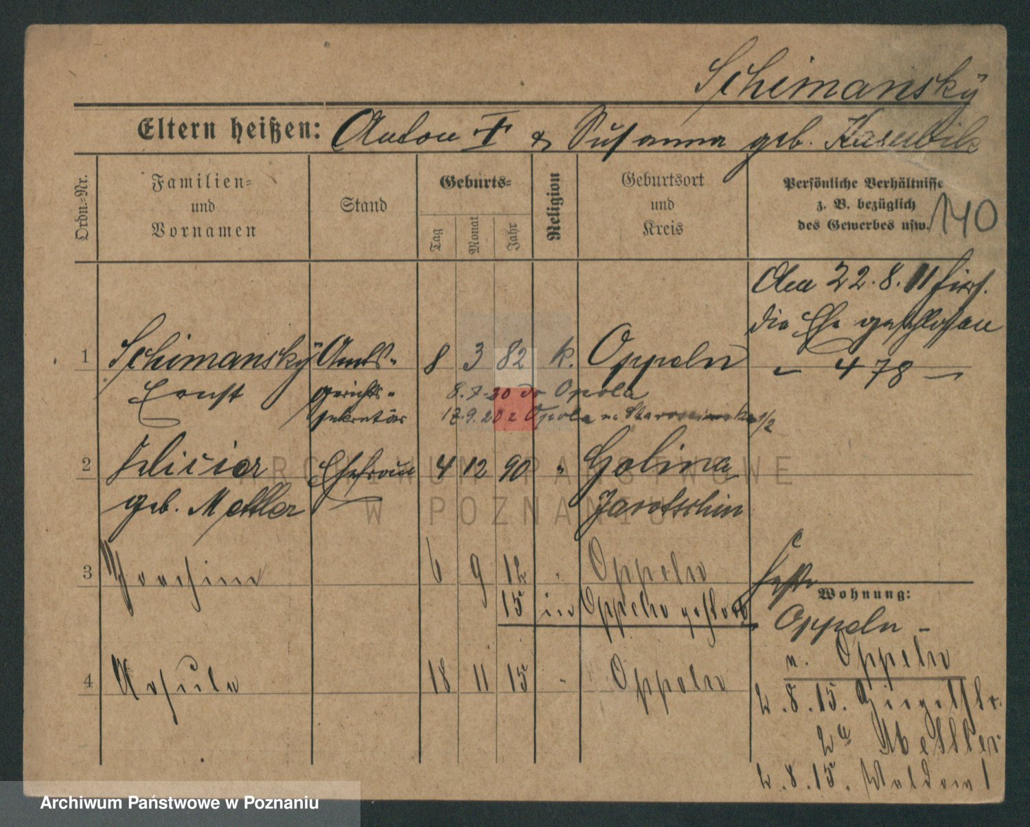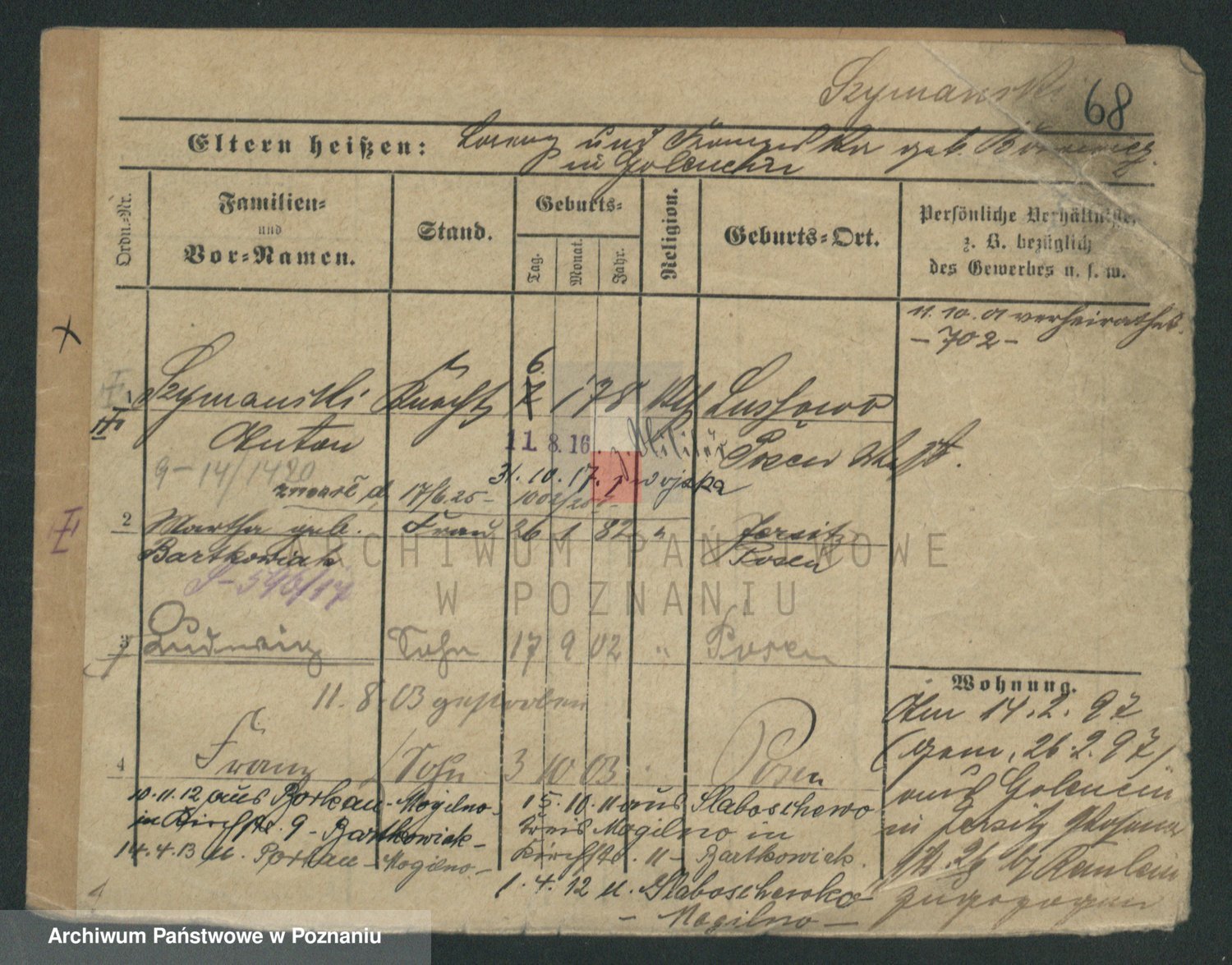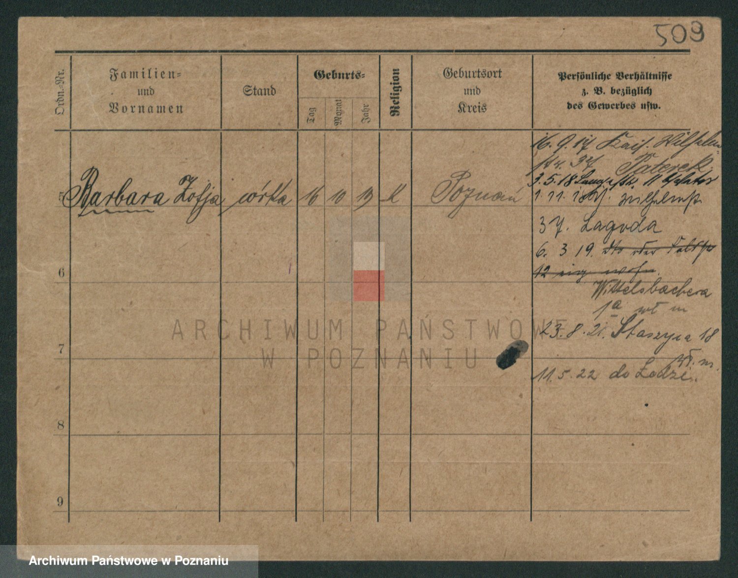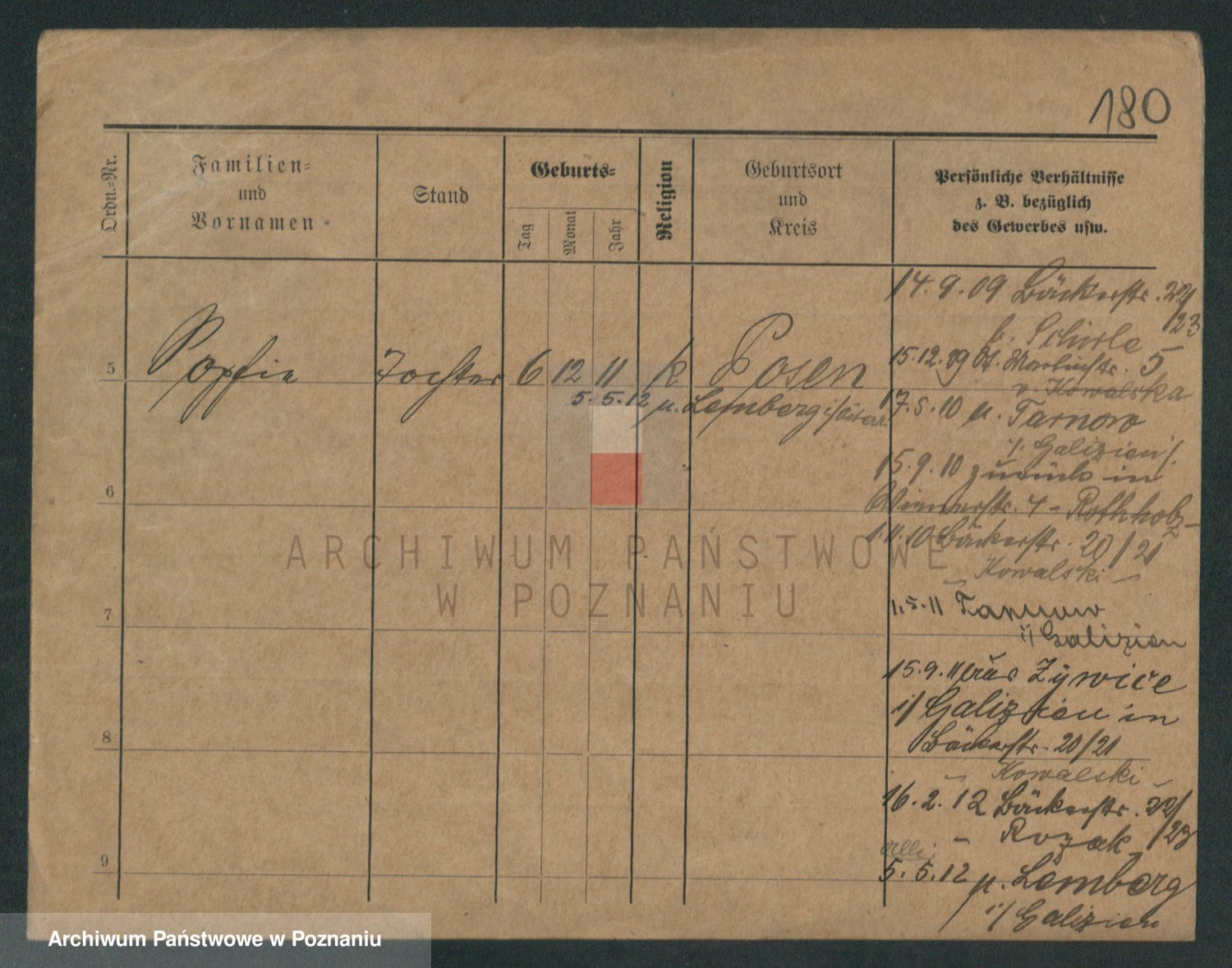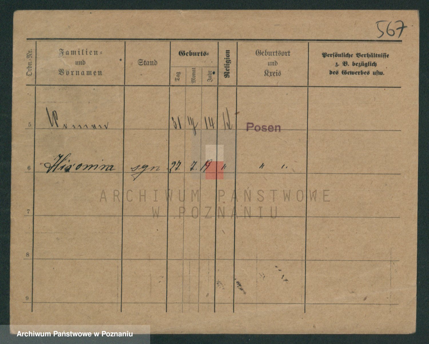 Podgląd karty osobowej dostępny jest po kliknięciu na nazwisko lub ikonkę karty. Można dokonywać powiększenia (ikony na górze) lub przechodzić między kolejnymi skanami (strzałki po bokach).