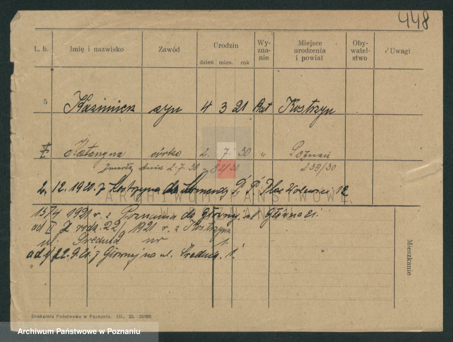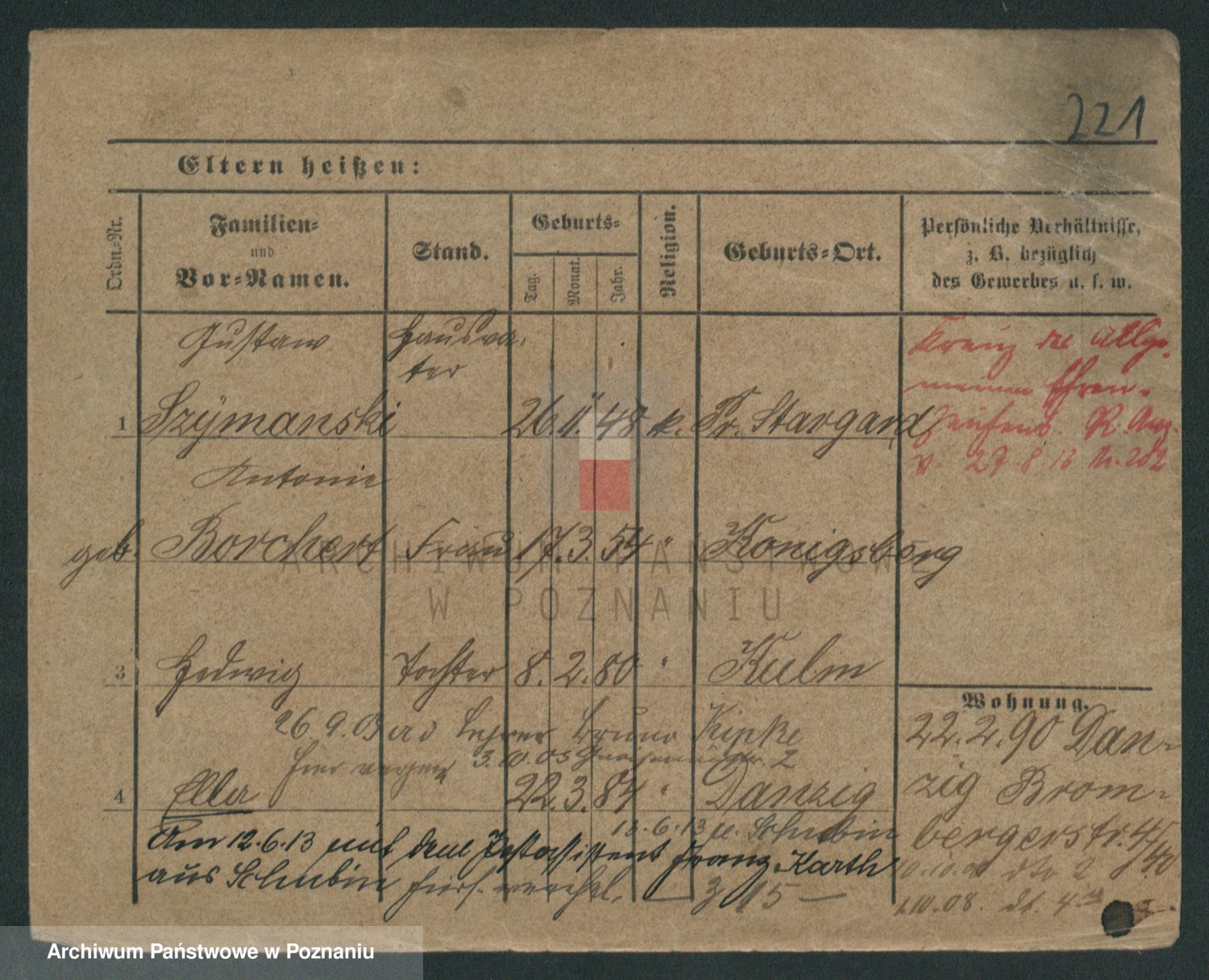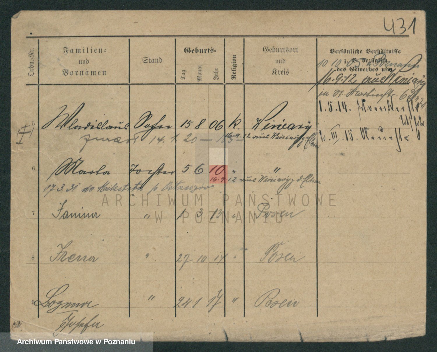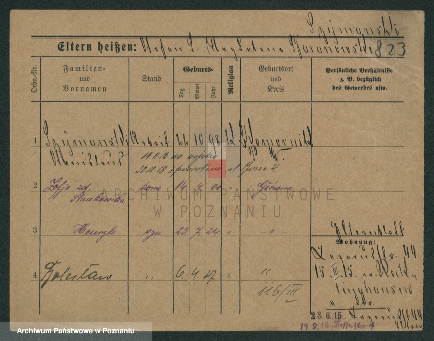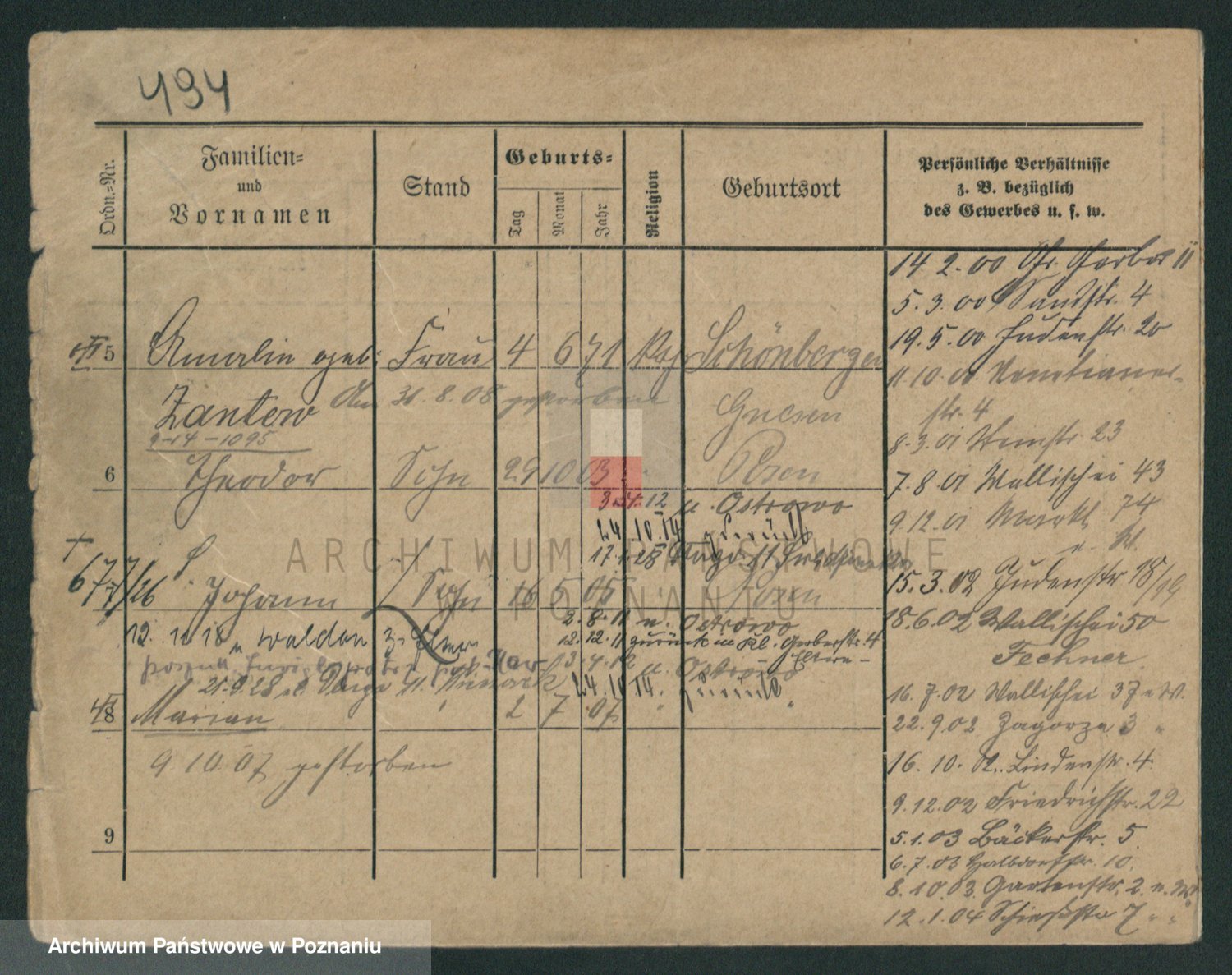 Podgląd karty osobowej dostępny jest po kliknięciu na nazwisko lub ikonkę karty. Można dokonywać powiększenia (ikony na górze) lub przechodzić między kolejnymi skanami (strzałki po bokach).