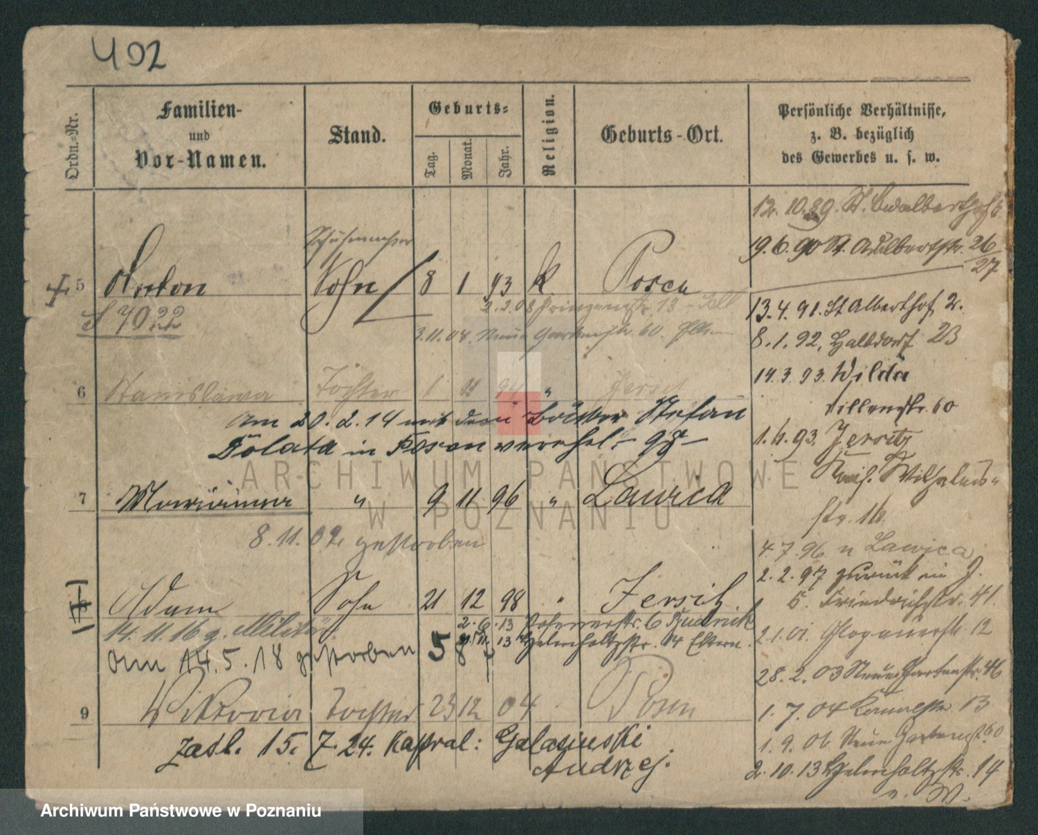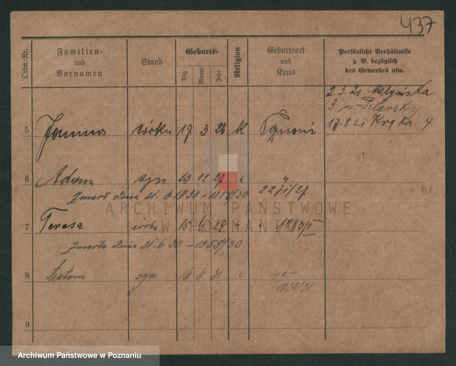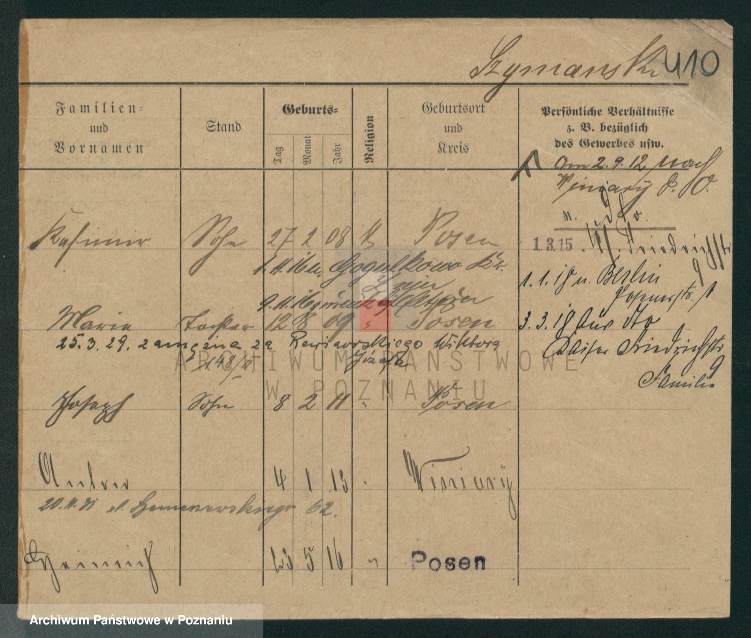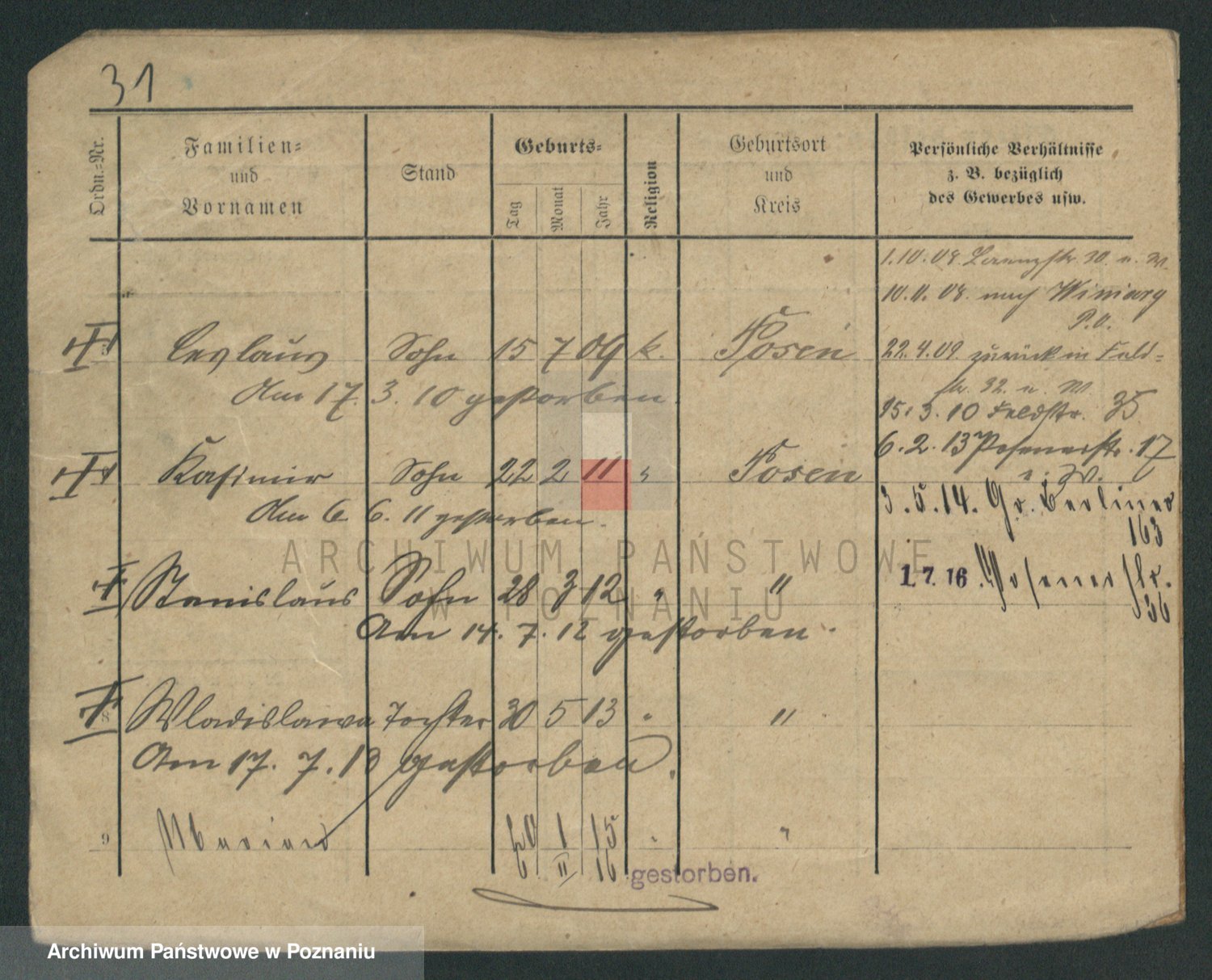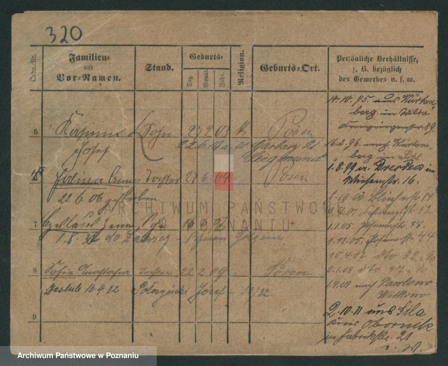Podgląd karty osobowej dostępny jest po kliknięciu na nazwisko lub ikonkę karty. Można dokonywać powiększenia (ikony na górze) lub przechodzić między kolejnymi skanami (strzałki po bokach).