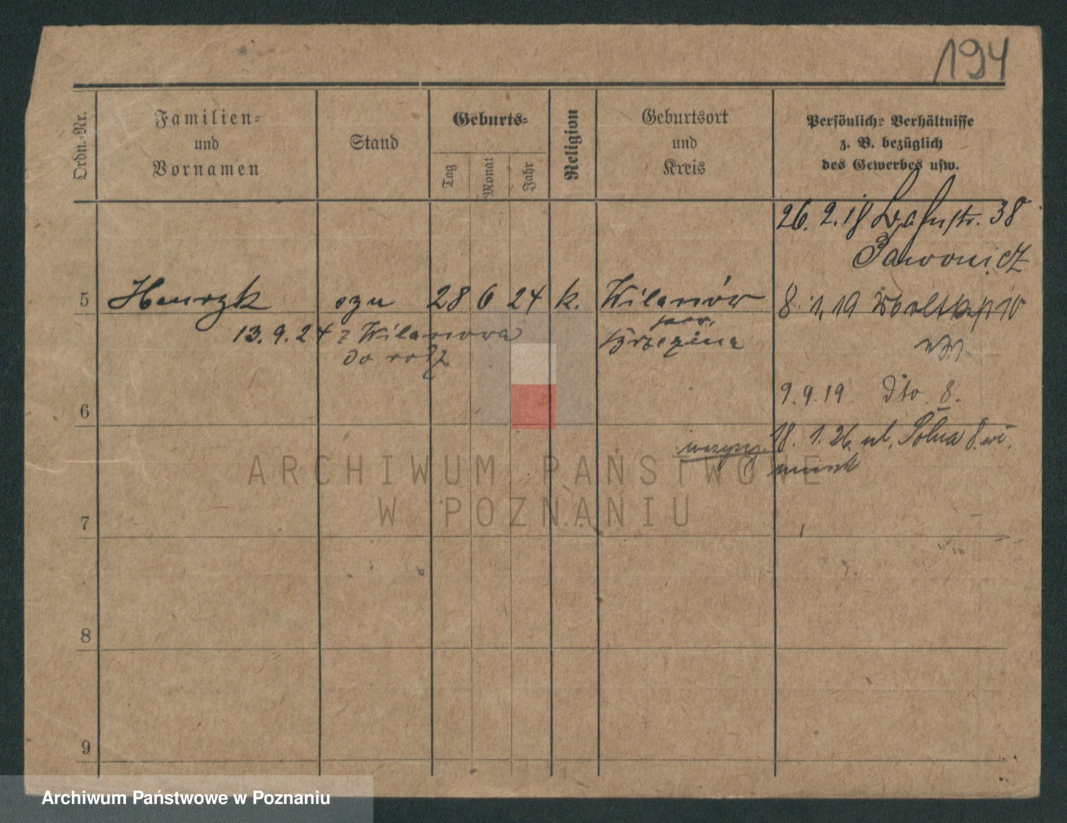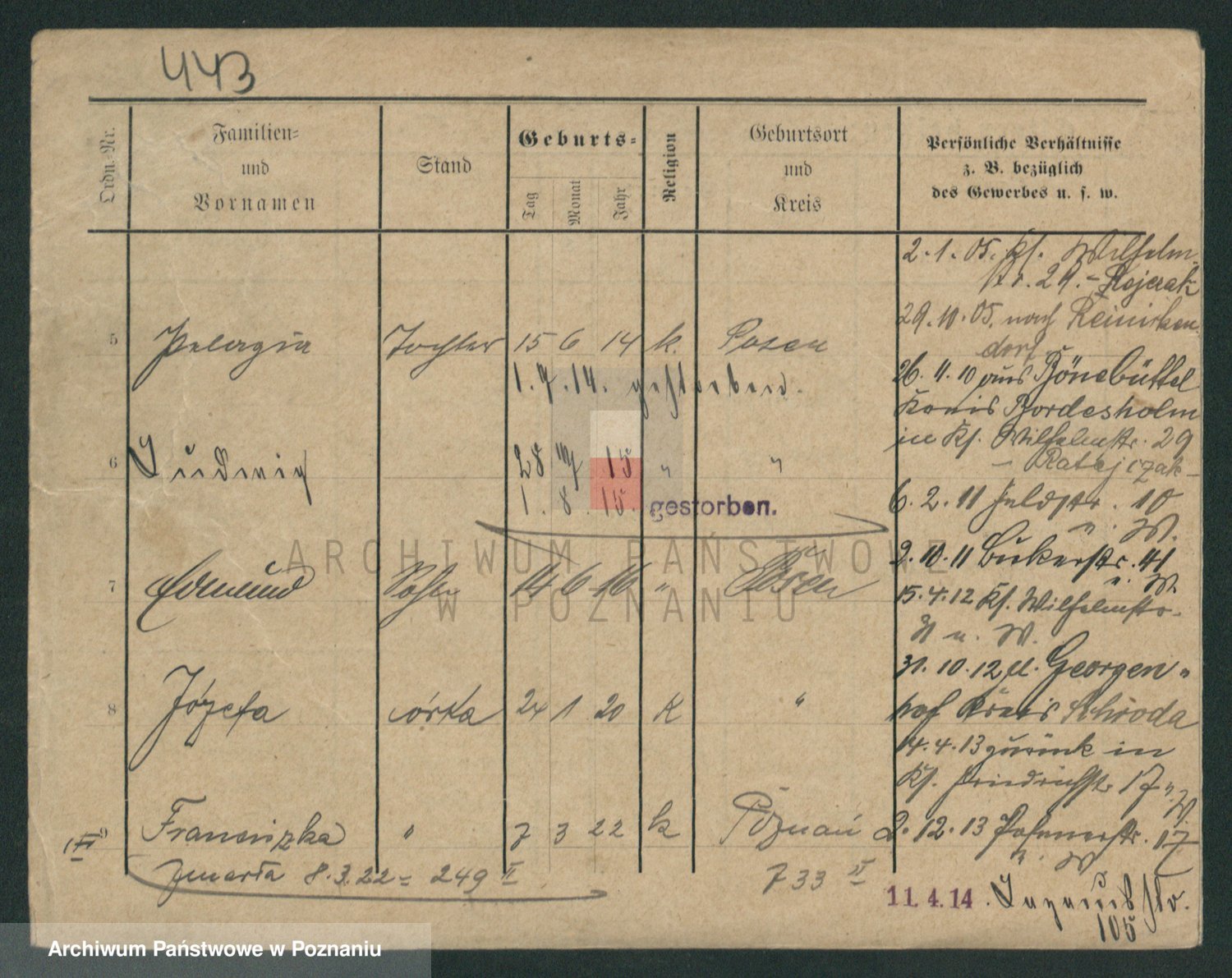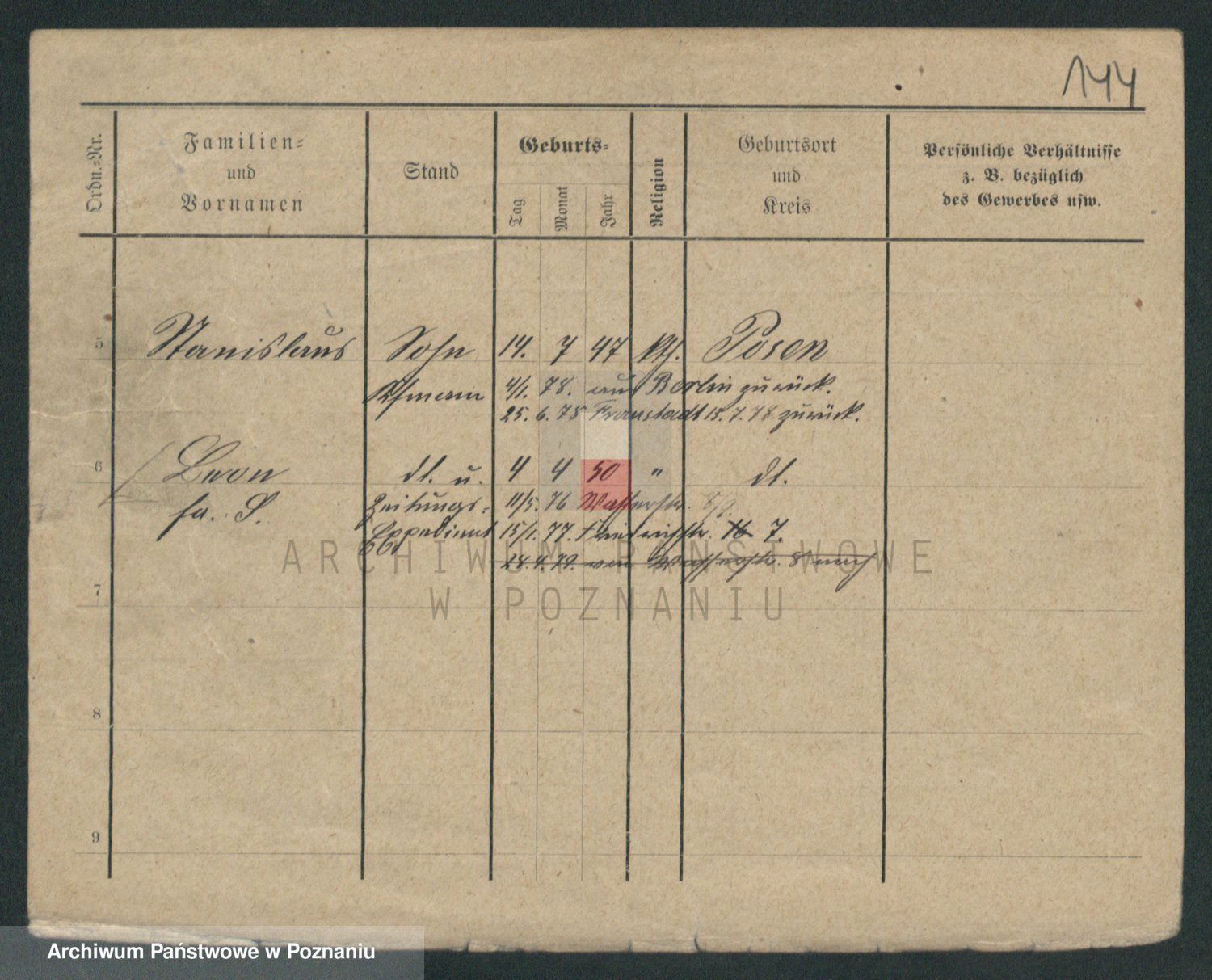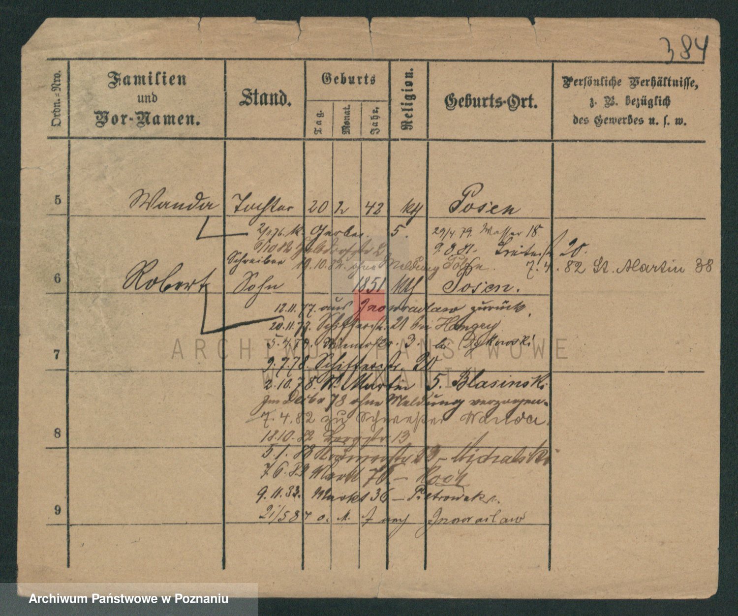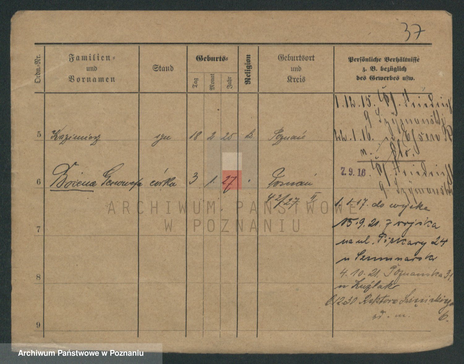 Podgląd karty osobowej dostępny jest po kliknięciu na nazwisko lub ikonkę karty. Można dokonywać powiększenia (ikony na górze) lub przechodzić między kolejnymi skanami (strzałki po bokach).