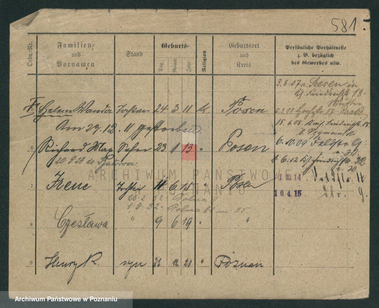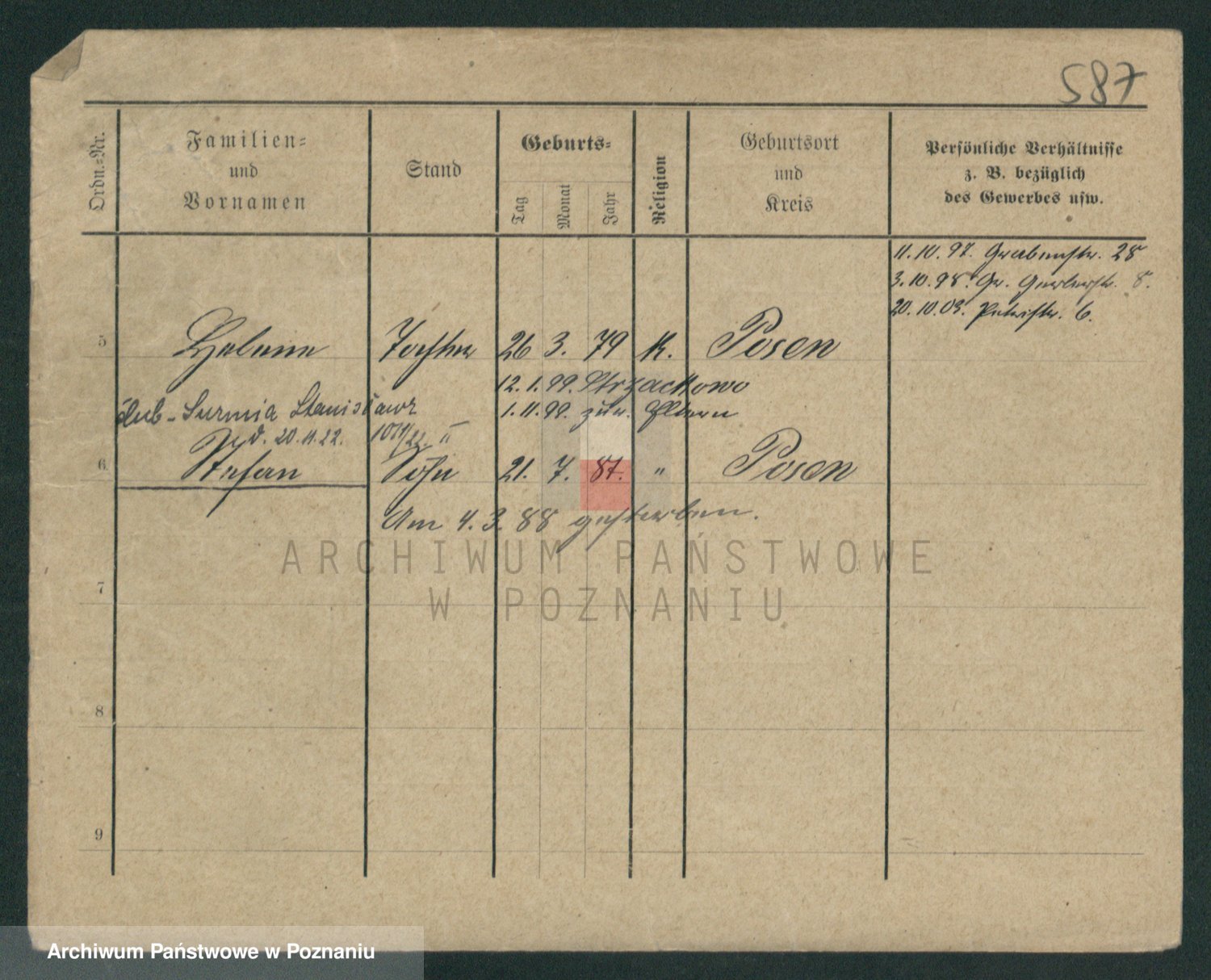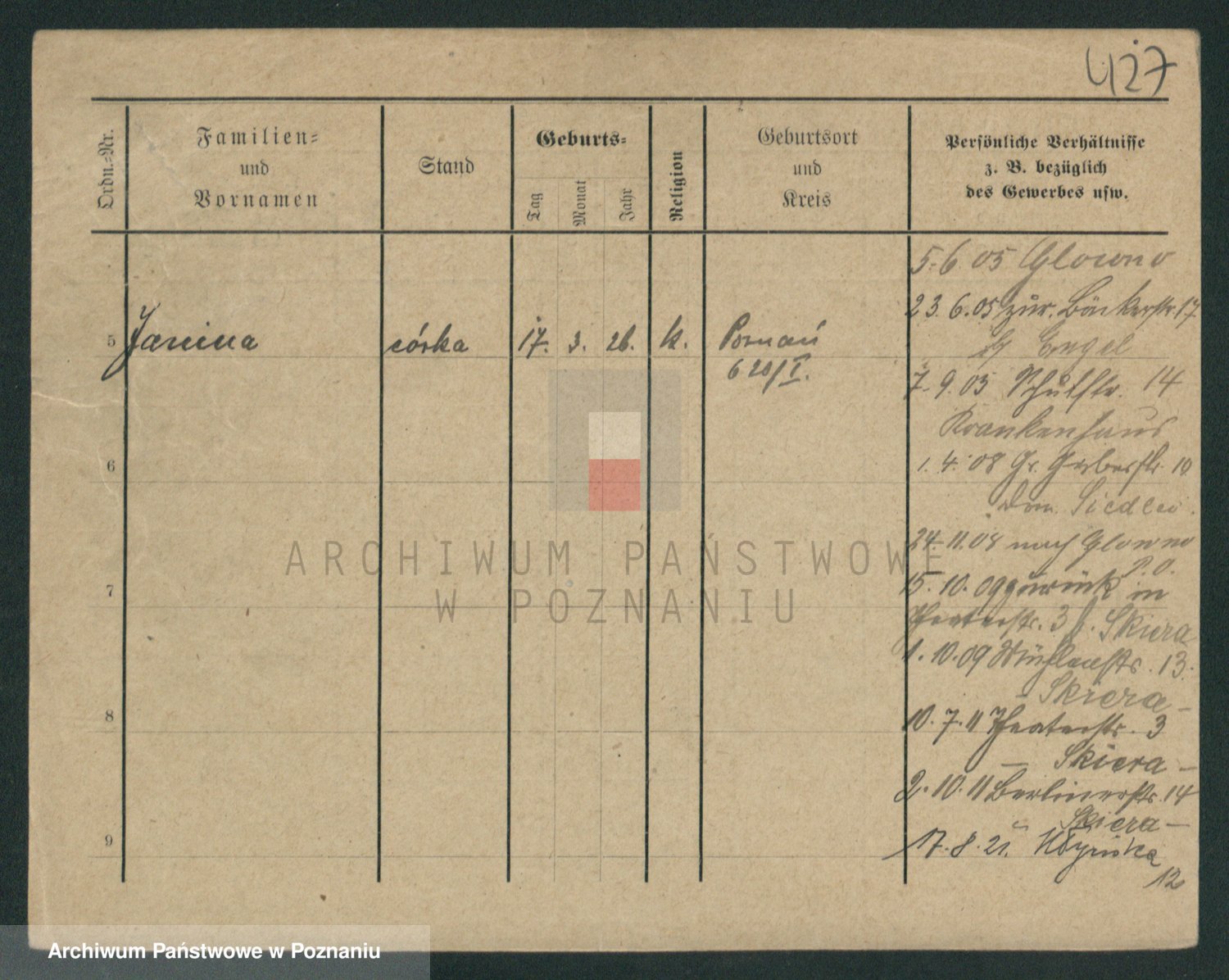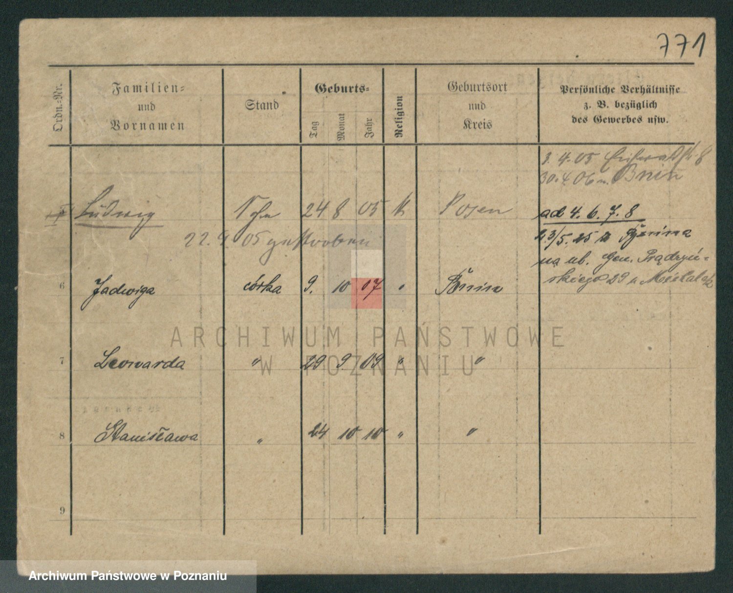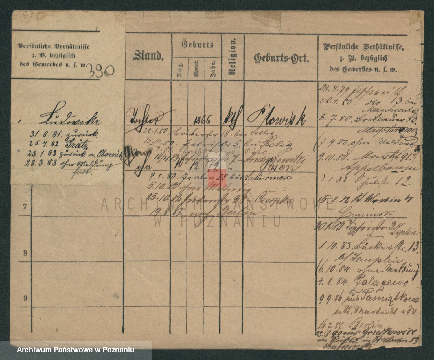 Podgląd karty osobowej dostępny jest po kliknięciu na nazwisko lub ikonkę karty. Można dokonywać powiększenia (ikony na górze) lub przechodzić między kolejnymi skanami (strzałki po bokach).