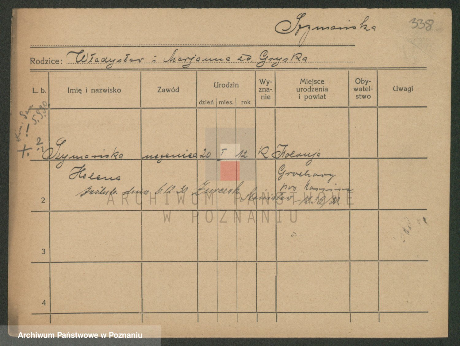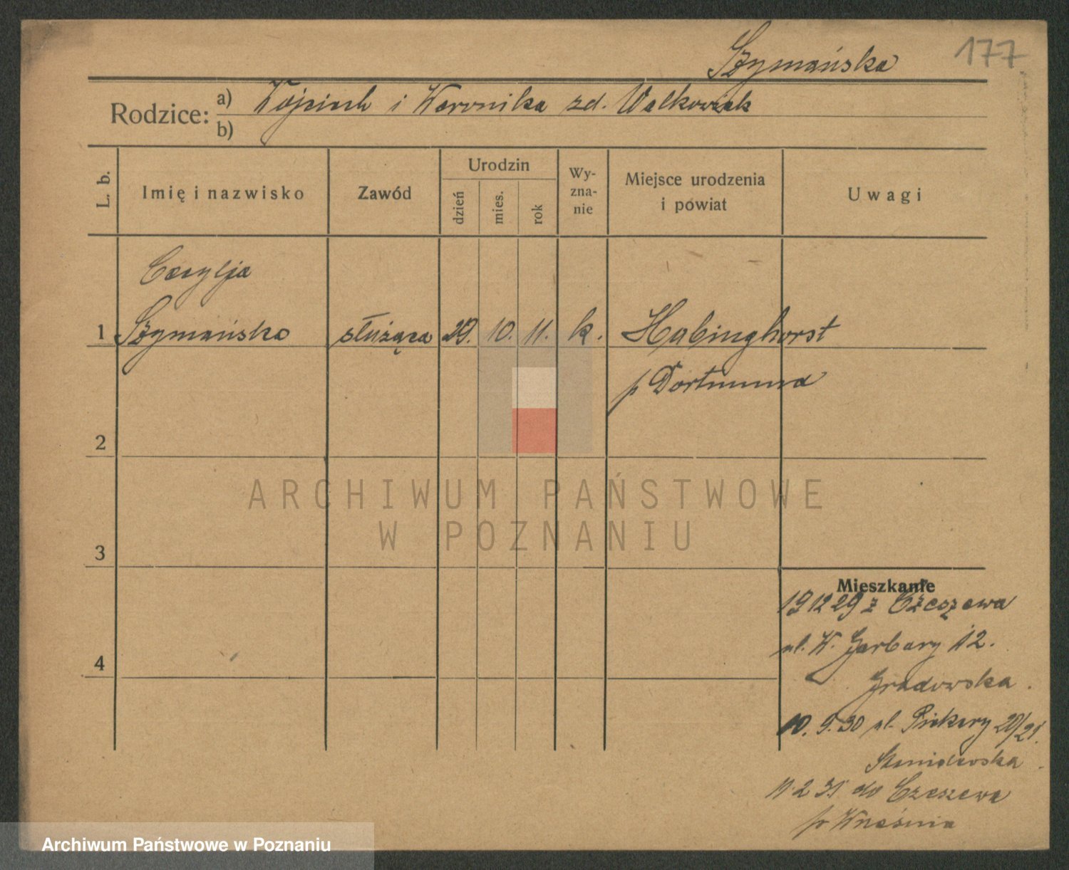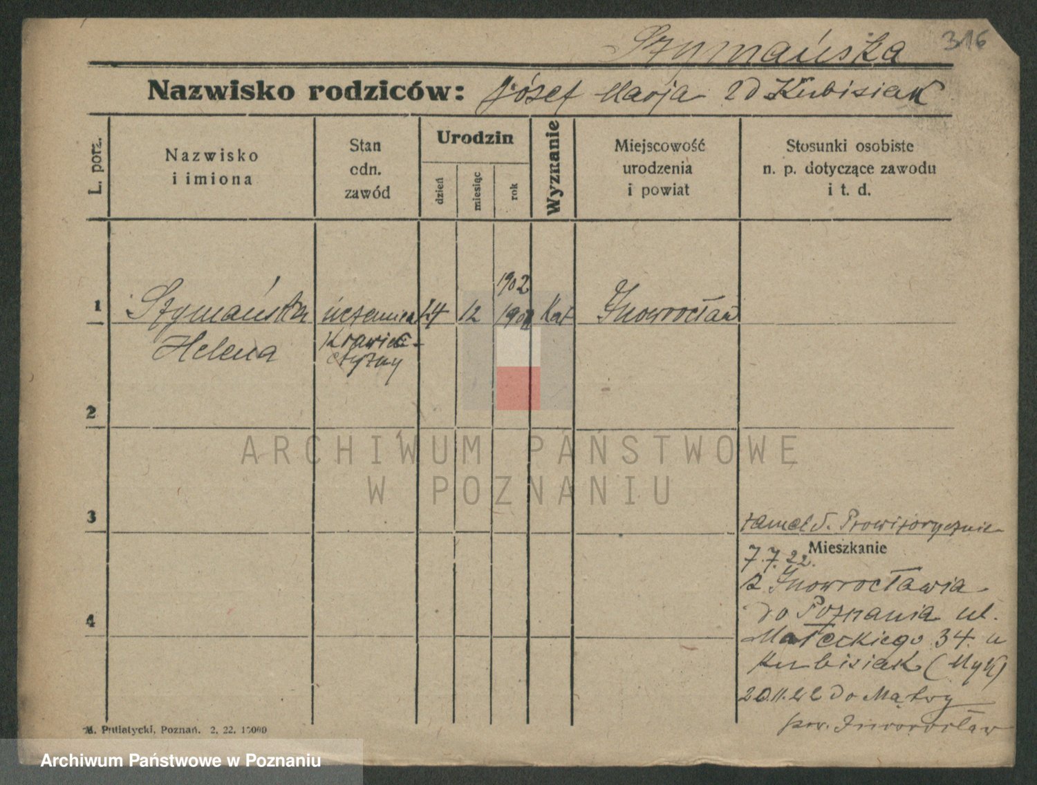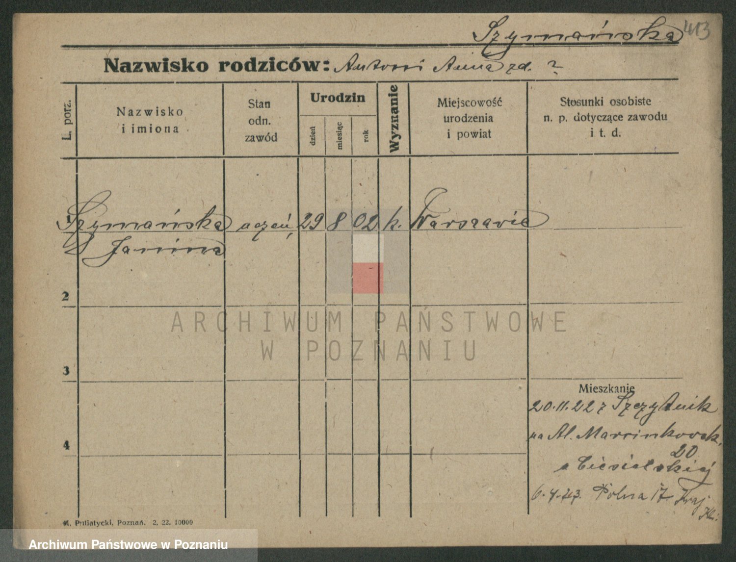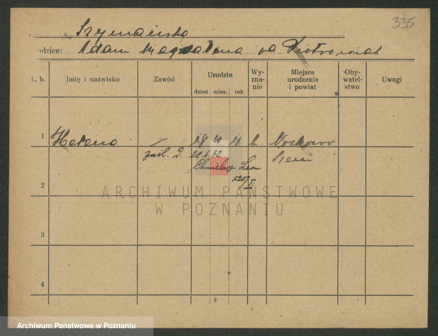 Podgląd karty osobowej dostępny jest po kliknięciu na nazwisko lub ikonkę karty. Można dokonywać powiększenia (ikony na górze) lub przechodzić między kolejnymi skanami (strzałki po bokach).
