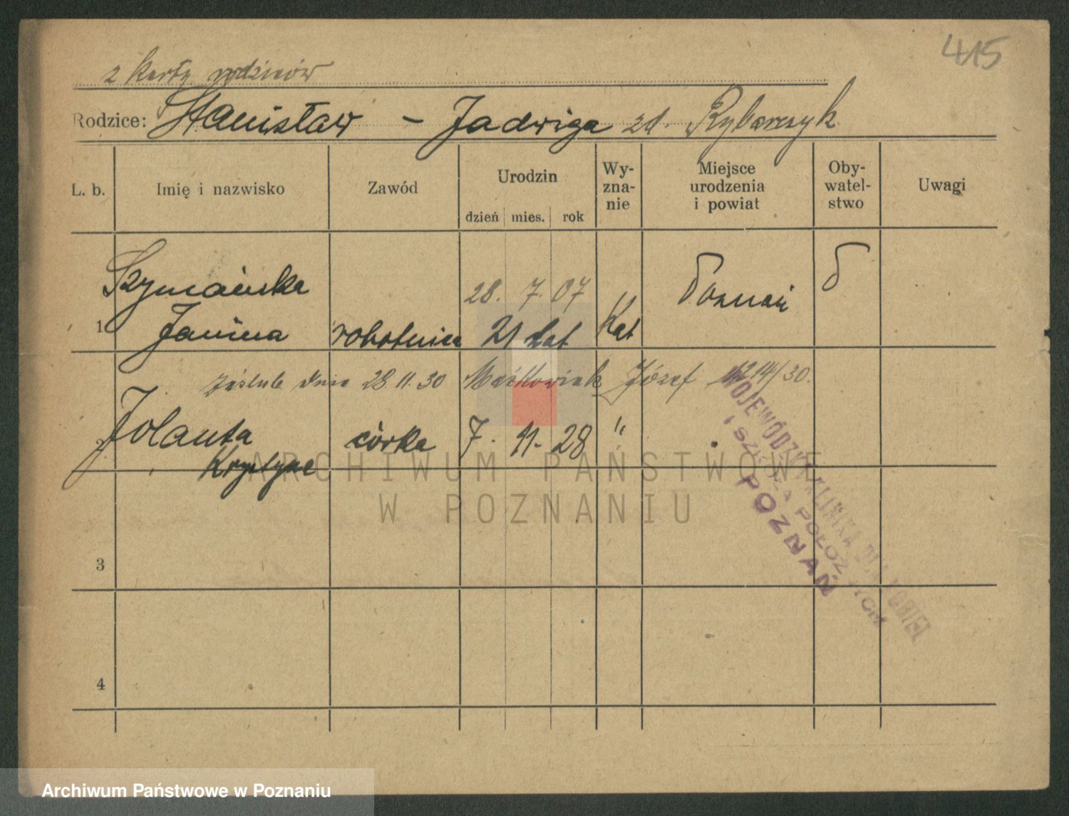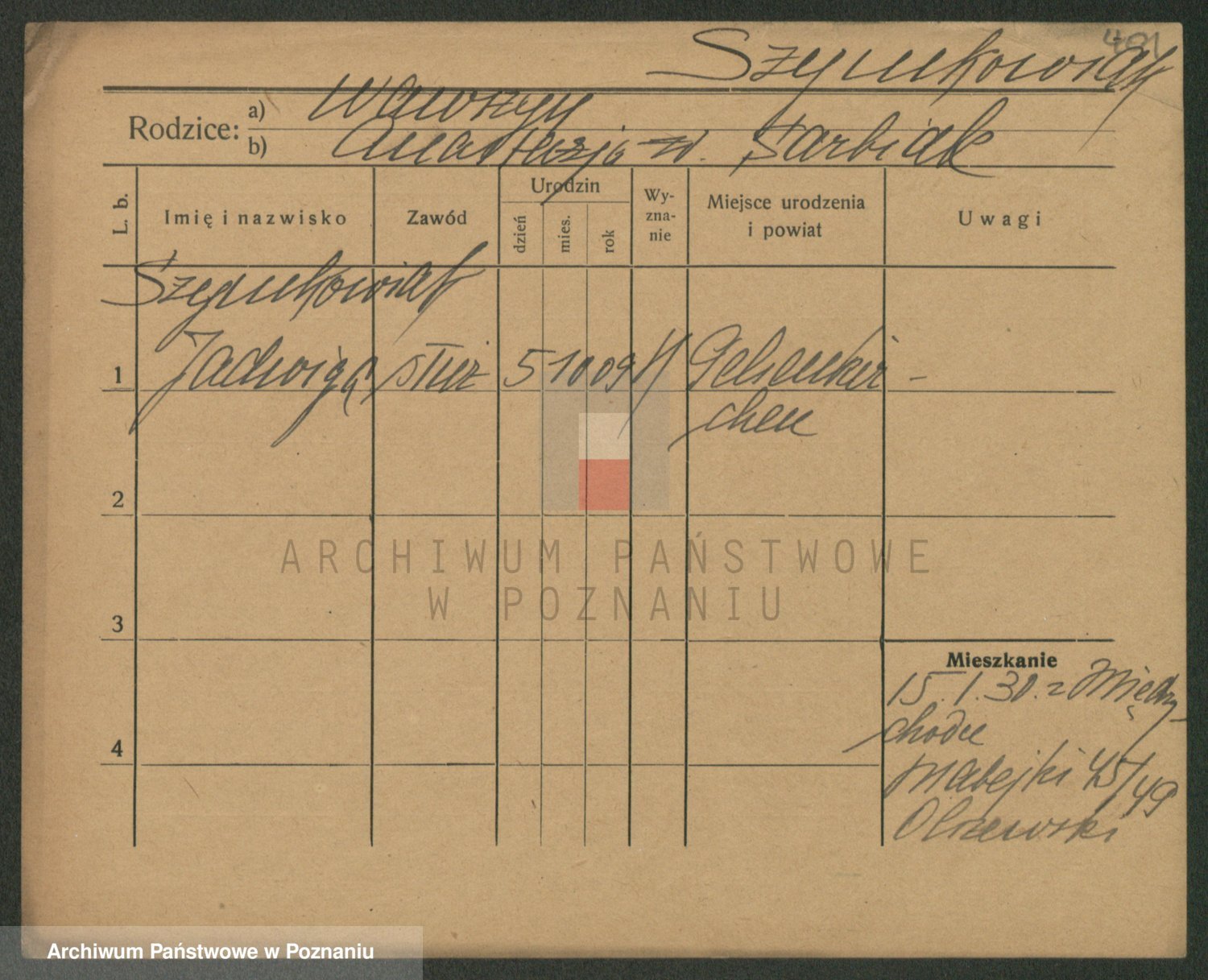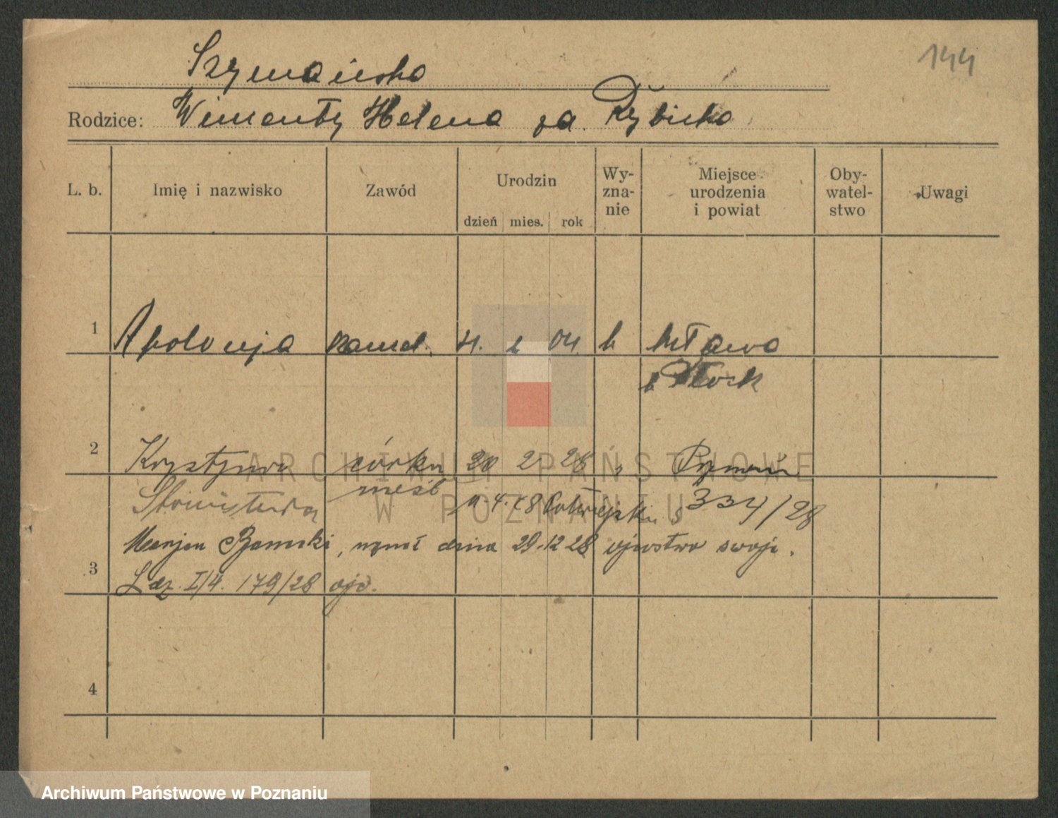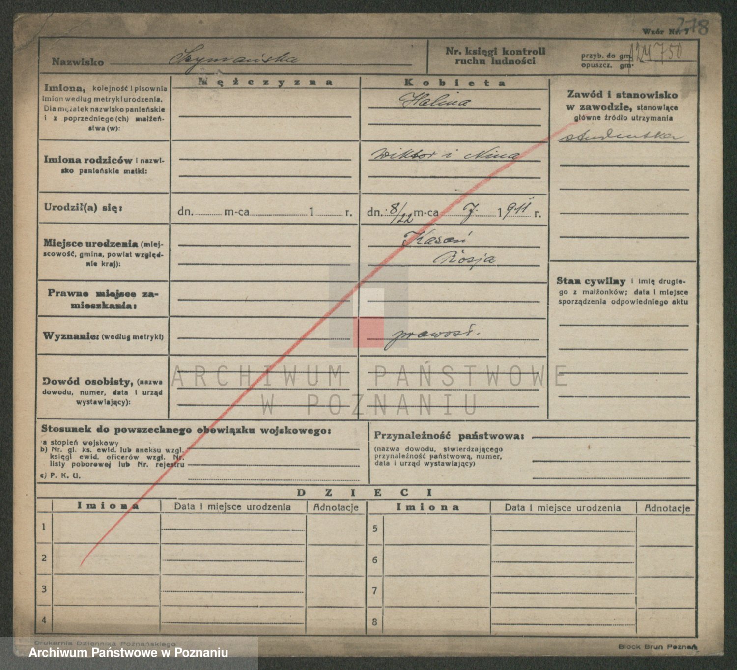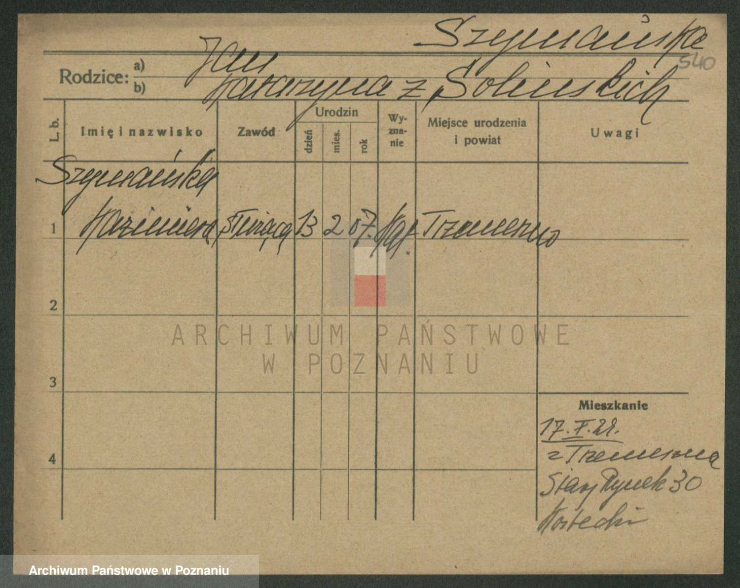 Podgląd karty osobowej dostępny jest po kliknięciu na nazwisko lub ikonkę karty. Można dokonywać powiększenia (ikony na górze) lub przechodzić między kolejnymi skanami (strzałki po bokach).