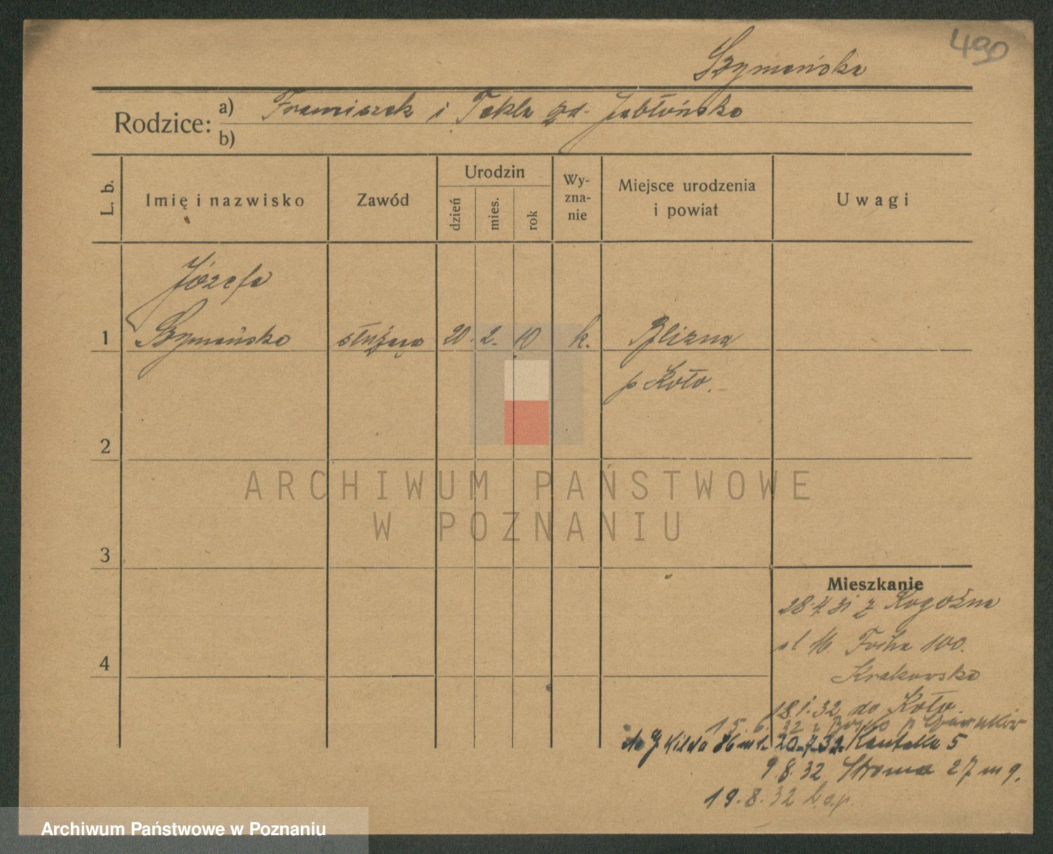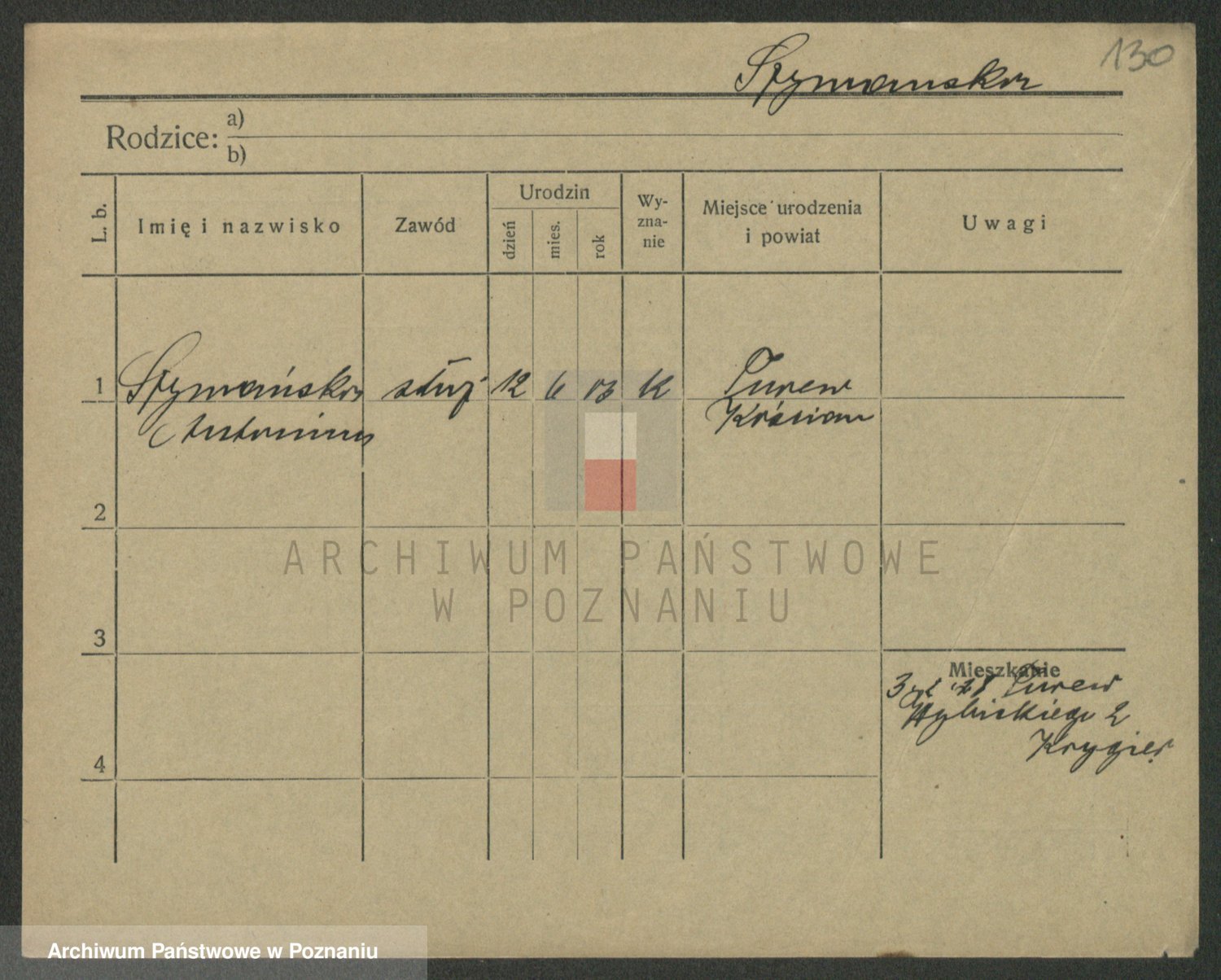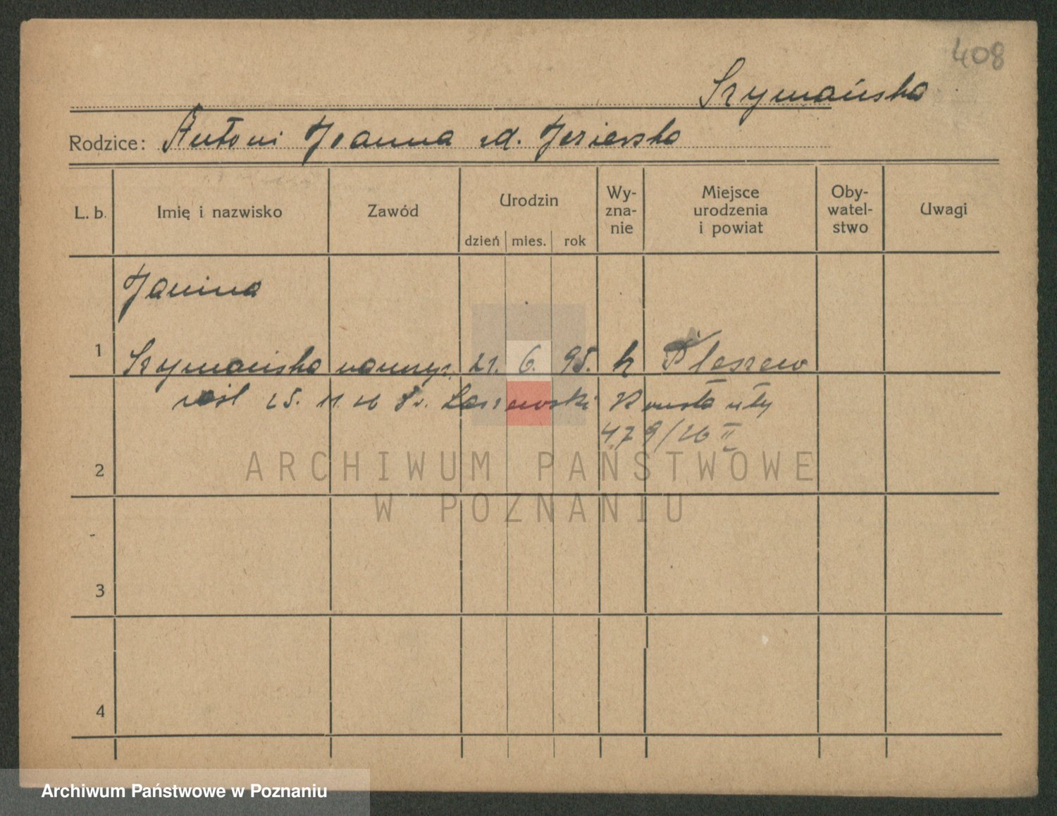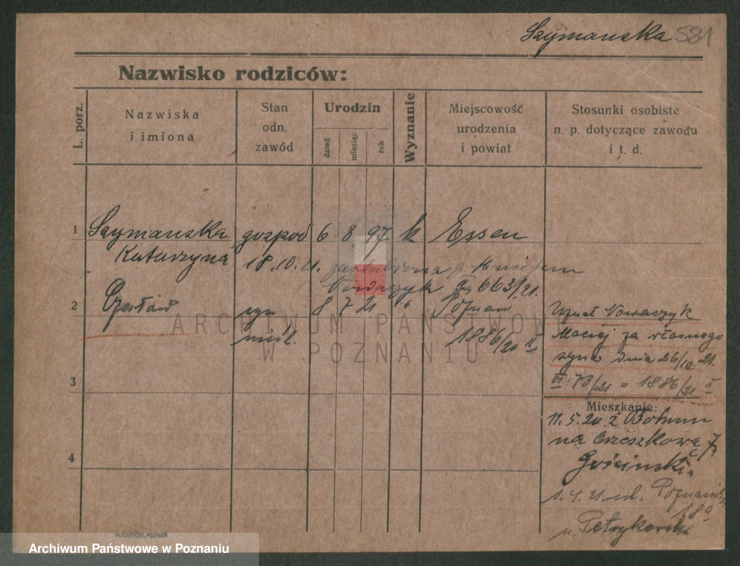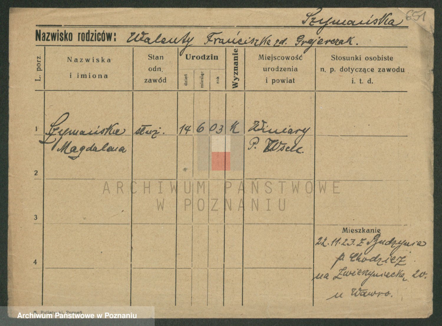 Podgląd karty osobowej dostępny jest po kliknięciu na nazwisko lub ikonkę karty. Można dokonywać powiększenia (ikony na górze) lub przechodzić między kolejnymi skanami (strzałki po bokach).
