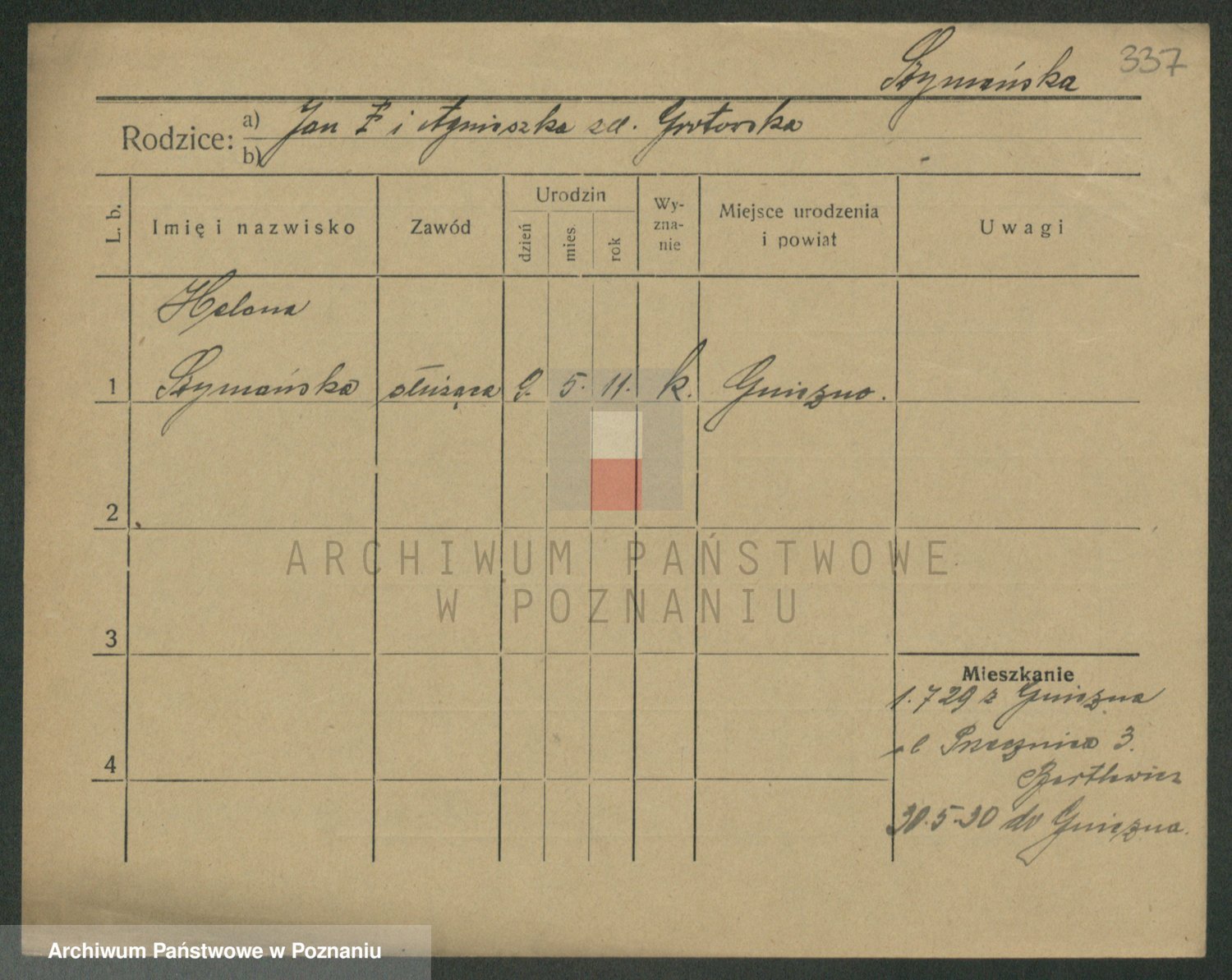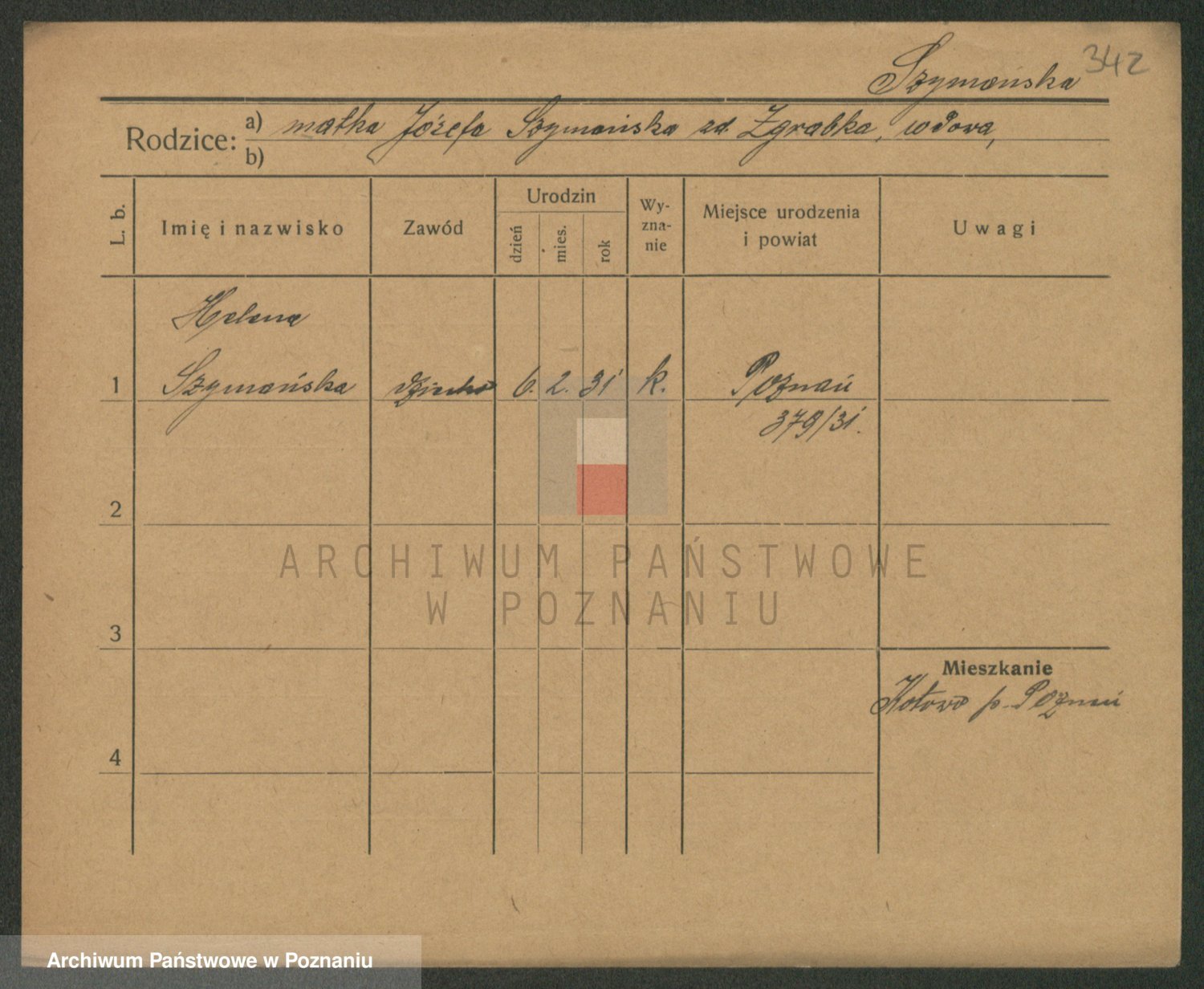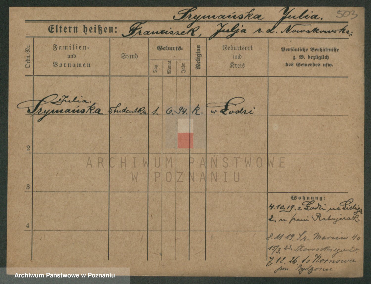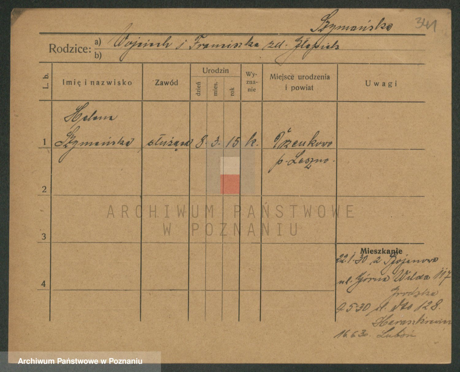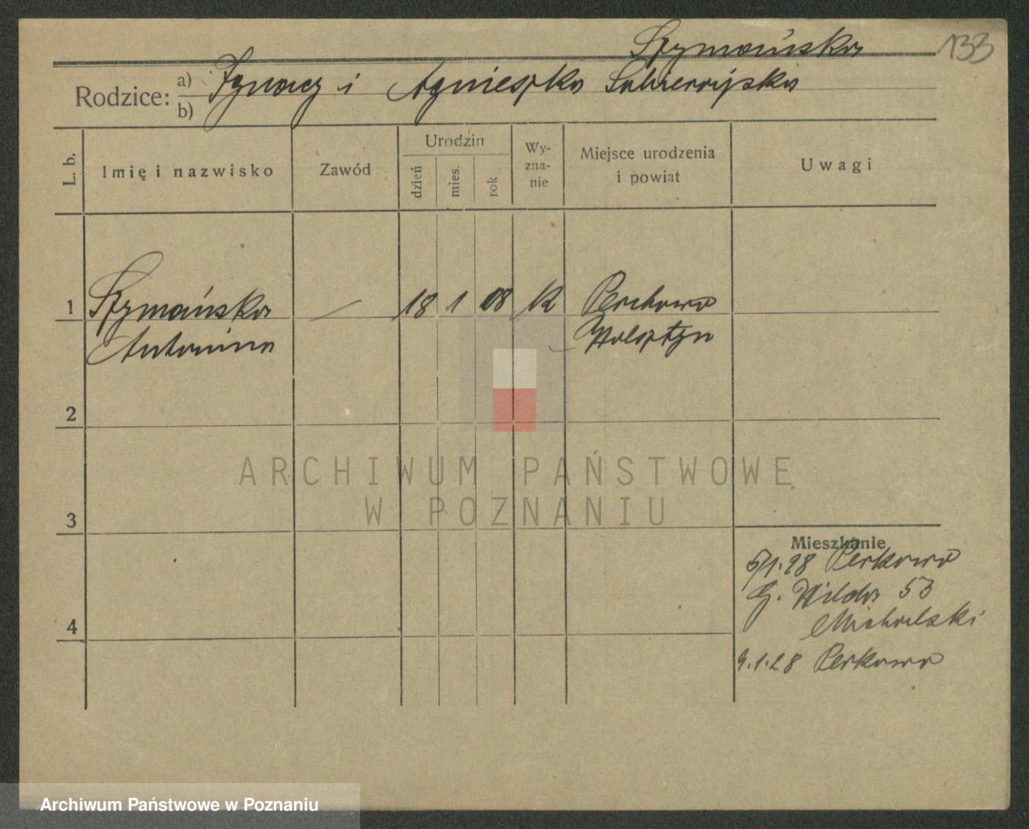 Podgląd karty osobowej dostępny jest po kliknięciu na nazwisko lub ikonkę karty. Można dokonywać powiększenia (ikony na górze) lub przechodzić między kolejnymi skanami (strzałki po bokach).