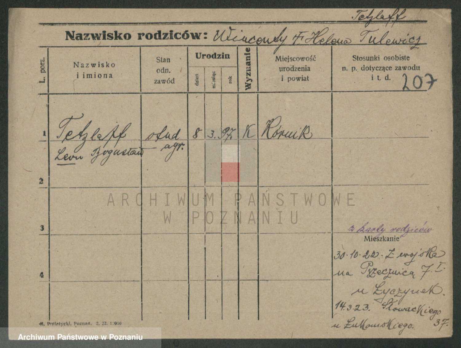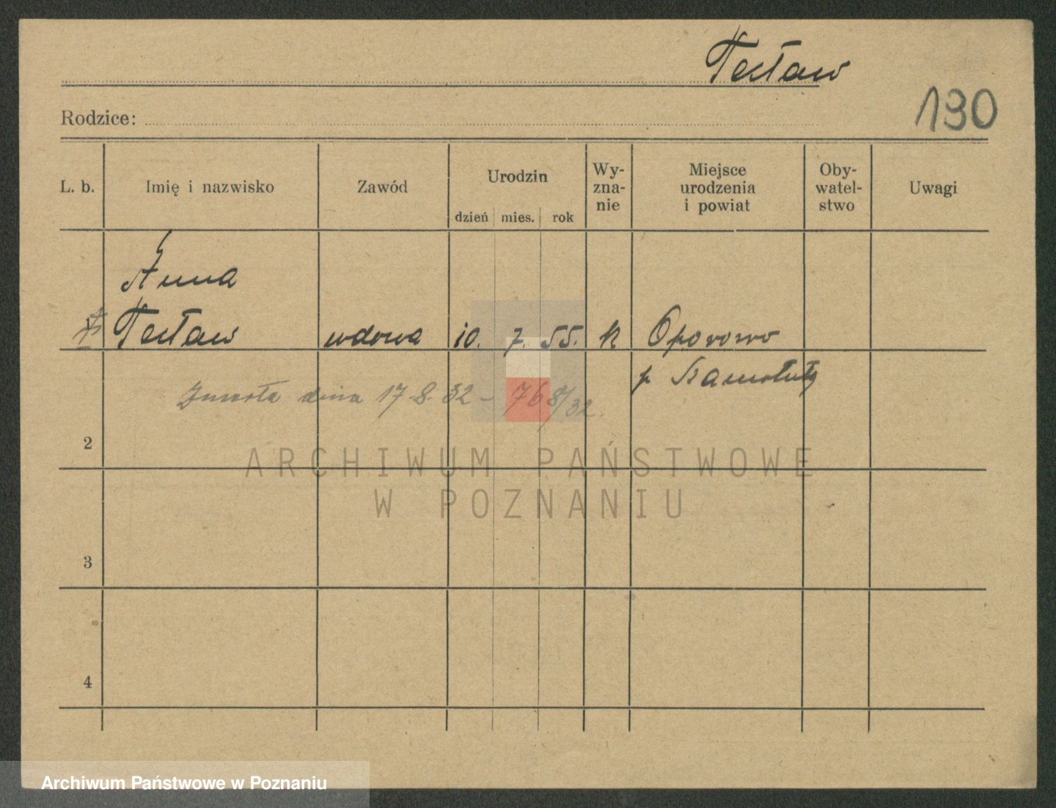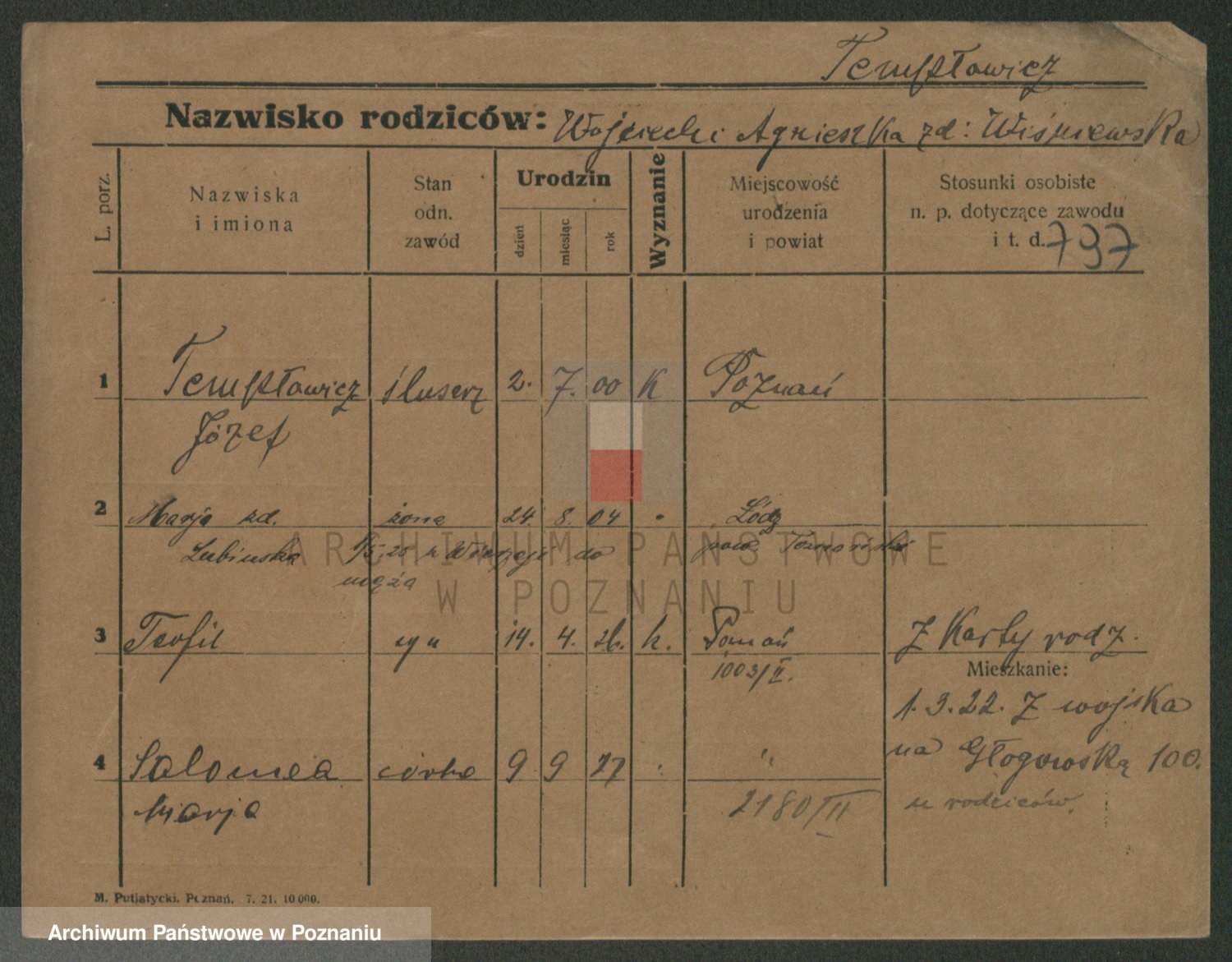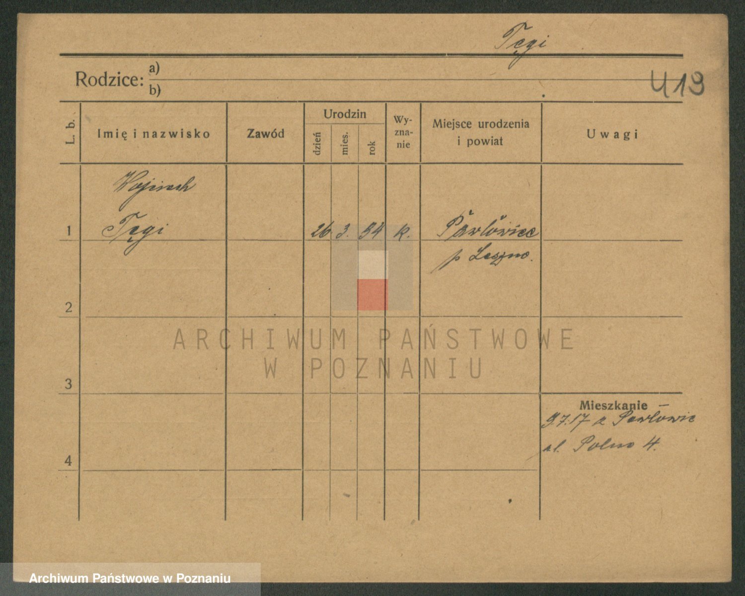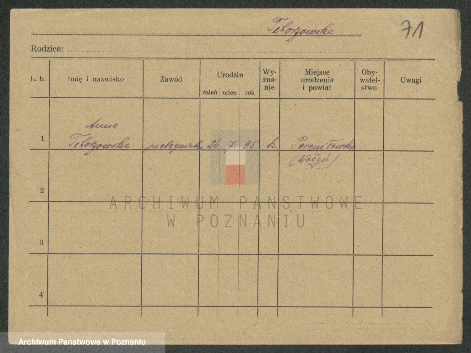 Podgląd karty osobowej dostępny jest po kliknięciu na nazwisko lub ikonkę karty. Można dokonywać powiększenia (ikony na górze) lub przechodzić między kolejnymi skanami (strzałki po bokach).