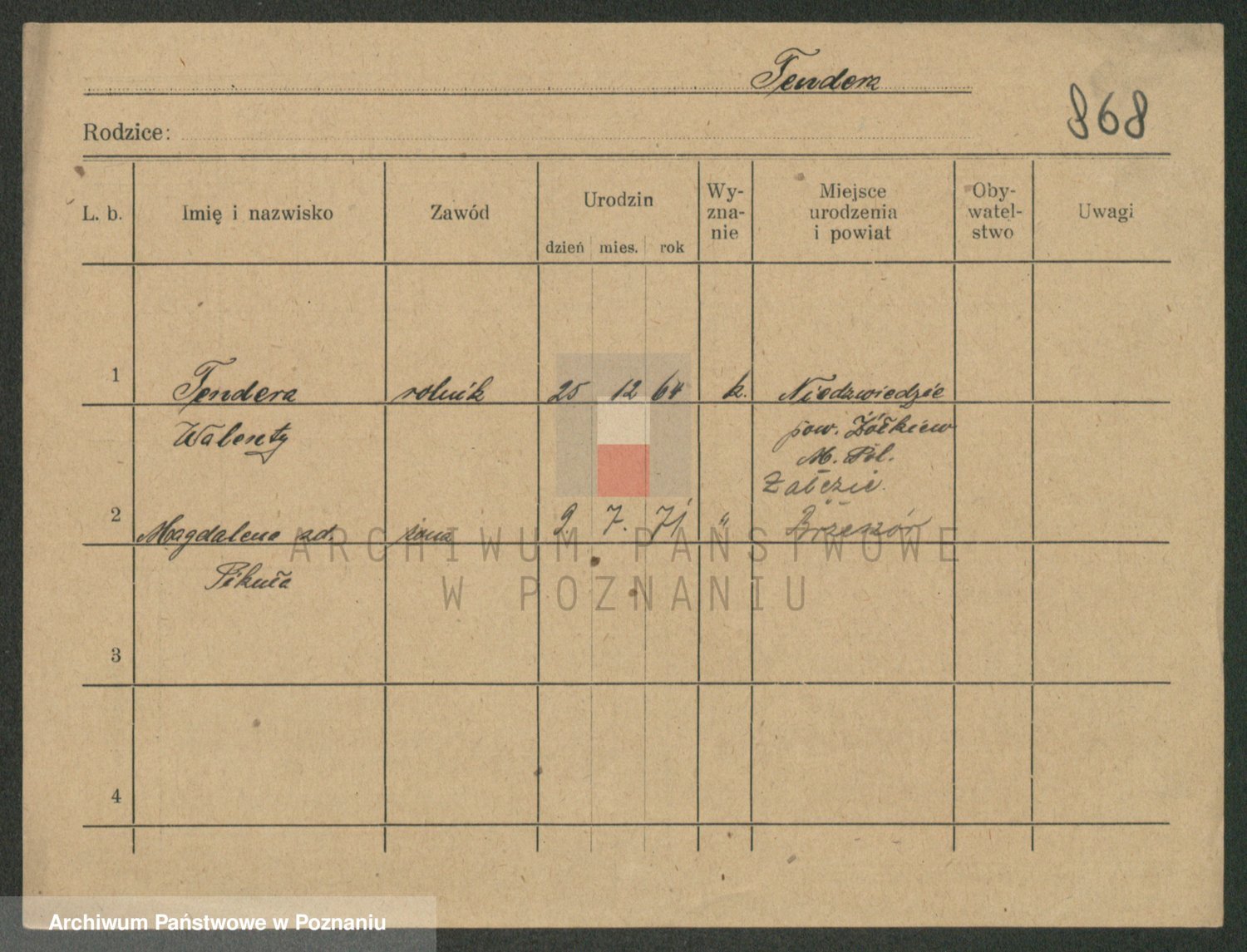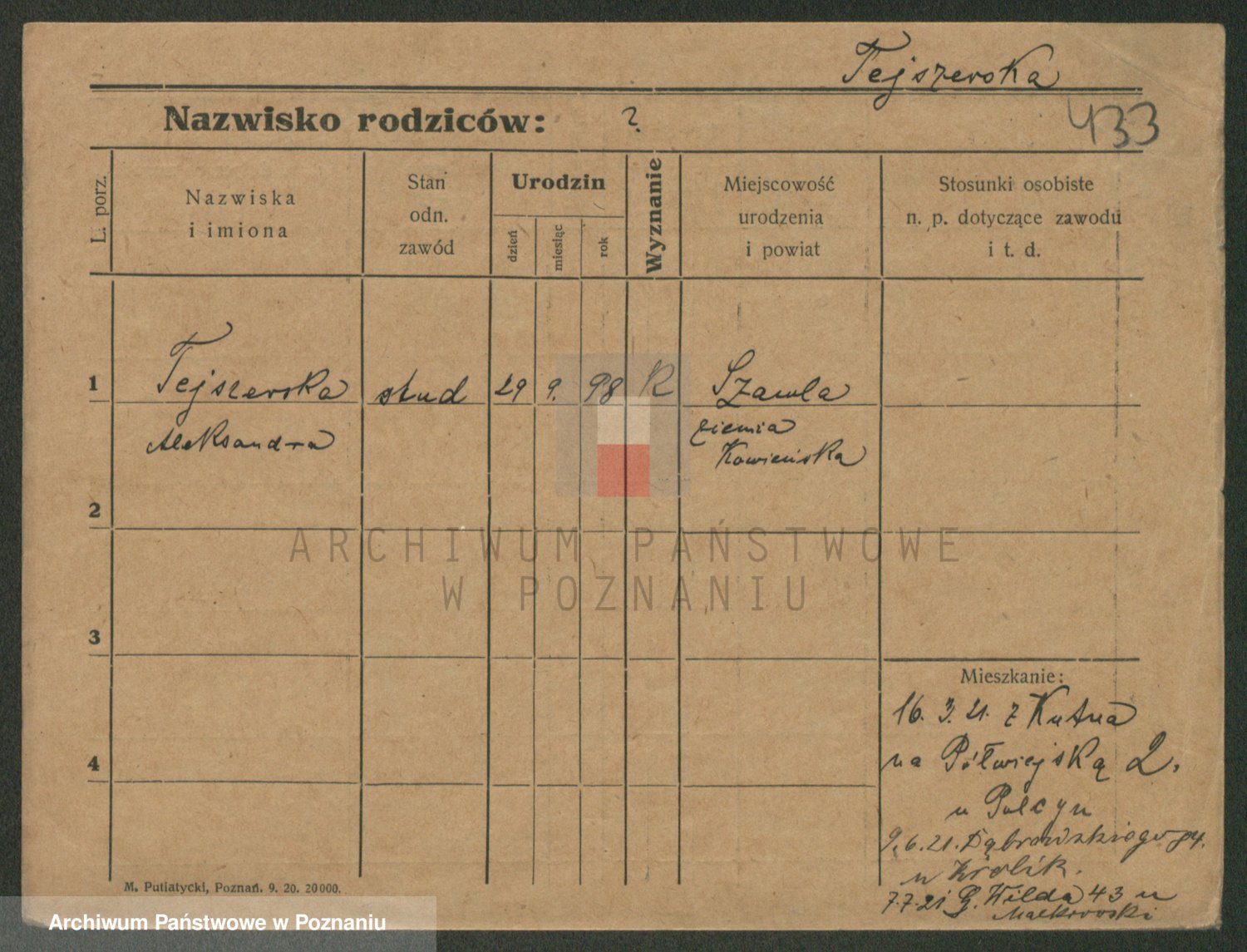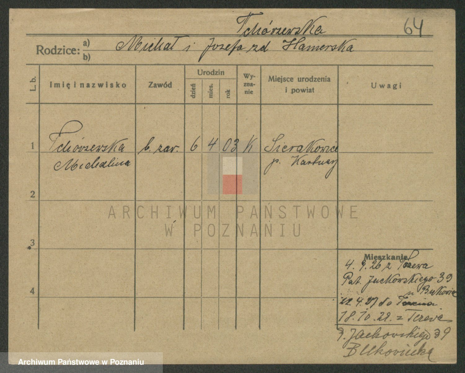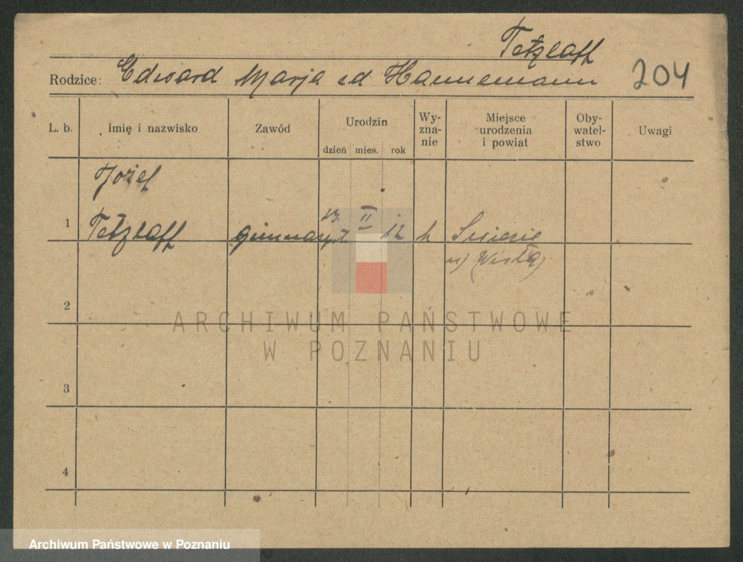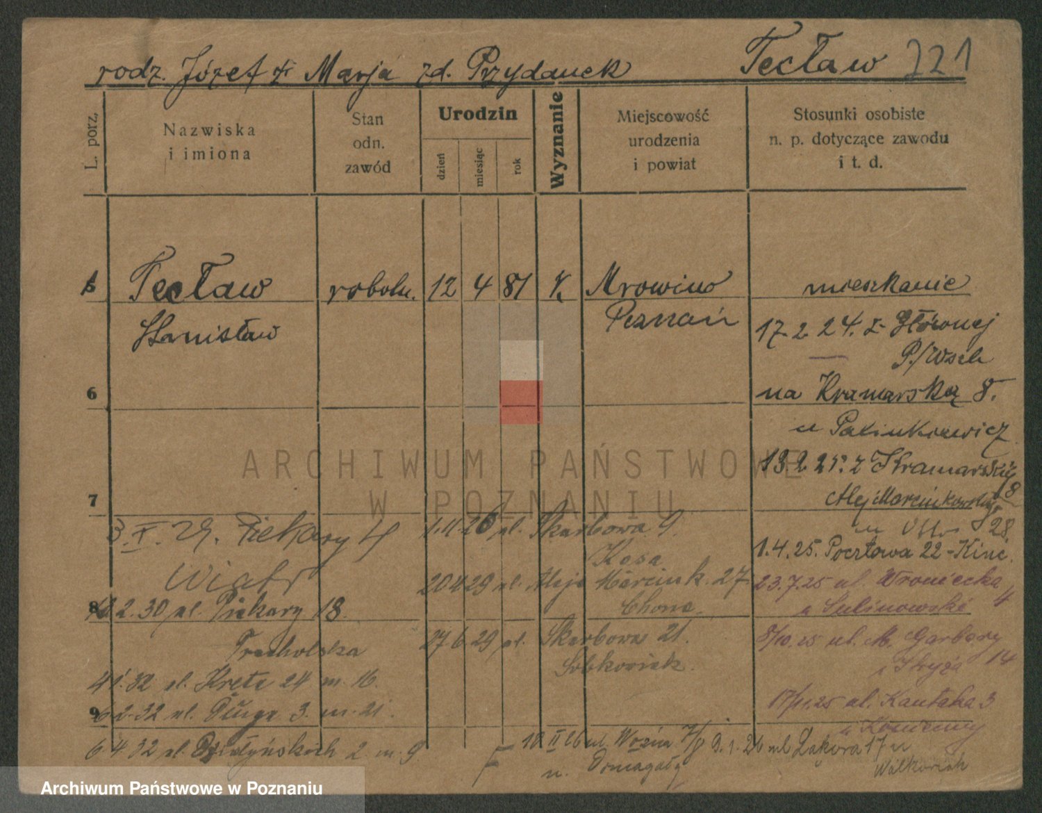 Podgląd karty osobowej dostępny jest po kliknięciu na nazwisko lub ikonkę karty. Można dokonywać powiększenia (ikony na górze) lub przechodzić między kolejnymi skanami (strzałki po bokach).
