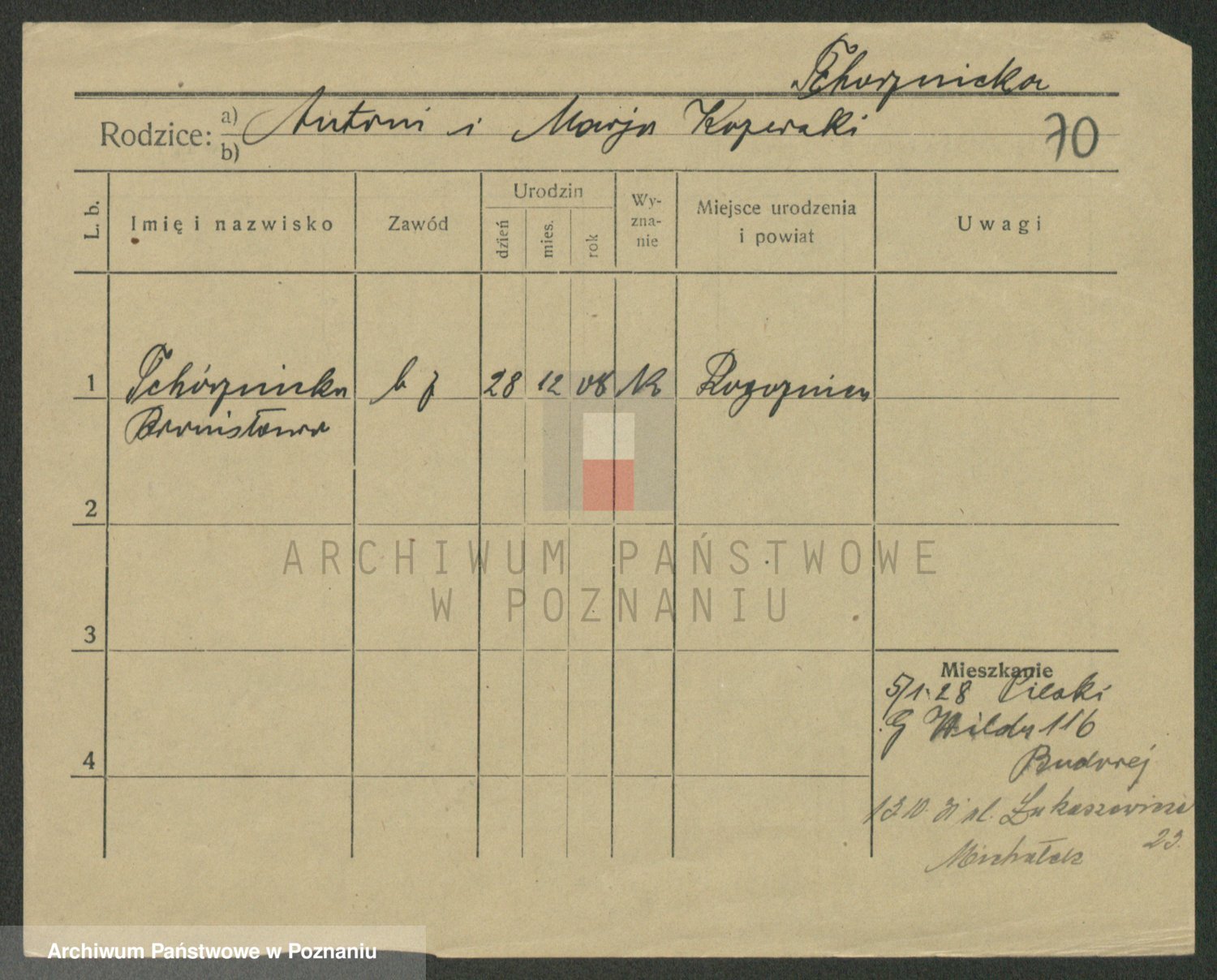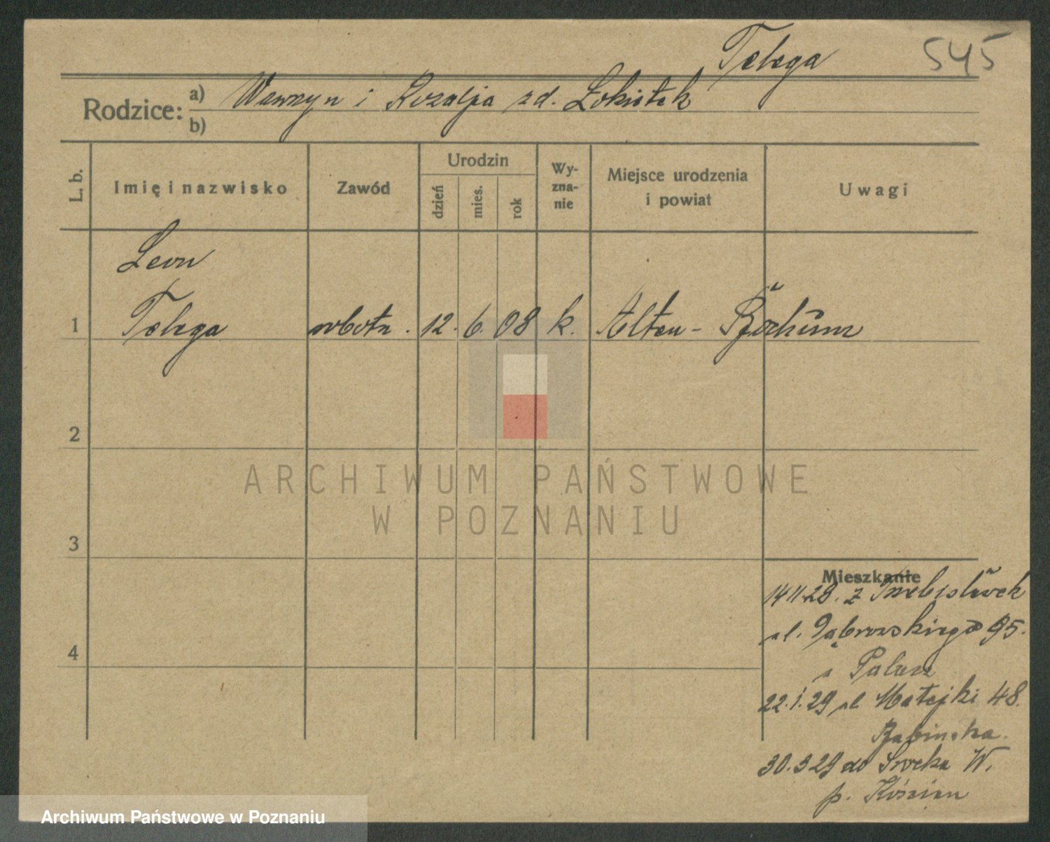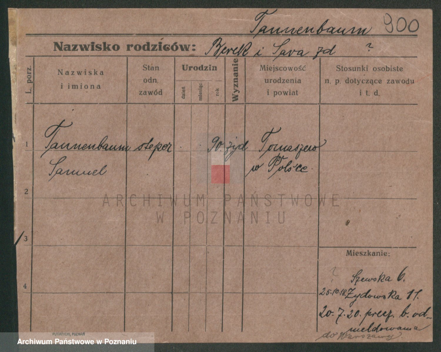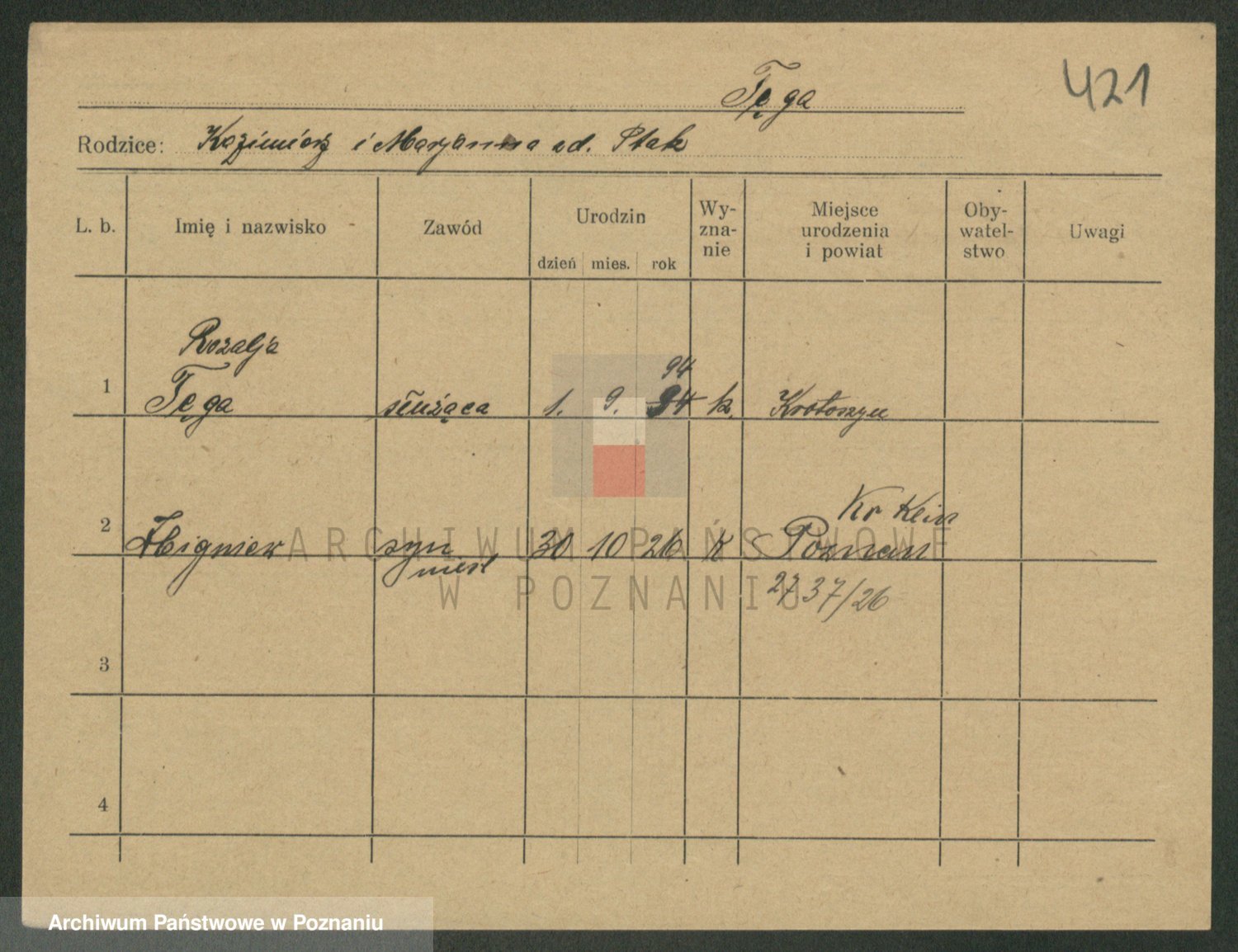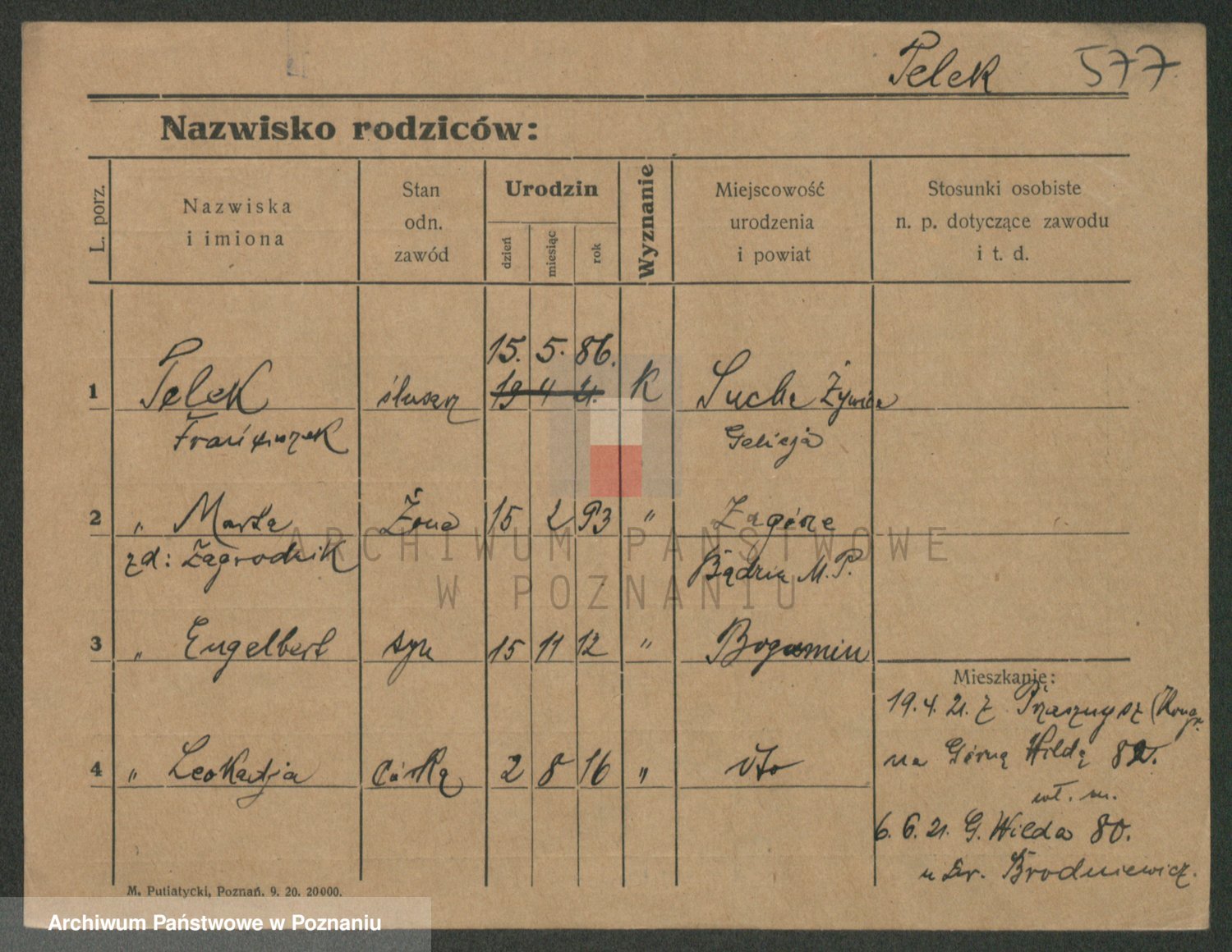 Podgląd karty osobowej dostępny jest po kliknięciu na nazwisko lub ikonkę karty. Można dokonywać powiększenia (ikony na górze) lub przechodzić między kolejnymi skanami (strzałki po bokach).
