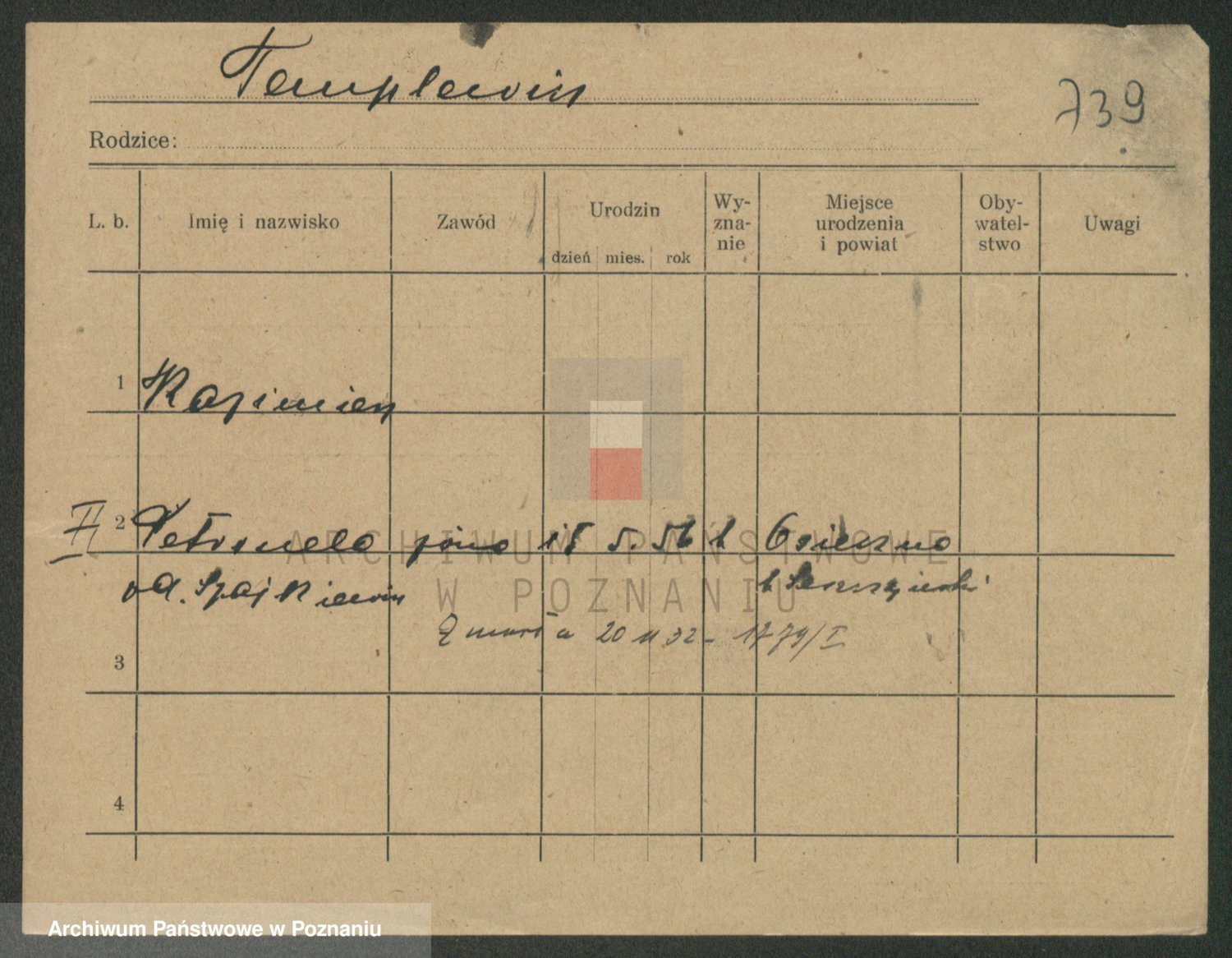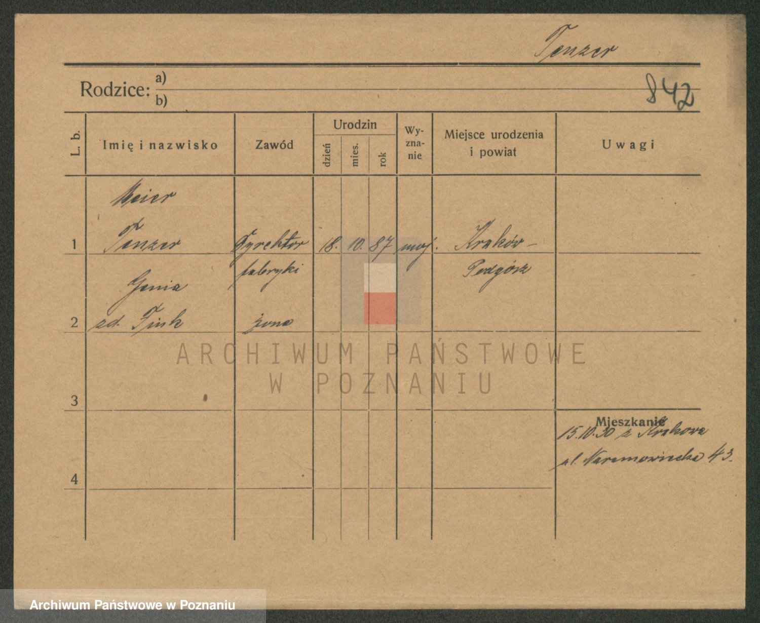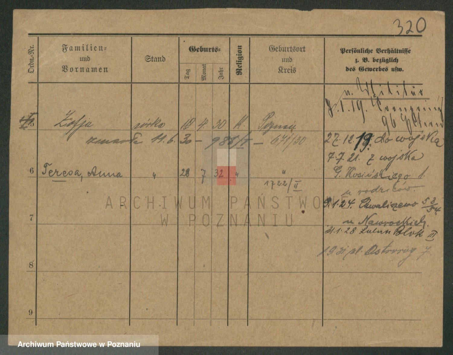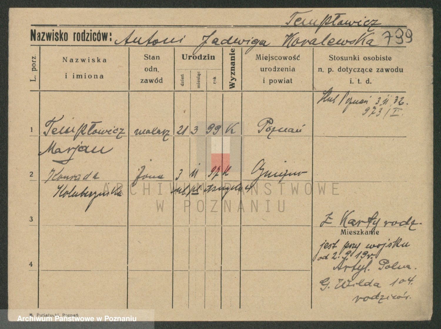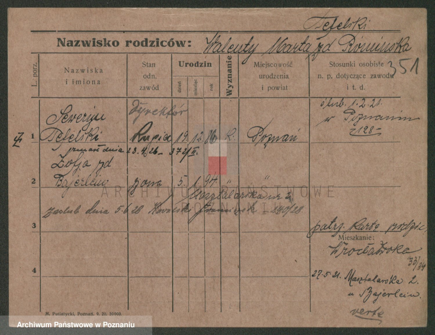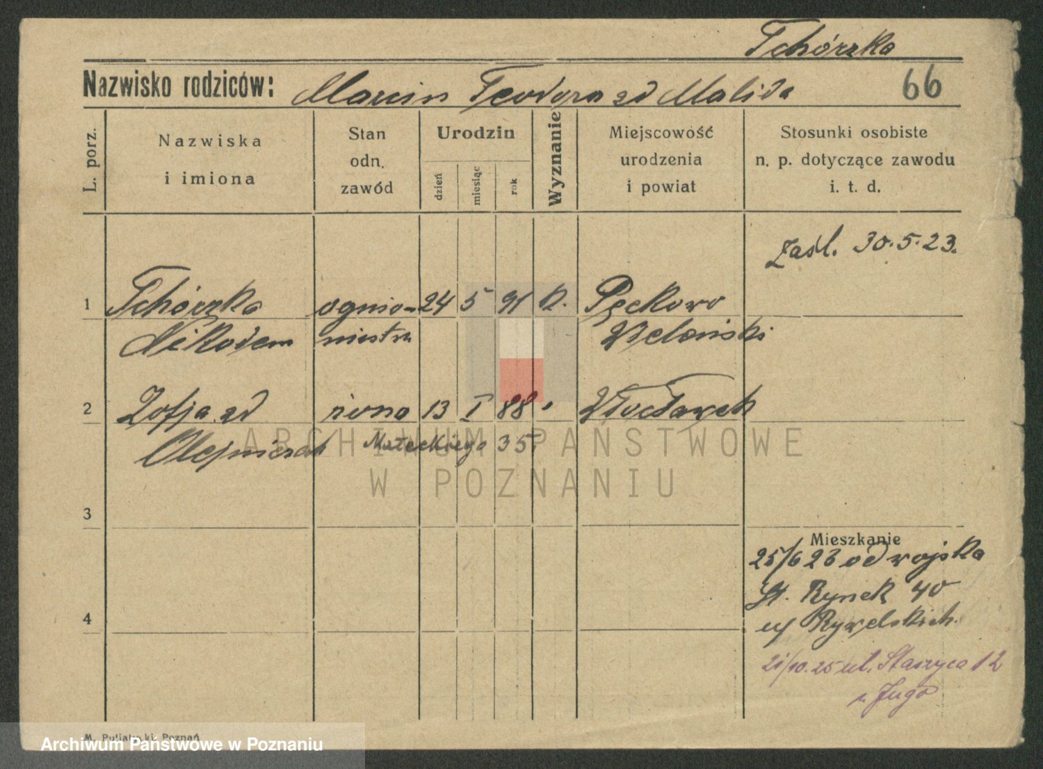Podgląd karty osobowej dostępny jest po kliknięciu na nazwisko lub ikonkę karty. Można dokonywać powiększenia (ikony na górze) lub przechodzić między kolejnymi skanami (strzałki po bokach).