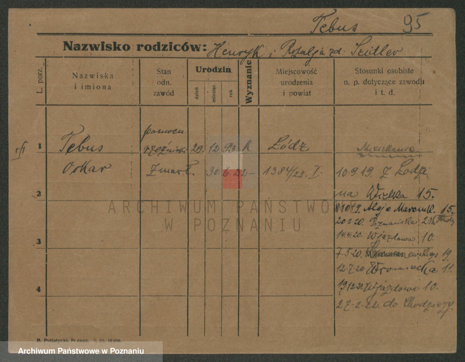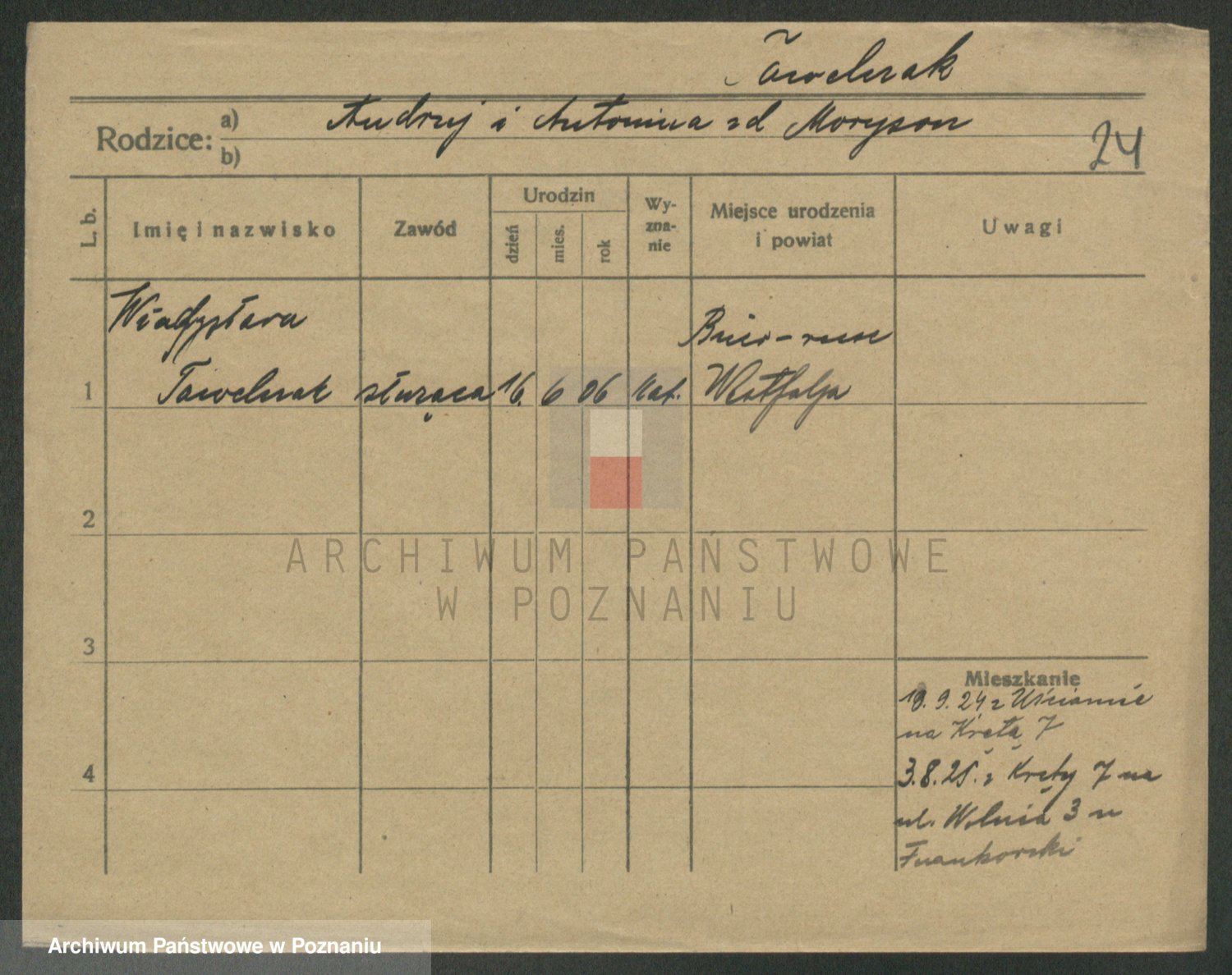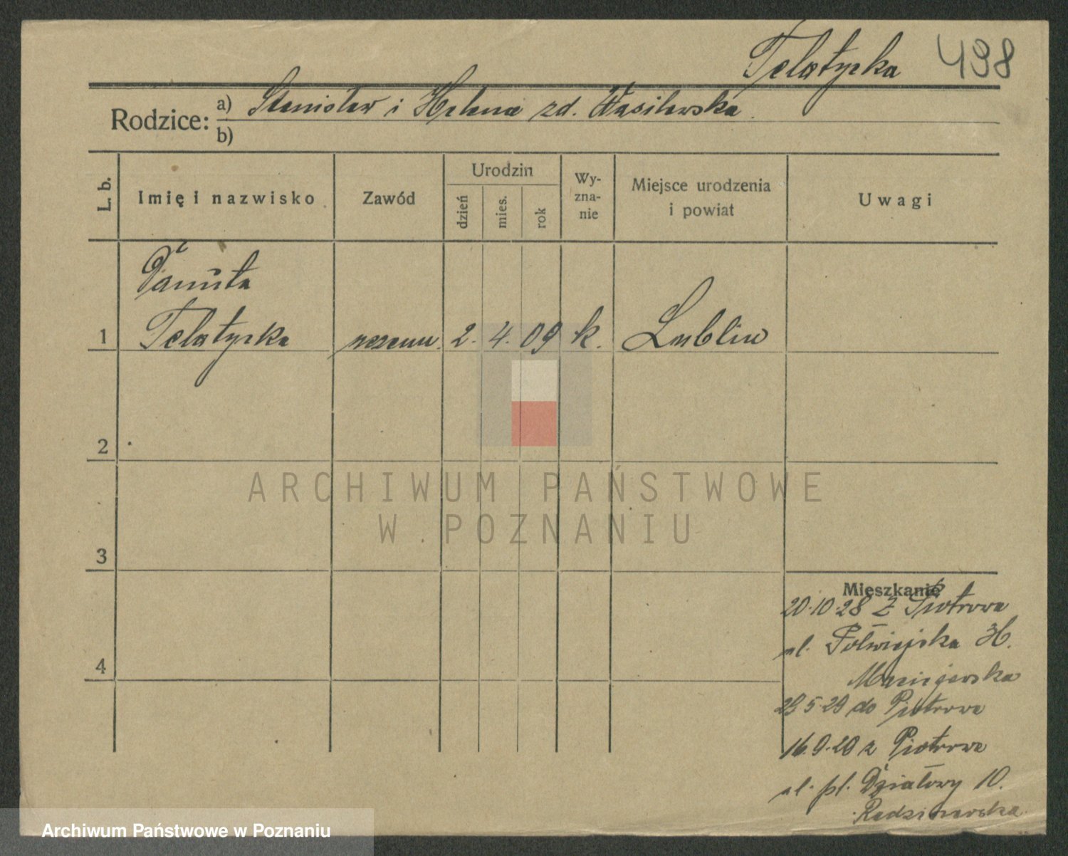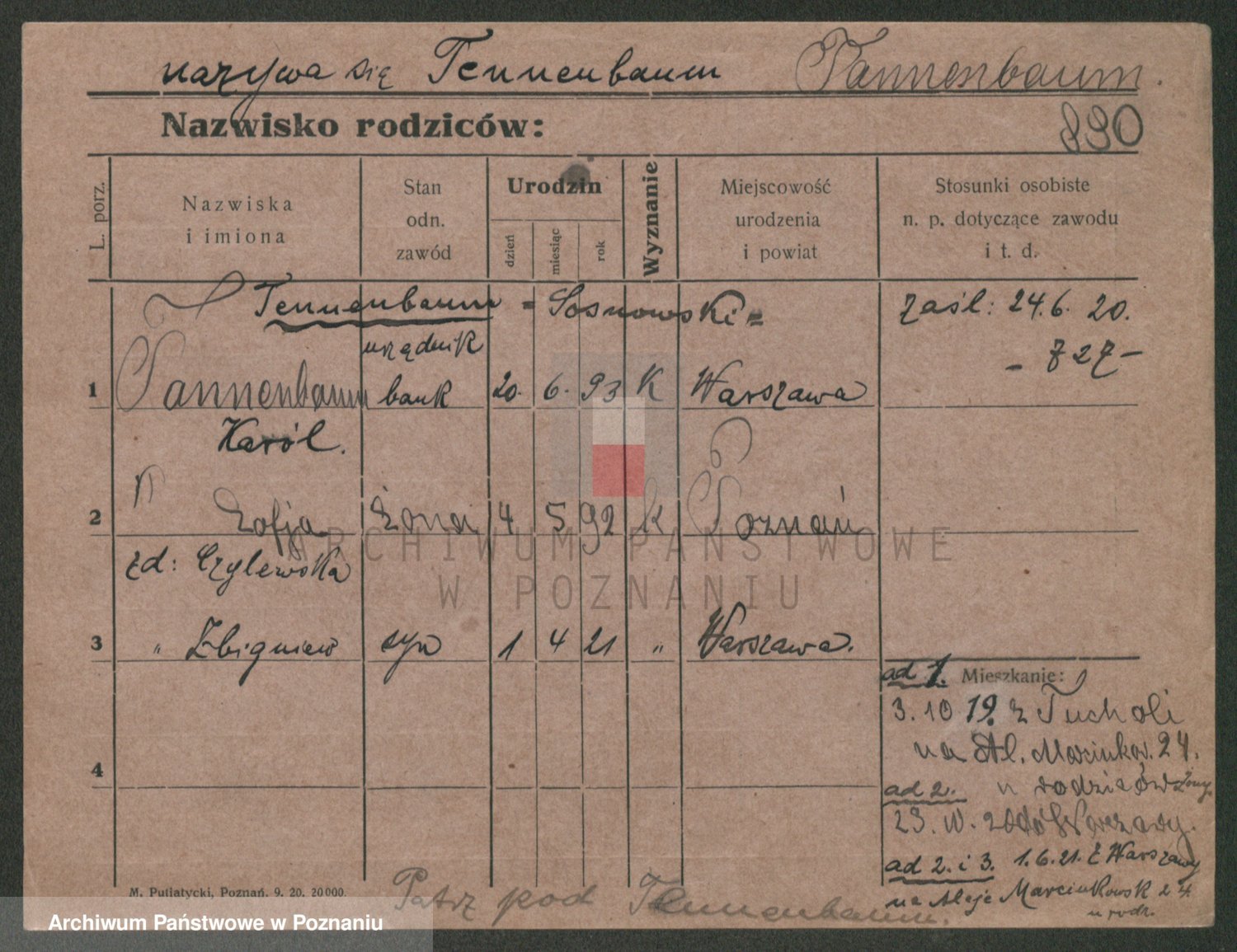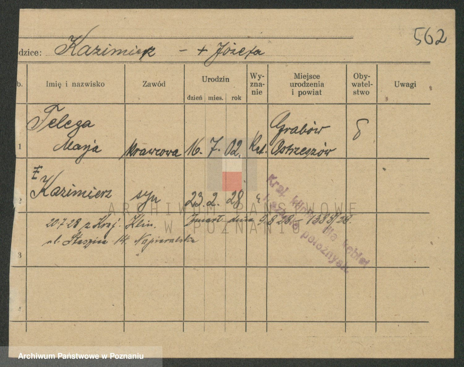Podgląd karty osobowej dostępny jest po kliknięciu na nazwisko lub ikonkę karty. Można dokonywać powiększenia (ikony na górze) lub przechodzić między kolejnymi skanami (strzałki po bokach).