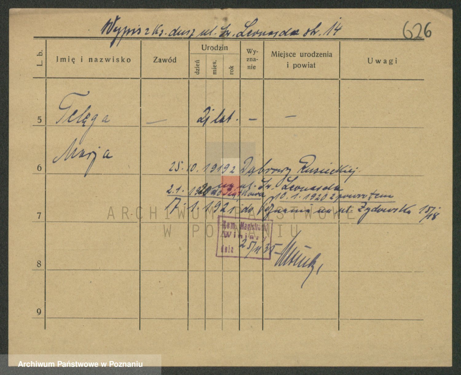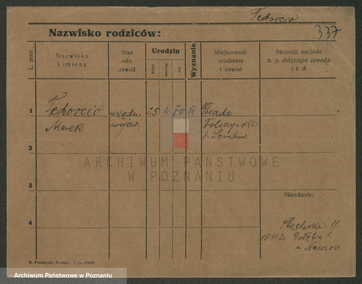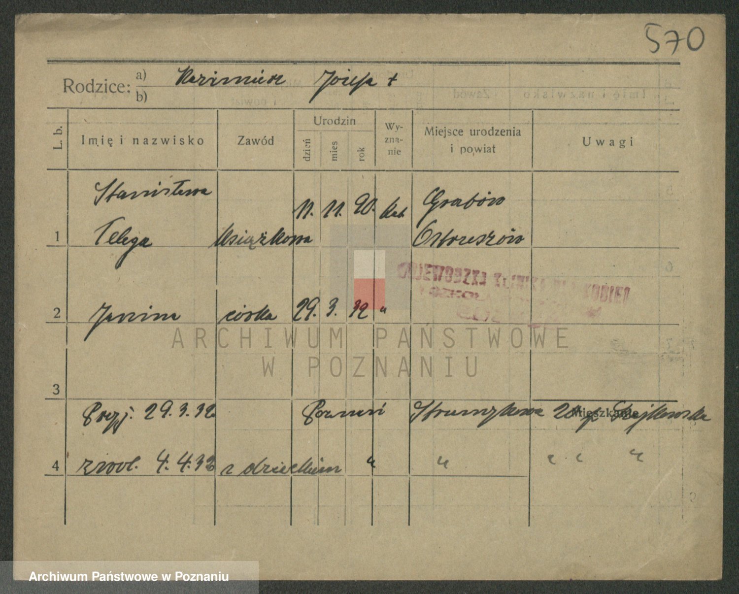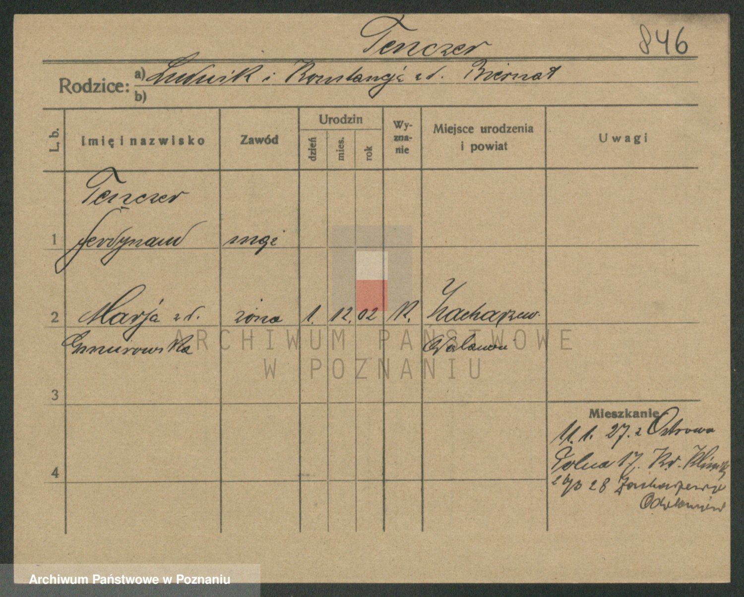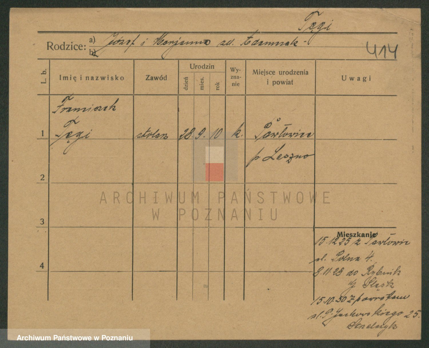 Podgląd karty osobowej dostępny jest po kliknięciu na nazwisko lub ikonkę karty. Można dokonywać powiększenia (ikony na górze) lub przechodzić między kolejnymi skanami (strzałki po bokach).