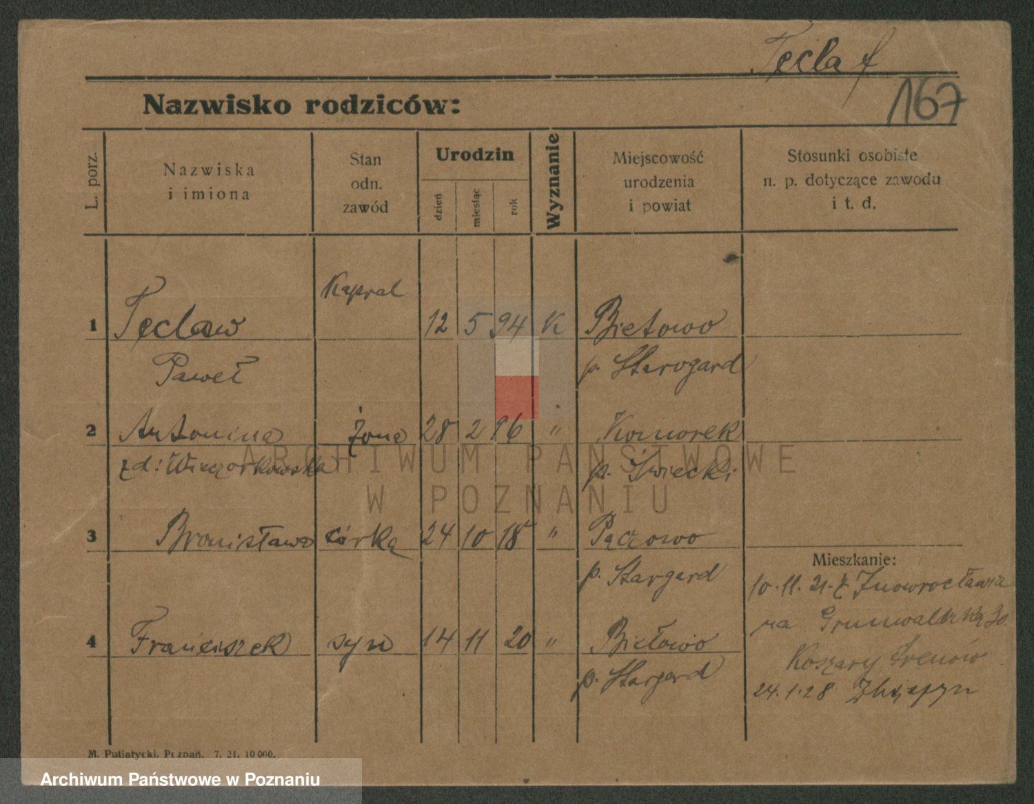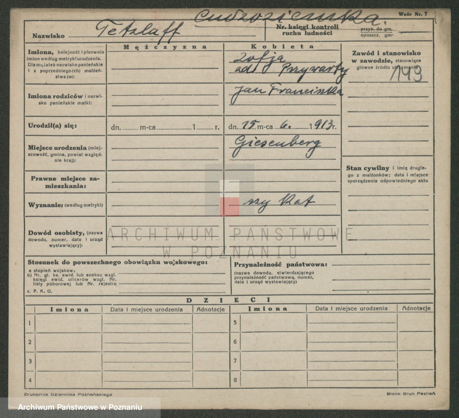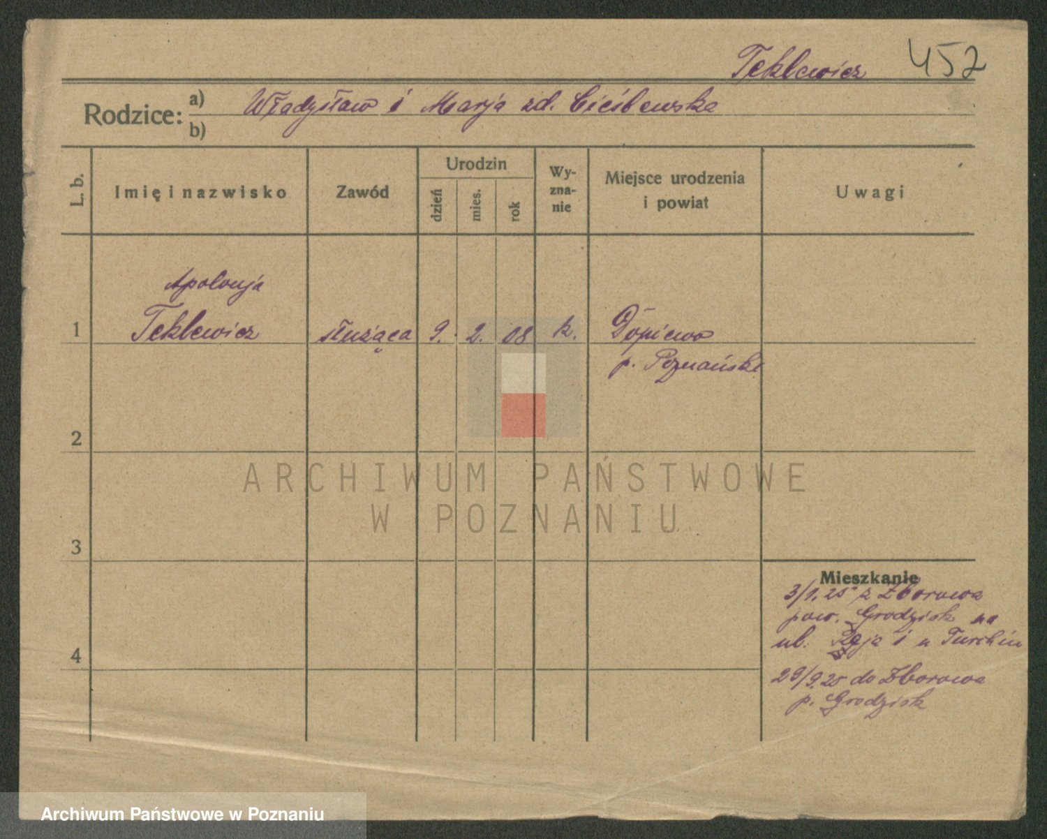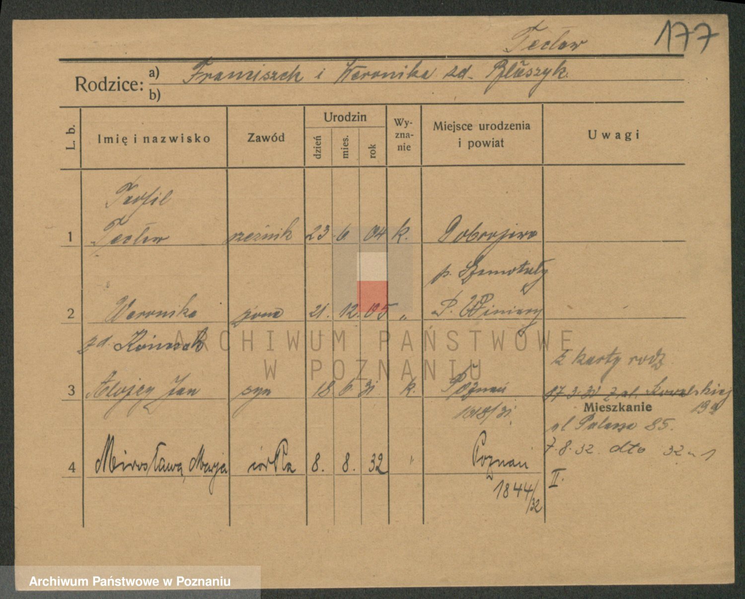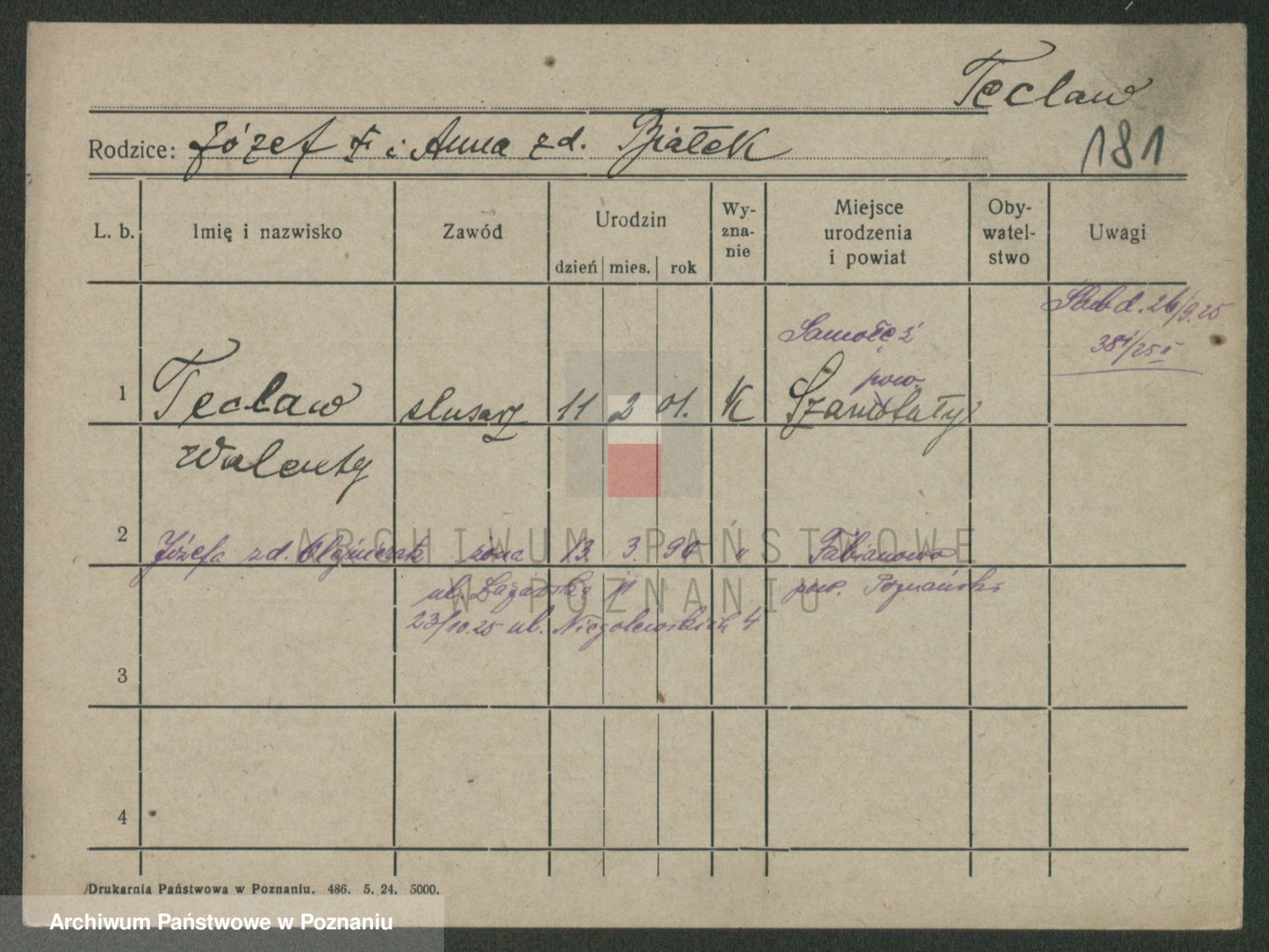 Podgląd karty osobowej dostępny jest po kliknięciu na nazwisko lub ikonkę karty. Można dokonywać powiększenia (ikony na górze) lub przechodzić między kolejnymi skanami (strzałki po bokach).