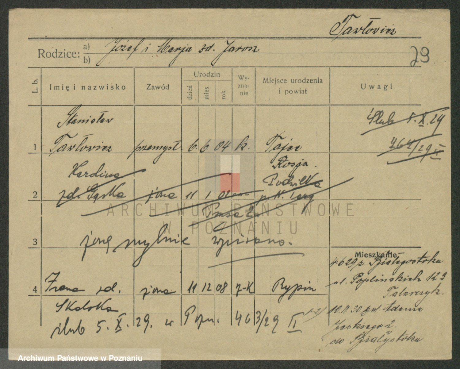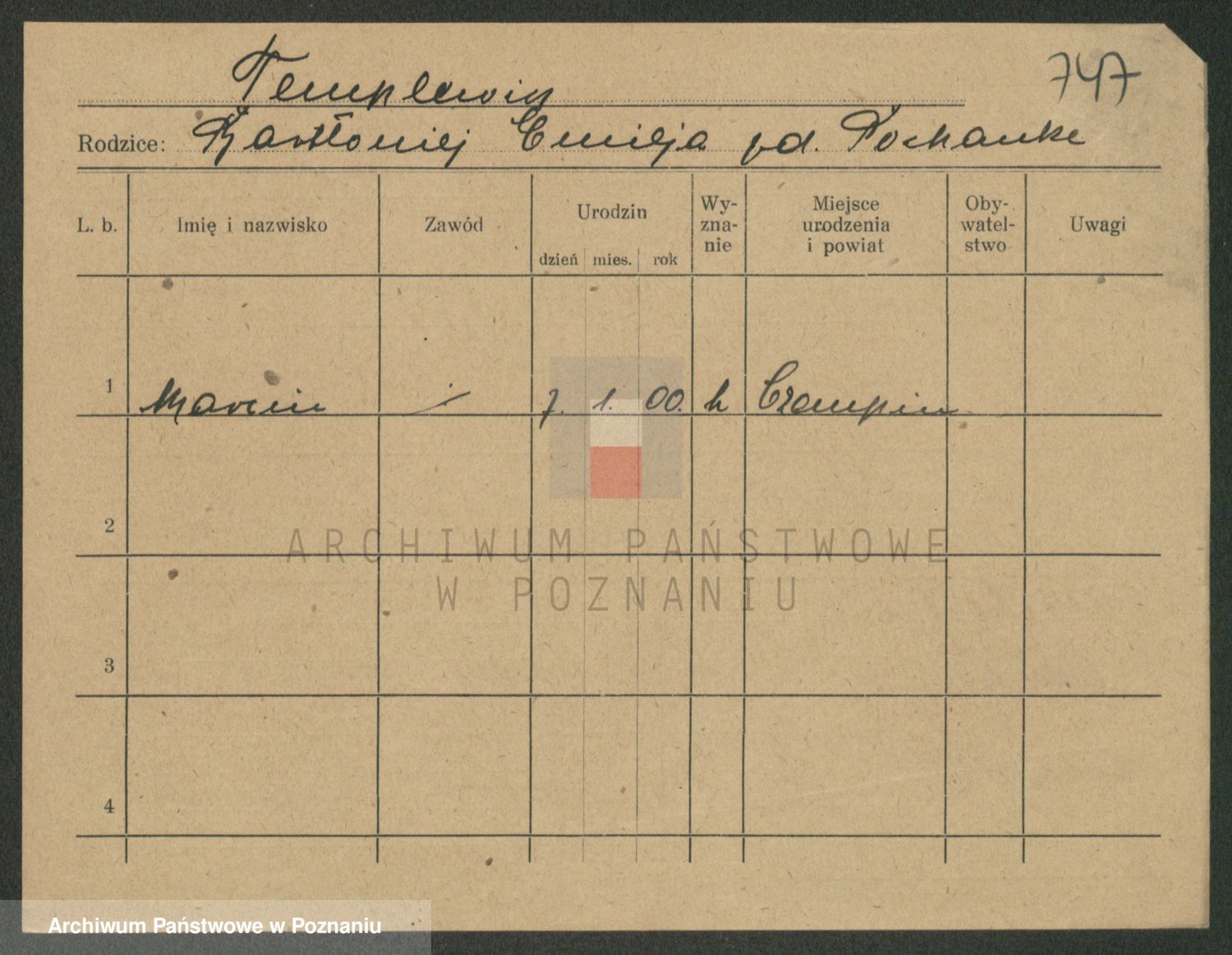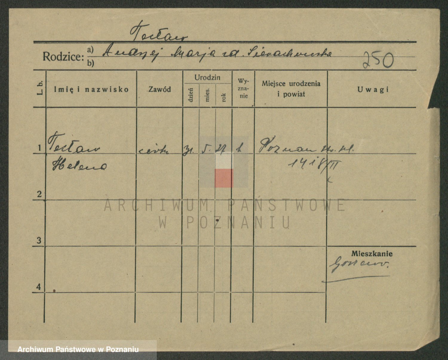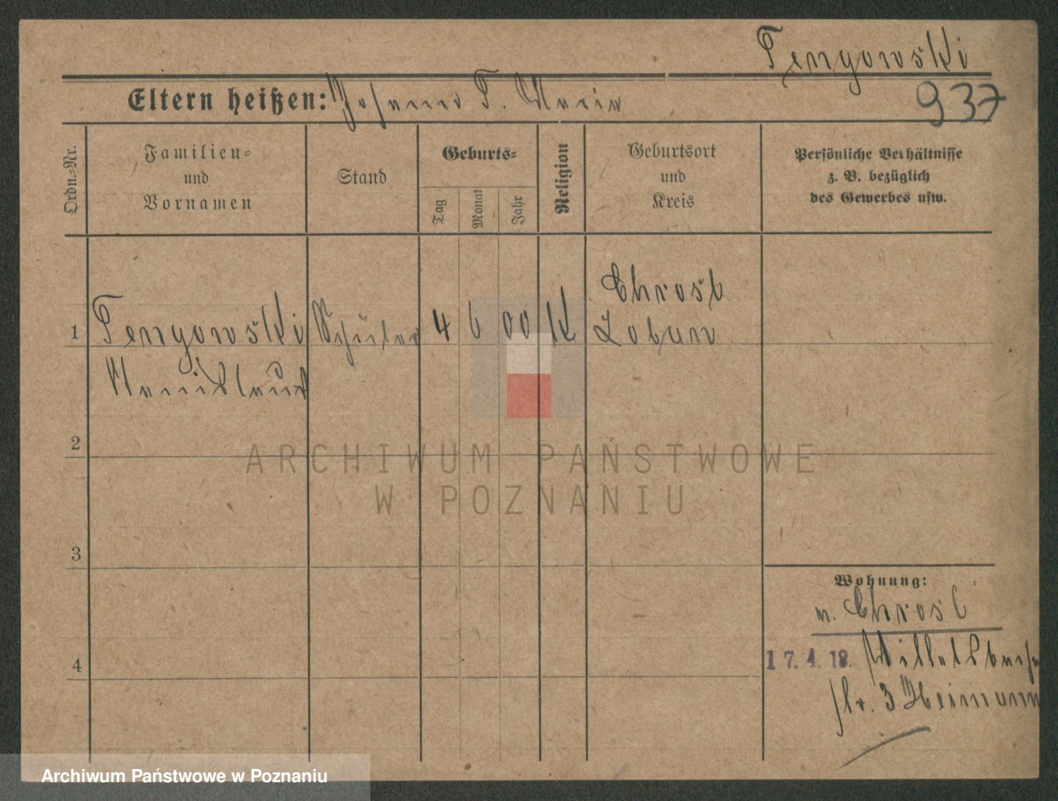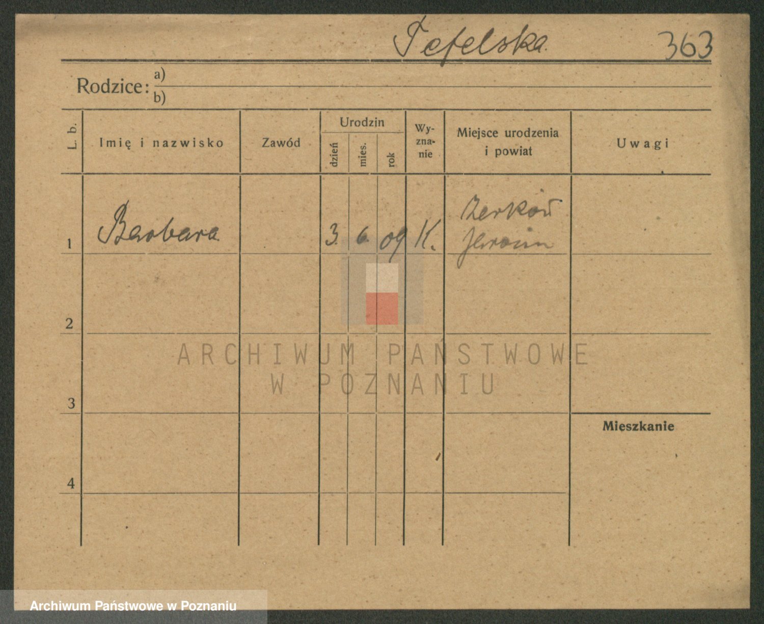 Podgląd karty osobowej dostępny jest po kliknięciu na nazwisko lub ikonkę karty. Można dokonywać powiększenia (ikony na górze) lub przechodzić między kolejnymi skanami (strzałki po bokach).