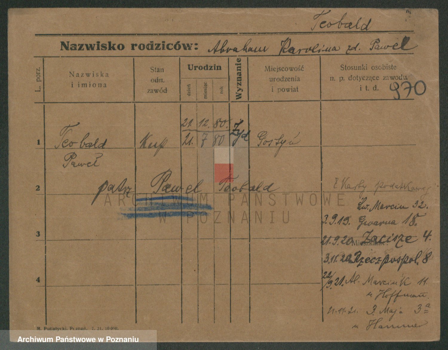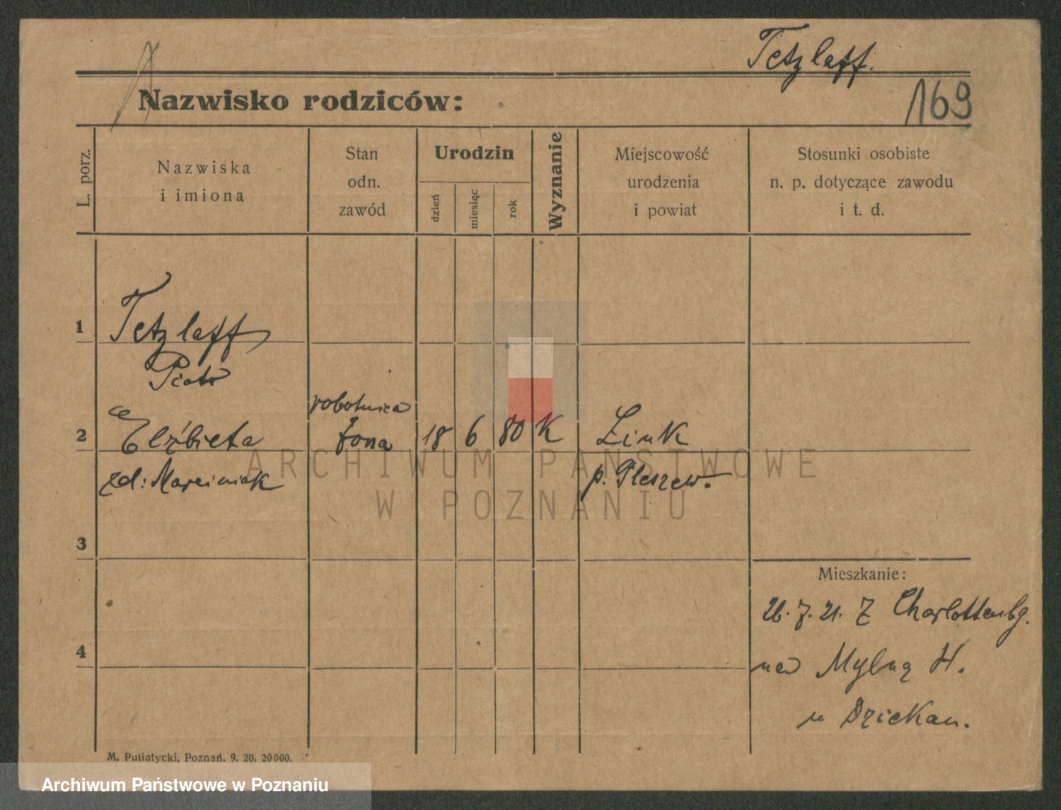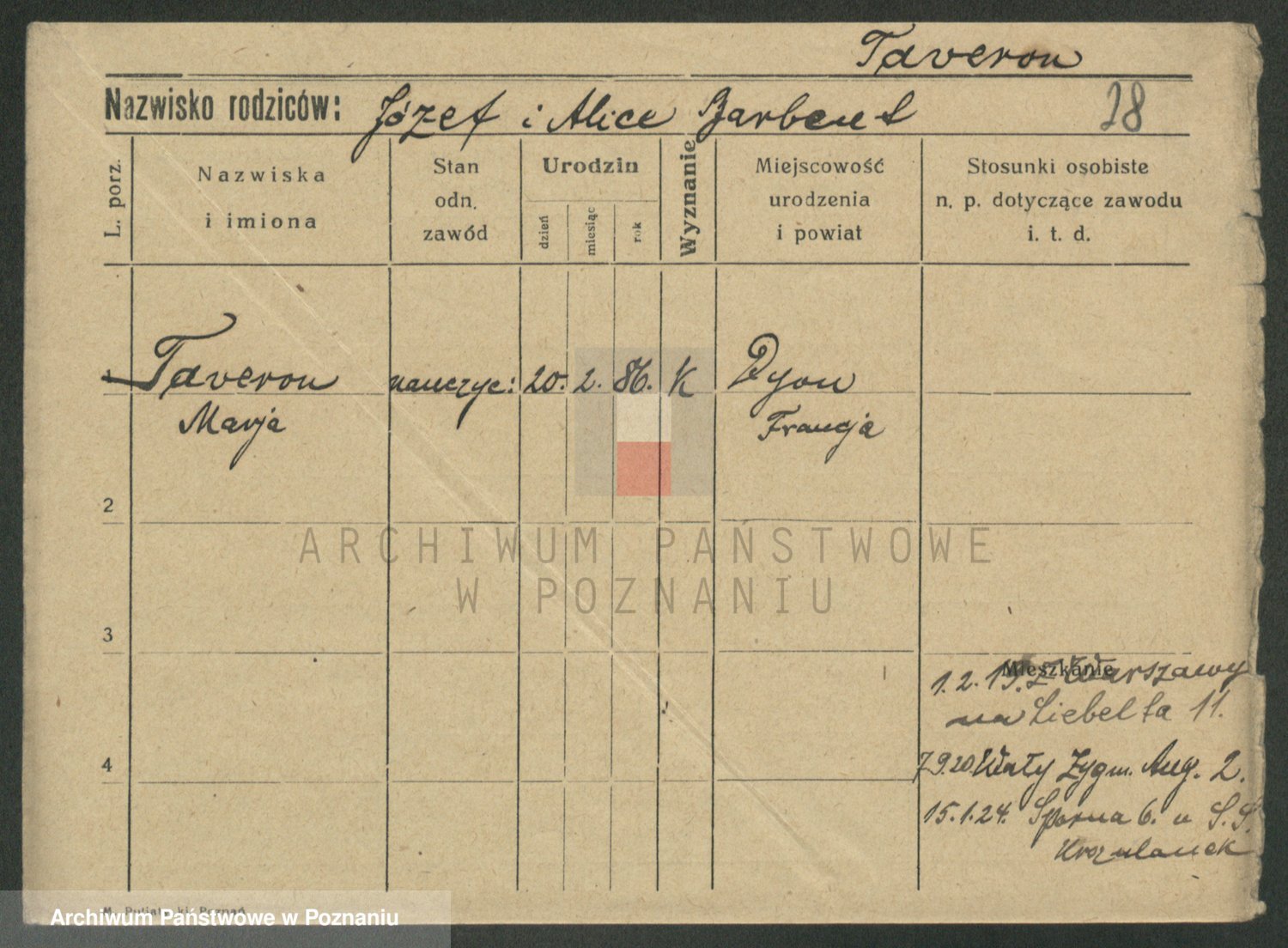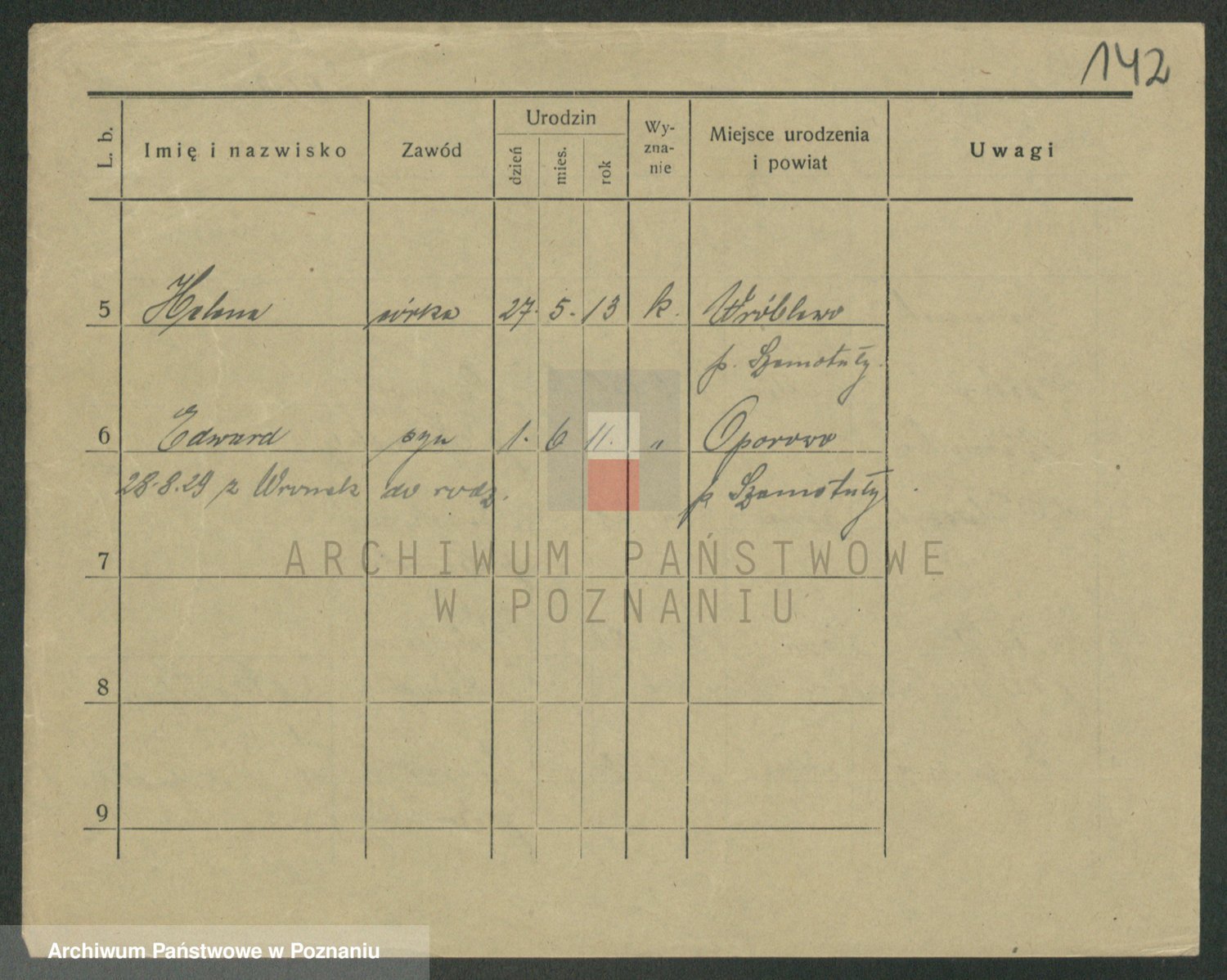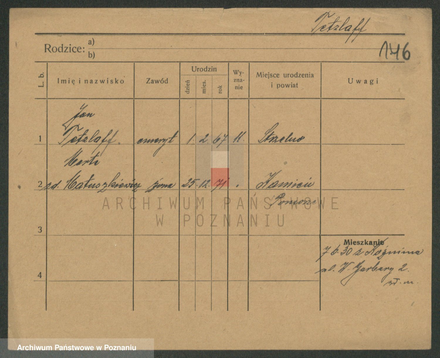 Podgląd karty osobowej dostępny jest po kliknięciu na nazwisko lub ikonkę karty. Można dokonywać powiększenia (ikony na górze) lub przechodzić między kolejnymi skanami (strzałki po bokach).