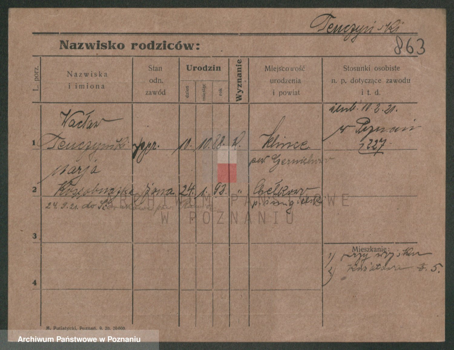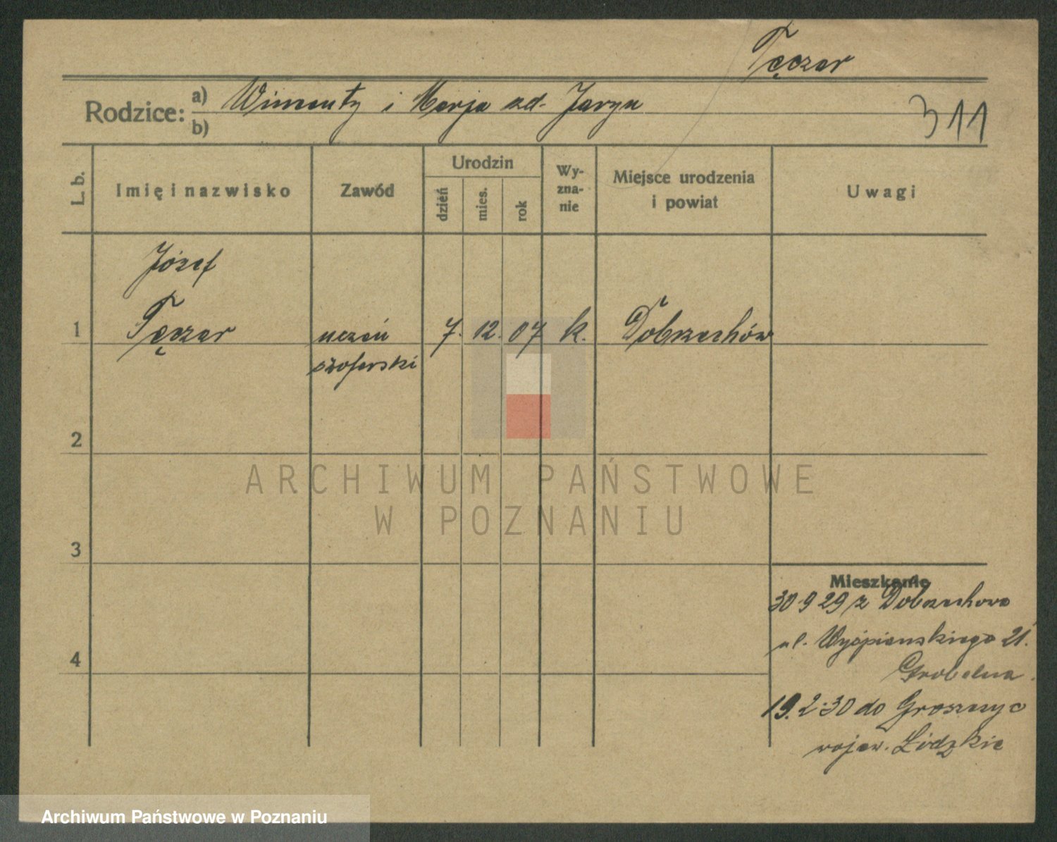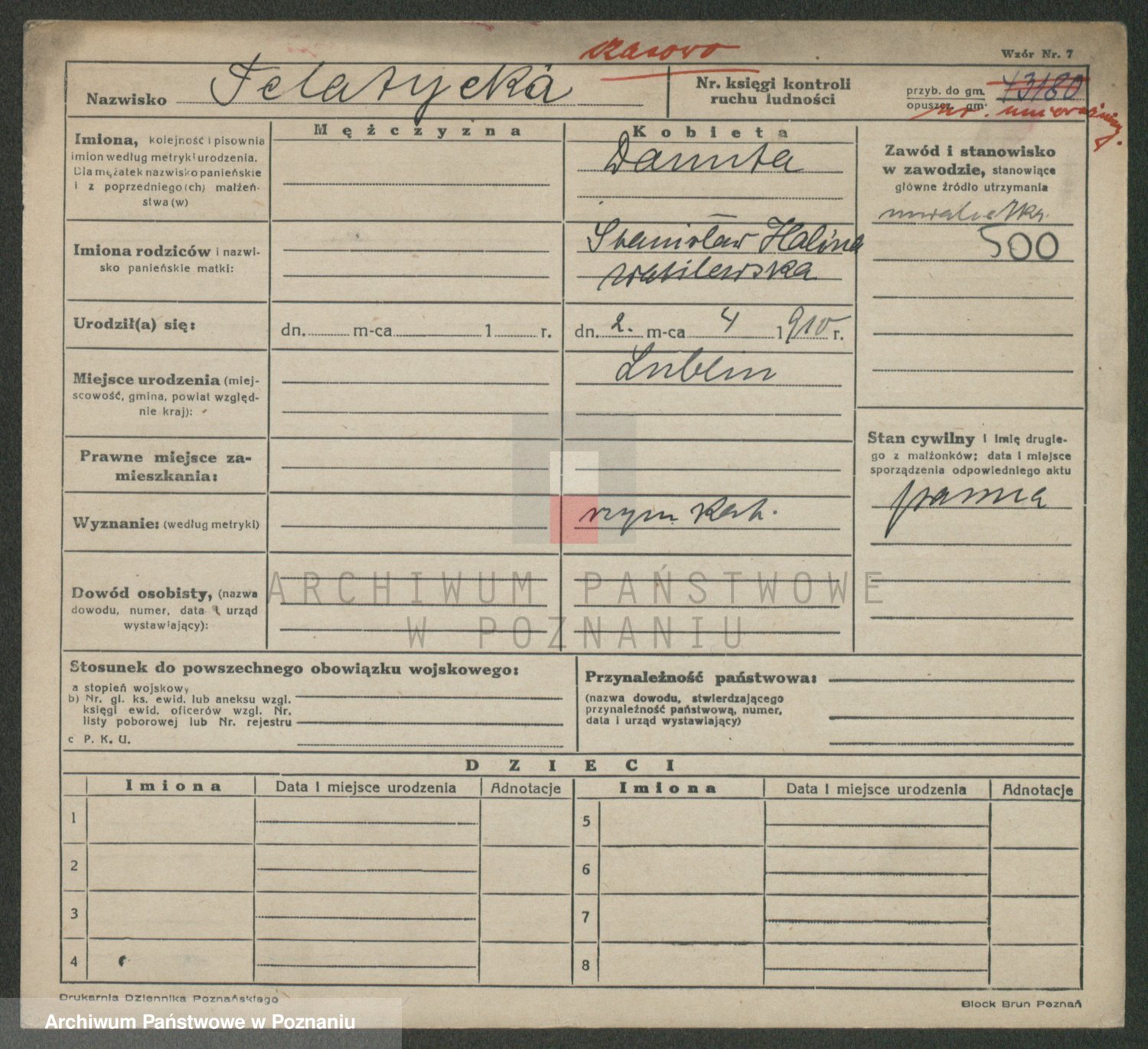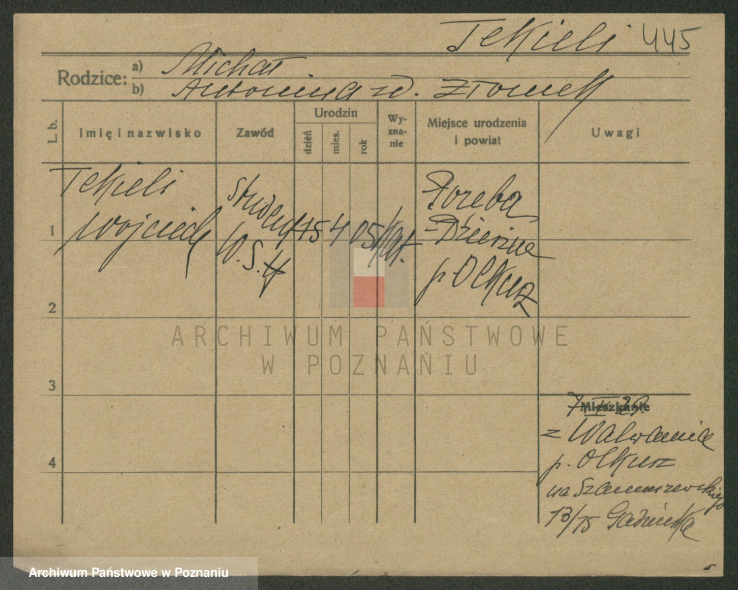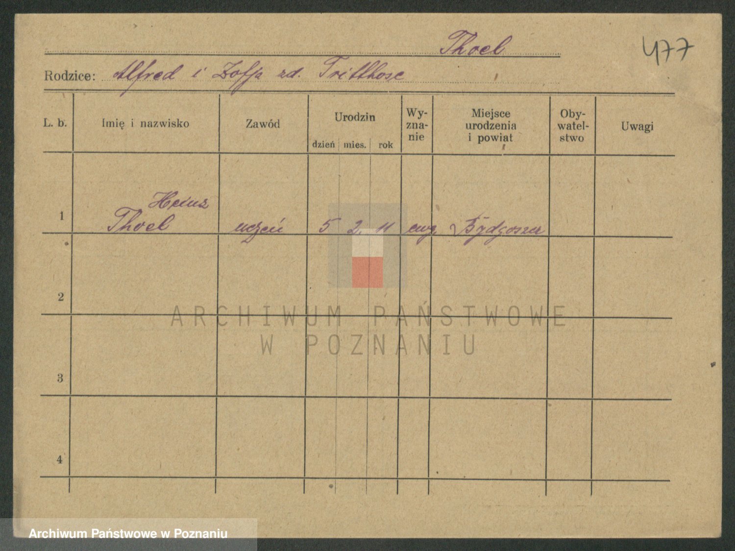 Podgląd karty osobowej dostępny jest po kliknięciu na nazwisko lub ikonkę karty. Można dokonywać powiększenia (ikony na górze) lub przechodzić między kolejnymi skanami (strzałki po bokach).