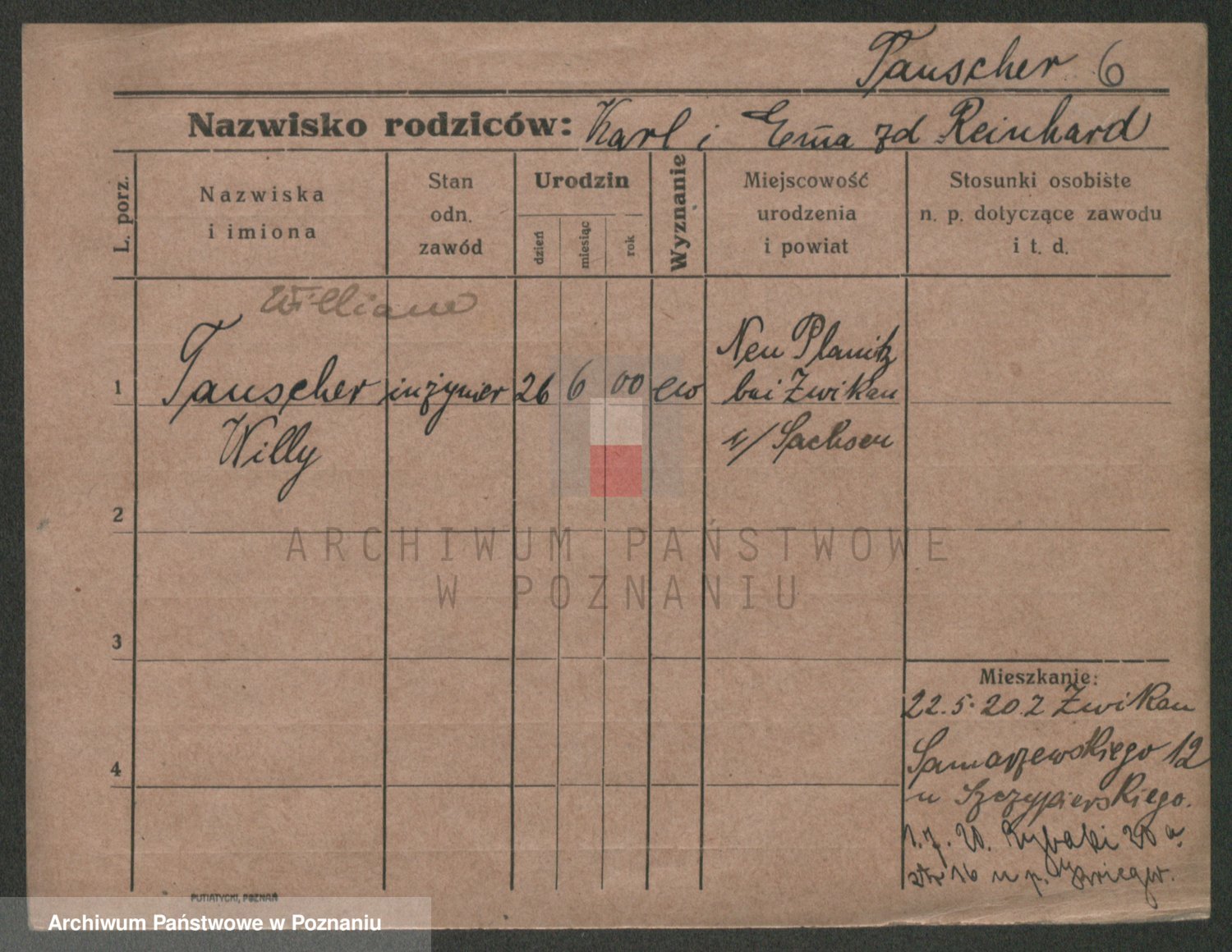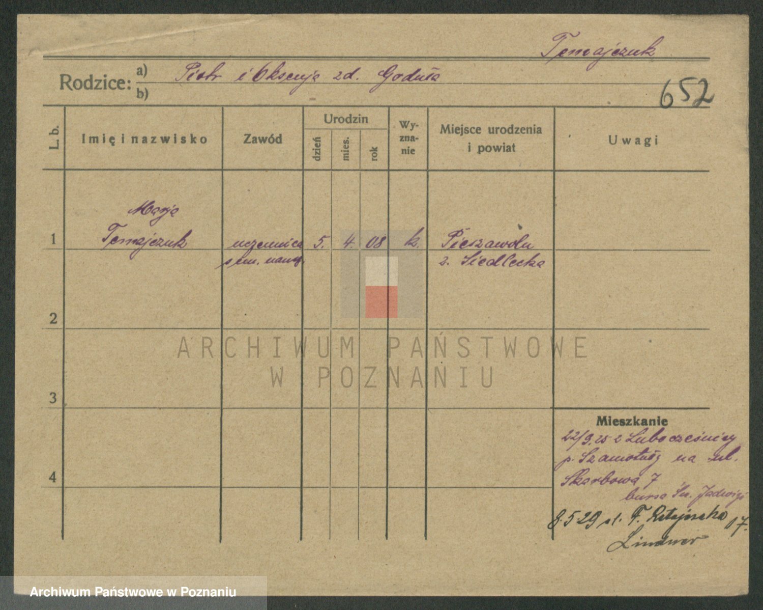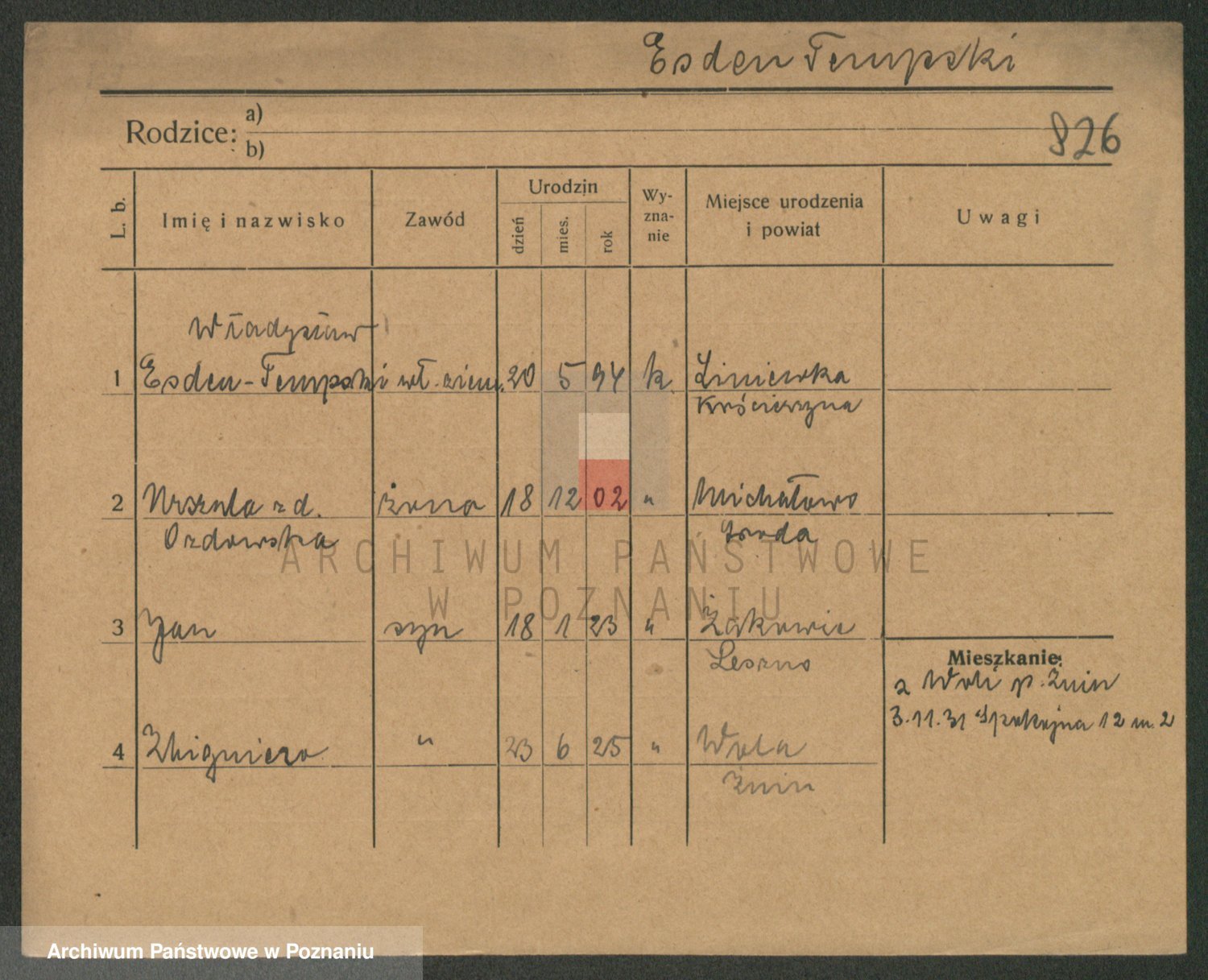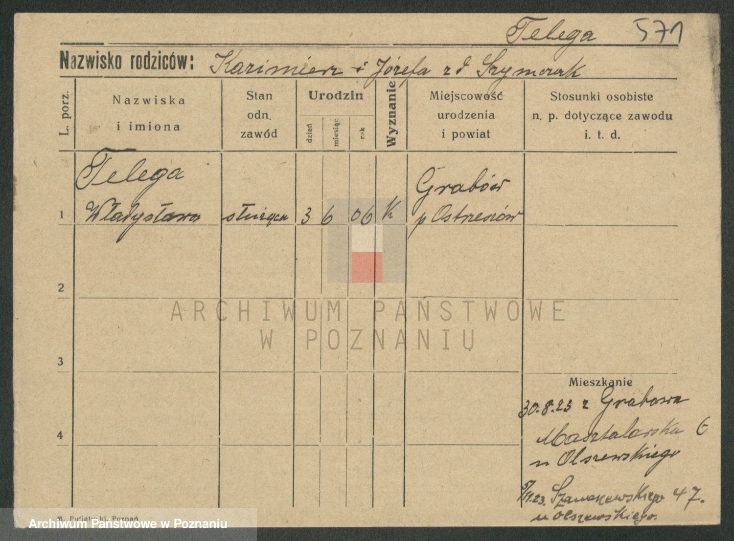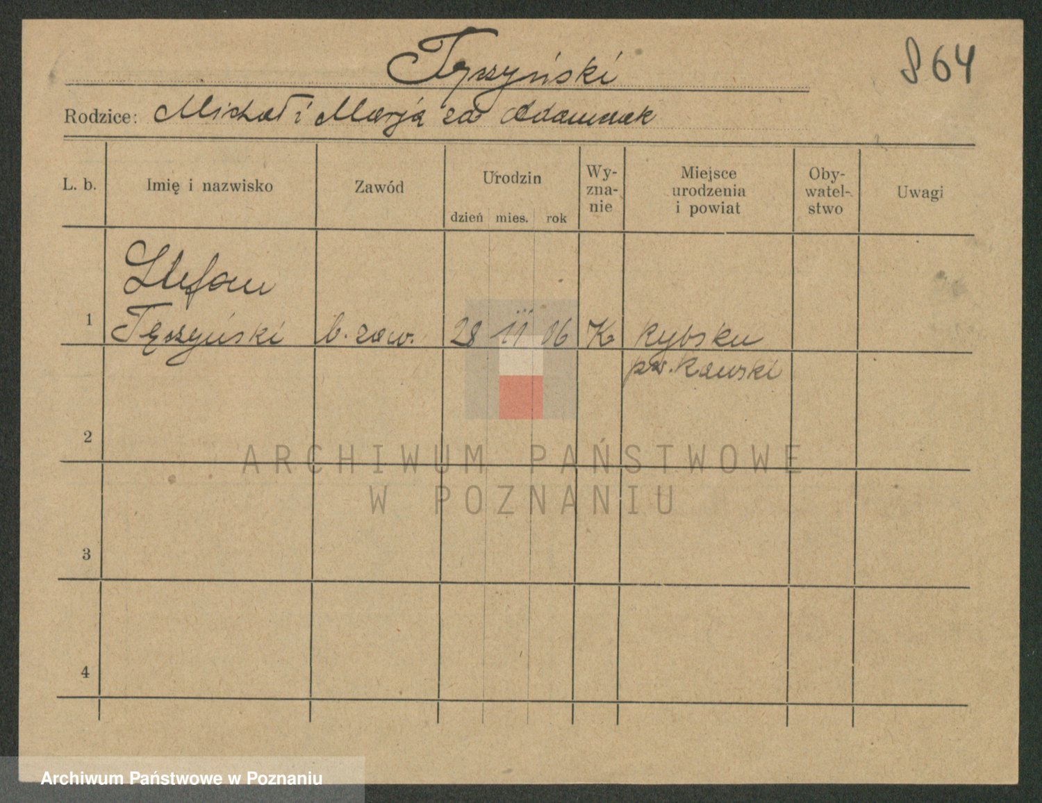 Podgląd karty osobowej dostępny jest po kliknięciu na nazwisko lub ikonkę karty. Można dokonywać powiększenia (ikony na górze) lub przechodzić między kolejnymi skanami (strzałki po bokach).