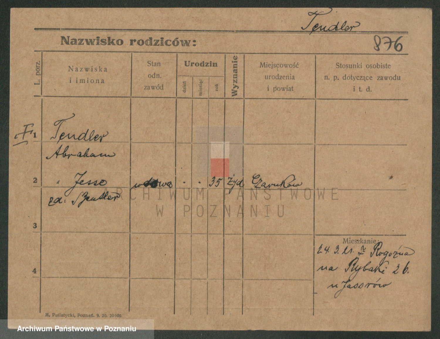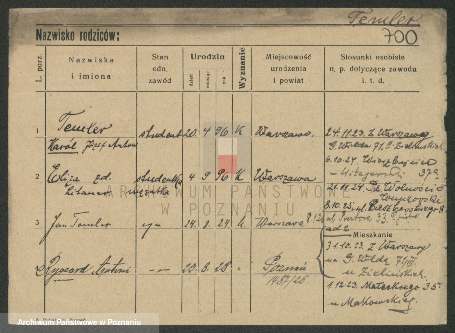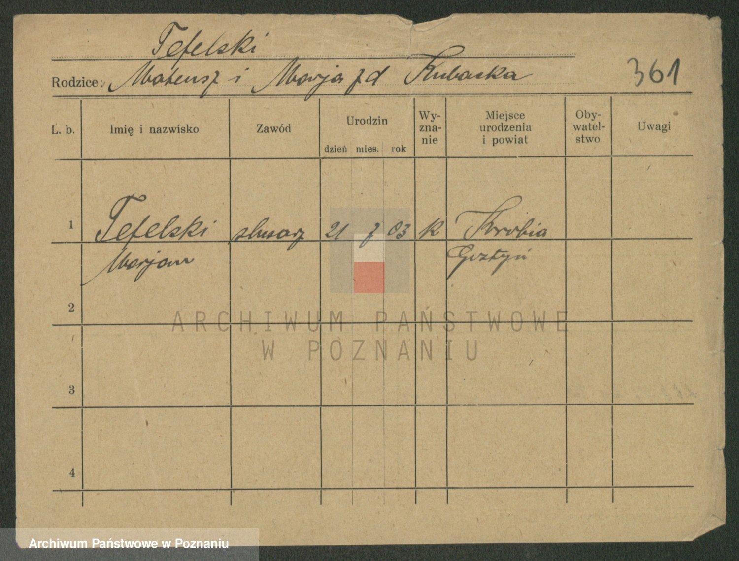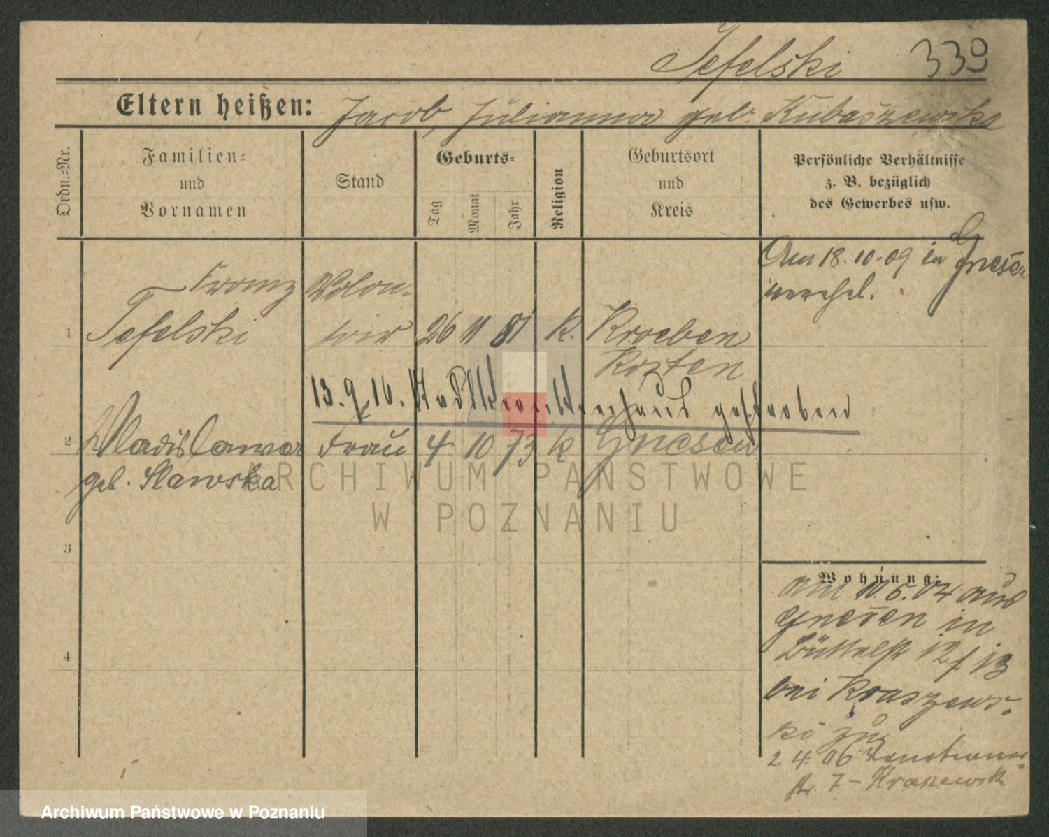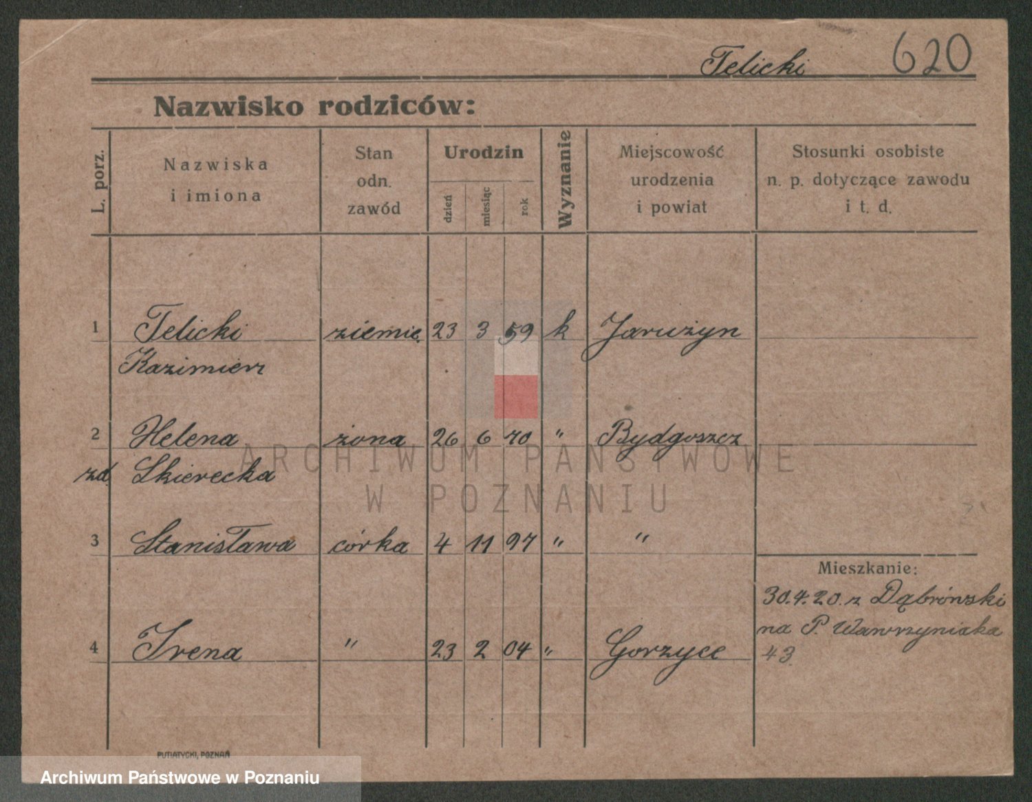 Podgląd karty osobowej dostępny jest po kliknięciu na nazwisko lub ikonkę karty. Można dokonywać powiększenia (ikony na górze) lub przechodzić między kolejnymi skanami (strzałki po bokach).