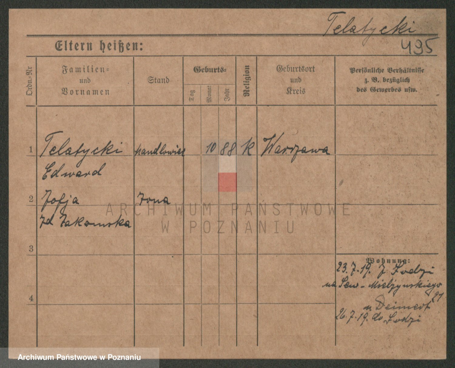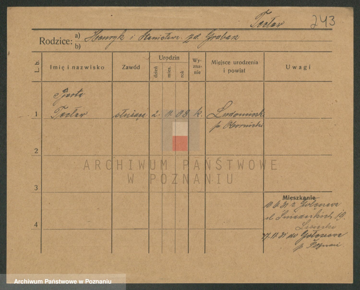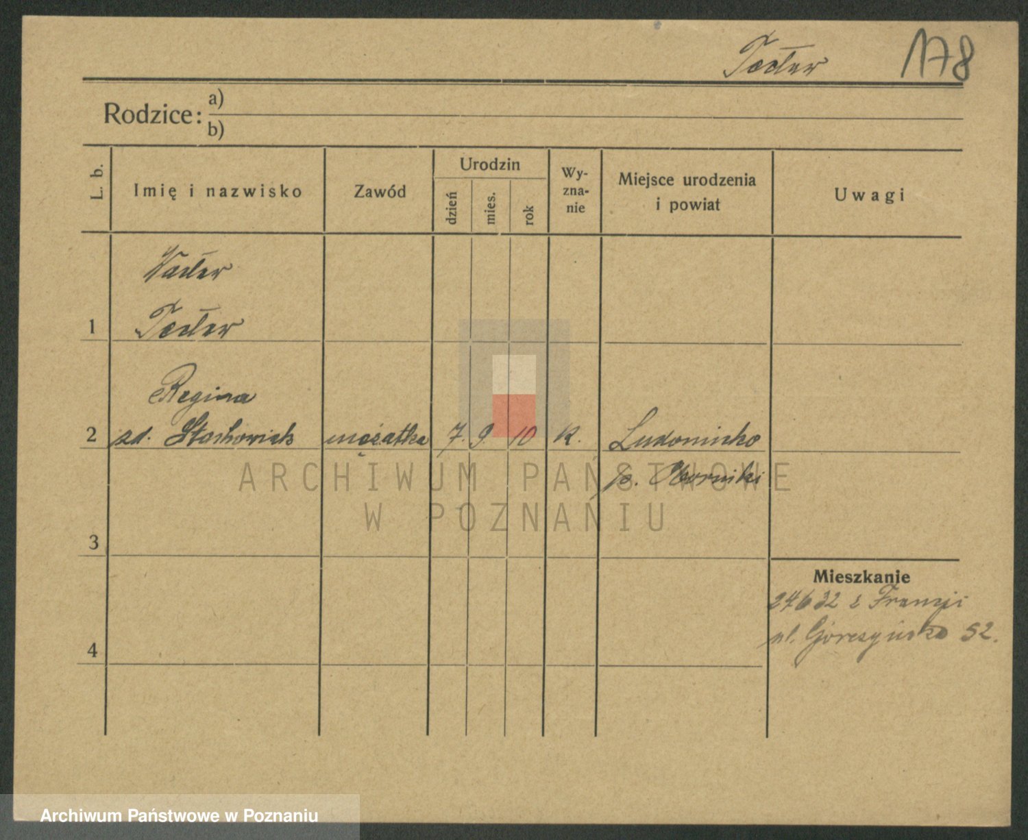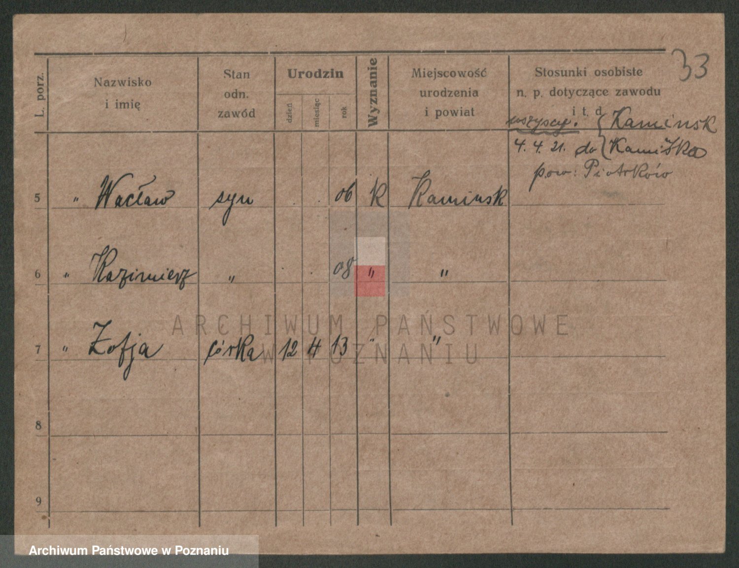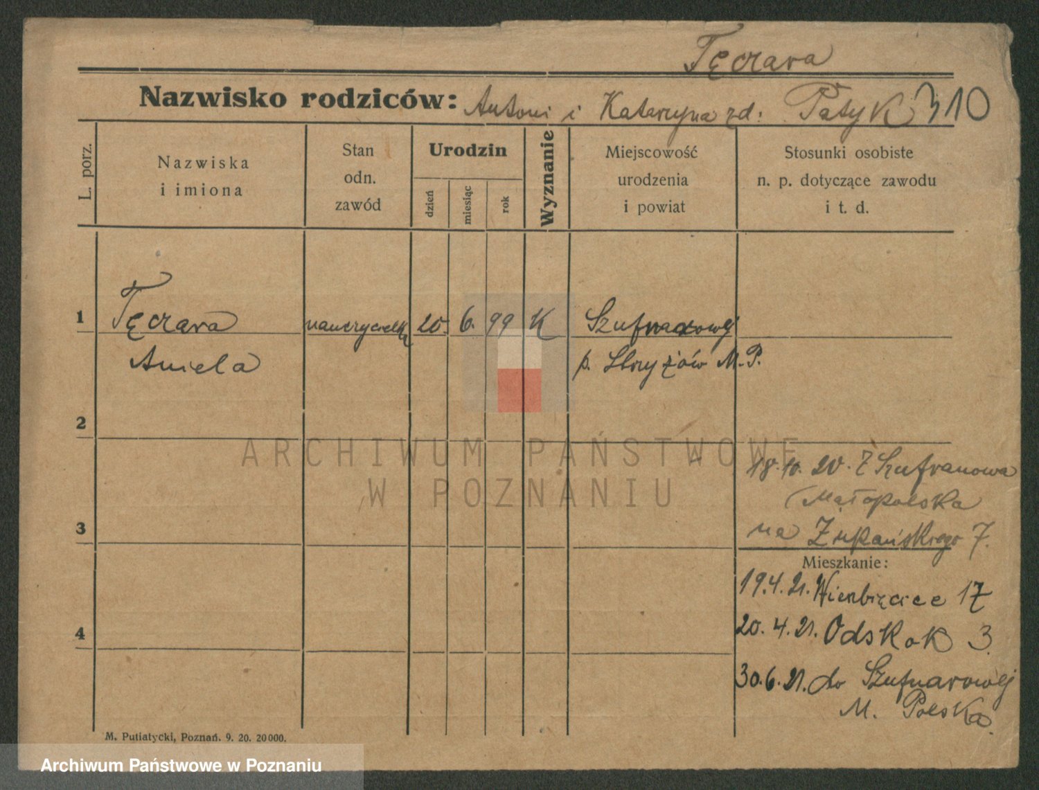 Podgląd karty osobowej dostępny jest po kliknięciu na nazwisko lub ikonkę karty. Można dokonywać powiększenia (ikony na górze) lub przechodzić między kolejnymi skanami (strzałki po bokach).