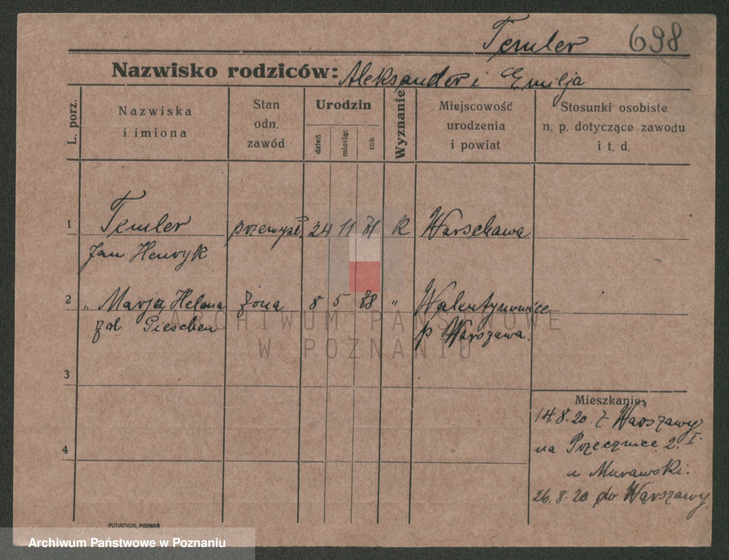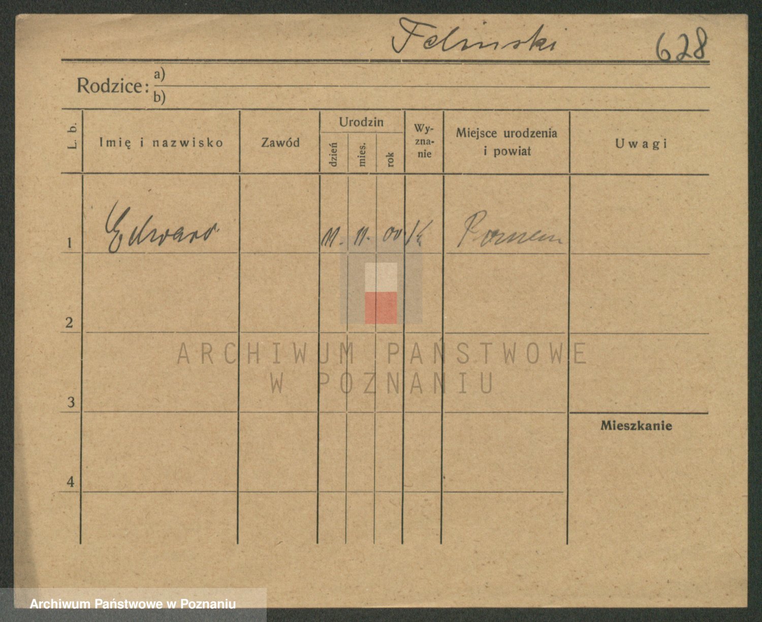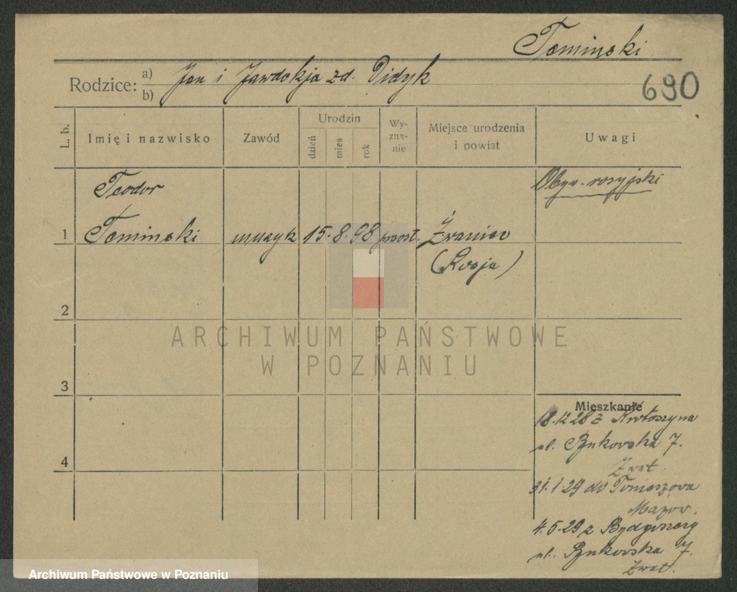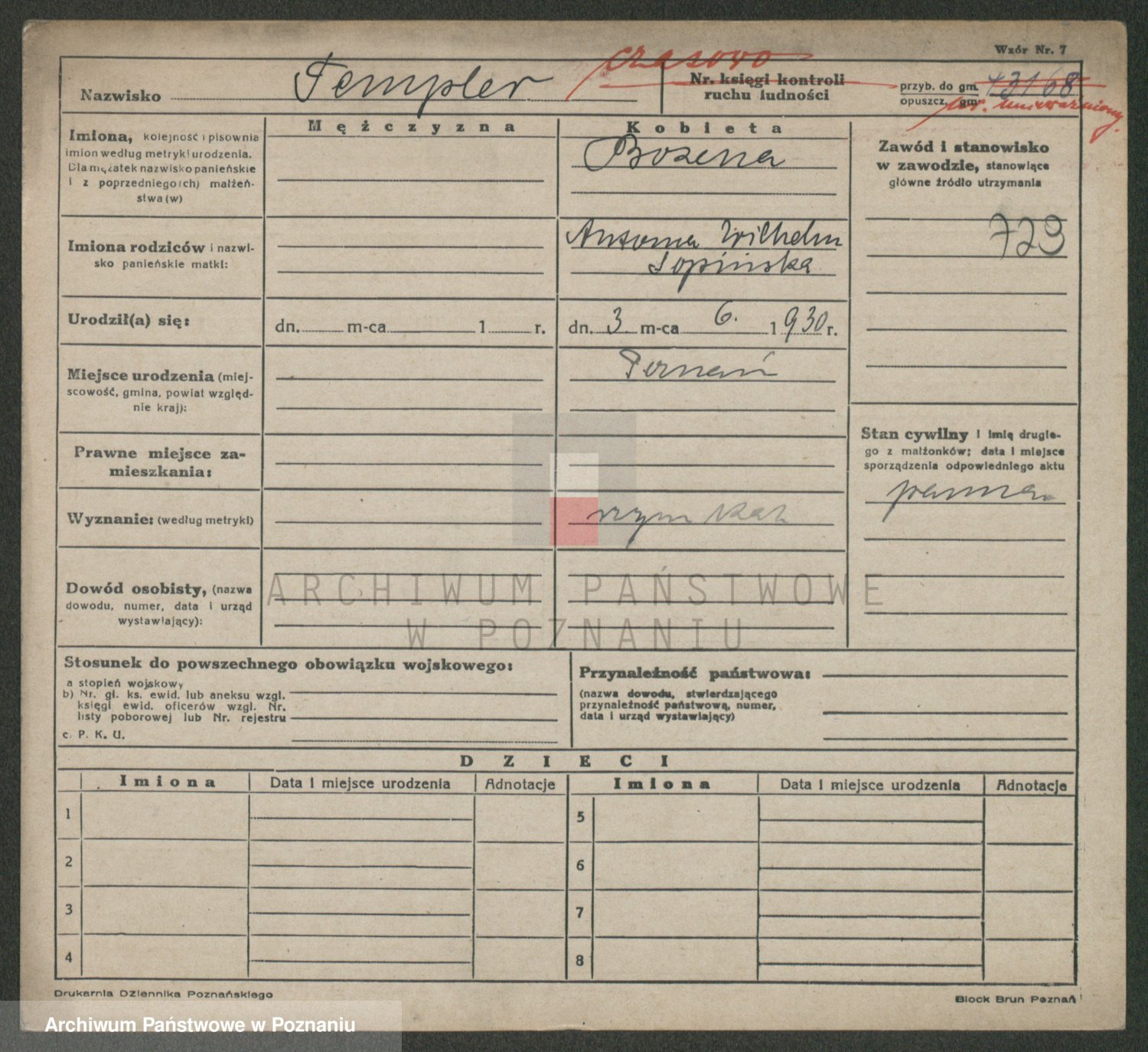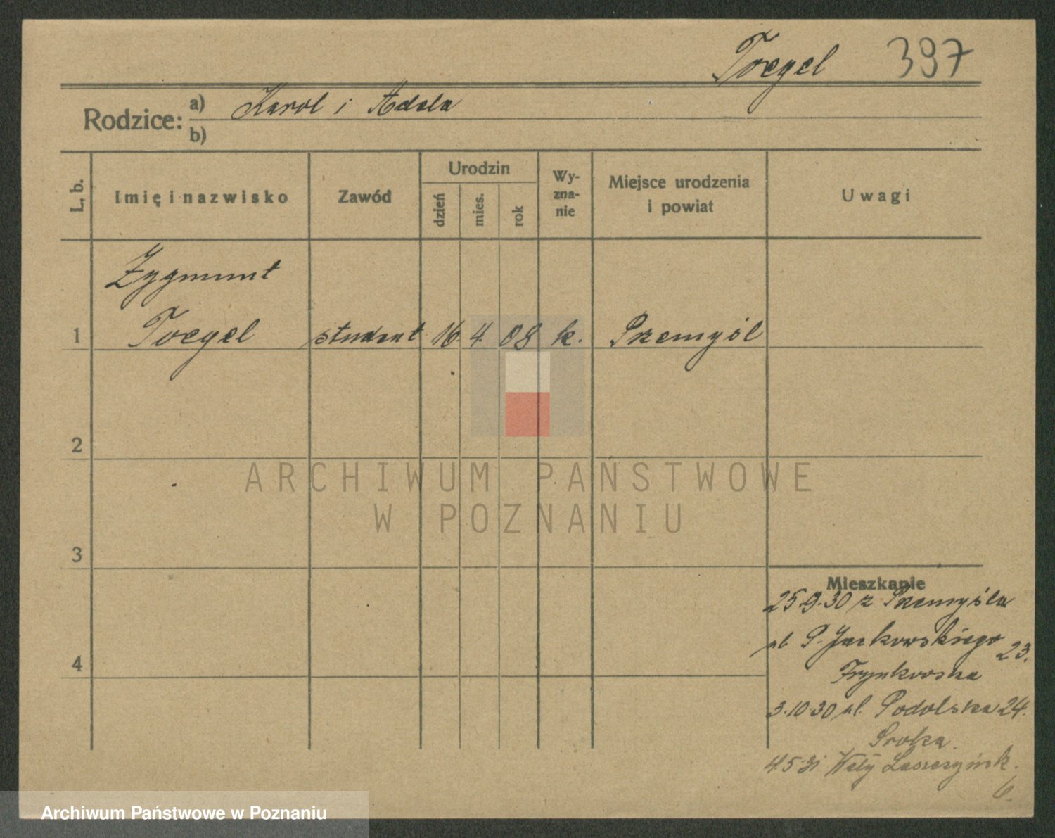 Podgląd karty osobowej dostępny jest po kliknięciu na nazwisko lub ikonkę karty. Można dokonywać powiększenia (ikony na górze) lub przechodzić między kolejnymi skanami (strzałki po bokach).