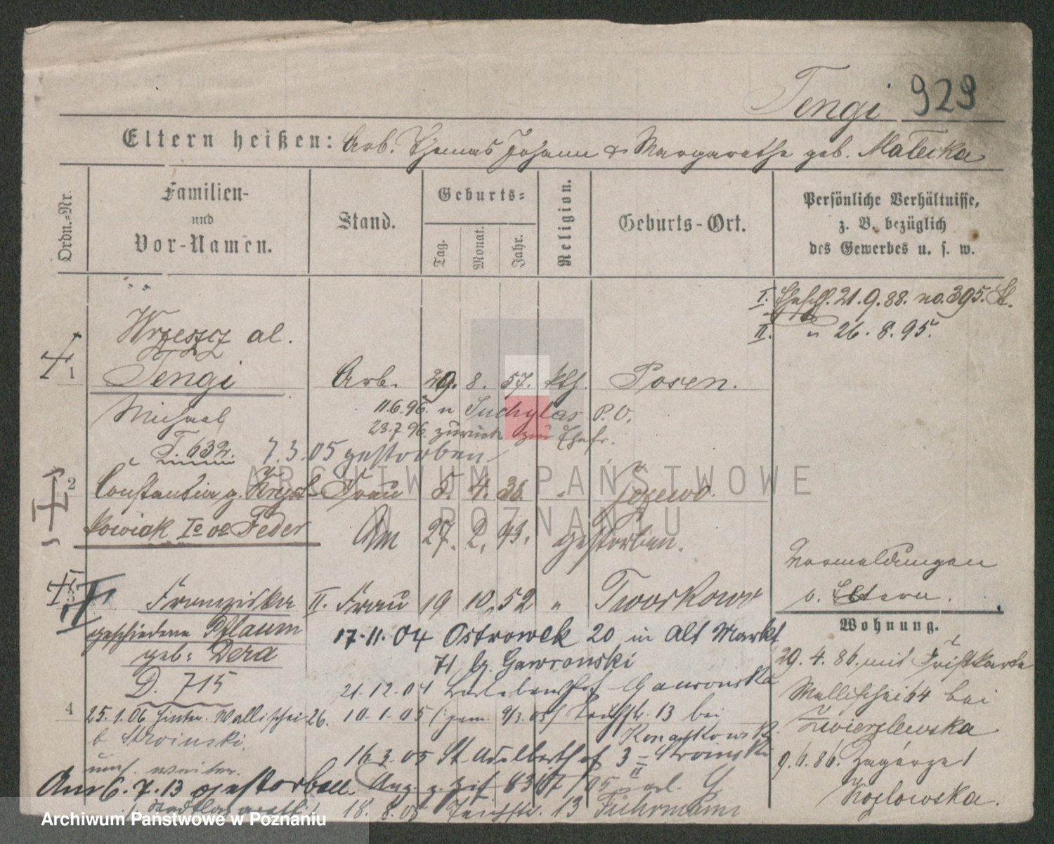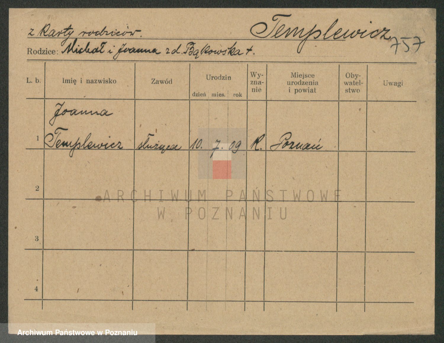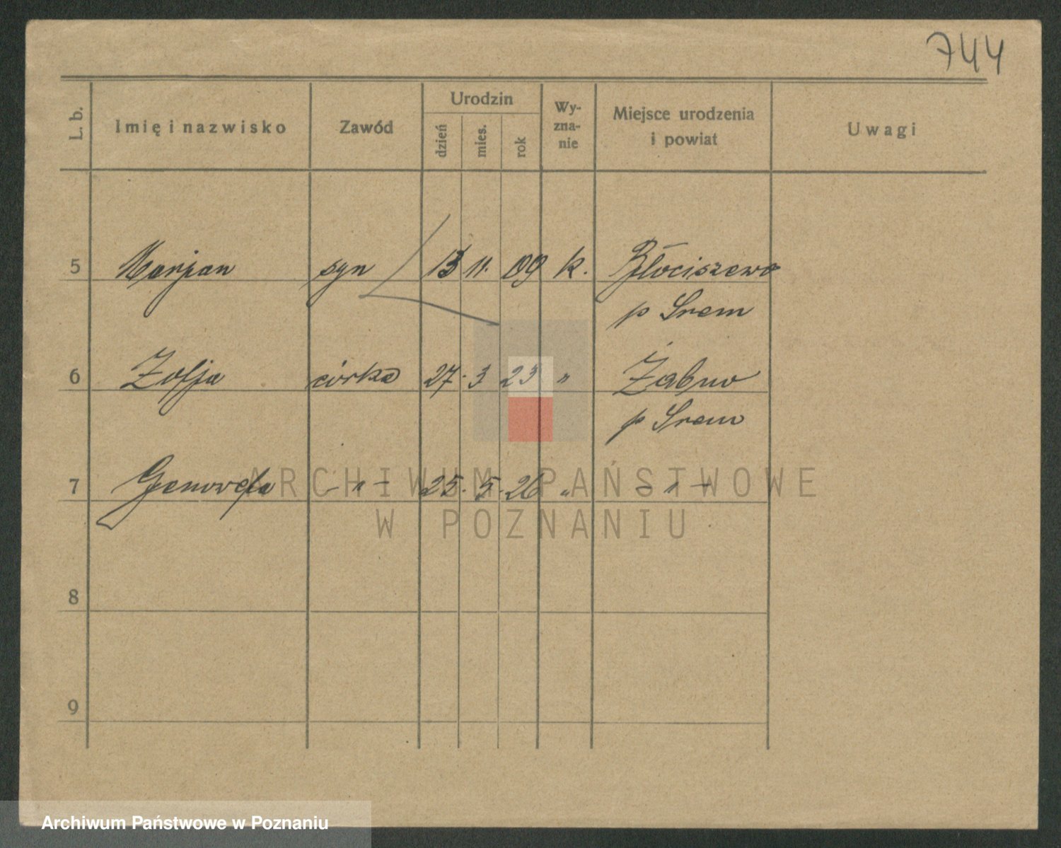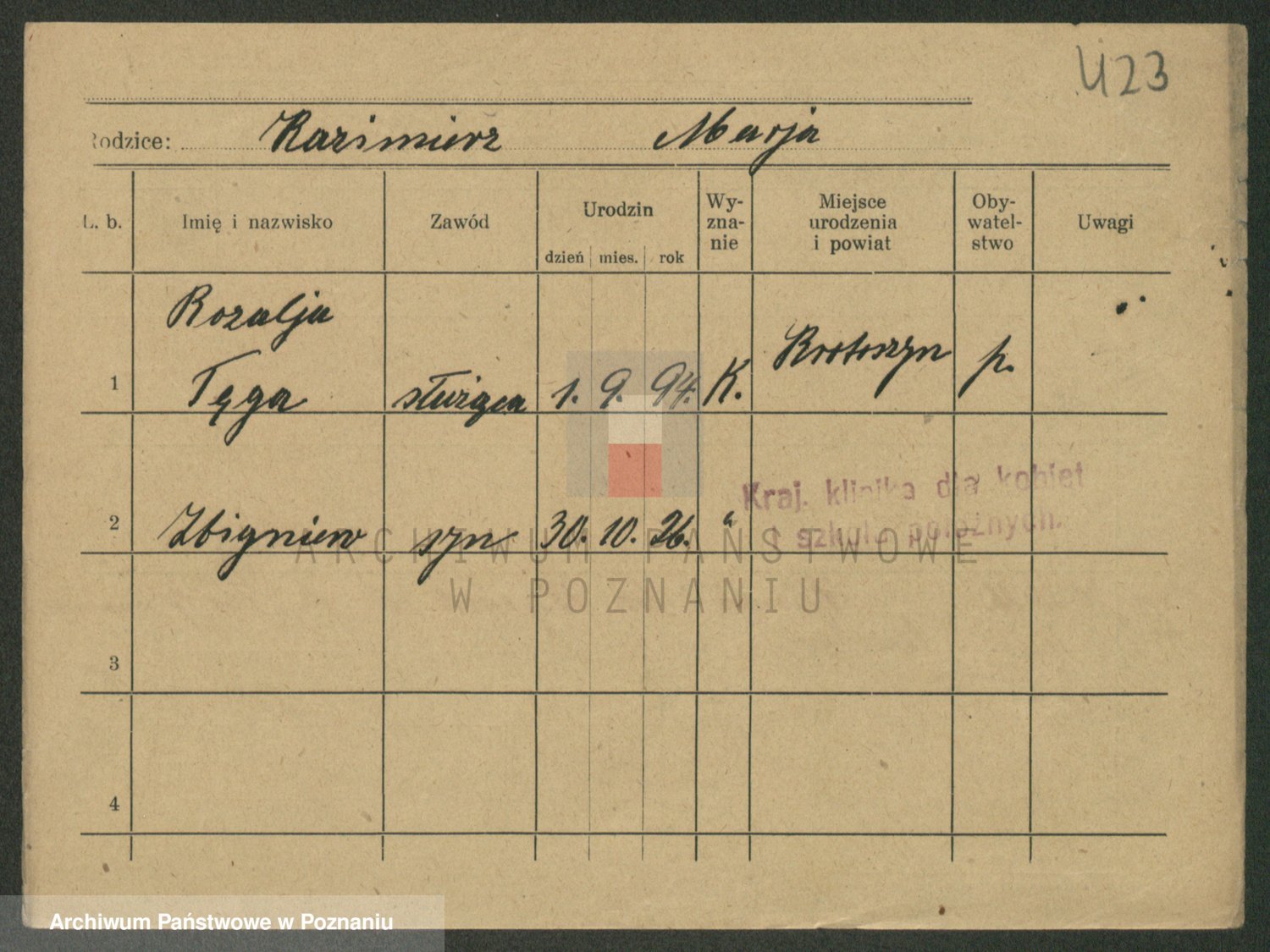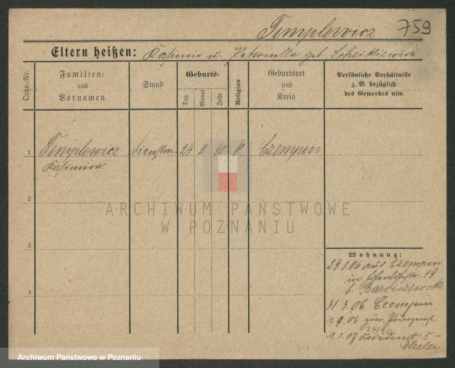 Podgląd karty osobowej dostępny jest po kliknięciu na nazwisko lub ikonkę karty. Można dokonywać powiększenia (ikony na górze) lub przechodzić między kolejnymi skanami (strzałki po bokach).