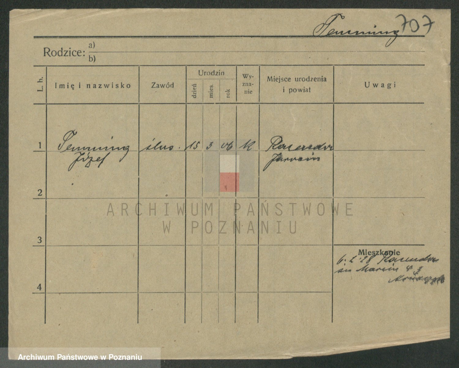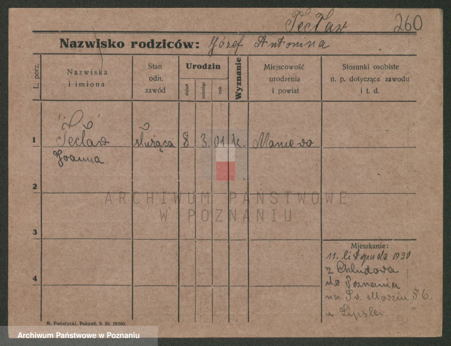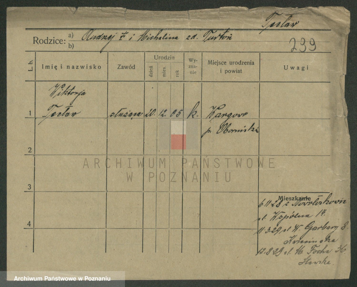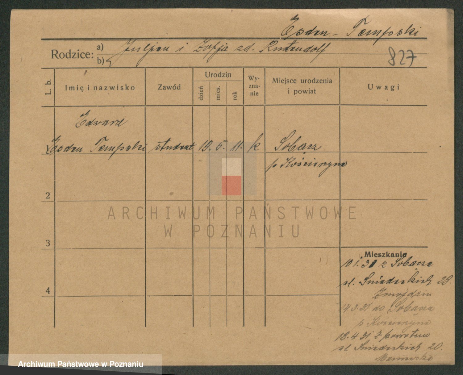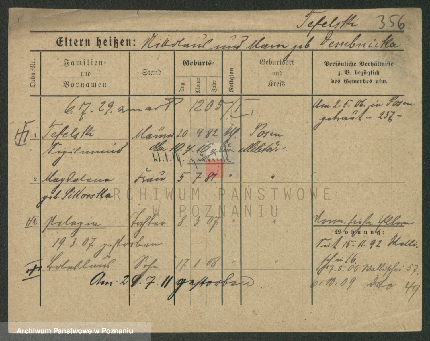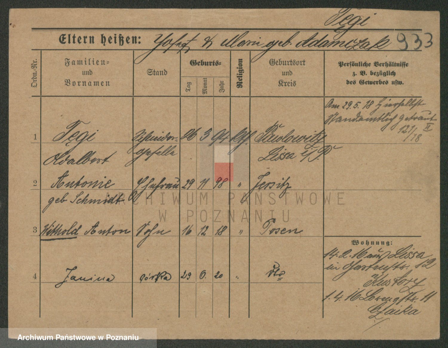 Podgląd karty osobowej dostępny jest po kliknięciu na nazwisko lub ikonkę karty. Można dokonywać powiększenia (ikony na górze) lub przechodzić między kolejnymi skanami (strzałki po bokach).