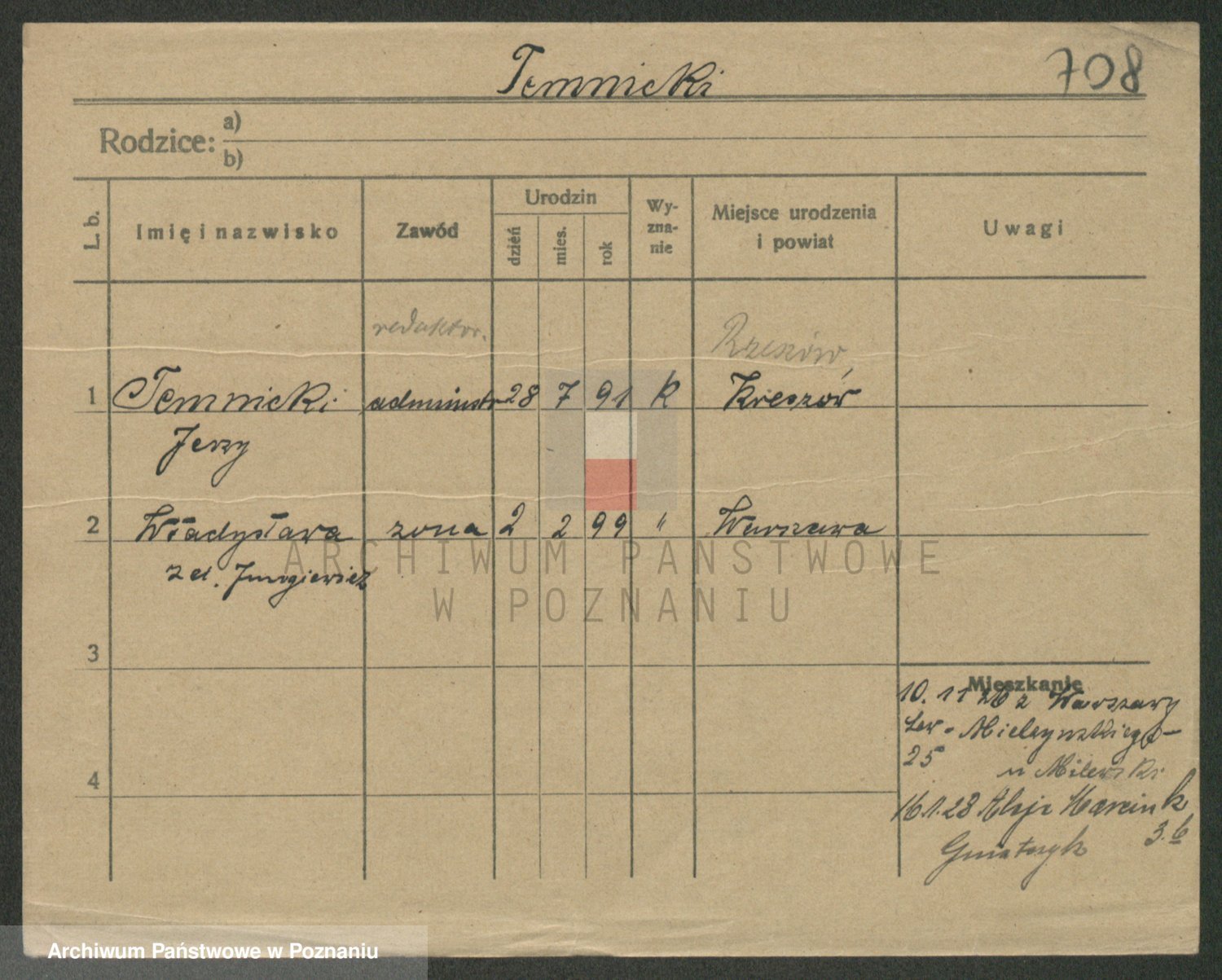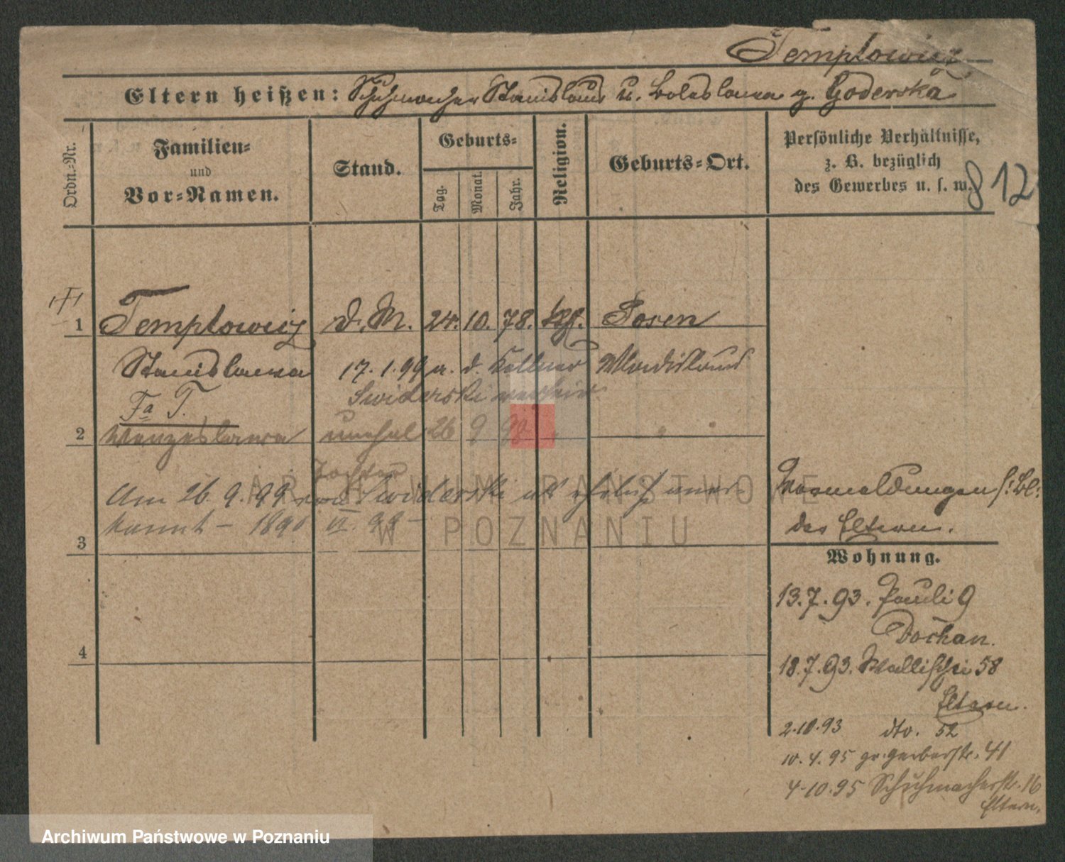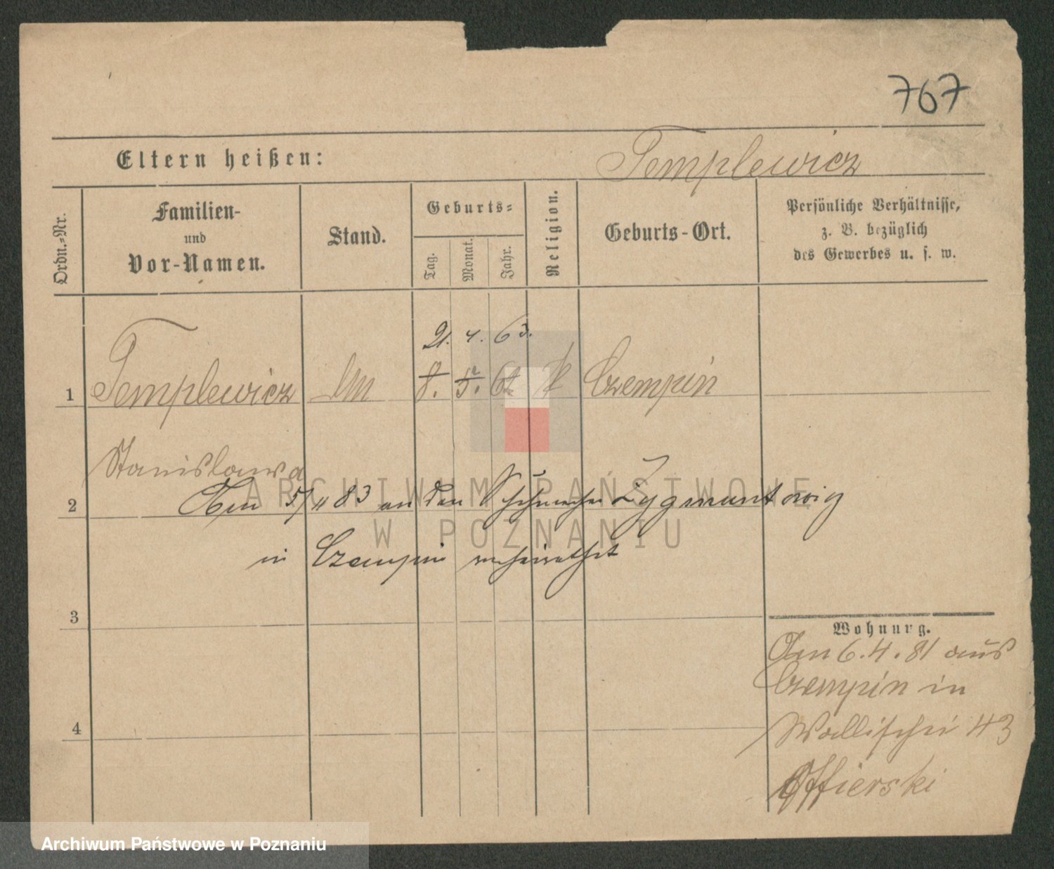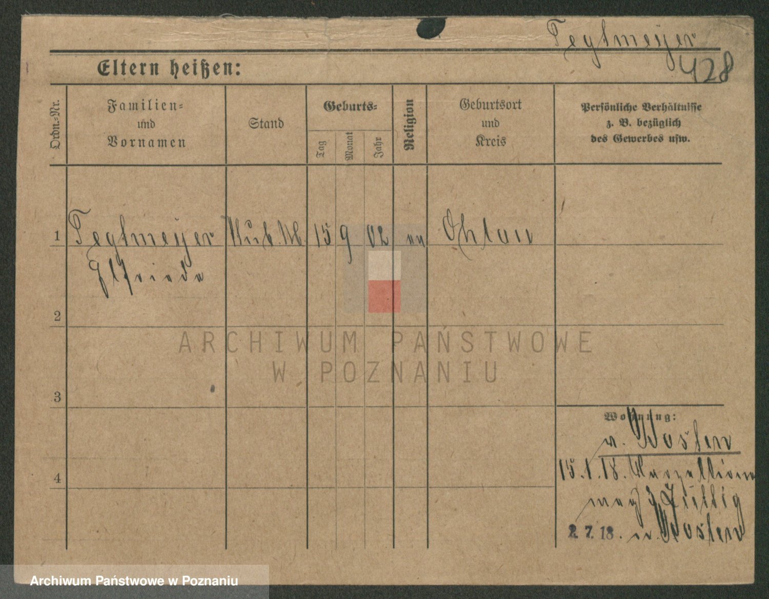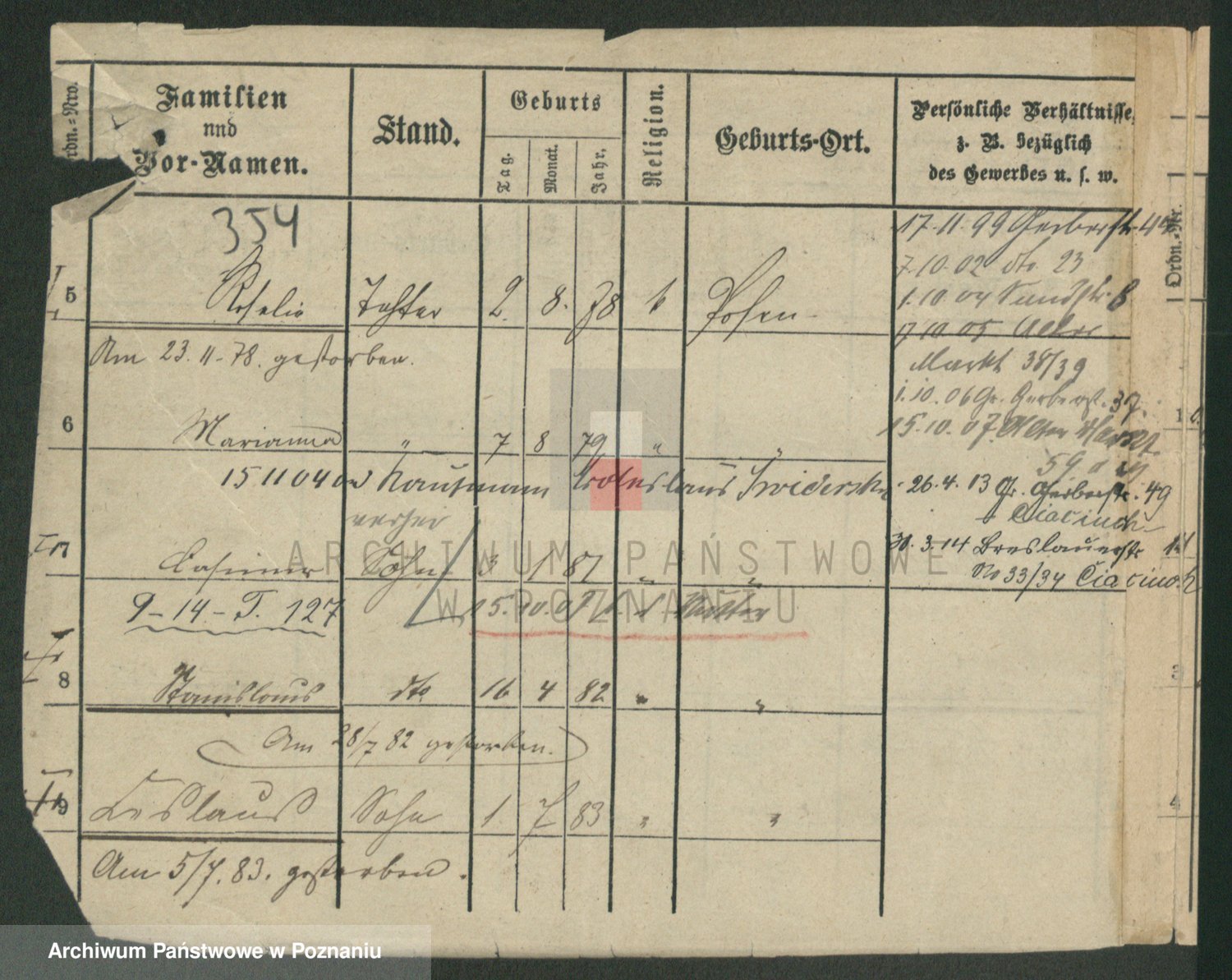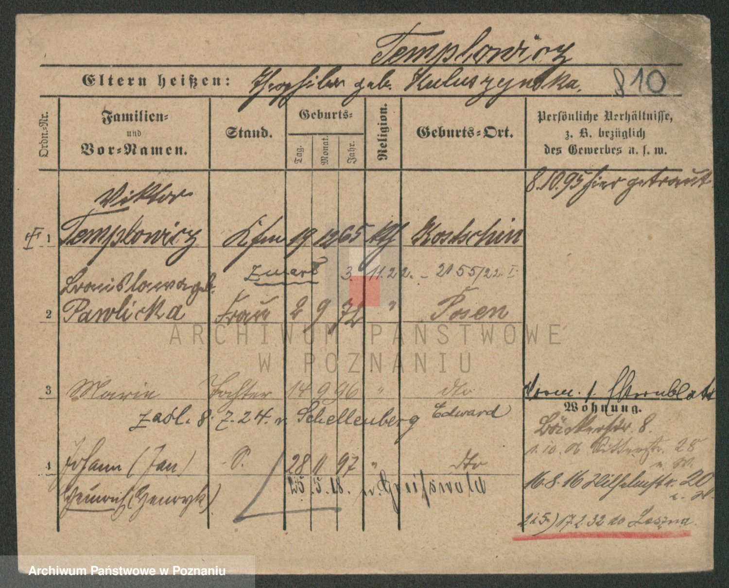 Podgląd karty osobowej dostępny jest po kliknięciu na nazwisko lub ikonkę karty. Można dokonywać powiększenia (ikony na górze) lub przechodzić między kolejnymi skanami (strzałki po bokach).