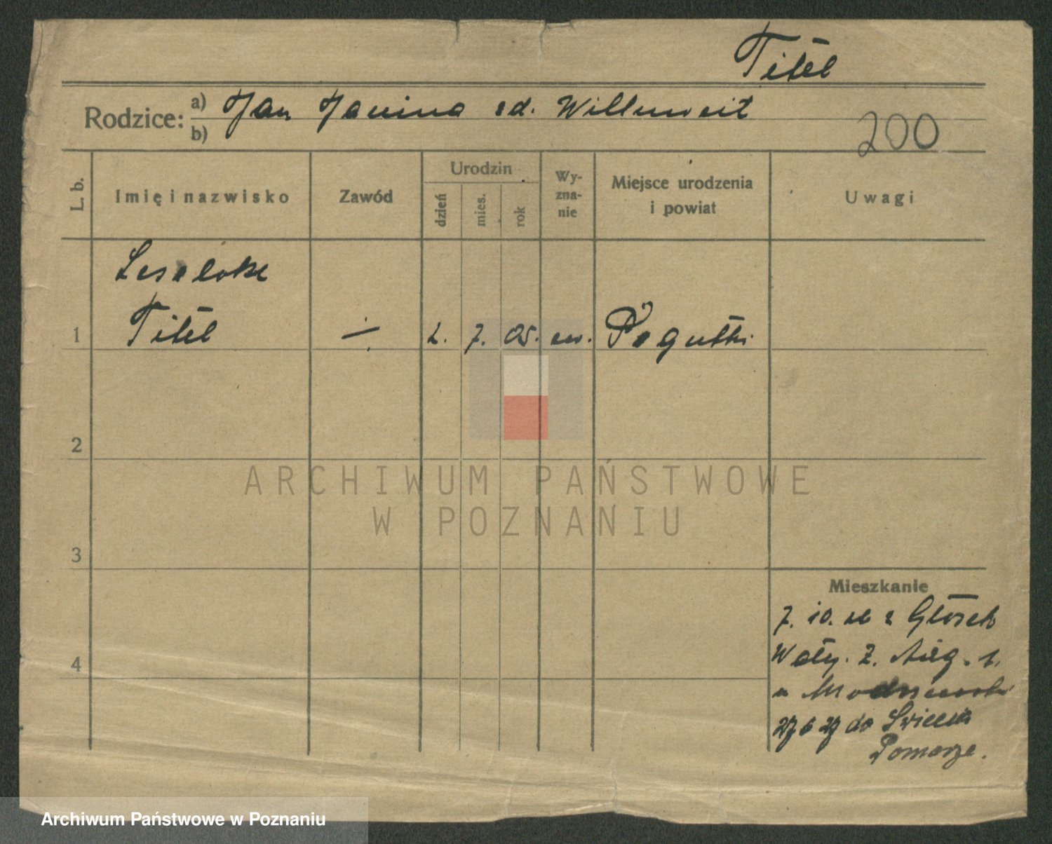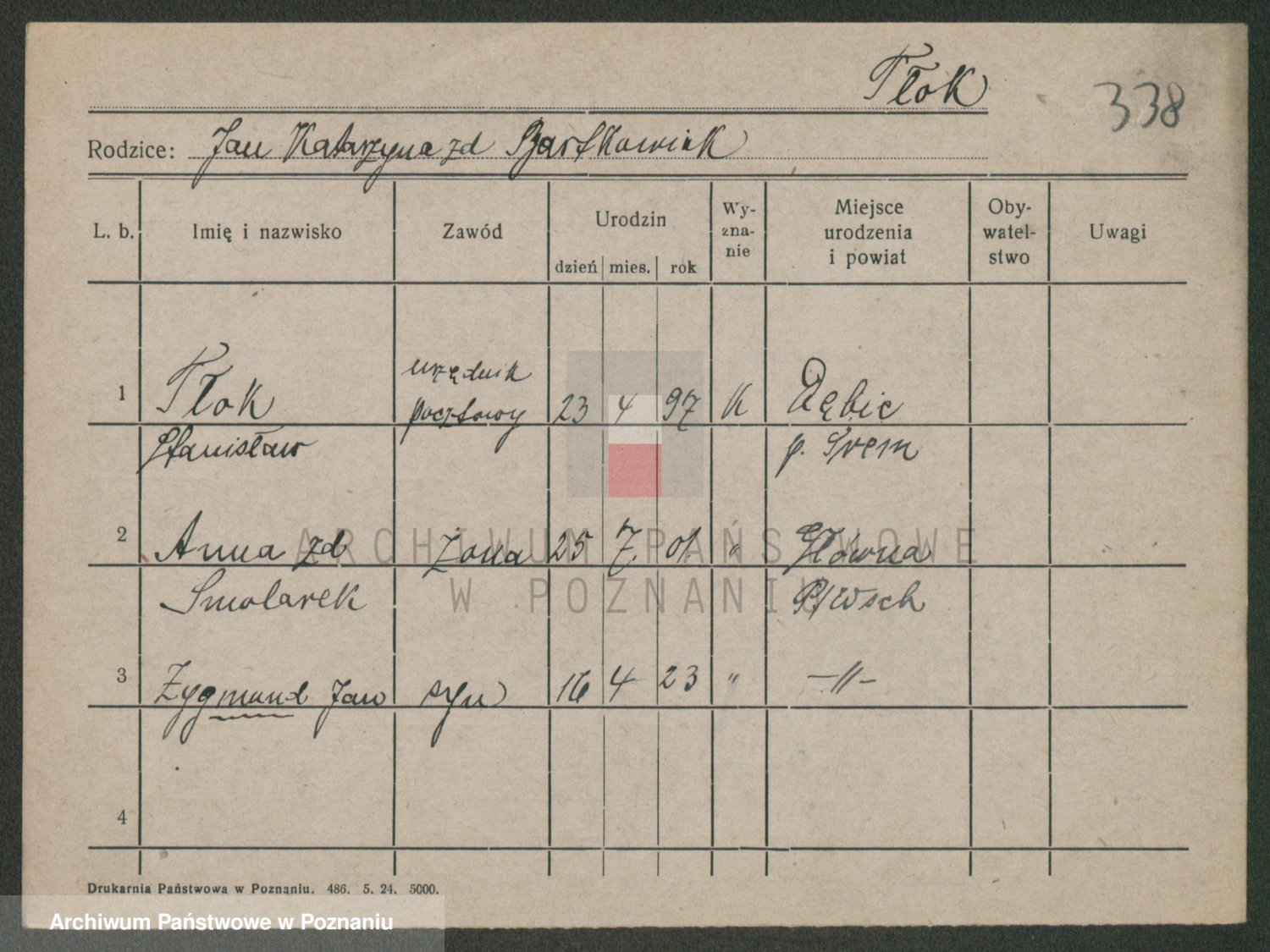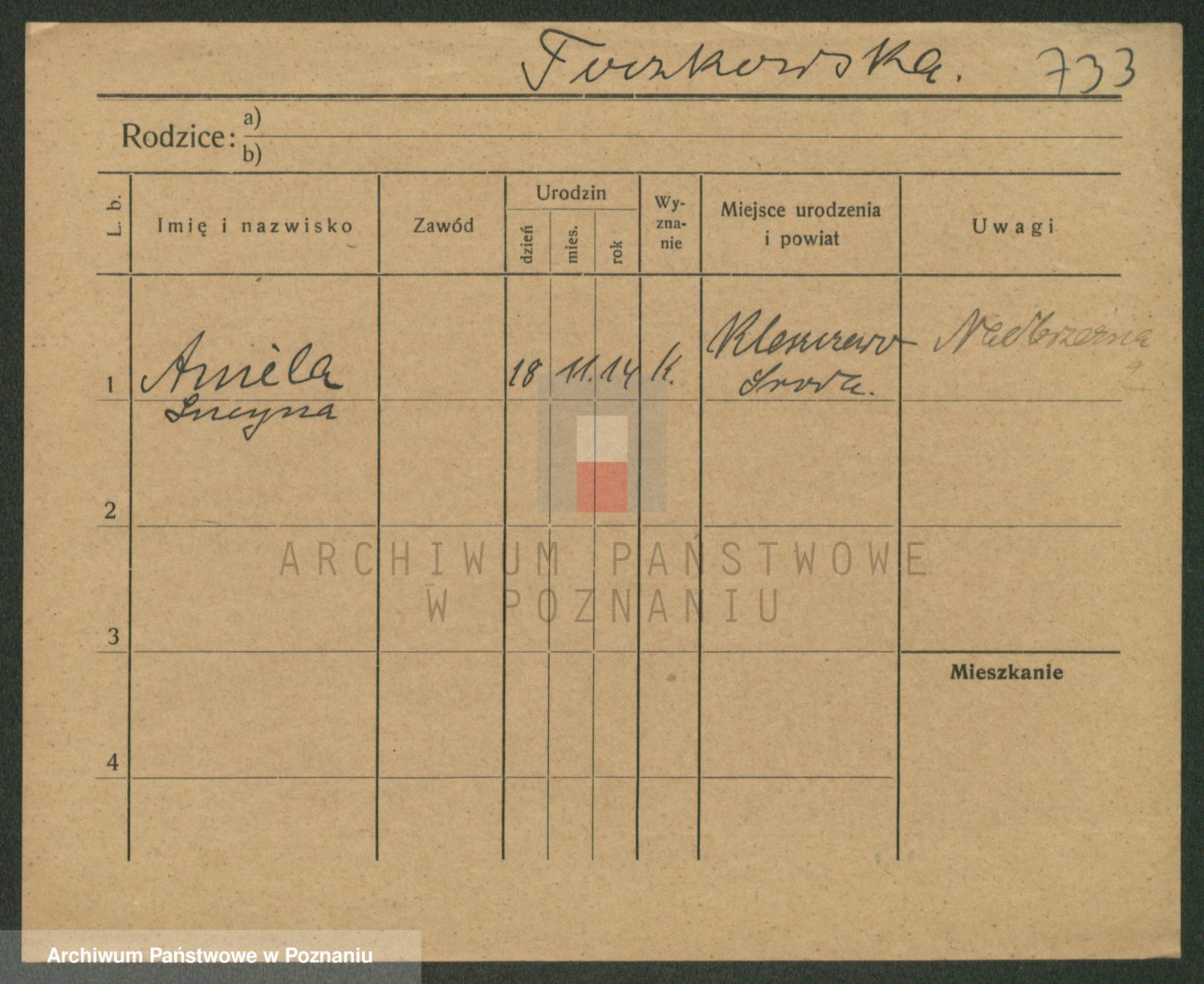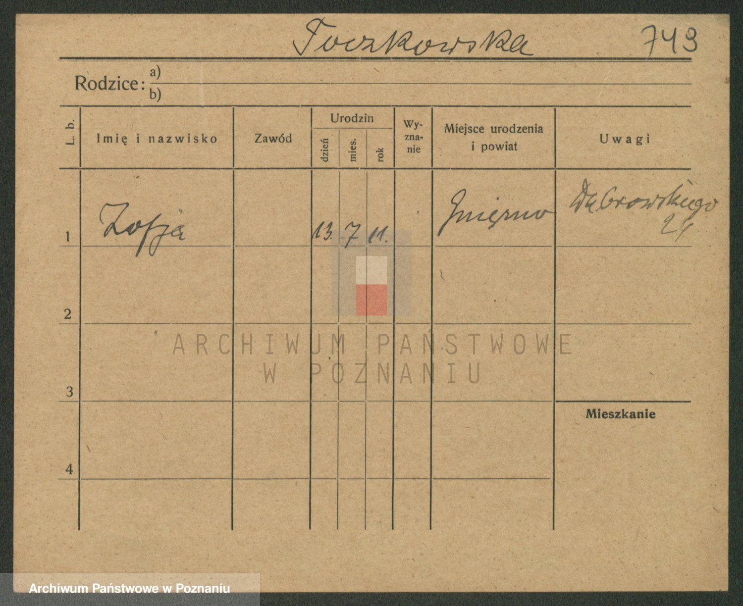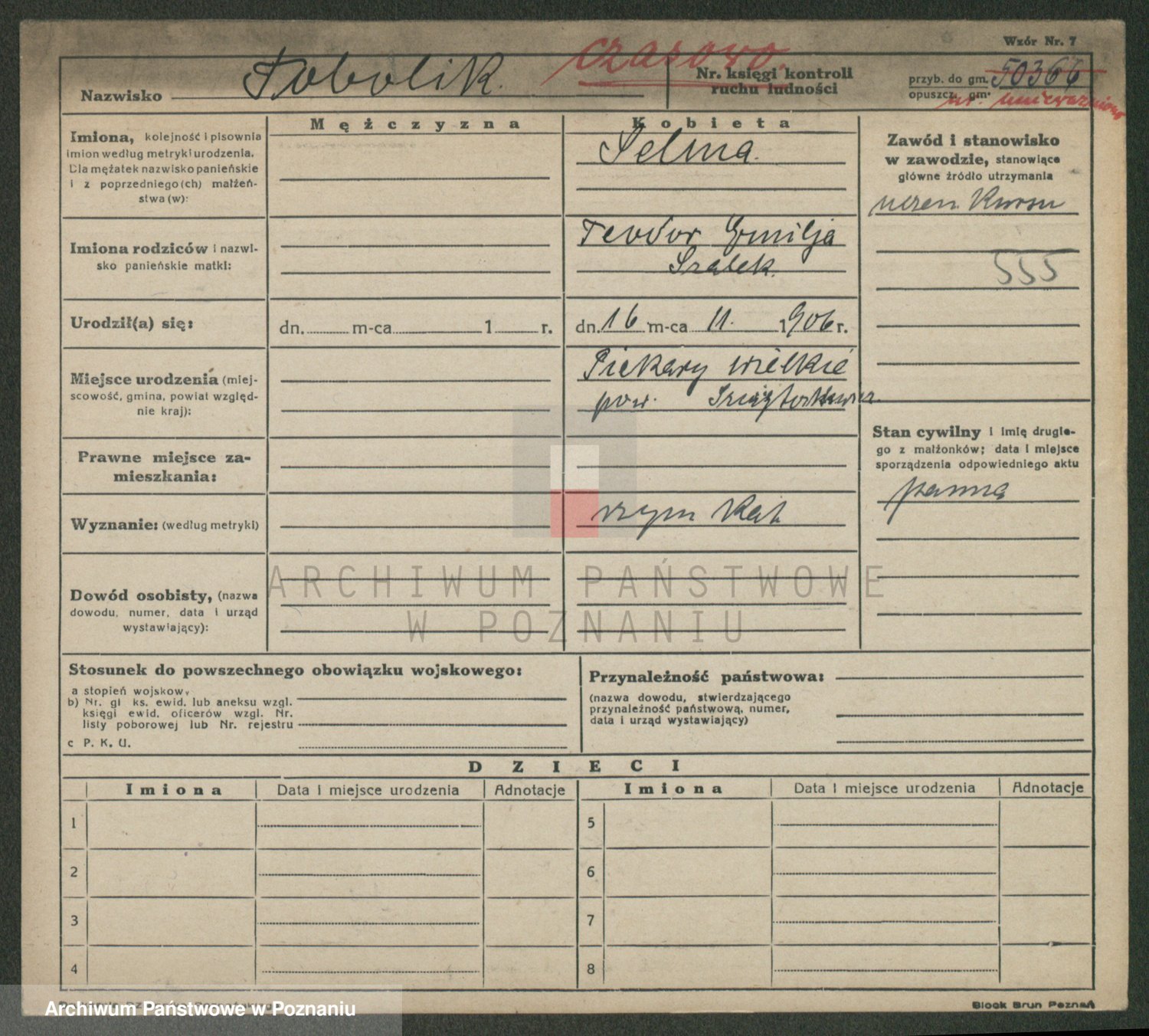 Podgląd karty osobowej dostępny jest po kliknięciu na nazwisko lub ikonkę karty. Można dokonywać powiększenia (ikony na górze) lub przechodzić między kolejnymi skanami (strzałki po bokach).
