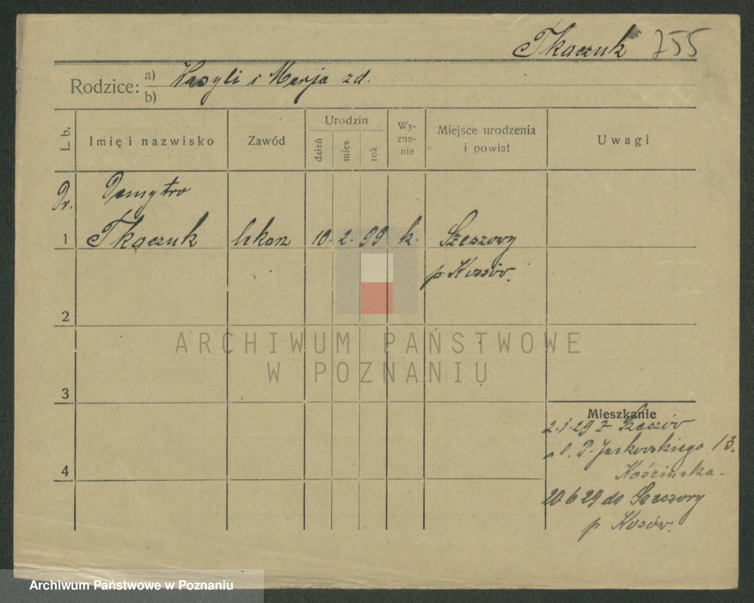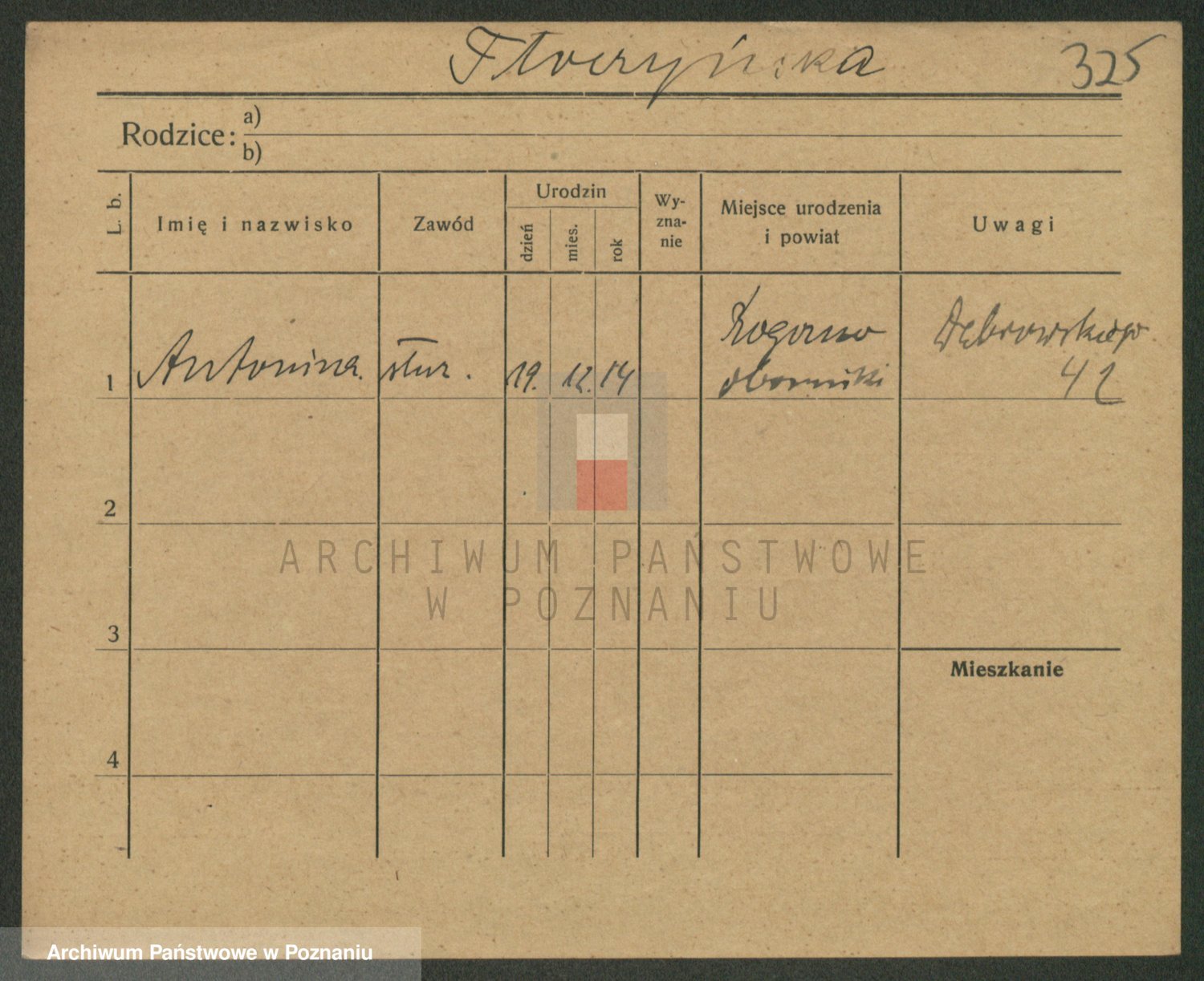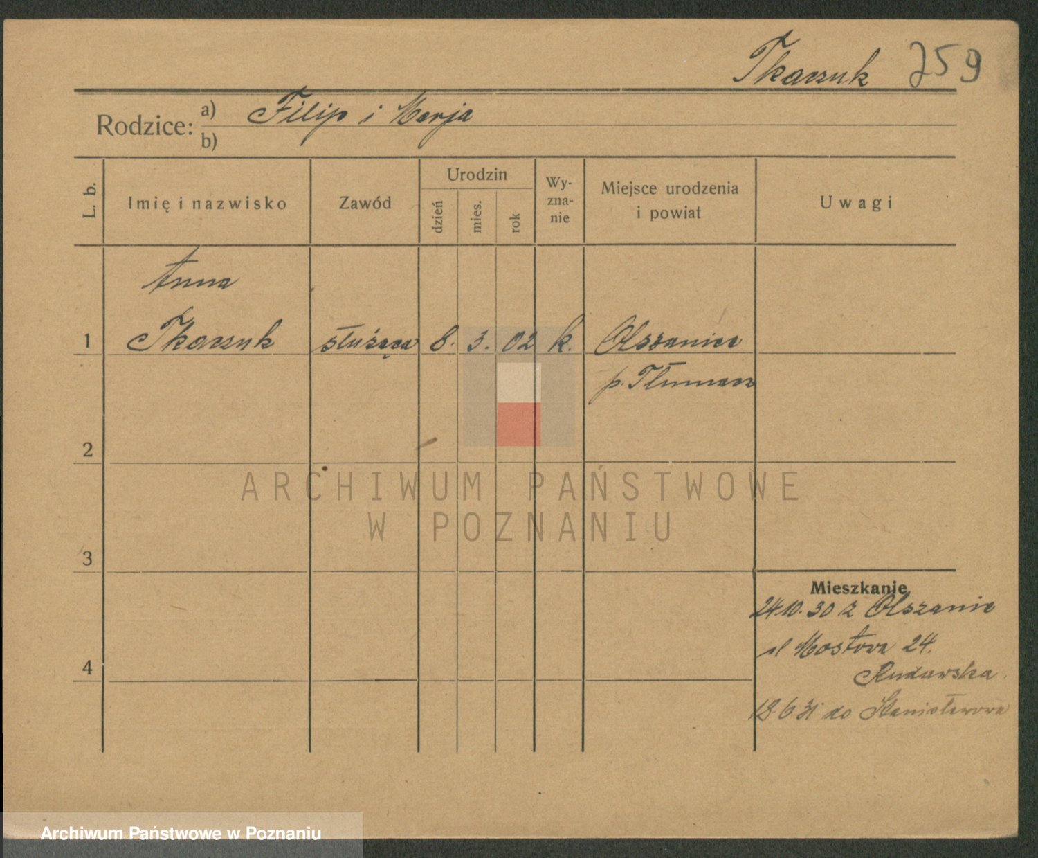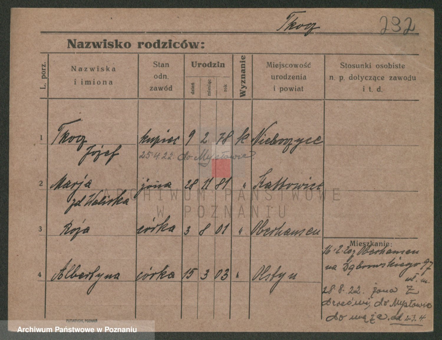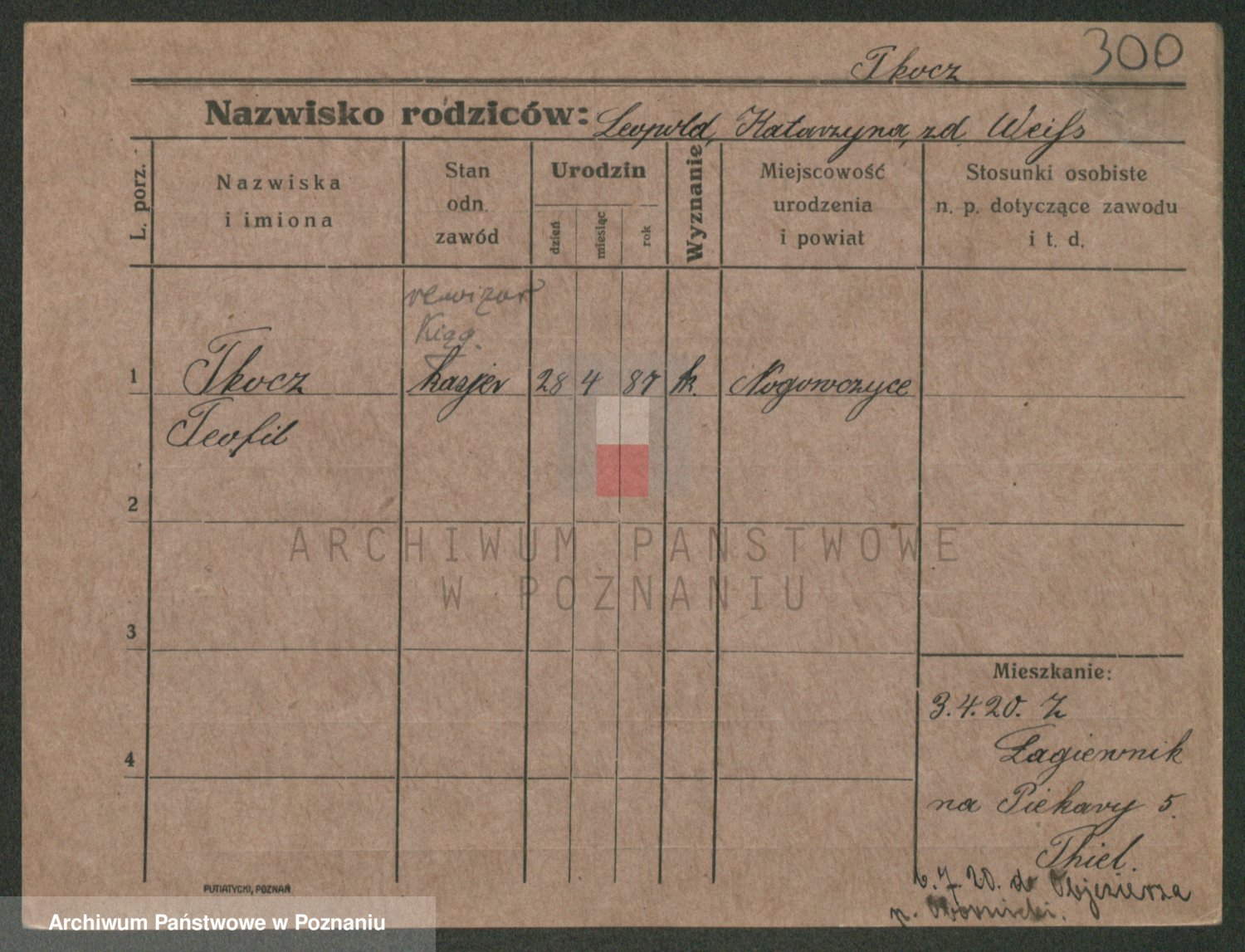 Podgląd karty osobowej dostępny jest po kliknięciu na nazwisko lub ikonkę karty. Można dokonywać powiększenia (ikony na górze) lub przechodzić między kolejnymi skanami (strzałki po bokach).