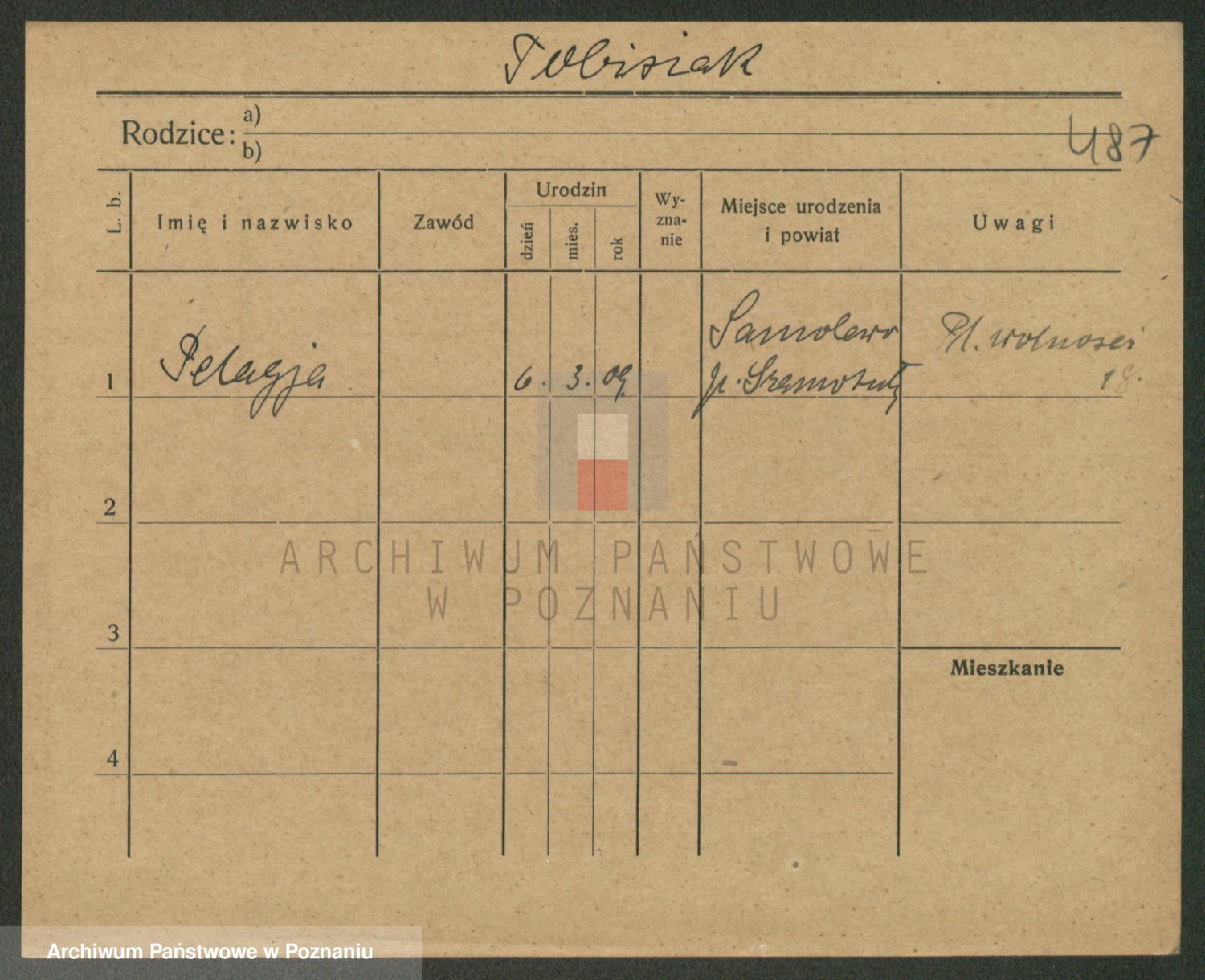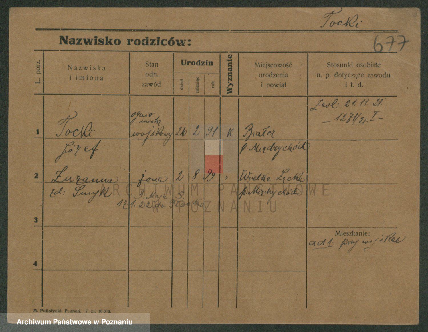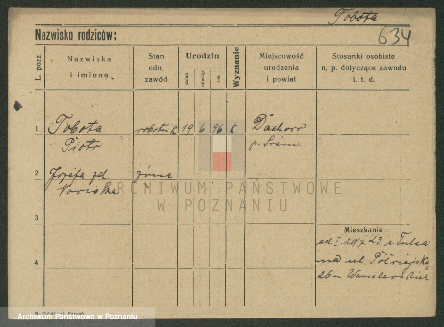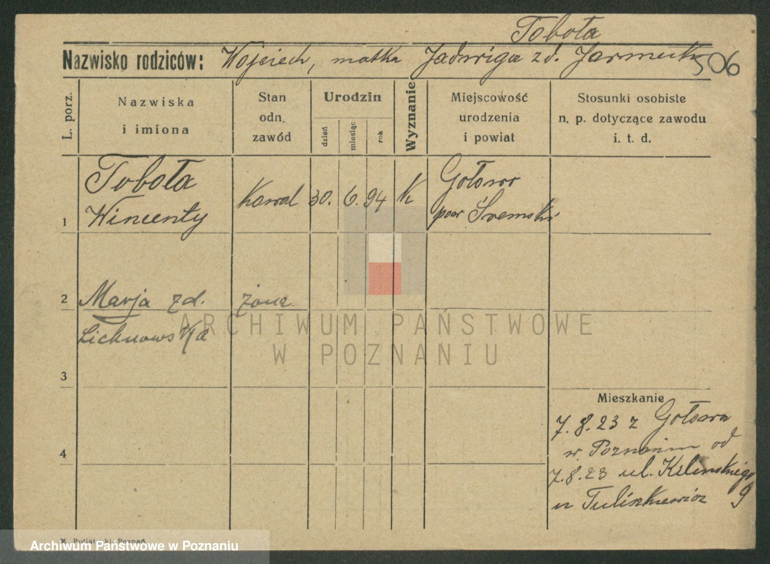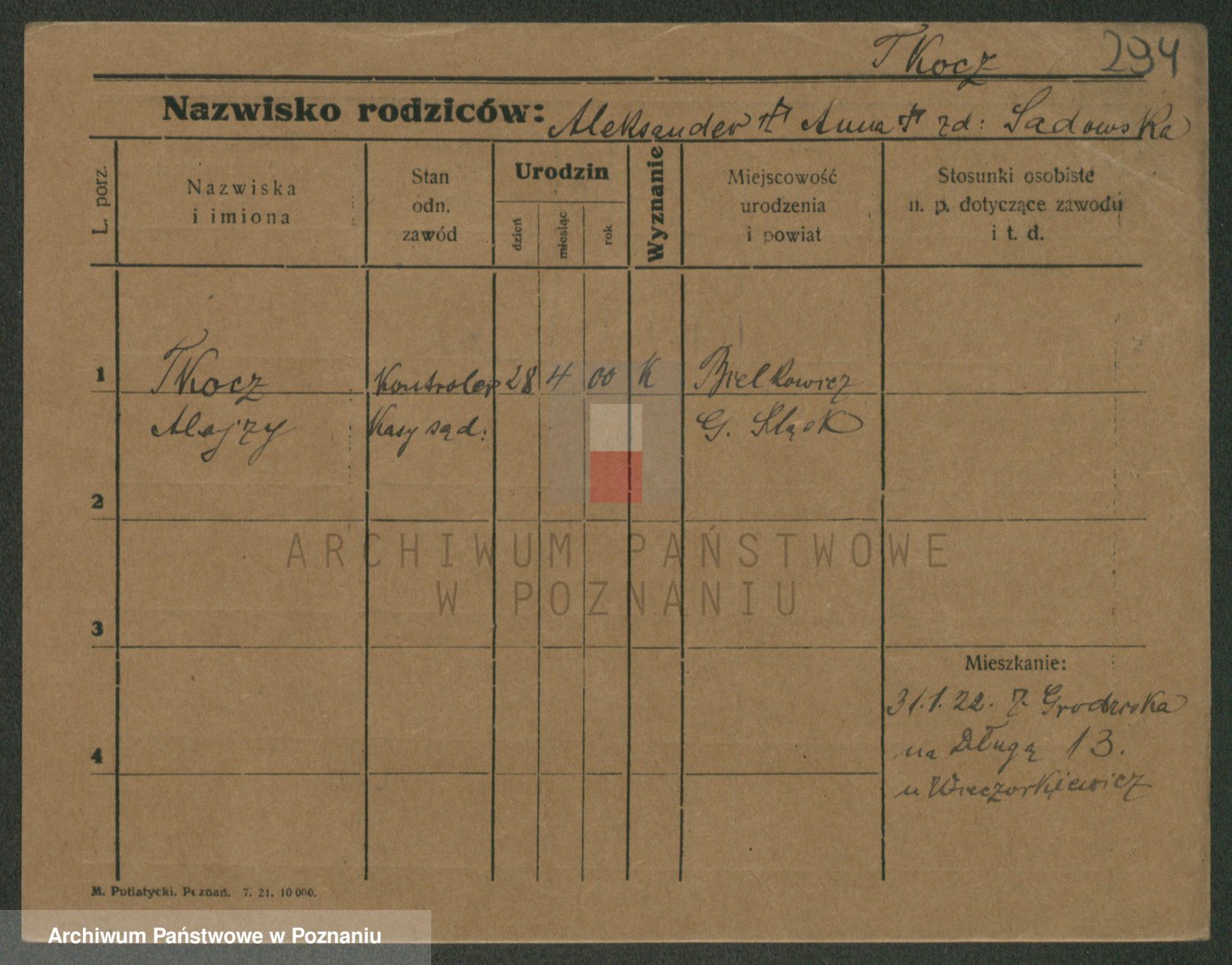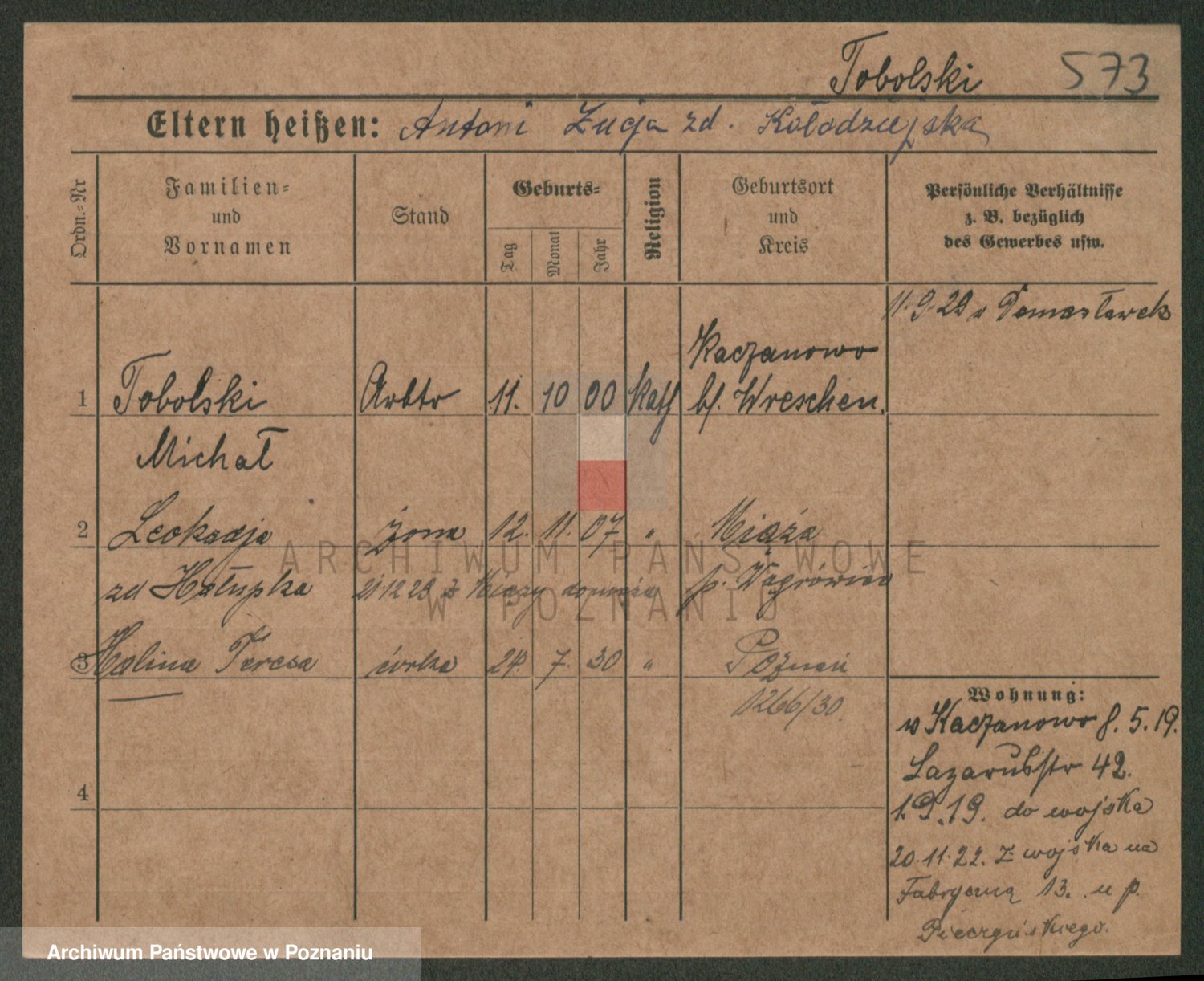 Podgląd karty osobowej dostępny jest po kliknięciu na nazwisko lub ikonkę karty. Można dokonywać powiększenia (ikony na górze) lub przechodzić między kolejnymi skanami (strzałki po bokach).