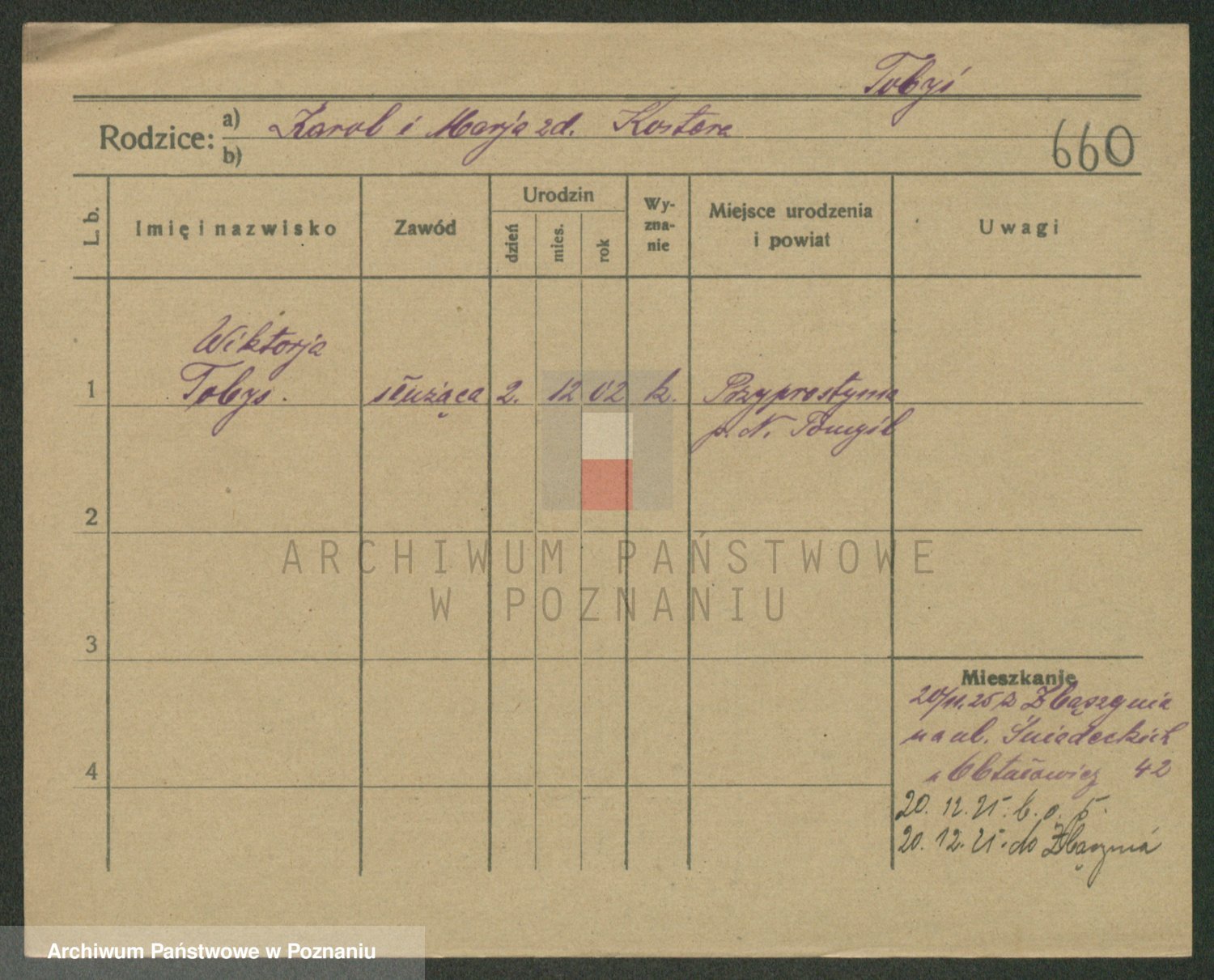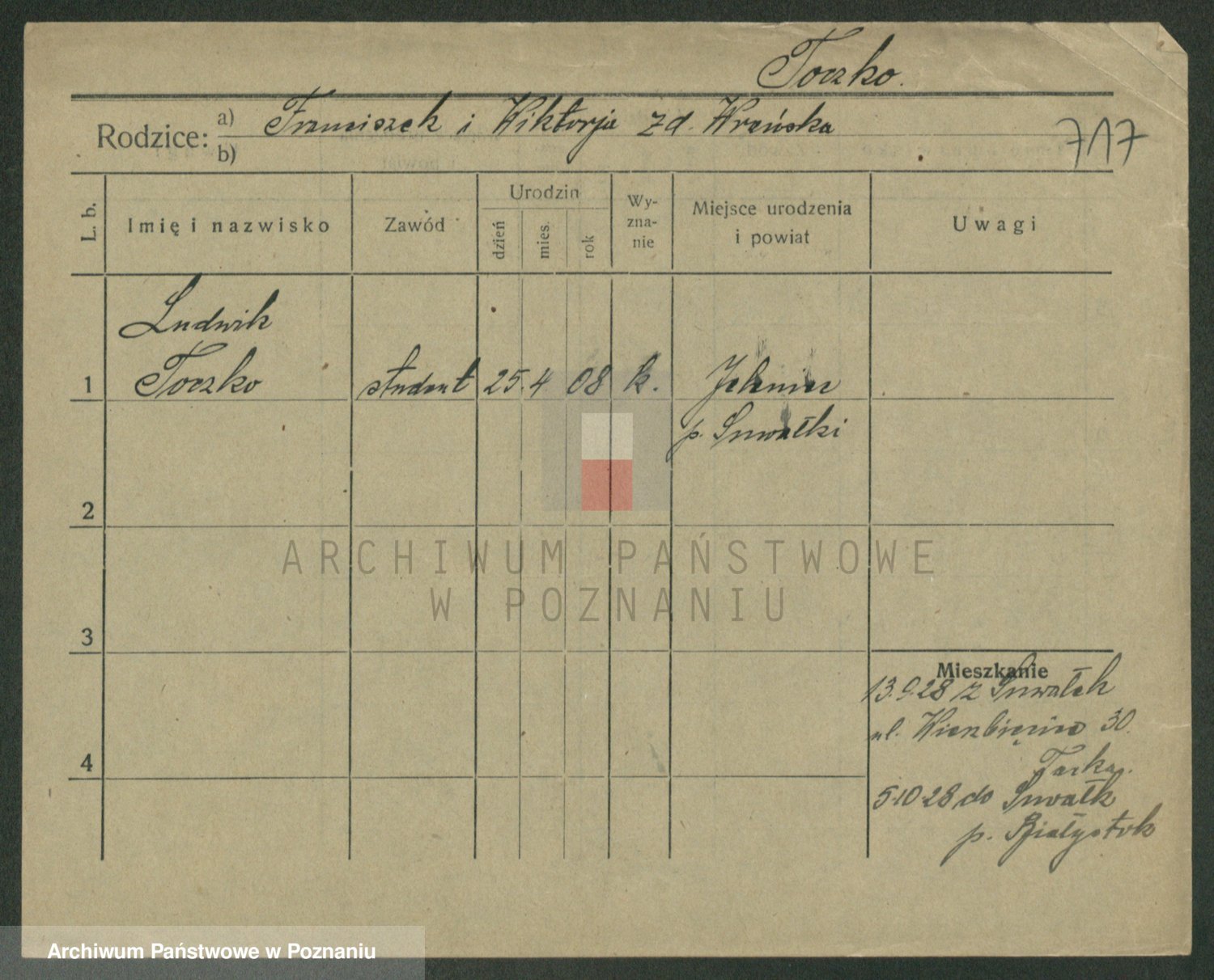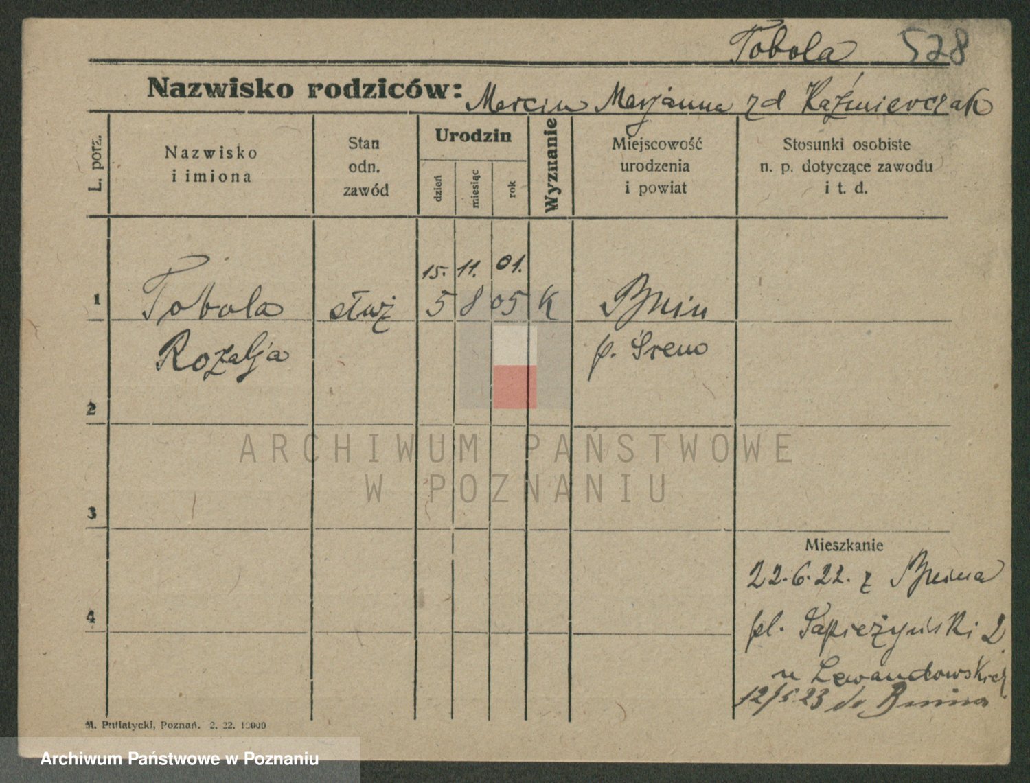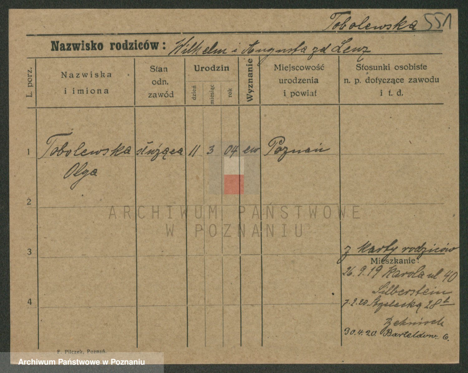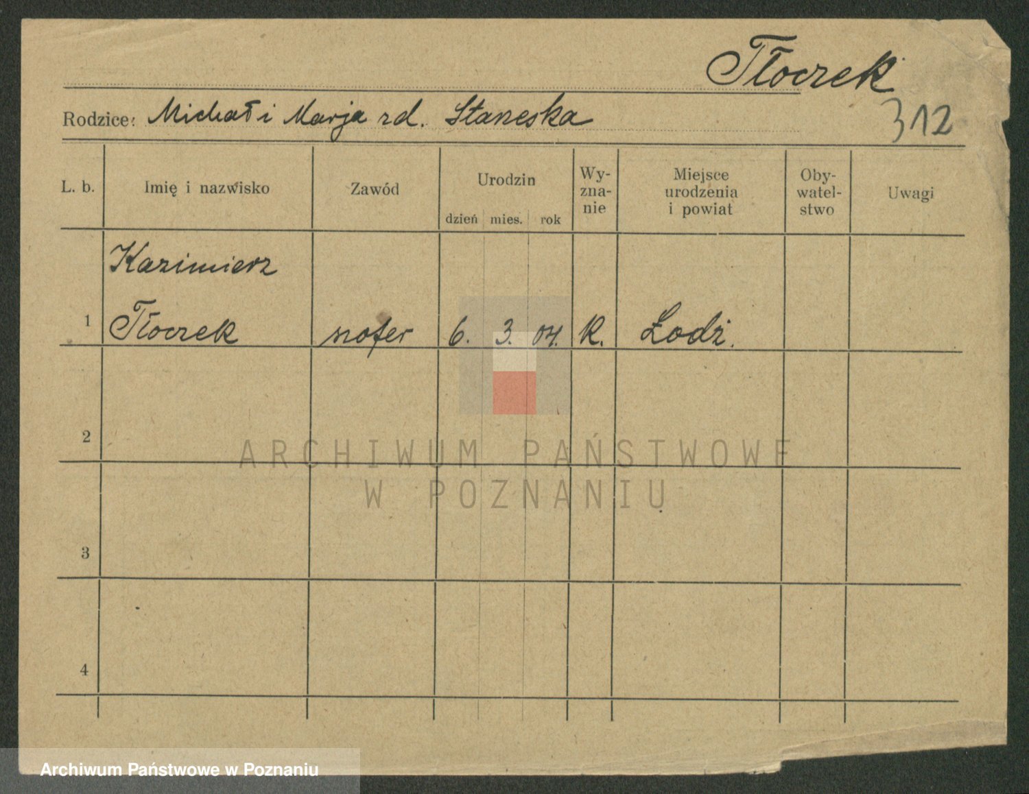 Podgląd karty osobowej dostępny jest po kliknięciu na nazwisko lub ikonkę karty. Można dokonywać powiększenia (ikony na górze) lub przechodzić między kolejnymi skanami (strzałki po bokach).