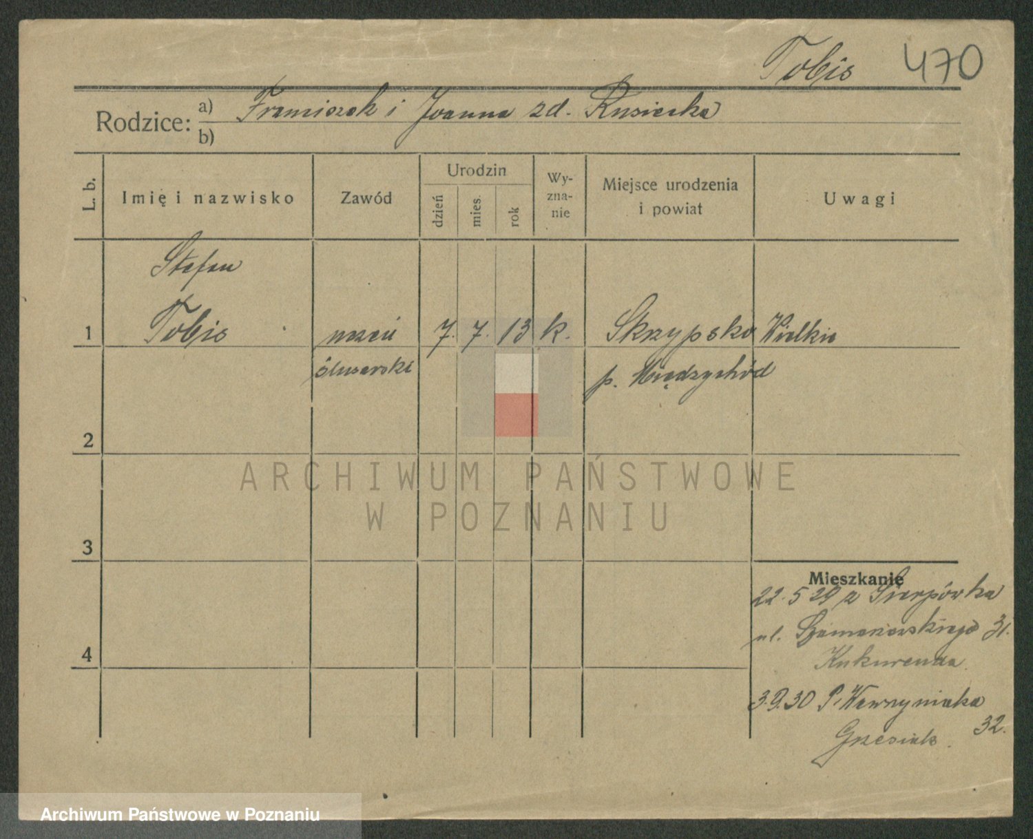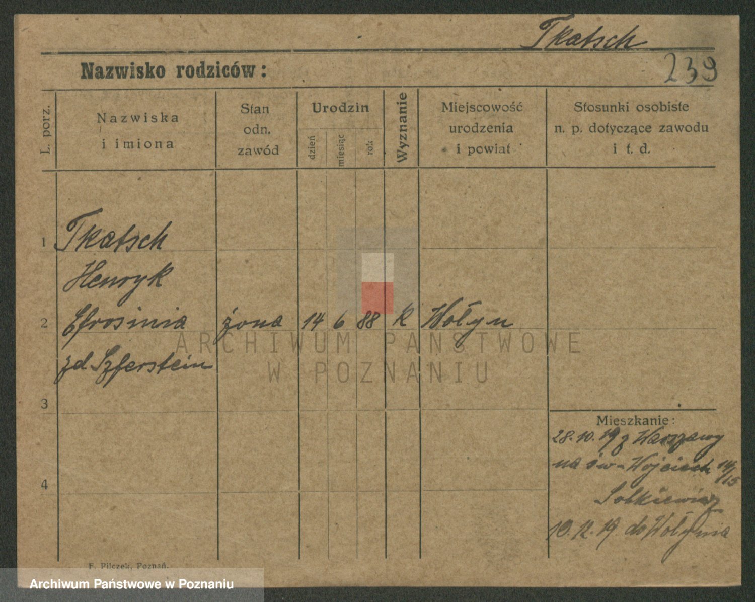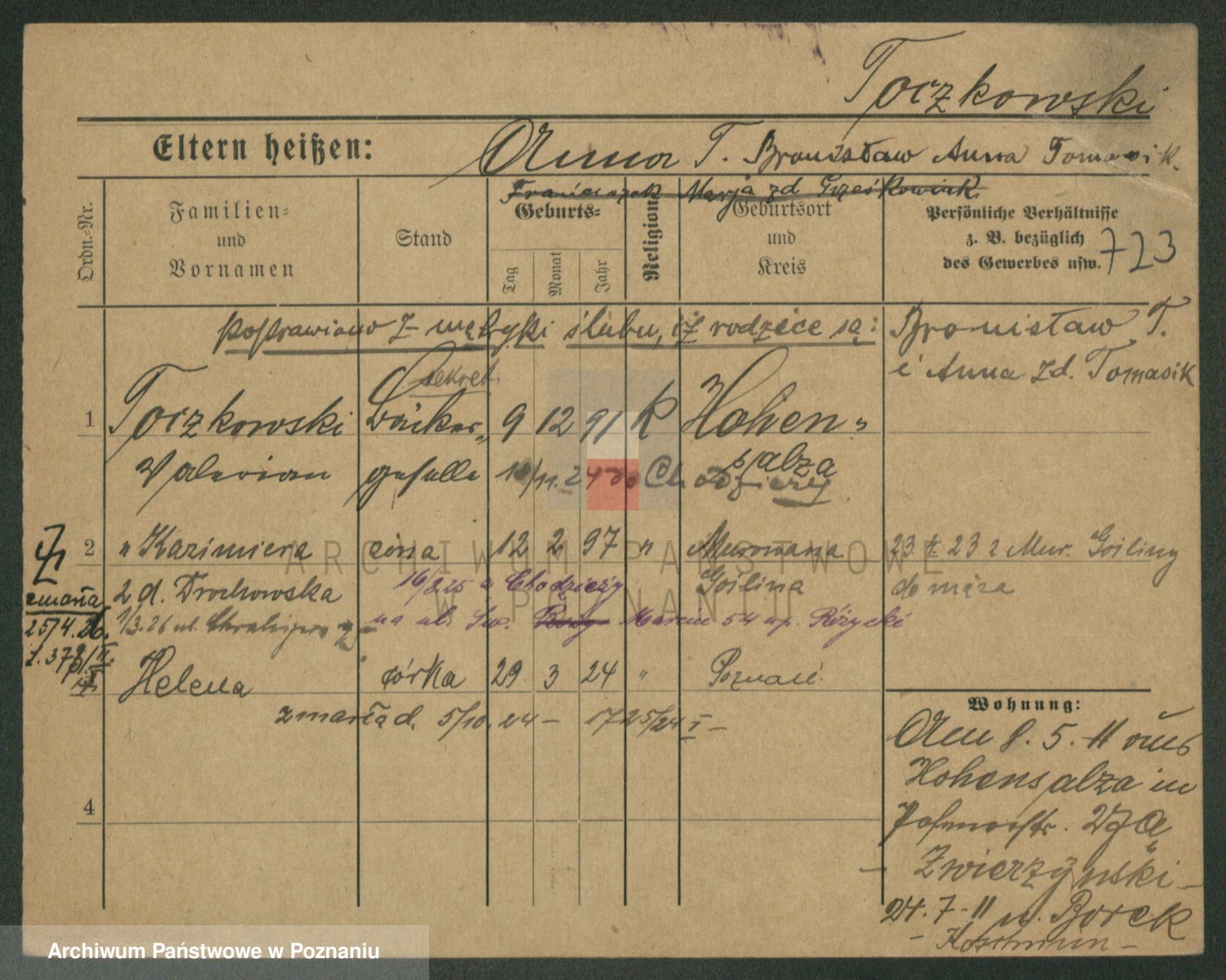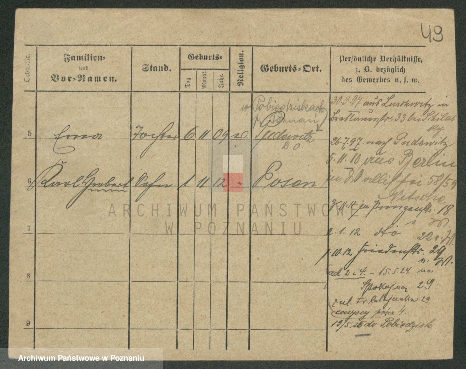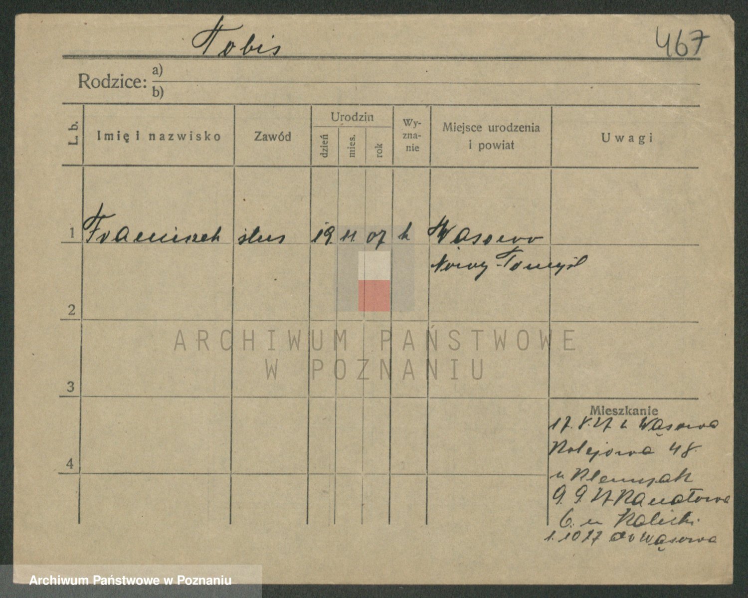 Podgląd karty osobowej dostępny jest po kliknięciu na nazwisko lub ikonkę karty. Można dokonywać powiększenia (ikony na górze) lub przechodzić między kolejnymi skanami (strzałki po bokach).