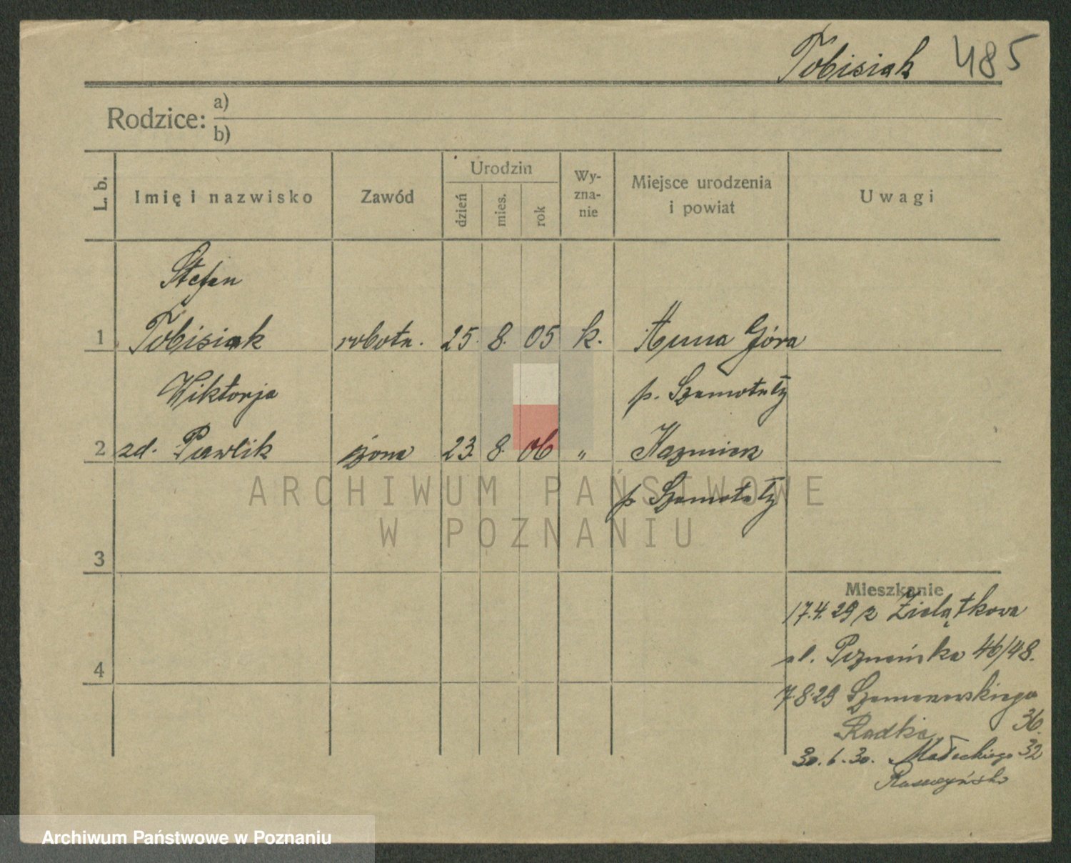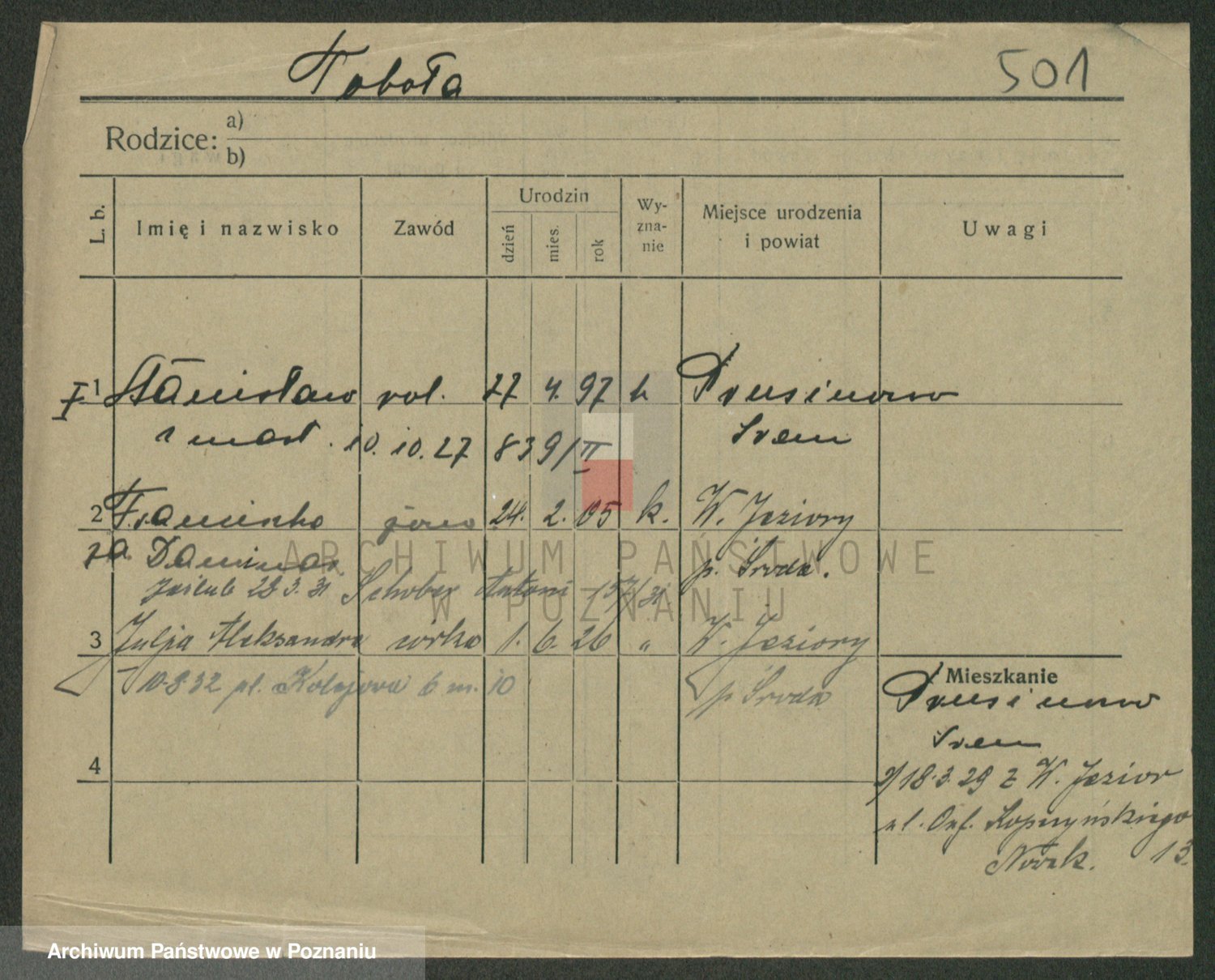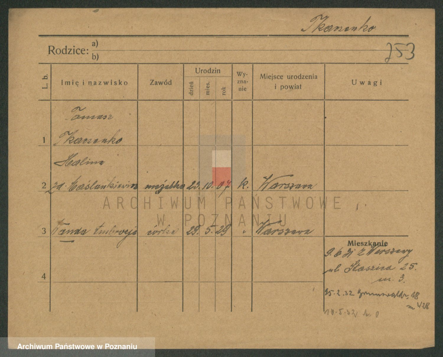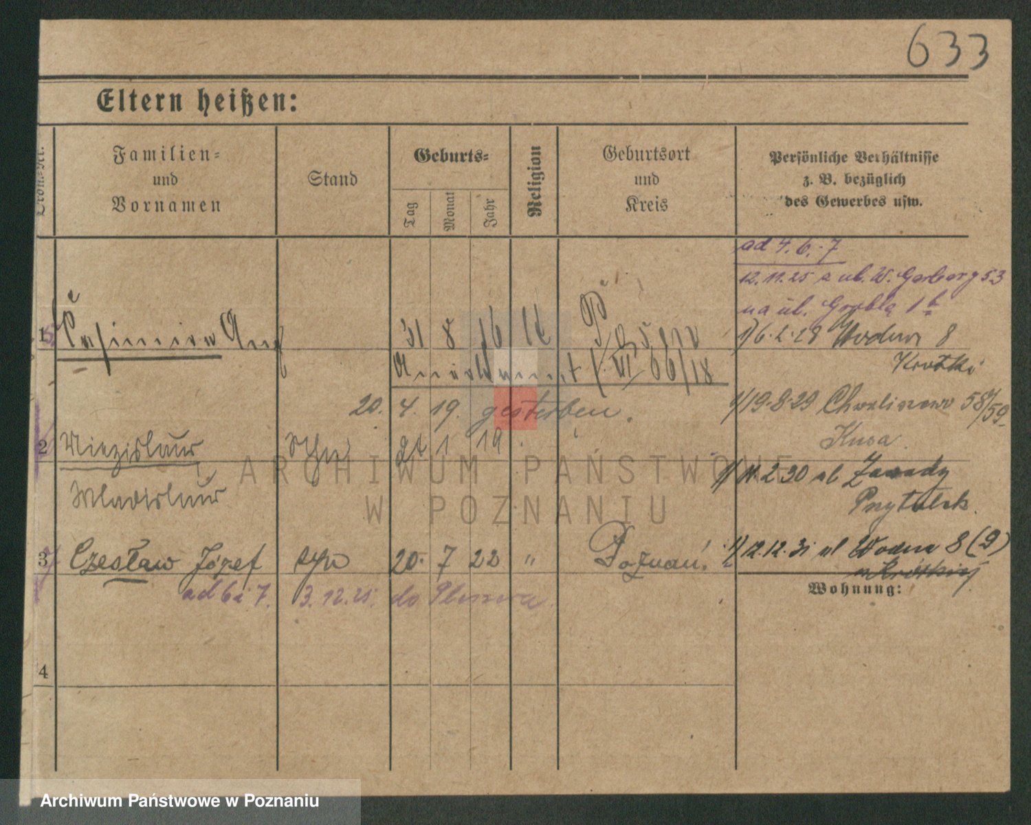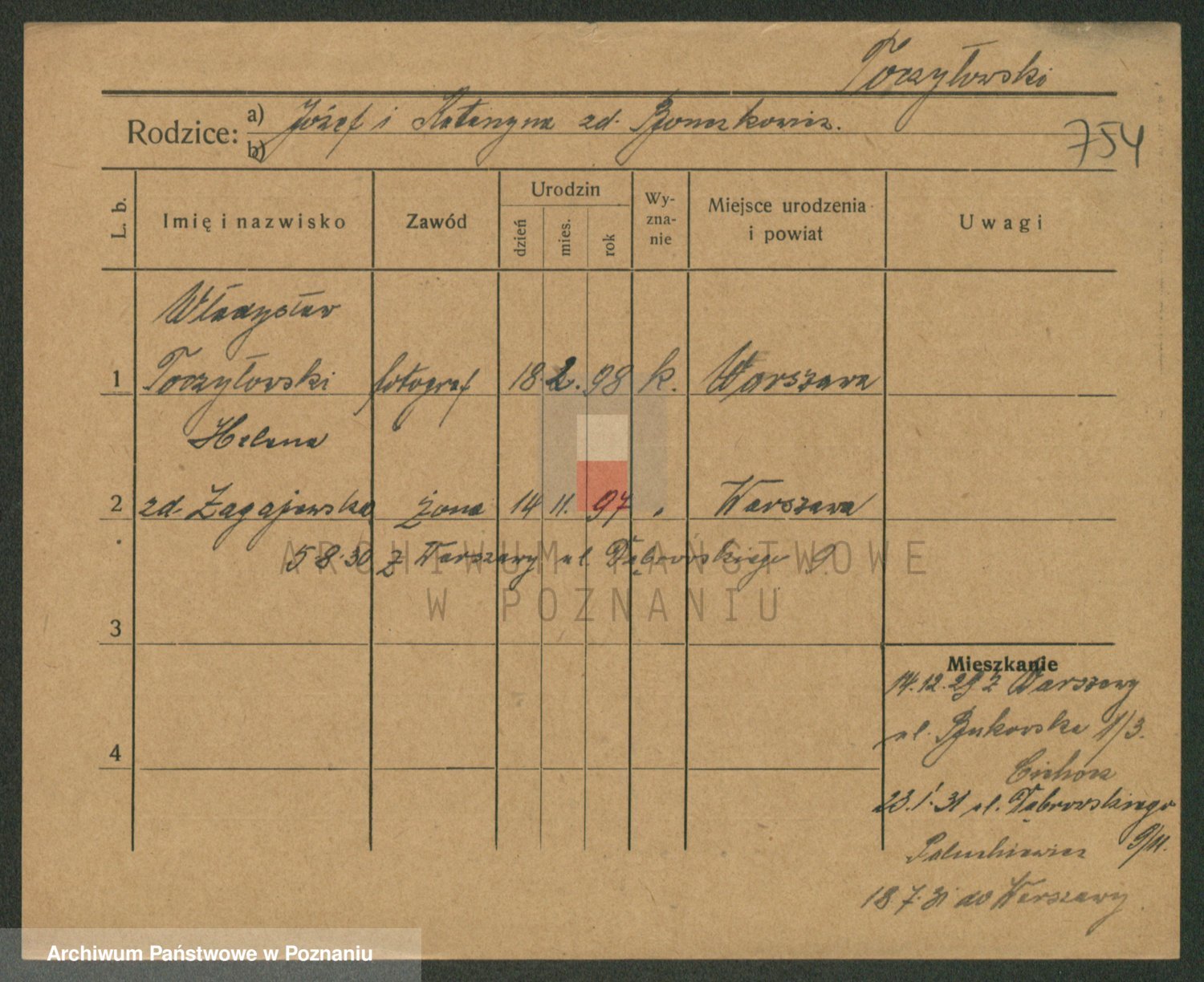 Podgląd karty osobowej dostępny jest po kliknięciu na nazwisko lub ikonkę karty. Można dokonywać powiększenia (ikony na górze) lub przechodzić między kolejnymi skanami (strzałki po bokach).